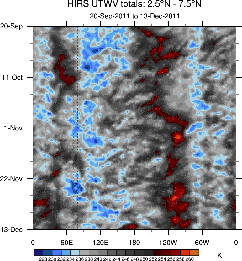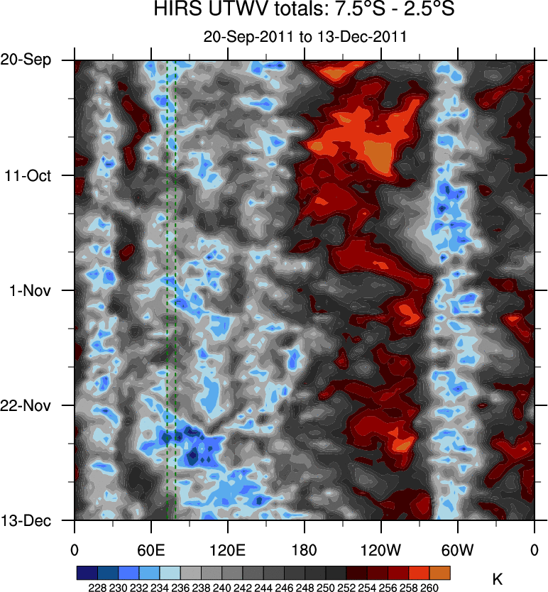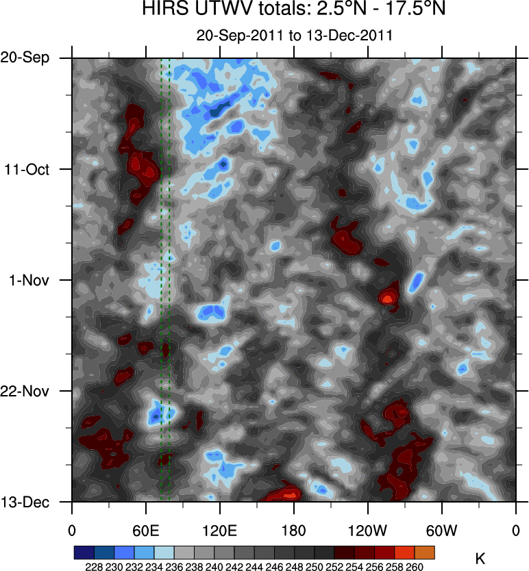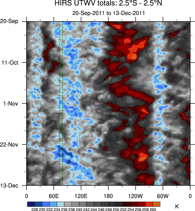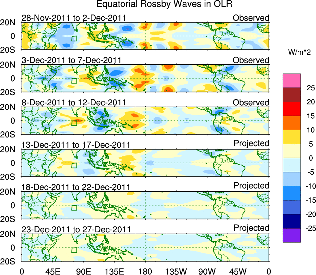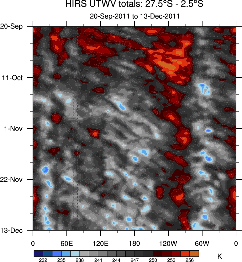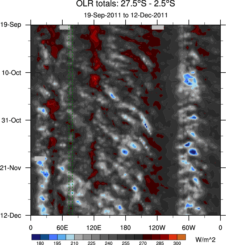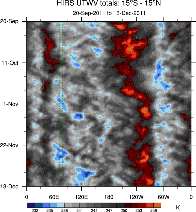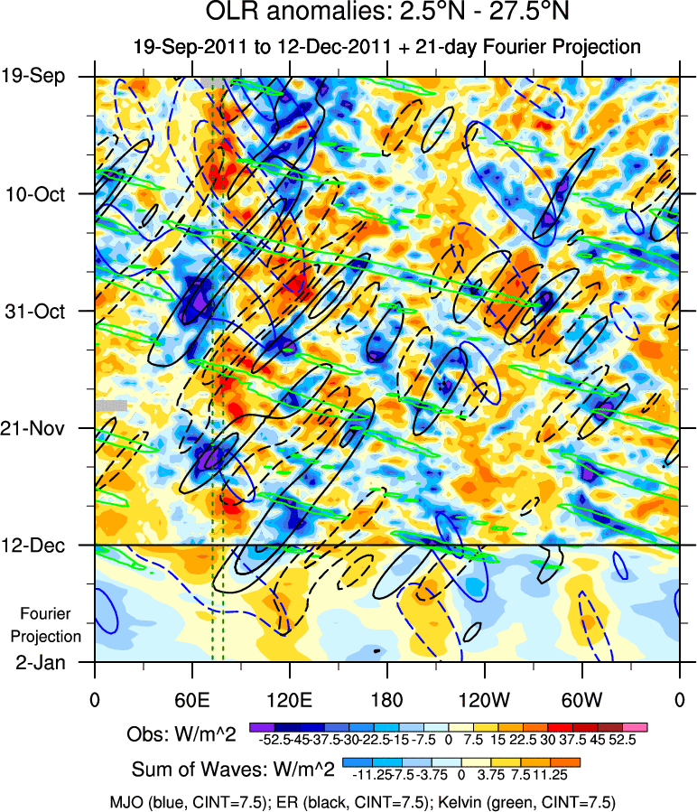 To identify tropical waves in near real-time, the OLR and UTWV data are filtered following Wheeler & Weickmann (2001 MWR). The daily anomalies are calculated using the first 3 harmonics of the seasonal cycle for 1979–2009. Missing values are then filled using linear interpolation in space and time. The most recent 365 days of anomalies are padded with 659 days of zeroes, and the result is filtered for each wave type.