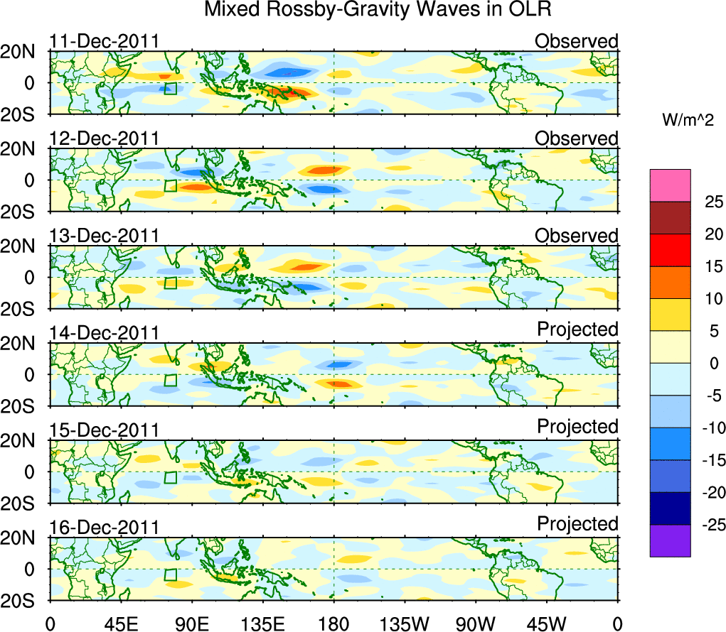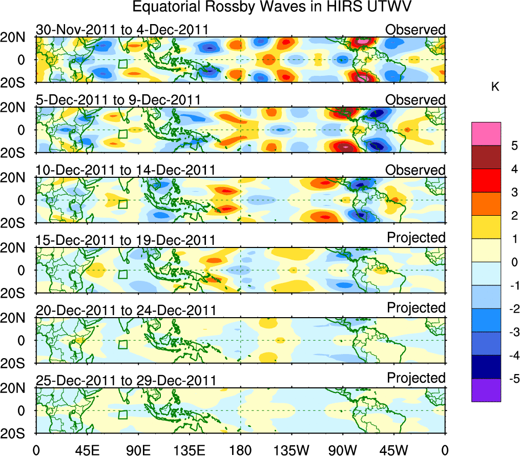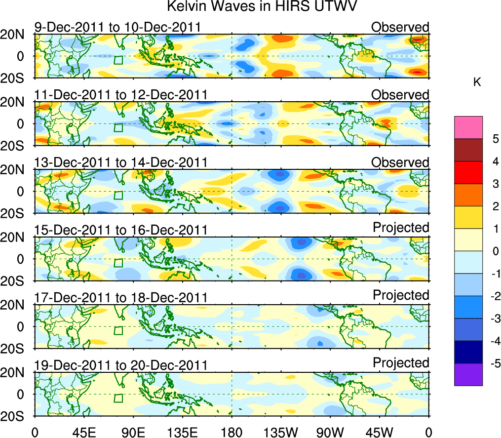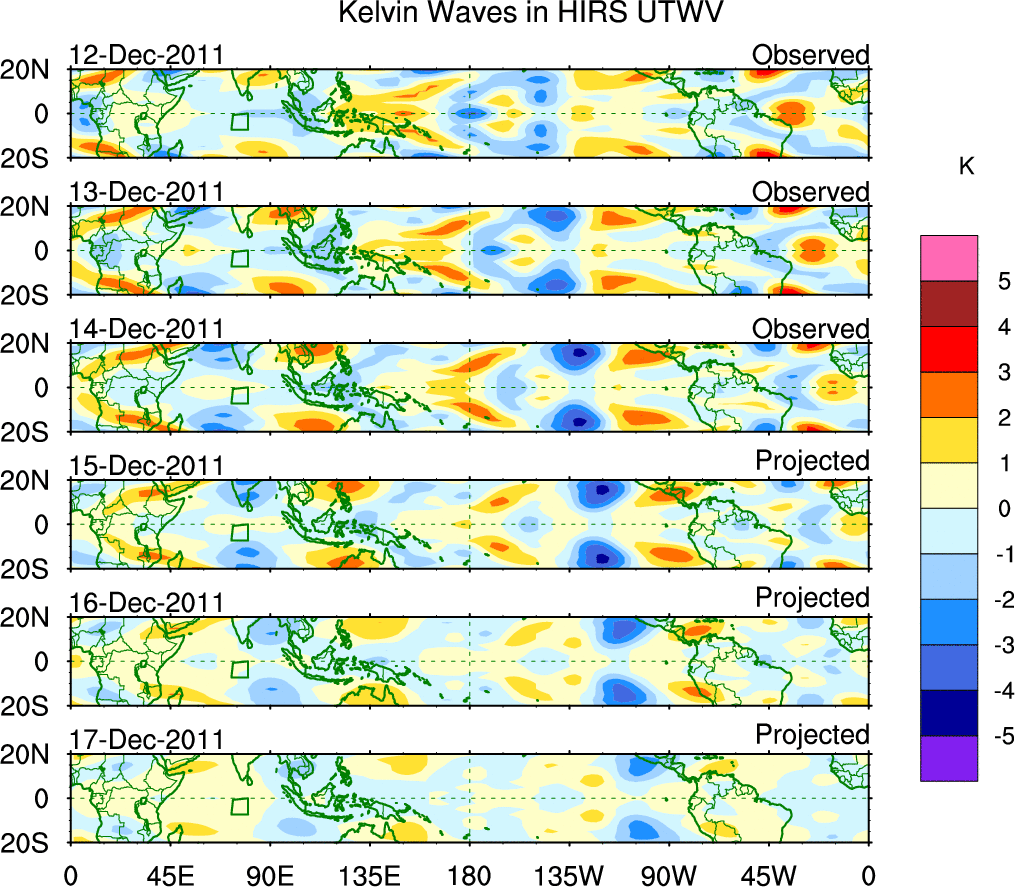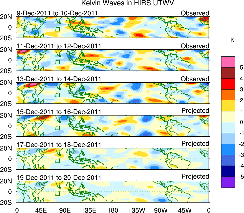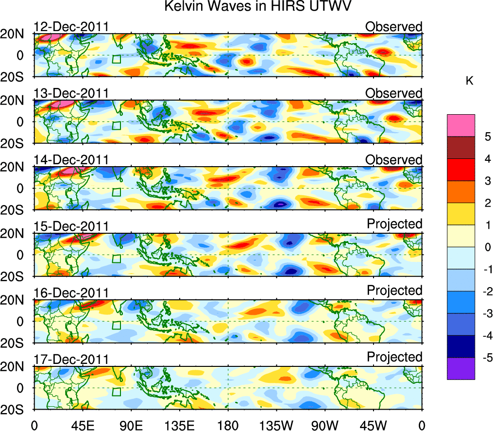 To identify tropical waves in near real-time, the OLR and UTWV data are filtered following Wheeler & Weickmann (2001 MWR). The daily anomalies are calculated using the first 3 harmonics of the seasonal cycle for 1979–2009. Missing values are then filled using linear interpolation in space and time. The most recent 365 days of anomalies are padded with 659 days of zeroes, and the result is filtered for each wave type.