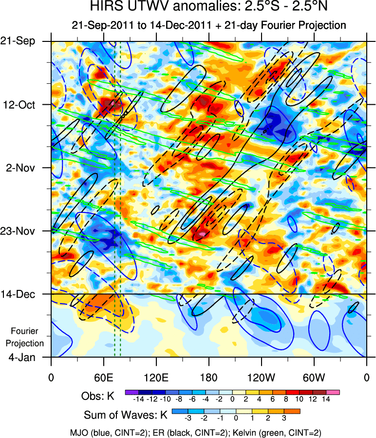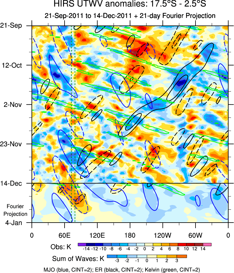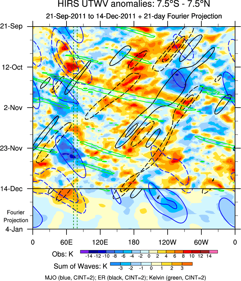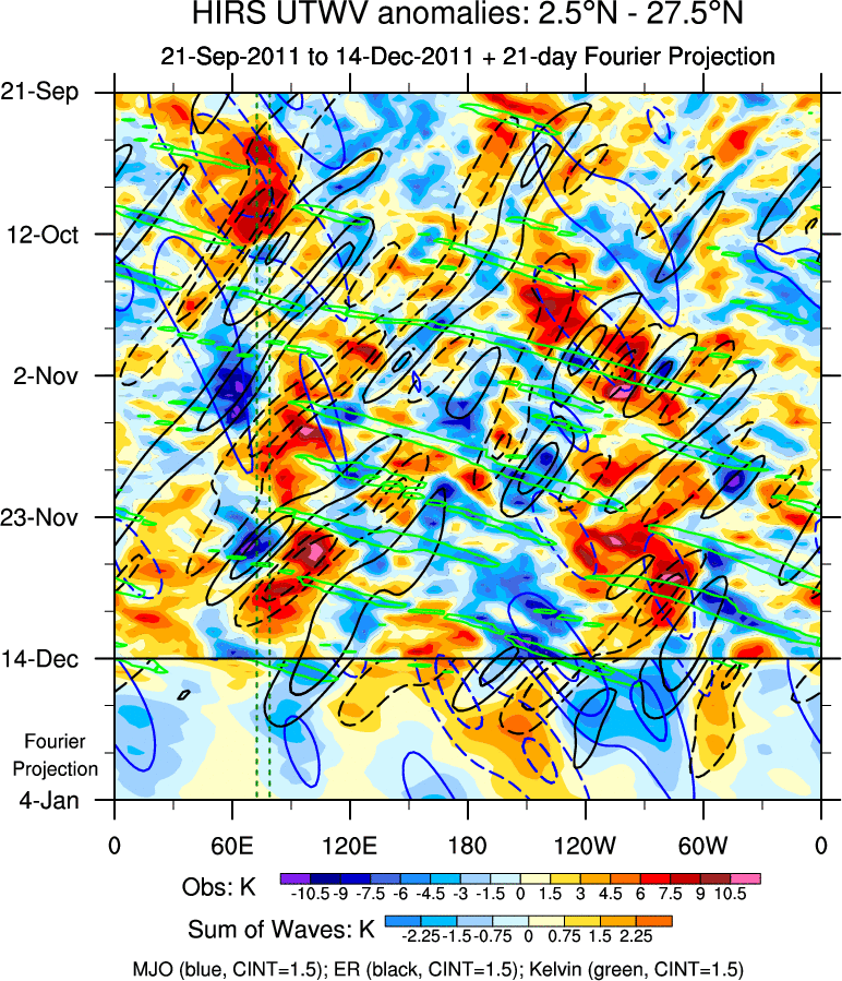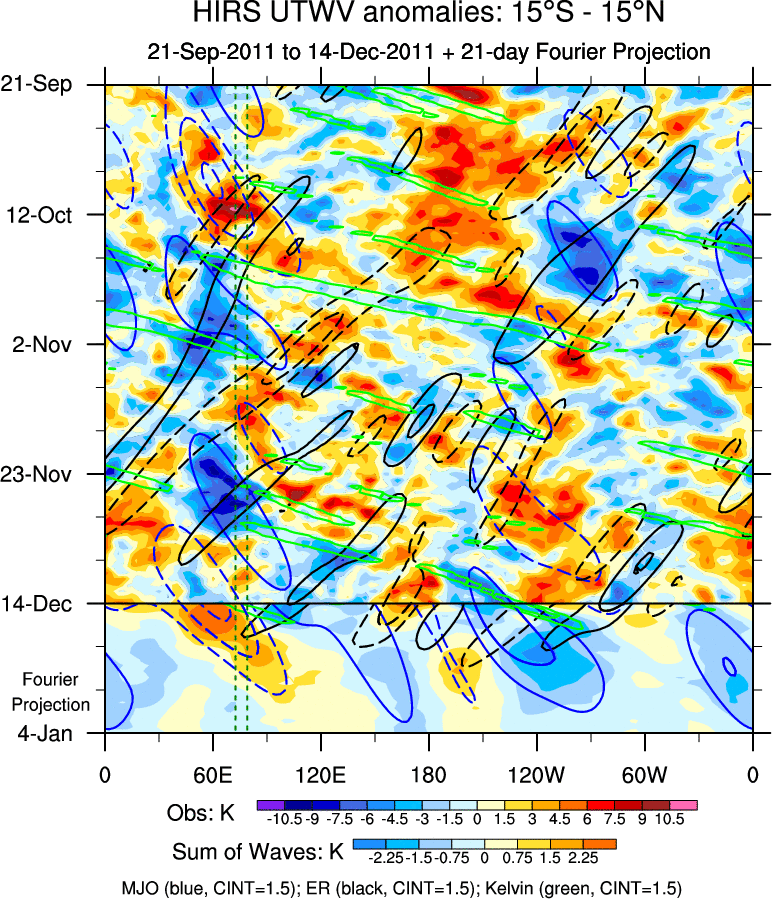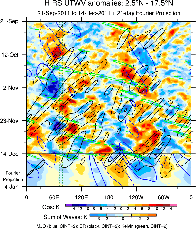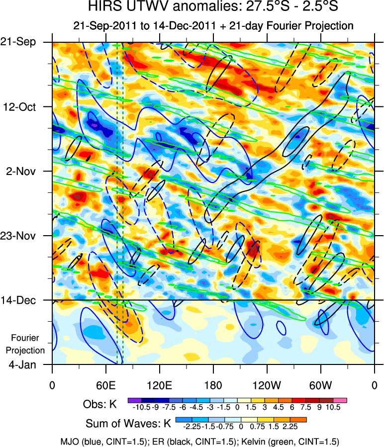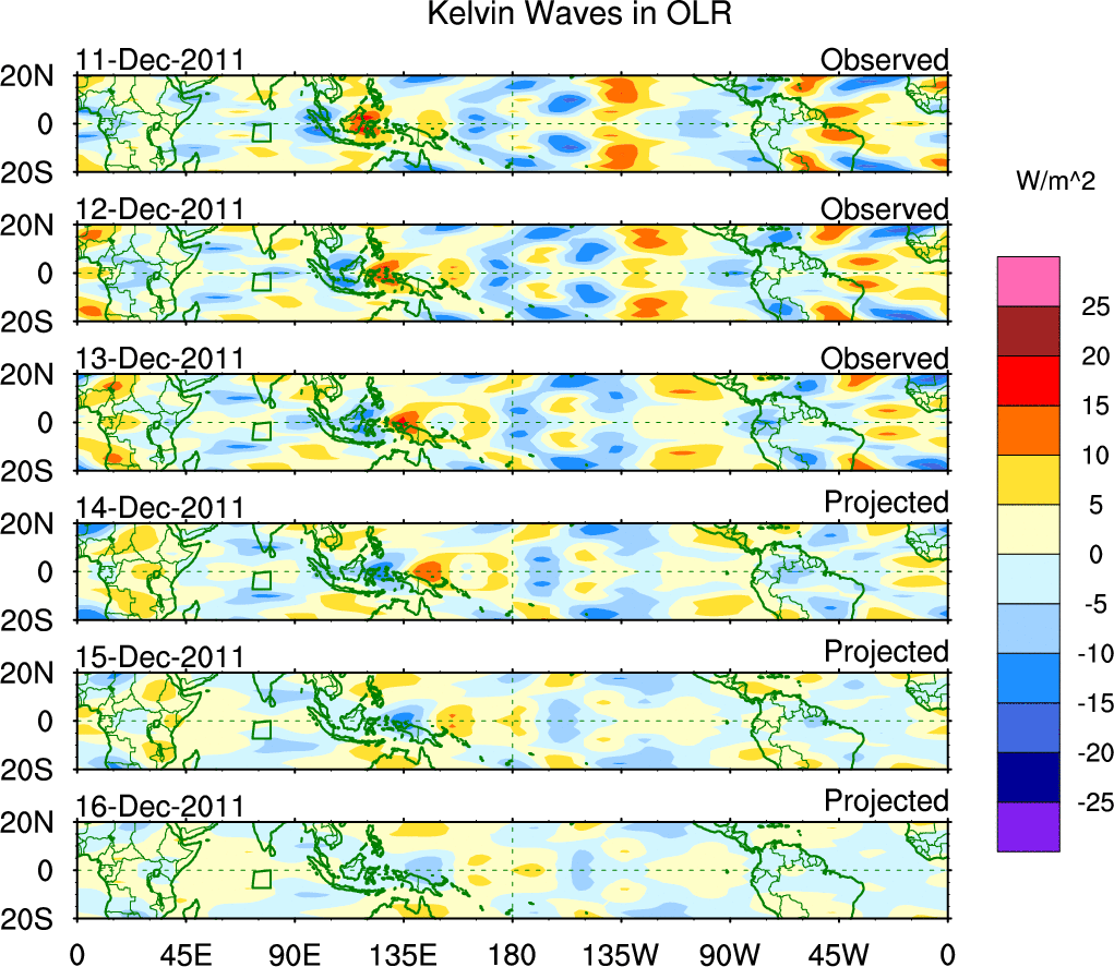 To identify tropical waves in near real-time, the OLR and UTWV data are filtered following Wheeler & Weickmann (2001 MWR). The daily anomalies are calculated using the first 3 harmonics of the seasonal cycle for 1979–2009. Missing values are then filled using linear interpolation in space and time. The most recent 365 days of anomalies are padded with 659 days of zeroes, and the result is filtered for each wave type.