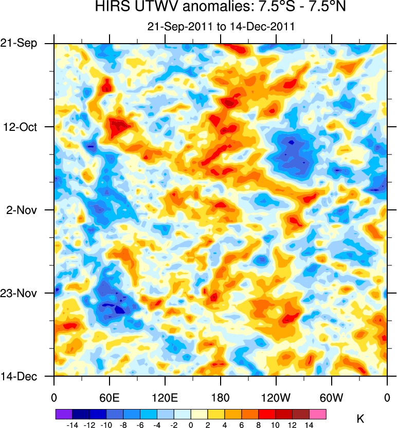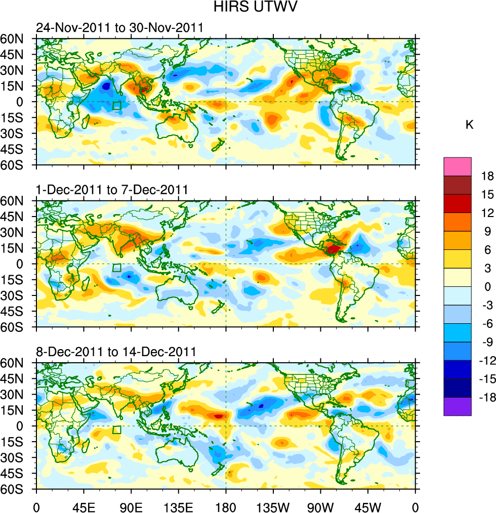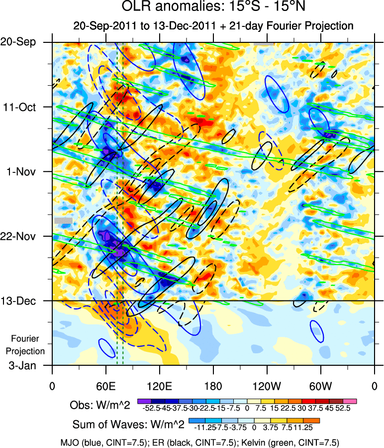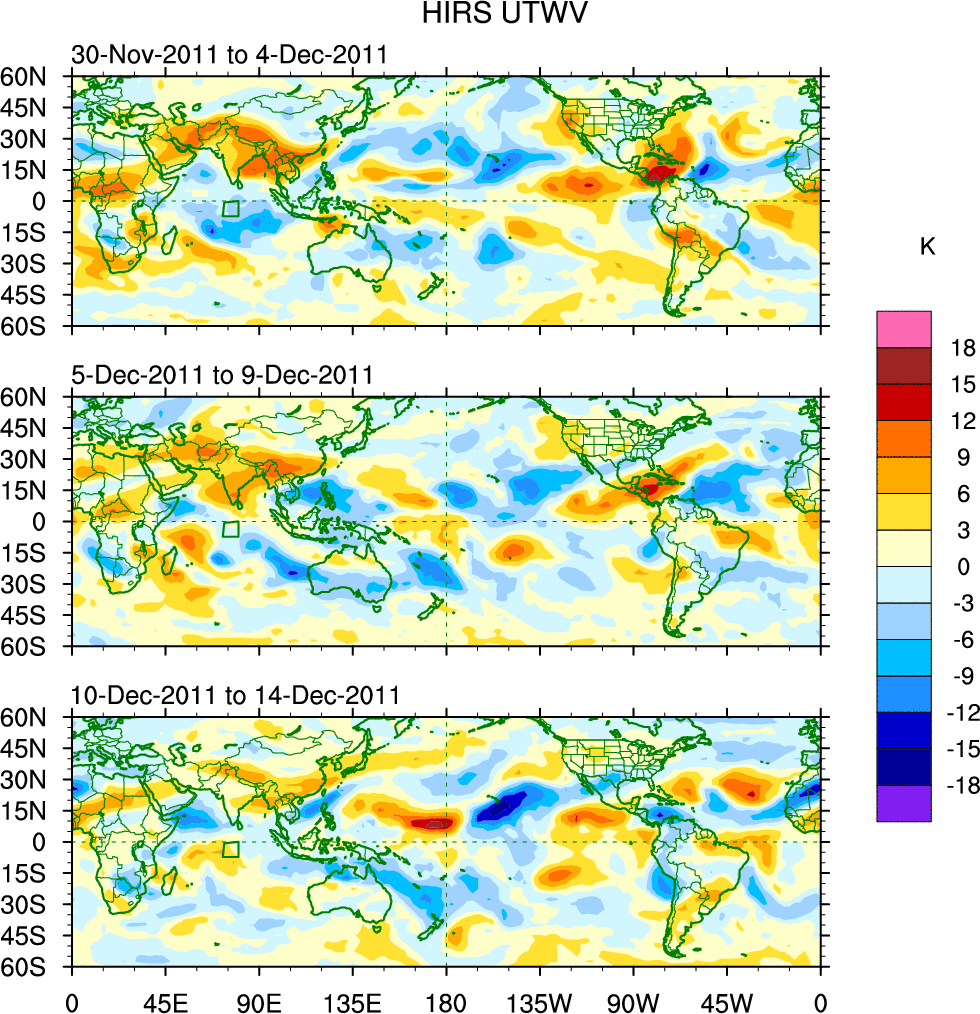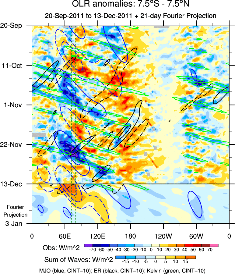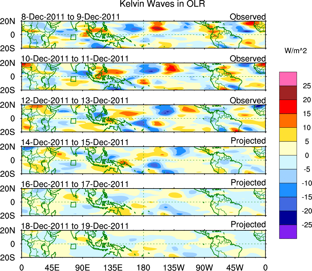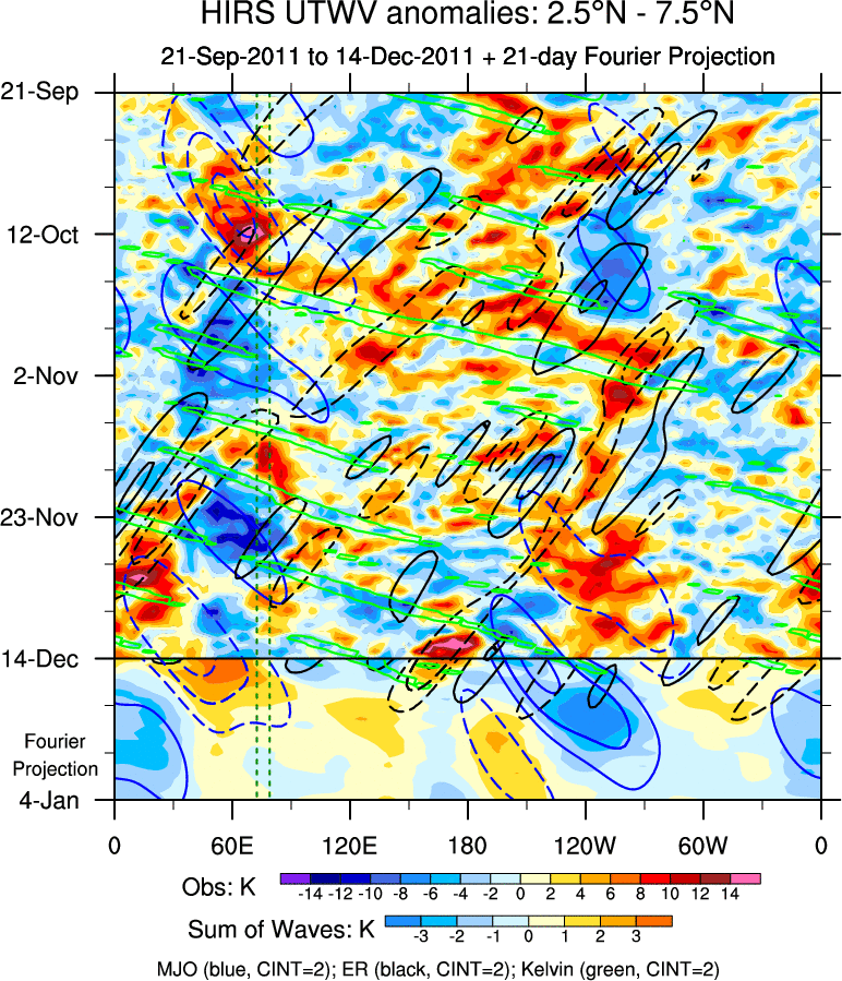 To identify tropical waves in near real-time, the OLR and UTWV data are filtered following Wheeler & Weickmann (2001 MWR). The daily anomalies are calculated using the first 3 harmonics of the seasonal cycle for 1979–2009. Missing values are then filled using linear interpolation in space and time. The most recent 365 days of anomalies are padded with 659 days of zeroes, and the result is filtered for each wave type.
