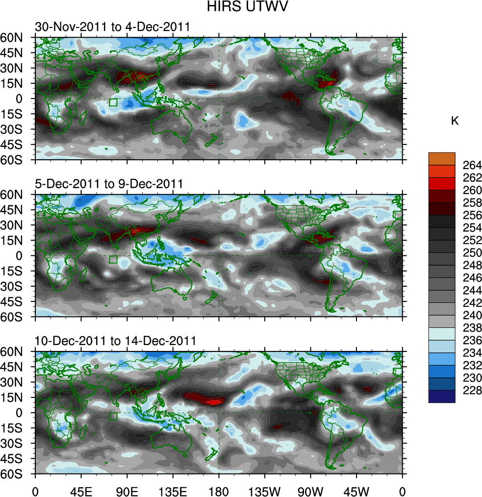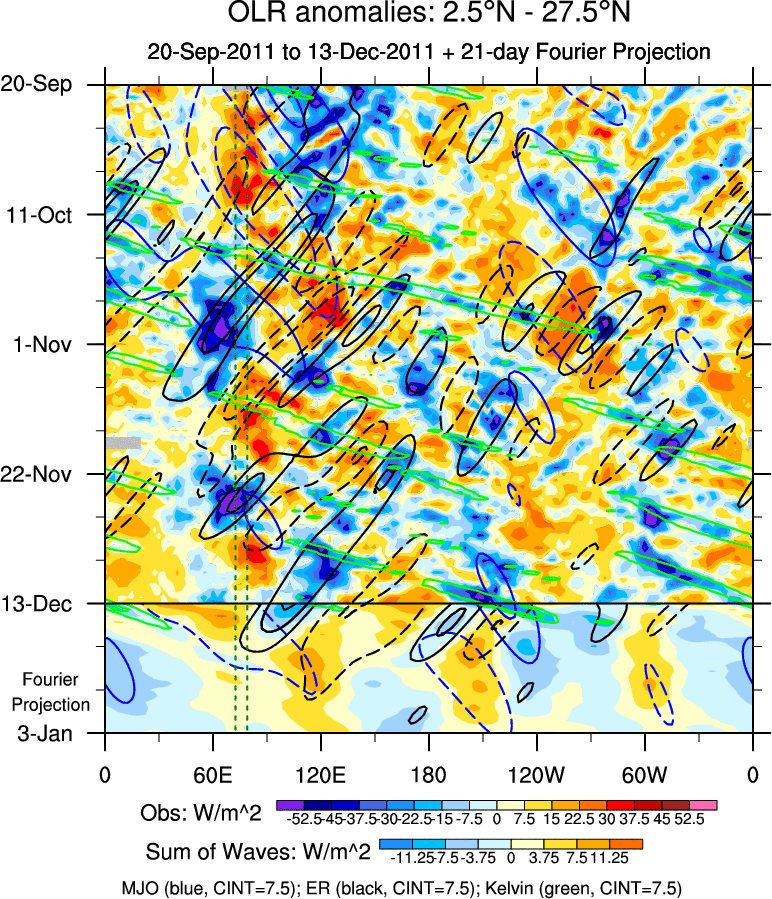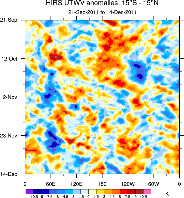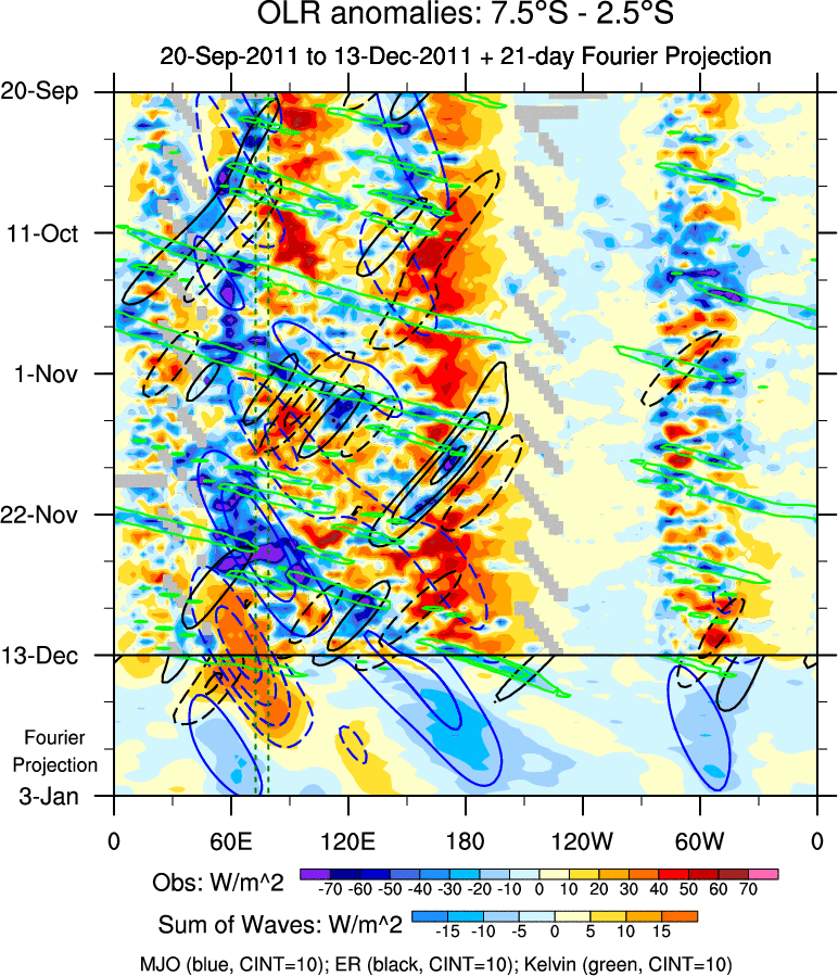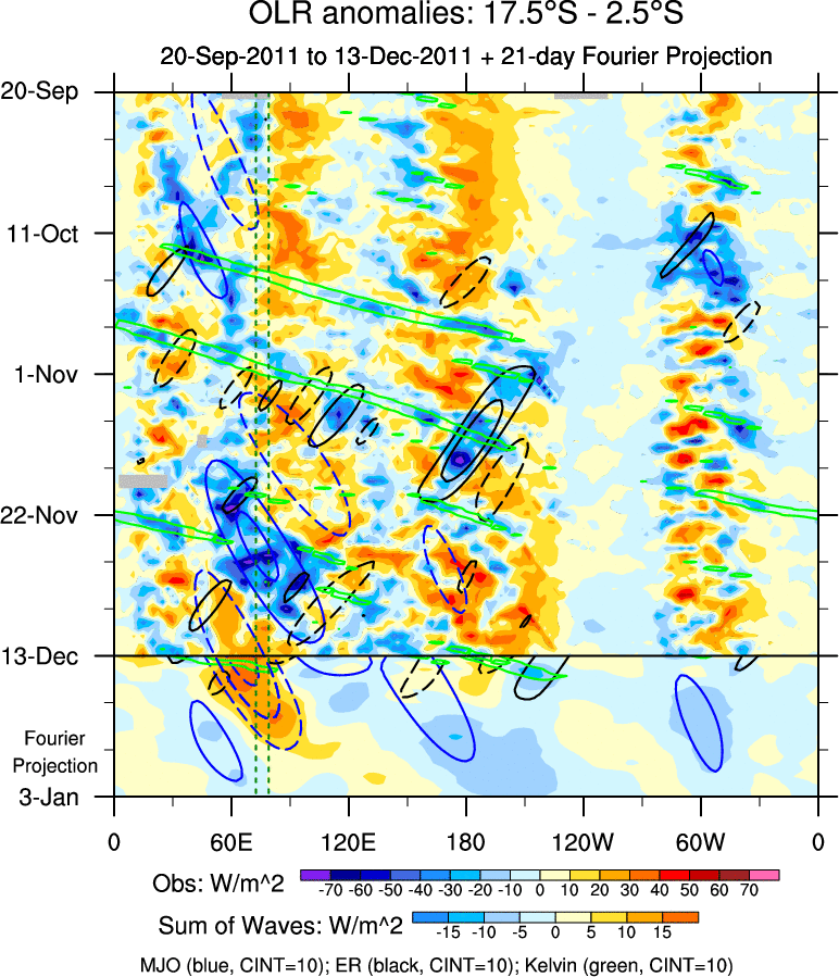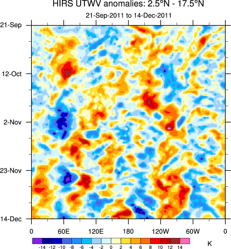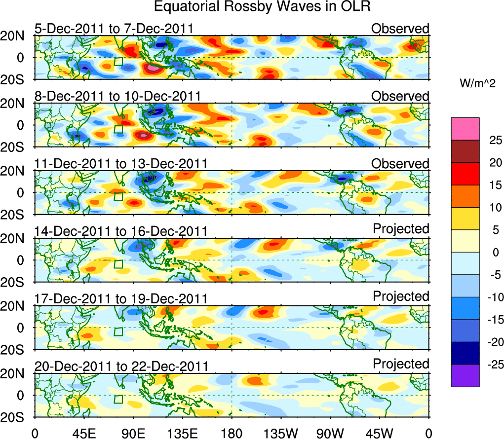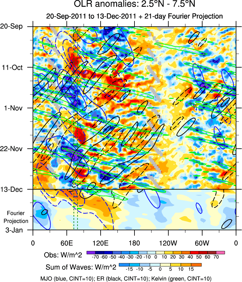 To identify tropical waves in near real-time, the OLR and UTWV data are filtered following Wheeler & Weickmann (2001 MWR). The daily anomalies are calculated using the first 3 harmonics of the seasonal cycle for 1979–2009. Missing values are then filled using linear interpolation in space and time. The most recent 365 days of anomalies are padded with 659 days of zeroes, and the result is filtered for each wave type.