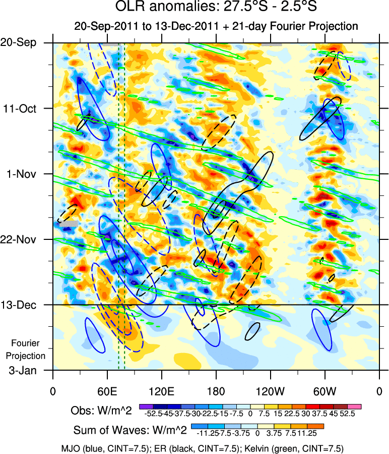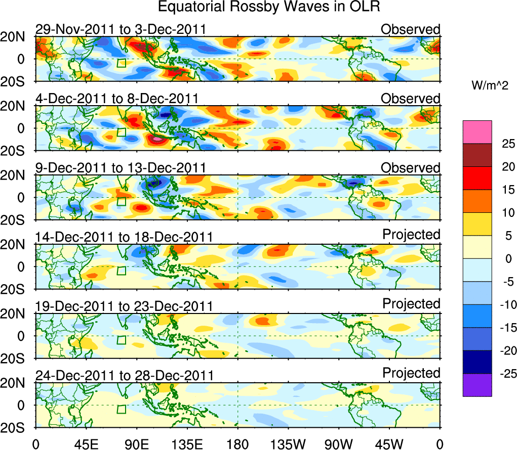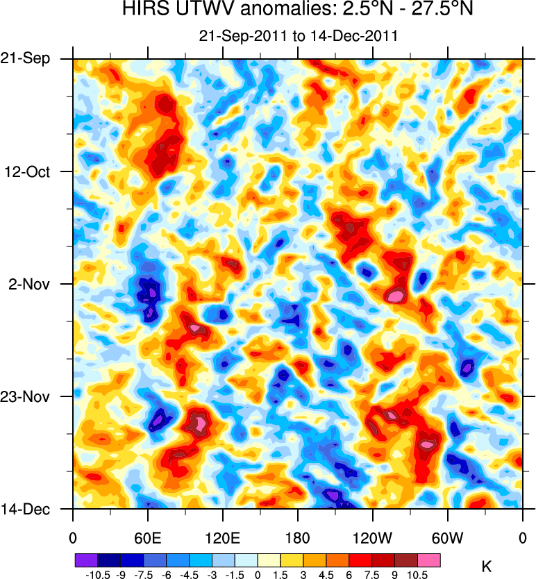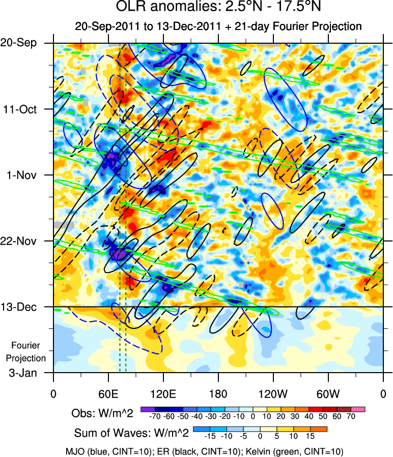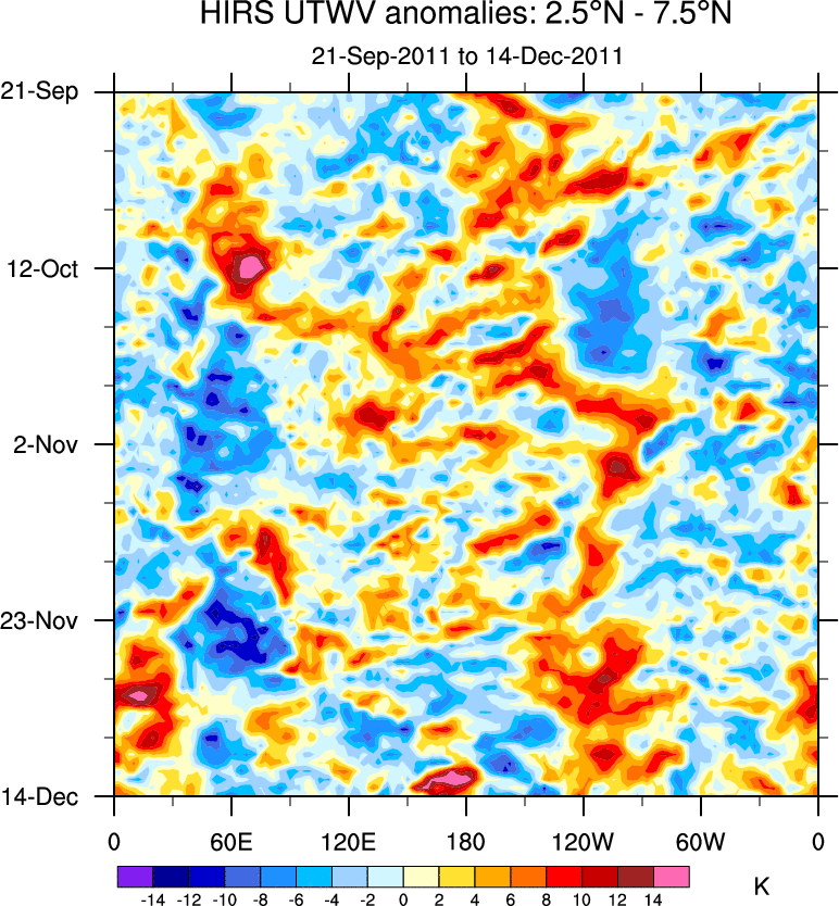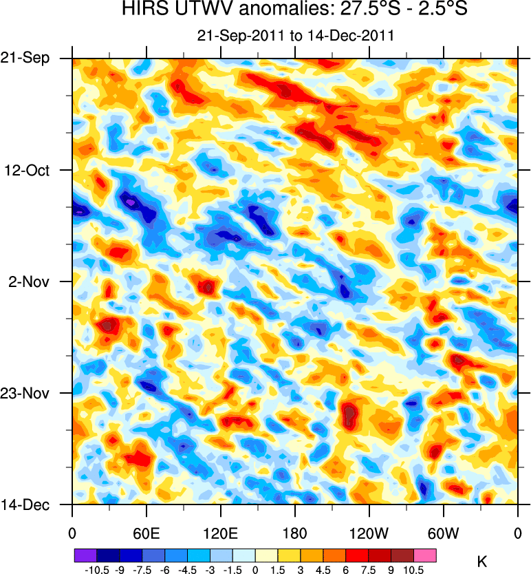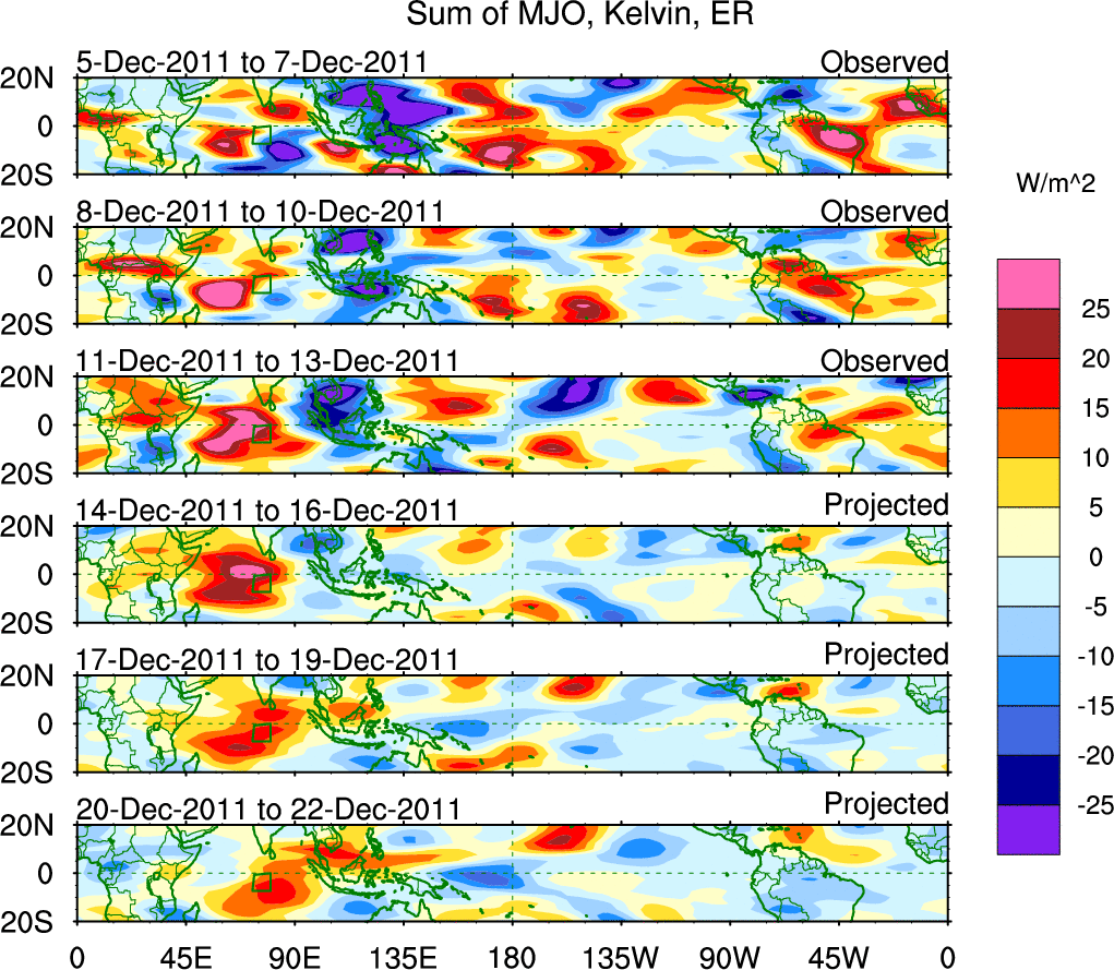 To identify tropical waves in near real-time, the OLR and UTWV data are filtered following Wheeler & Weickmann (2001 MWR). The daily anomalies are calculated using the first 3 harmonics of the seasonal cycle for 1979–2009. Missing values are then filled using linear interpolation in space and time. The most recent 365 days of anomalies are padded with 659 days of zeroes, and the result is filtered for each wave type.