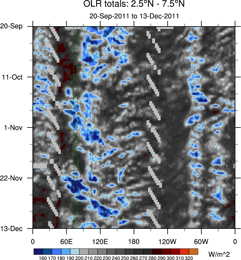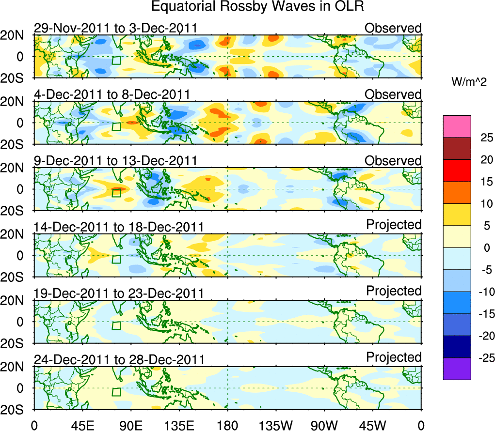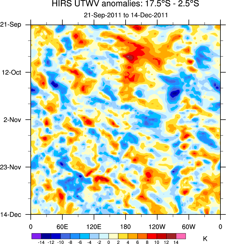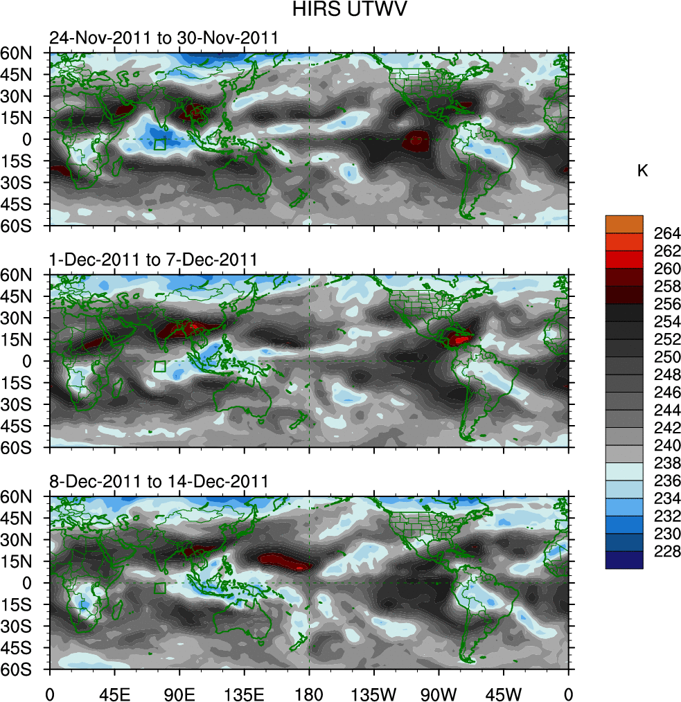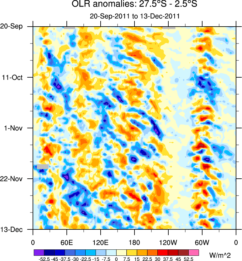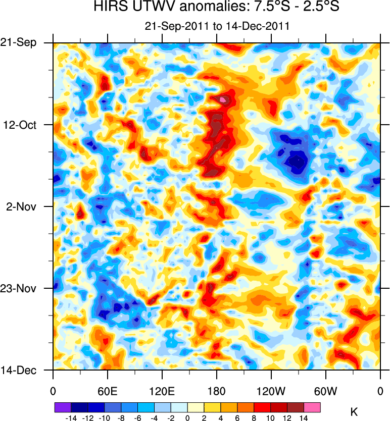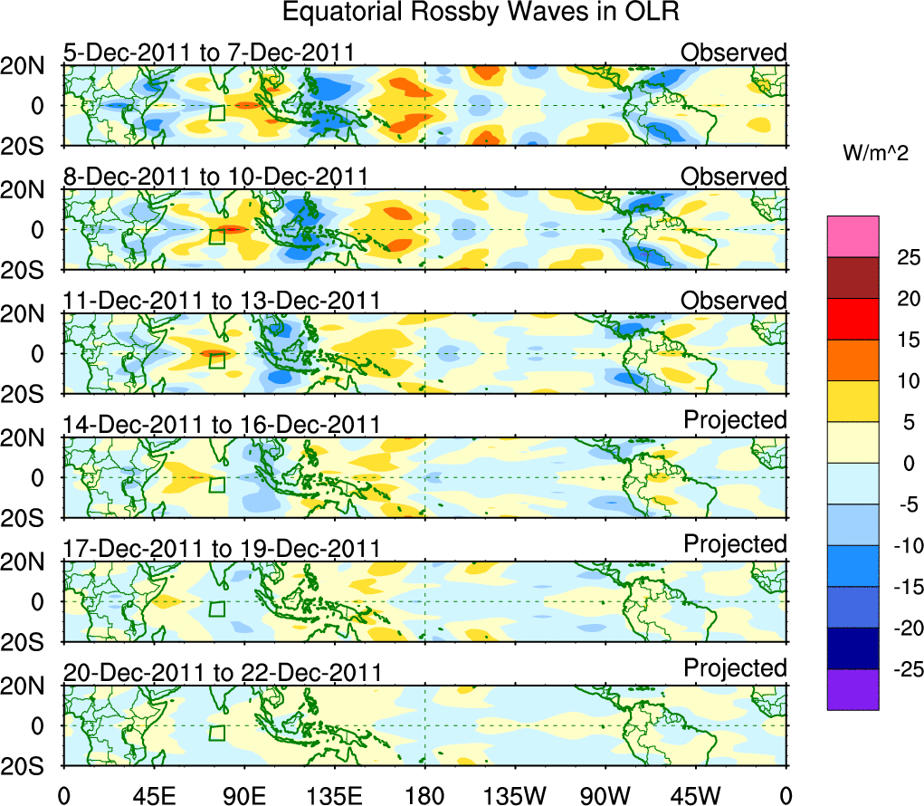 To identify tropical waves in near real-time, the OLR and UTWV data are filtered following Wheeler & Weickmann (2001 MWR). The daily anomalies are calculated using the first 3 harmonics of the seasonal cycle for 1979–2009. Missing values are then filled using linear interpolation in space and time. The most recent 365 days of anomalies are padded with 659 days of zeroes, and the result is filtered for each wave type.
