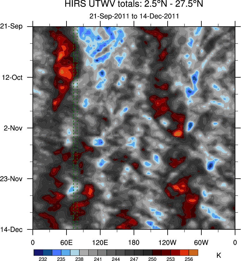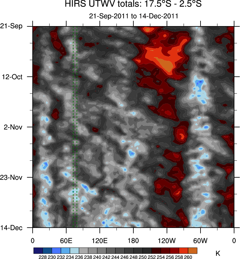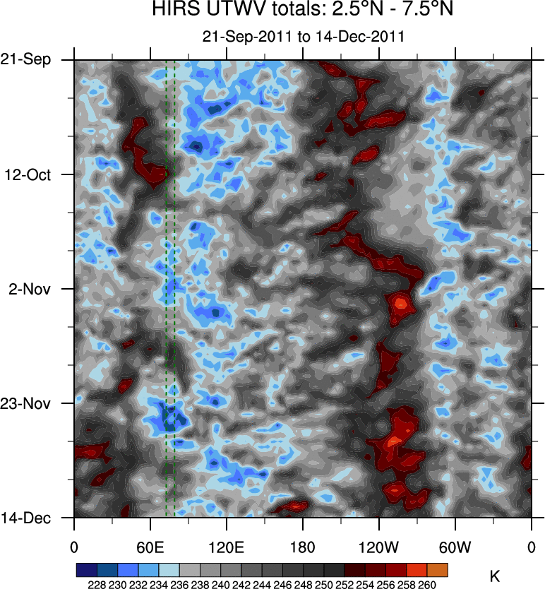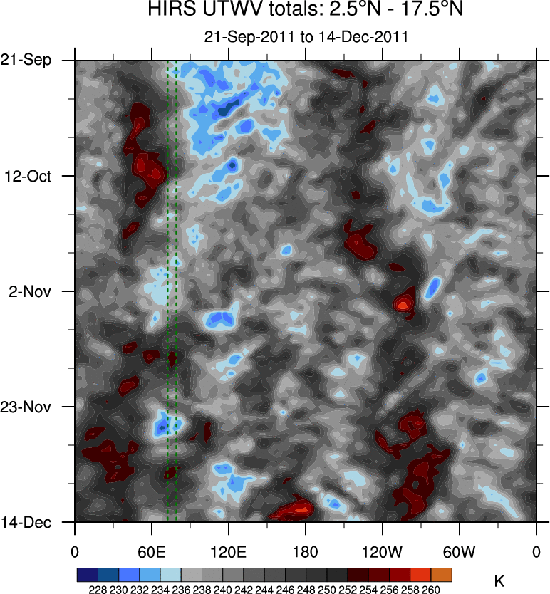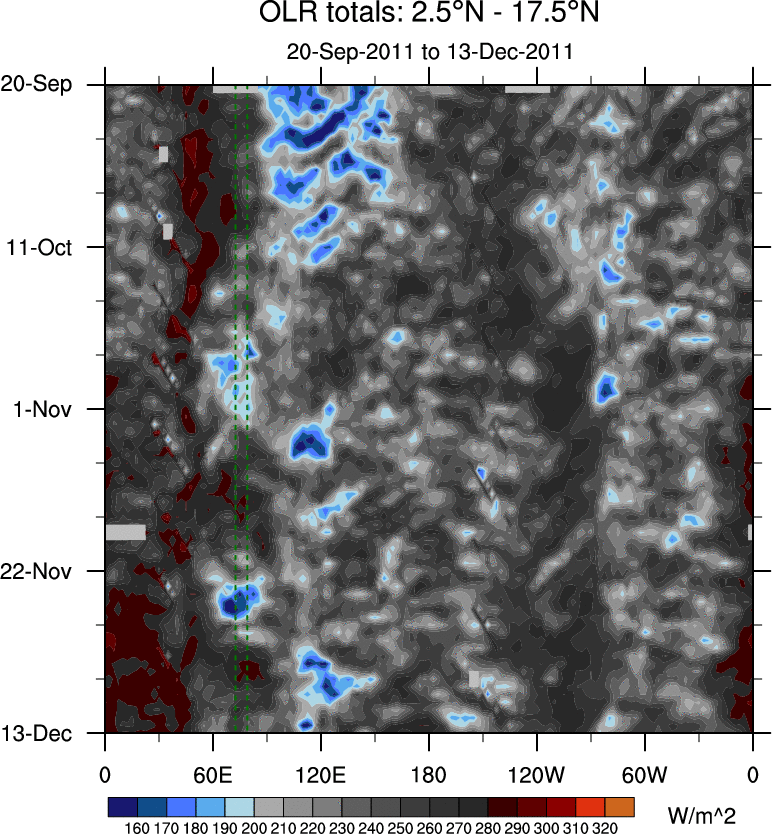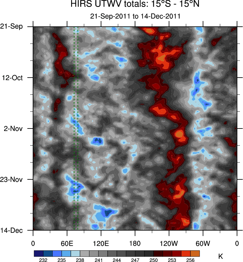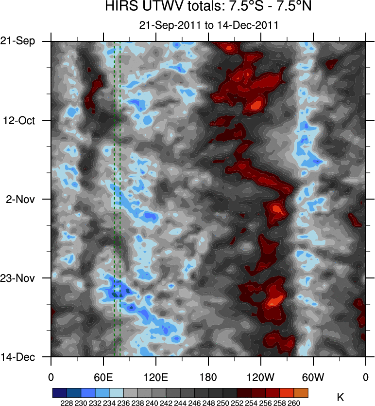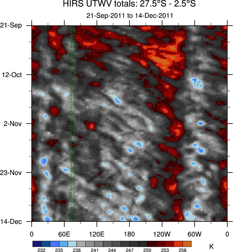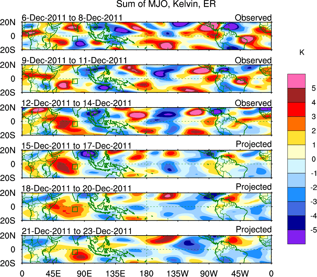 To identify tropical waves in near real-time, the OLR and UTWV data are filtered following Wheeler & Weickmann (2001 MWR). The daily anomalies are calculated using the first 3 harmonics of the seasonal cycle for 1979–2009. Missing values are then filled using linear interpolation in space and time. The most recent 365 days of anomalies are padded with 659 days of zeroes, and the result is filtered for each wave type.