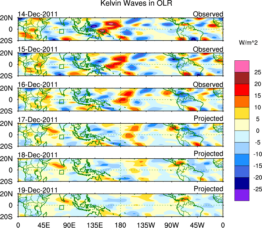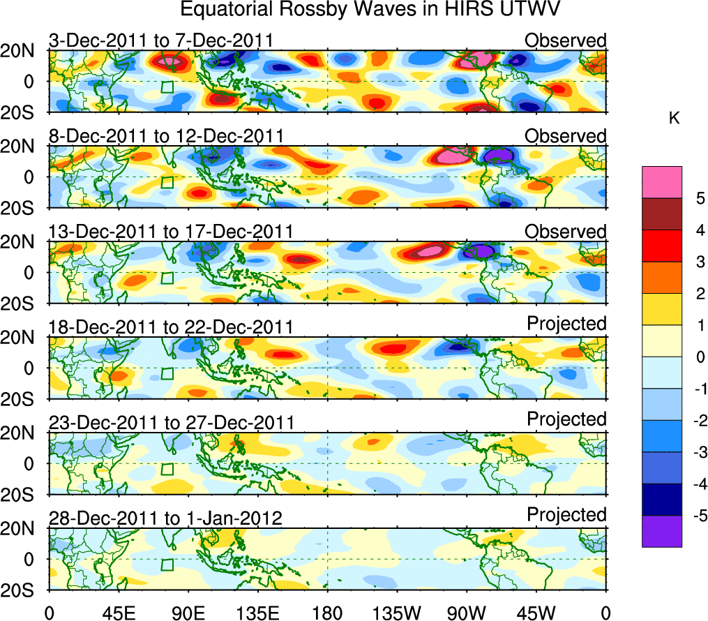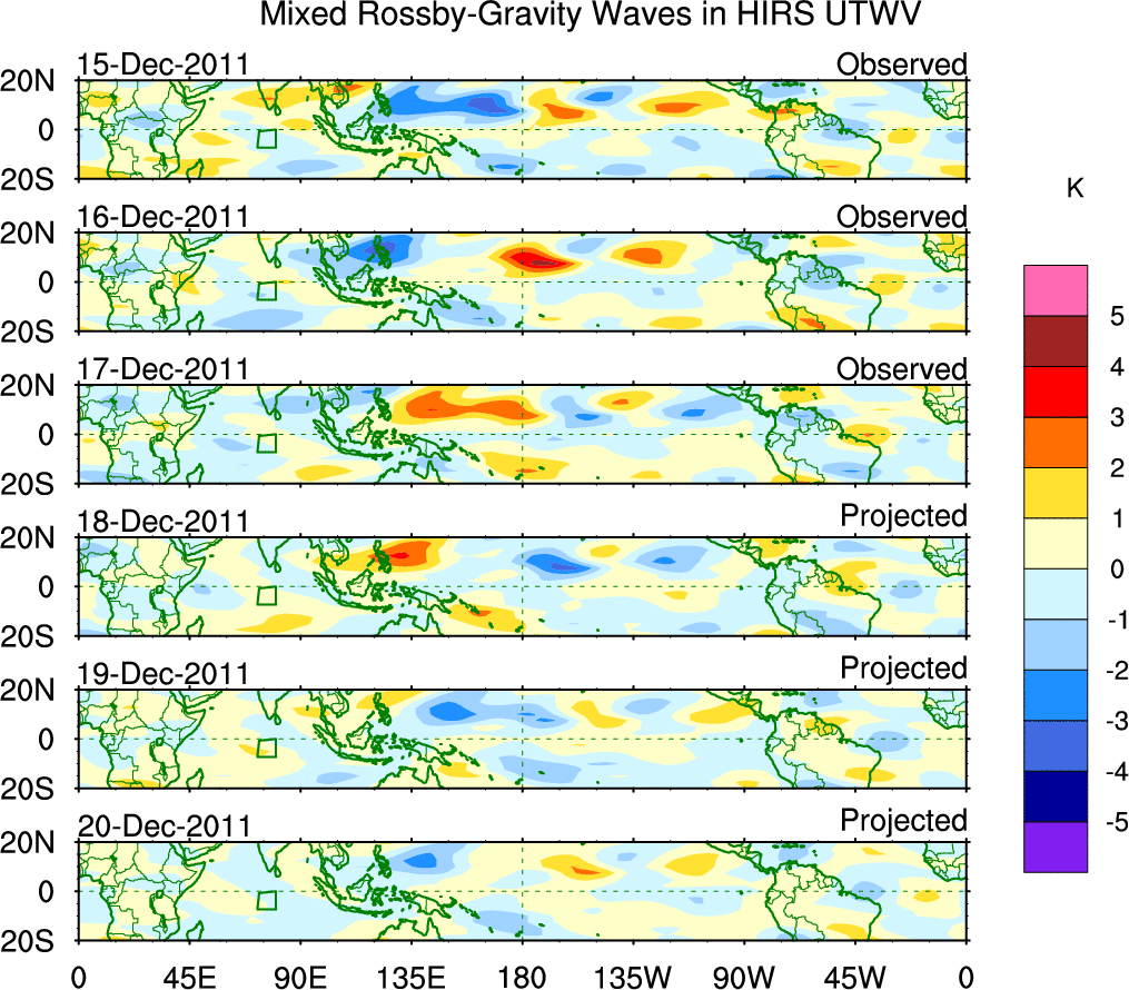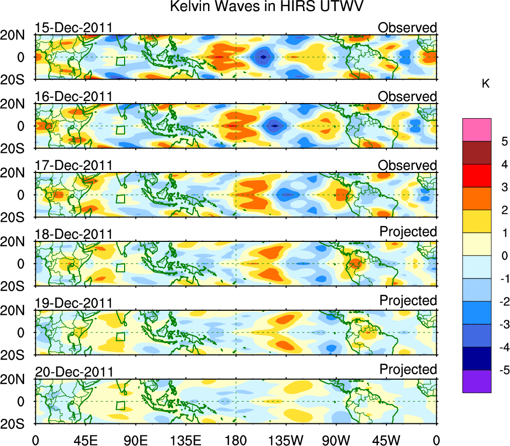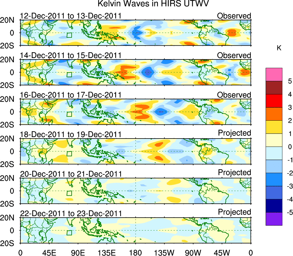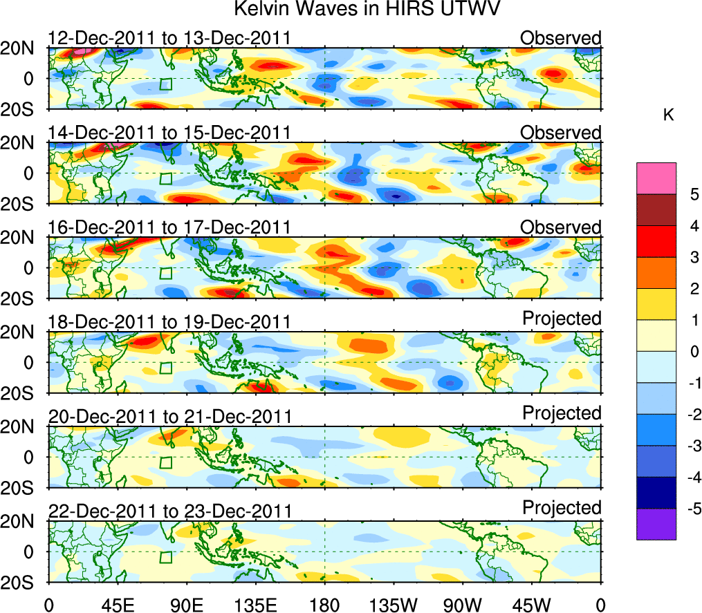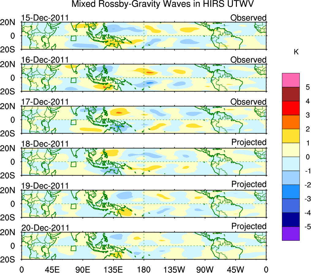 To identify tropical waves in near real-time, the OLR and UTWV data are filtered following Wheeler & Weickmann (2001 MWR). The daily anomalies are calculated using the first 3 harmonics of the seasonal cycle for 1979–2009. Missing values are then filled using linear interpolation in space and time. The most recent 365 days of anomalies are padded with 659 days of zeroes, and the result is filtered for each wave type.