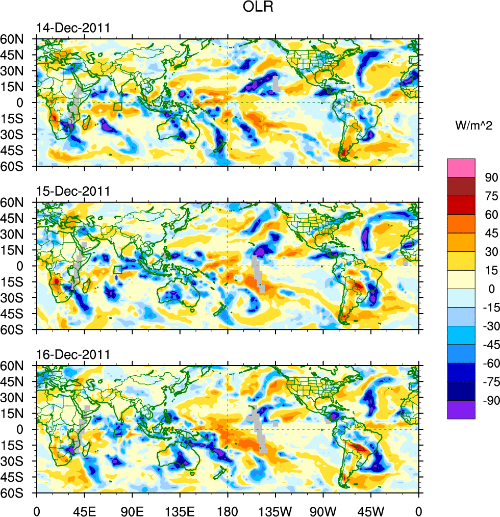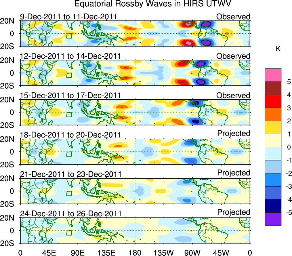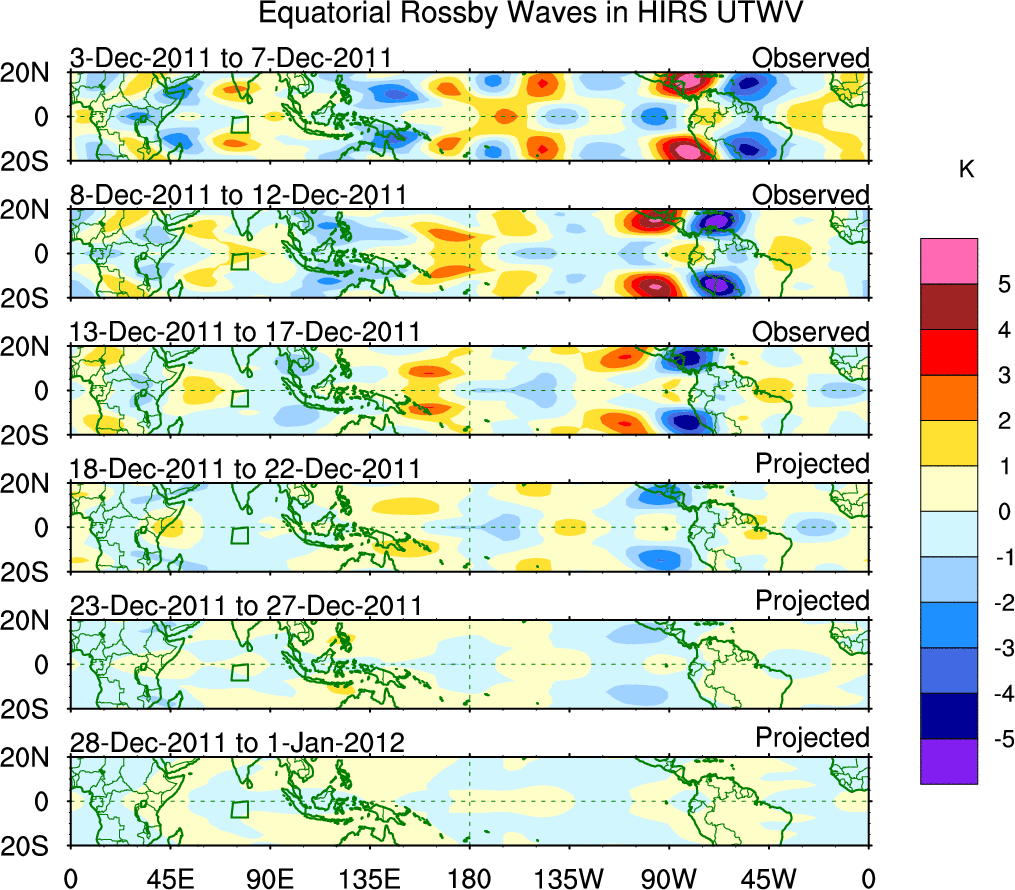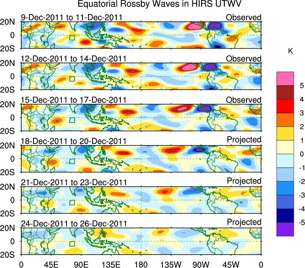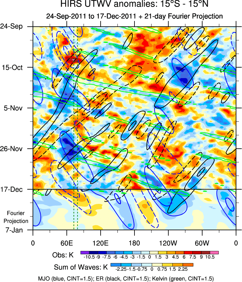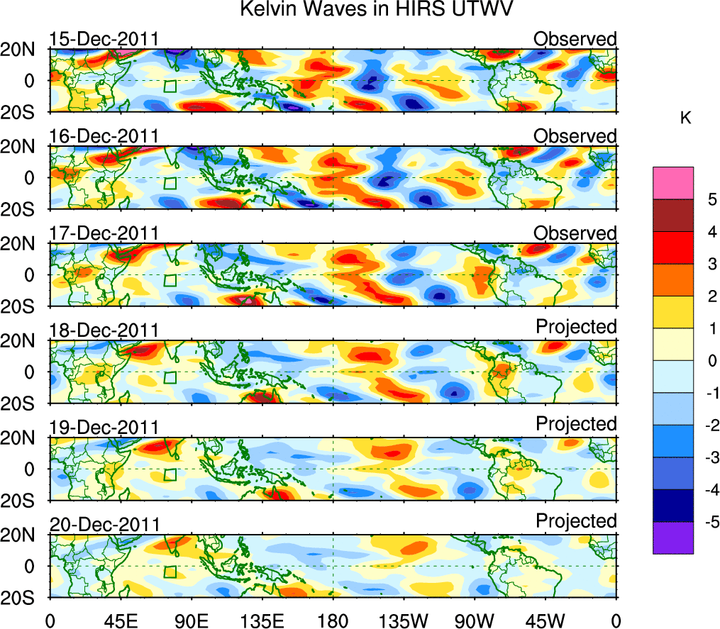 To identify tropical waves in near real-time, the OLR and UTWV data are filtered following Wheeler & Weickmann (2001 MWR). The daily anomalies are calculated using the first 3 harmonics of the seasonal cycle for 1979–2009. Missing values are then filled using linear interpolation in space and time. The most recent 365 days of anomalies are padded with 659 days of zeroes, and the result is filtered for each wave type.