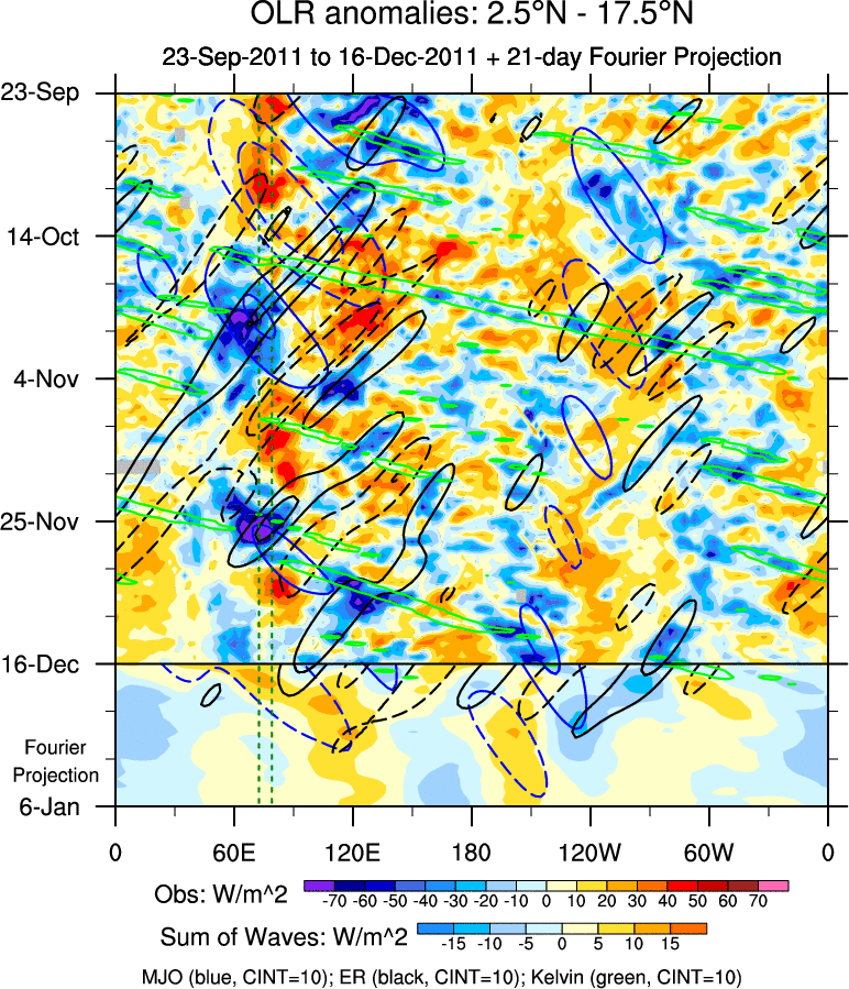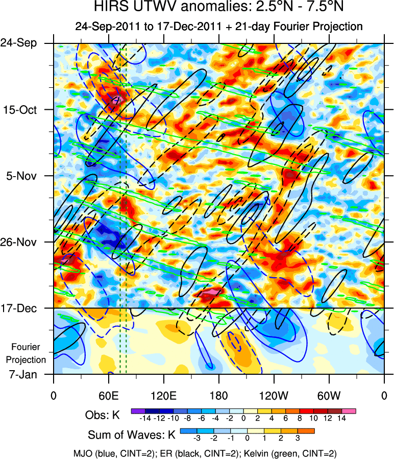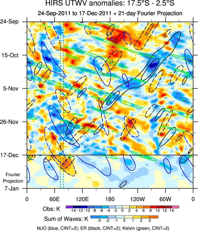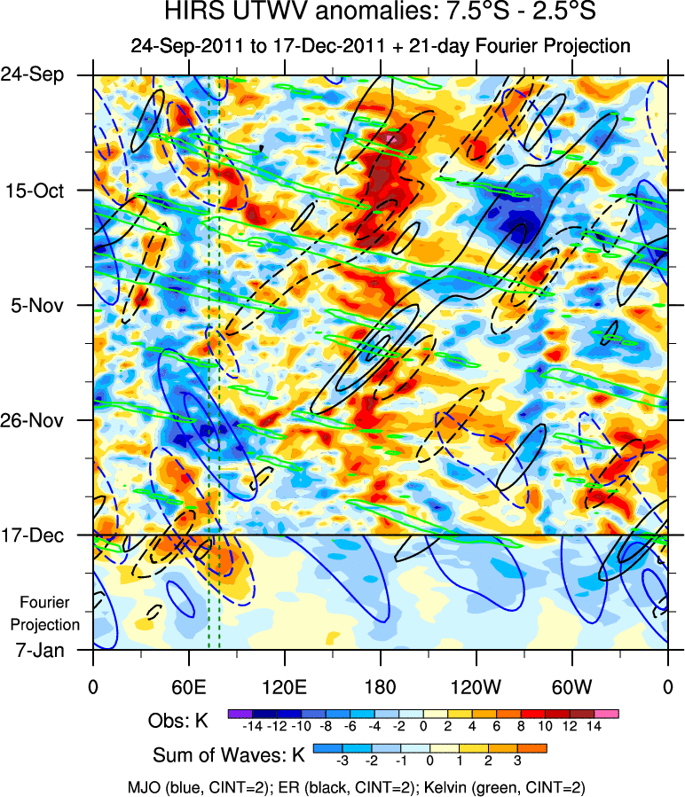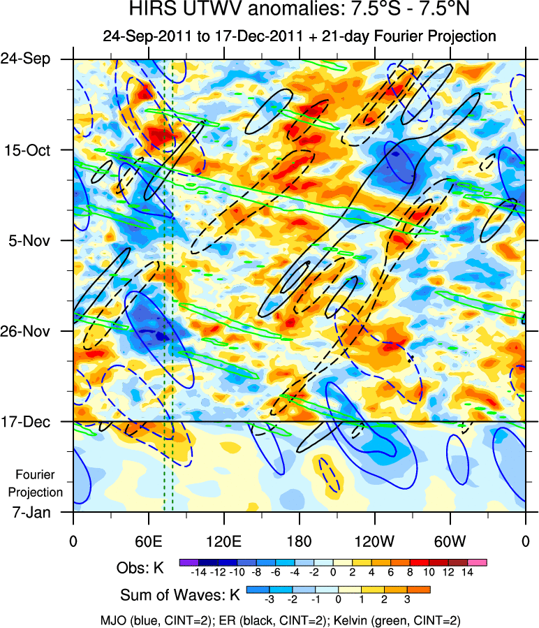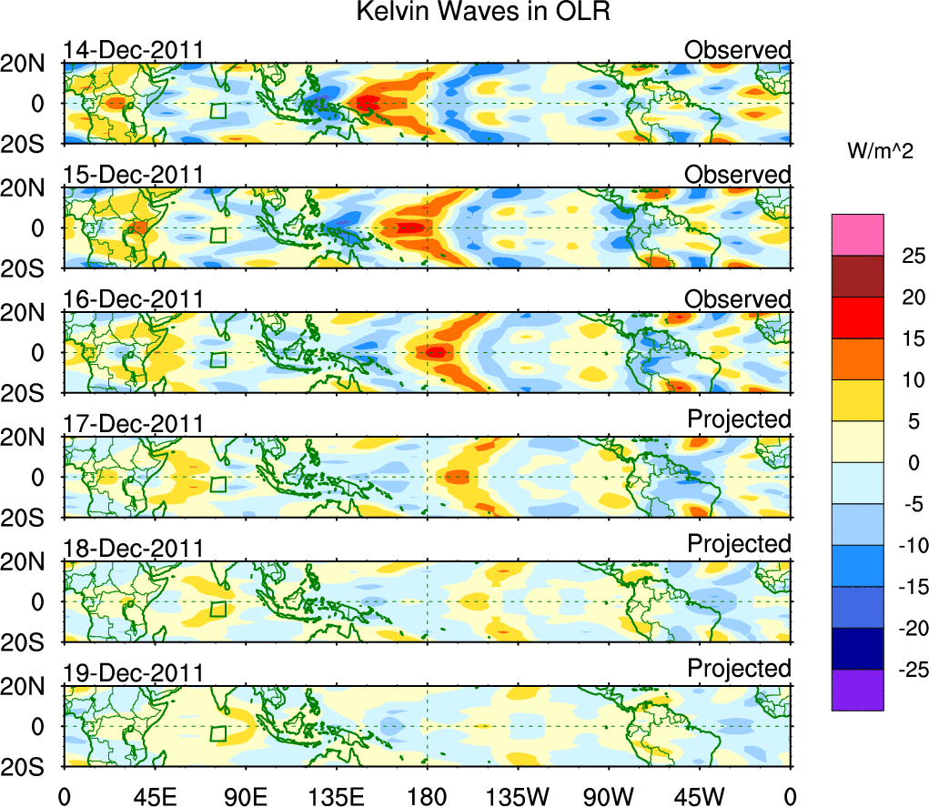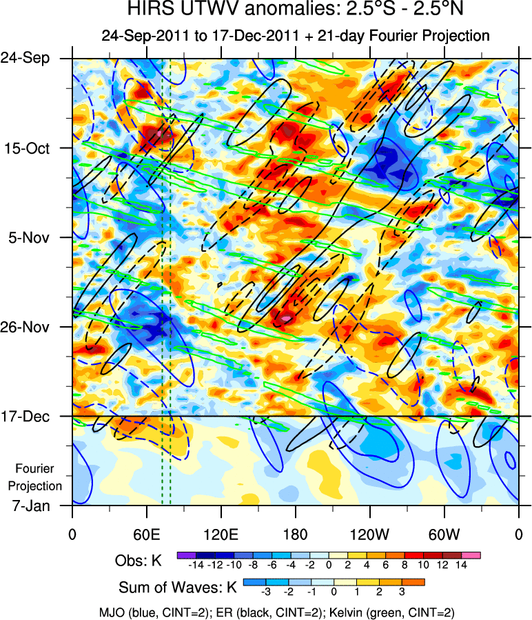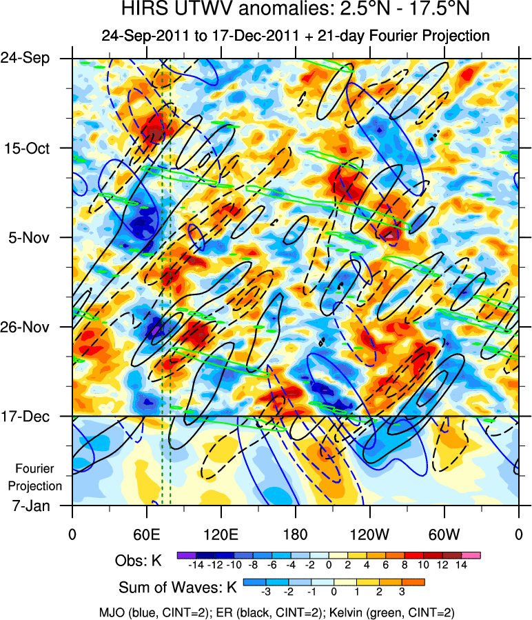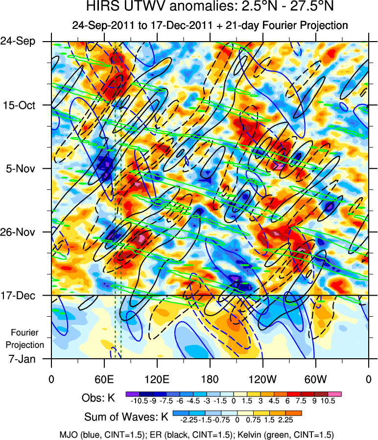 To identify tropical waves in near real-time, the OLR and UTWV data are filtered following Wheeler & Weickmann (2001 MWR). The daily anomalies are calculated using the first 3 harmonics of the seasonal cycle for 1979–2009. Missing values are then filled using linear interpolation in space and time. The most recent 365 days of anomalies are padded with 659 days of zeroes, and the result is filtered for each wave type.