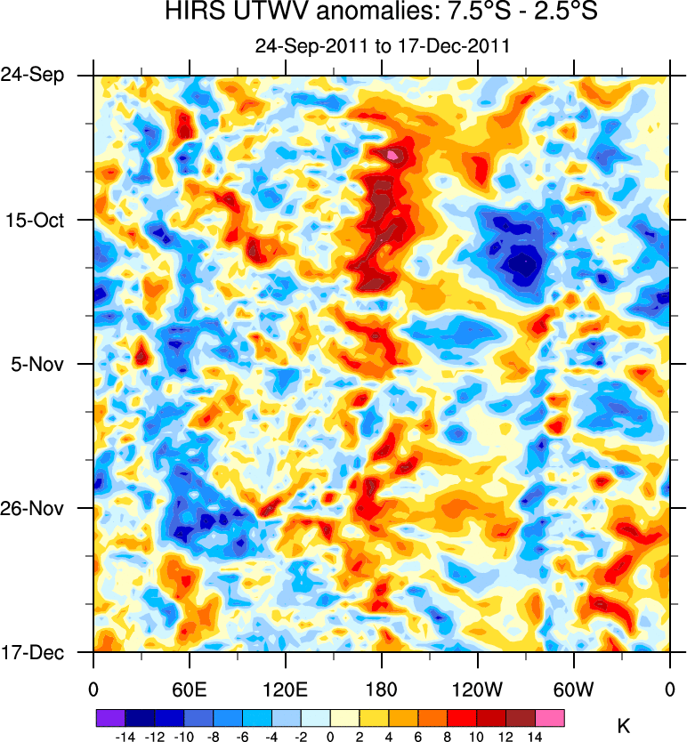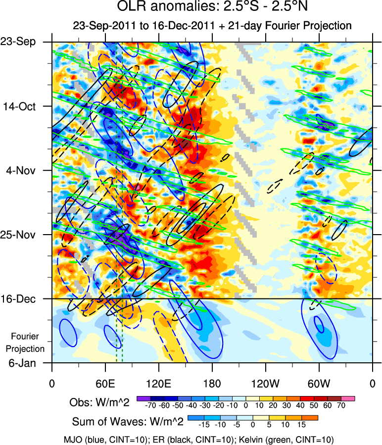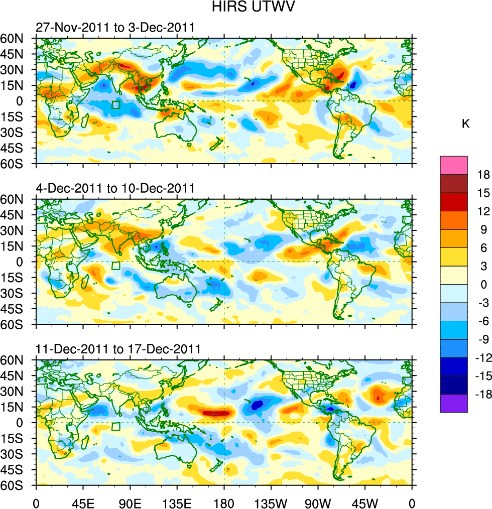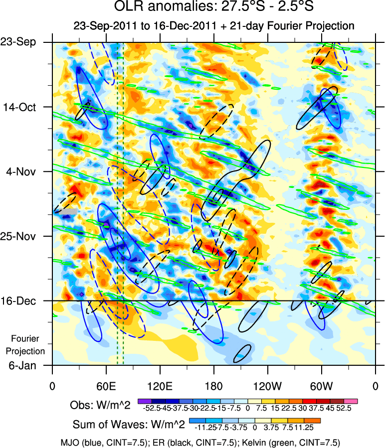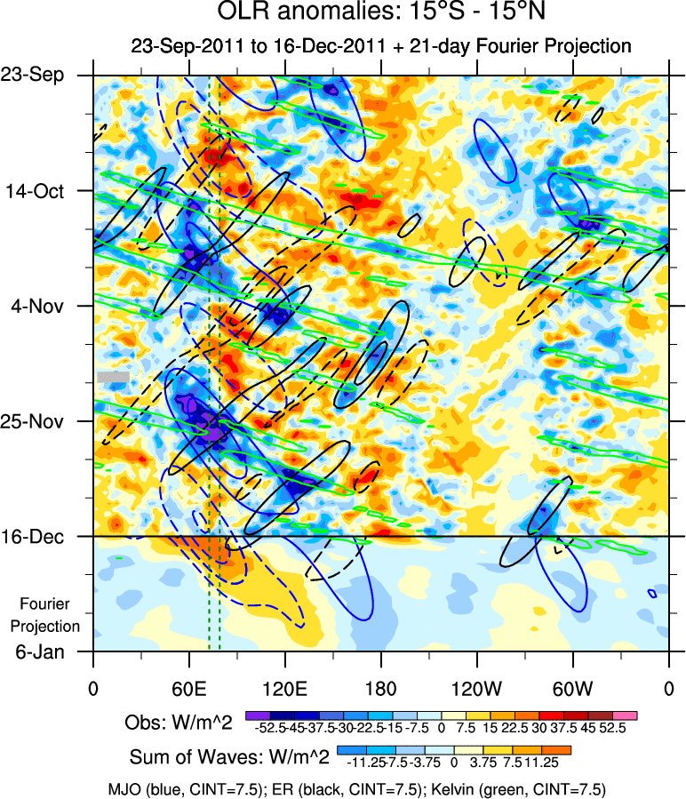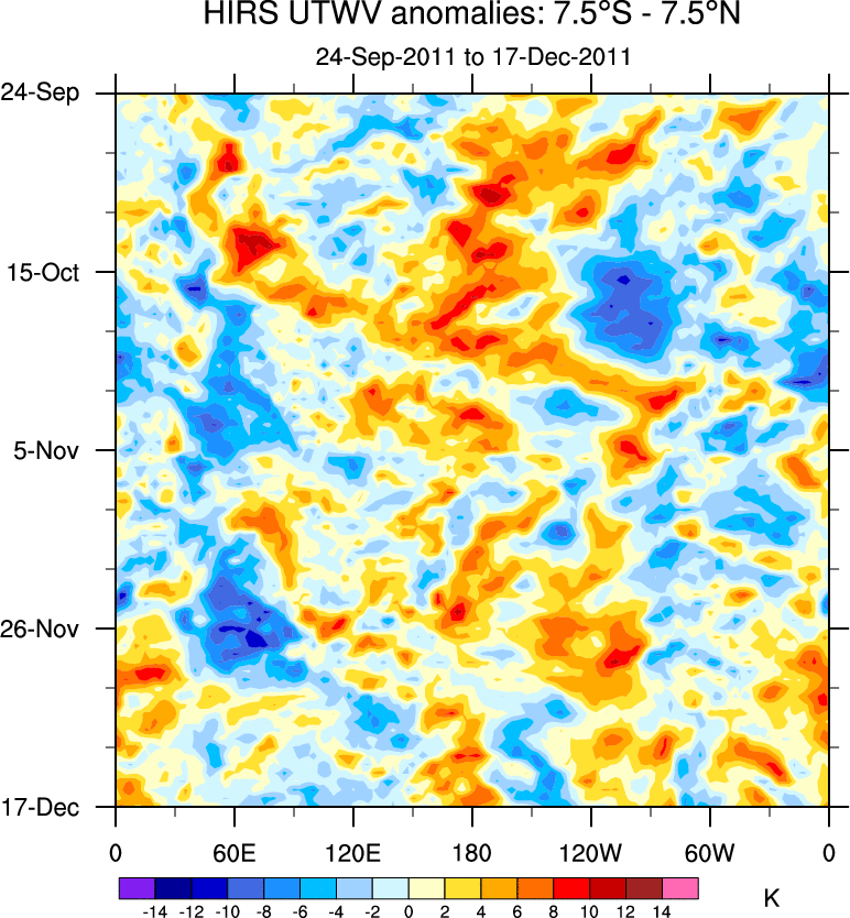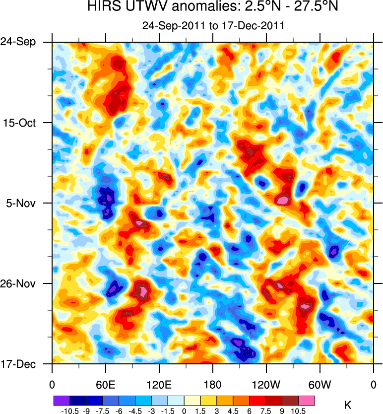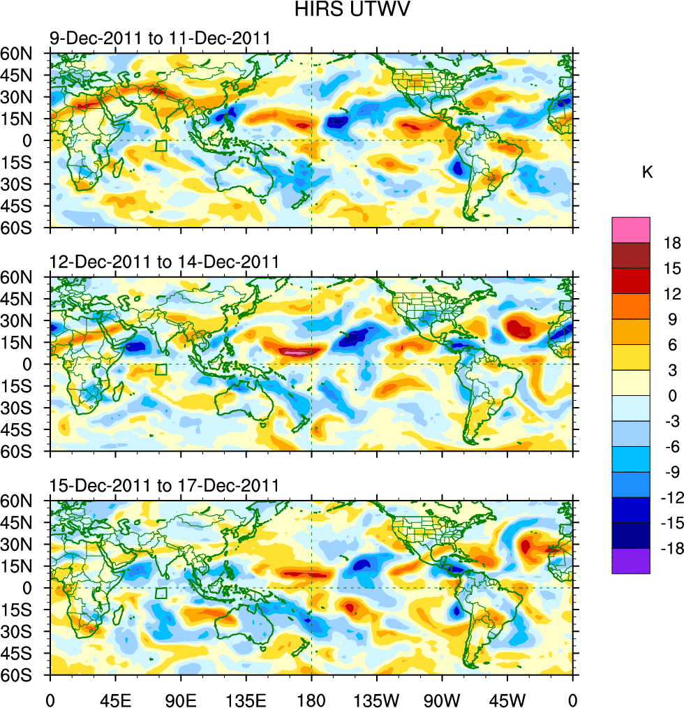 To identify tropical waves in near real-time, the OLR and UTWV data are filtered following Wheeler & Weickmann (2001 MWR). The daily anomalies are calculated using the first 3 harmonics of the seasonal cycle for 1979–2009. Missing values are then filled using linear interpolation in space and time. The most recent 365 days of anomalies are padded with 659 days of zeroes, and the result is filtered for each wave type.