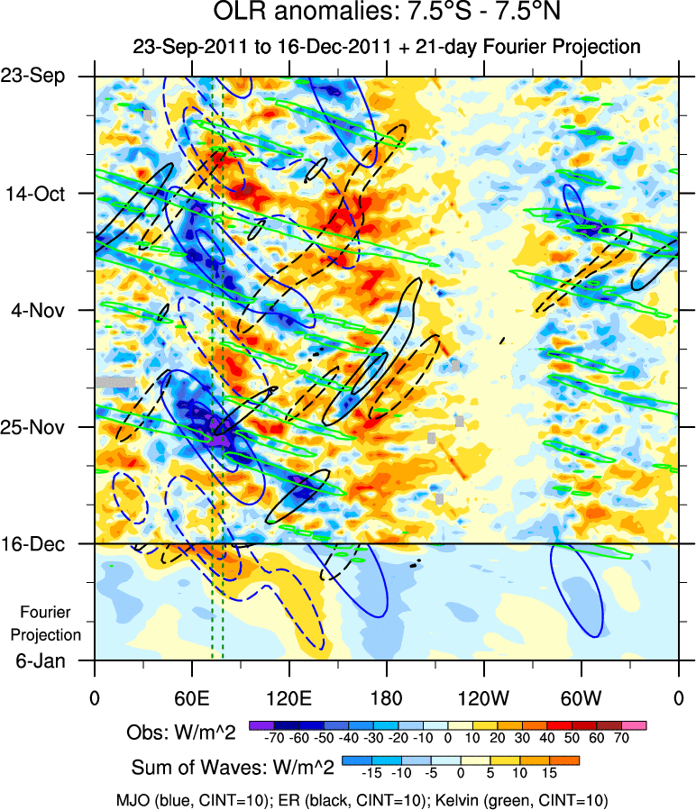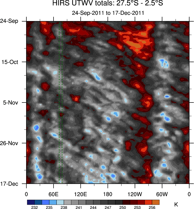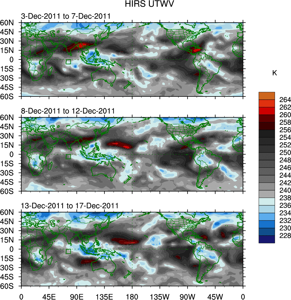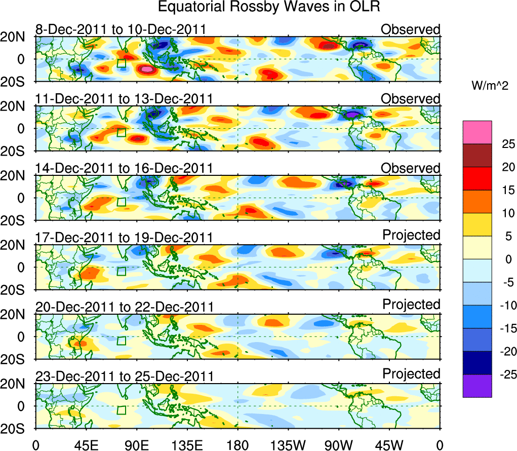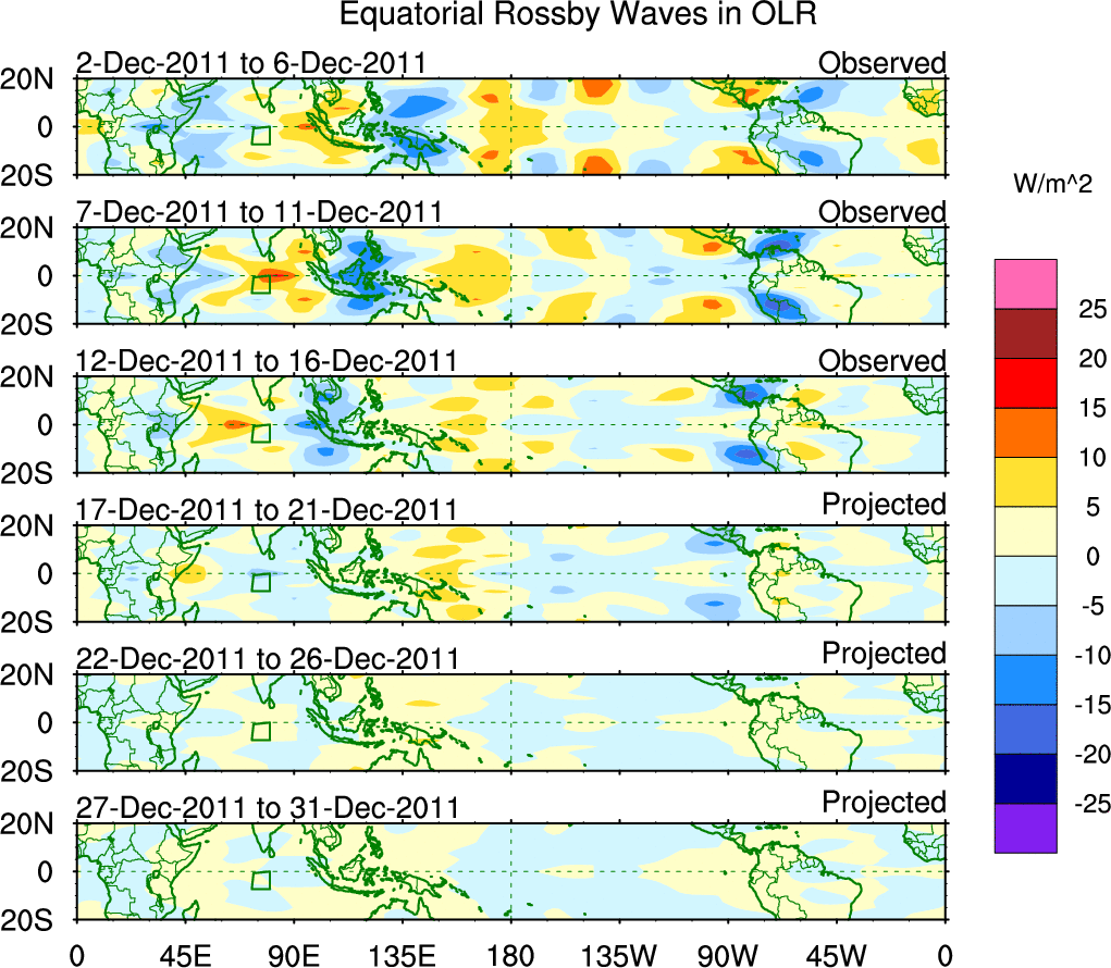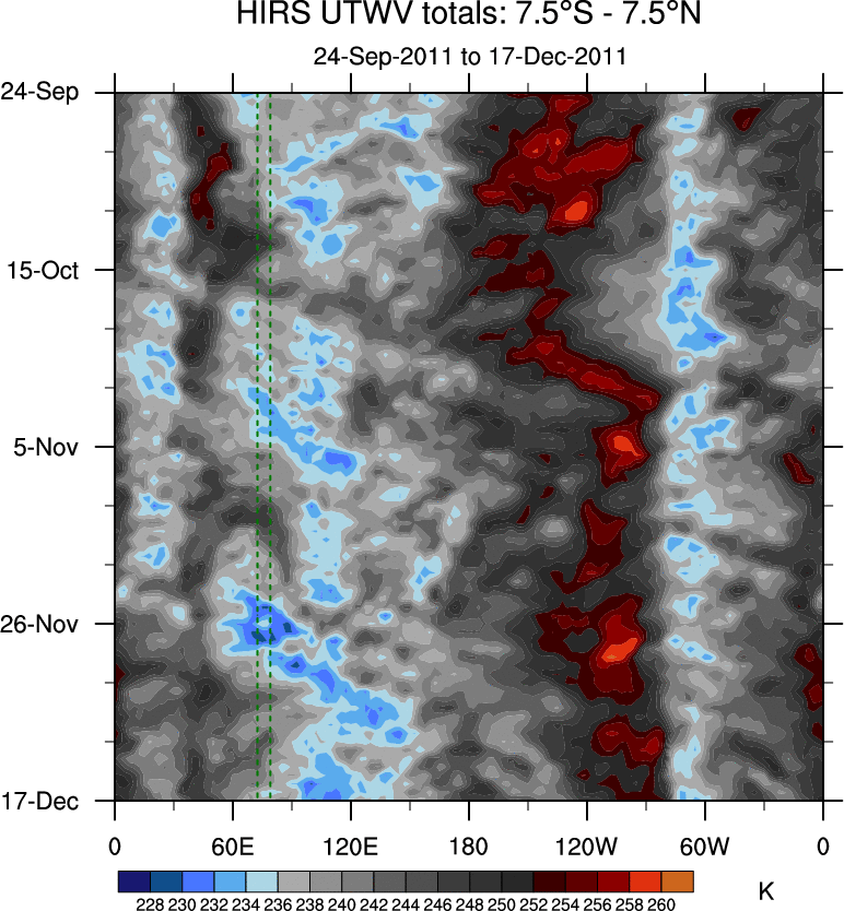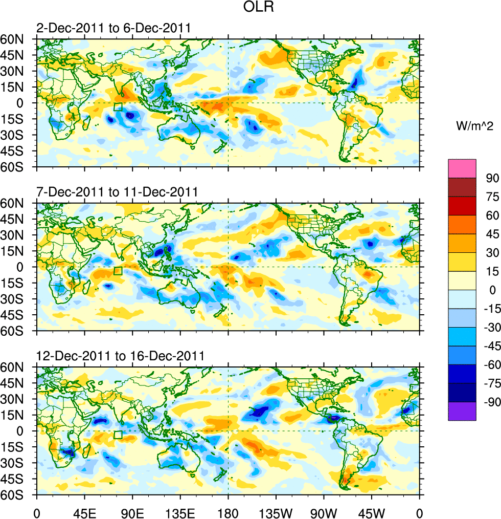 To identify tropical waves in near real-time, the OLR and UTWV data are filtered following Wheeler & Weickmann (2001 MWR). The daily anomalies are calculated using the first 3 harmonics of the seasonal cycle for 1979–2009. Missing values are then filled using linear interpolation in space and time. The most recent 365 days of anomalies are padded with 659 days of zeroes, and the result is filtered for each wave type.
