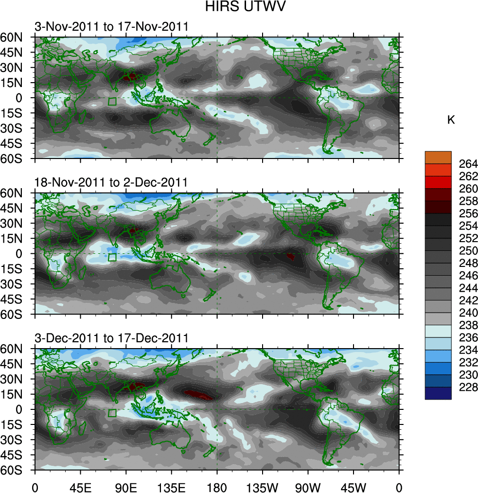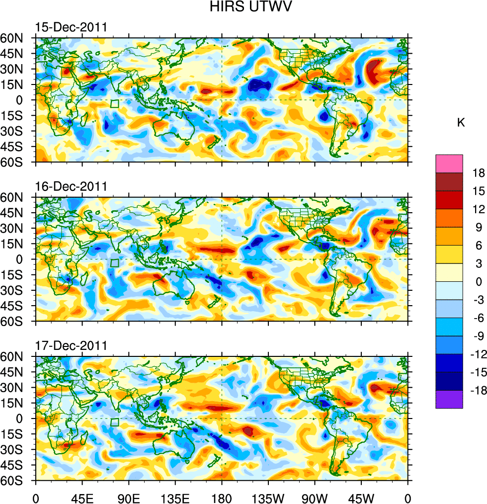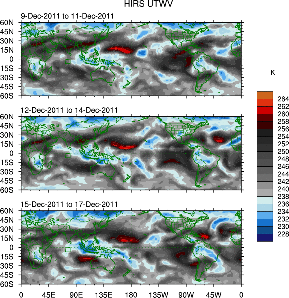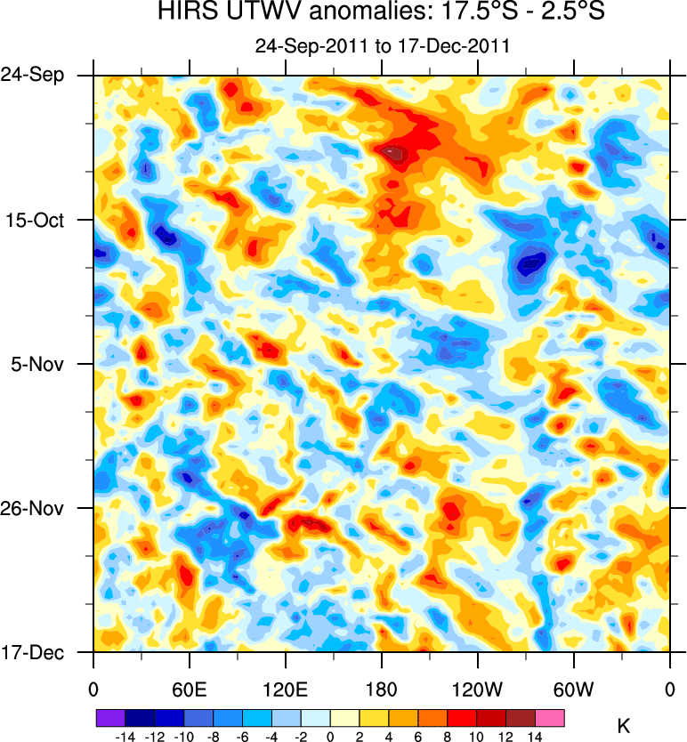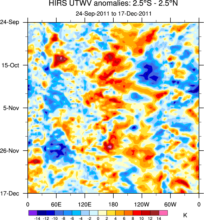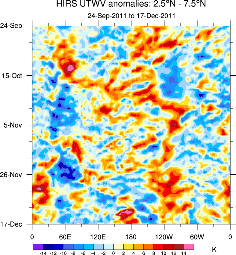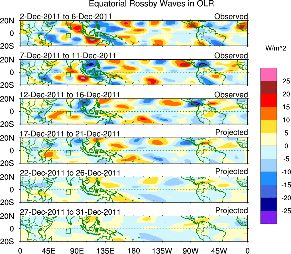 To identify tropical waves in near real-time, the OLR and UTWV data are filtered following Wheeler & Weickmann (2001 MWR). The daily anomalies are calculated using the first 3 harmonics of the seasonal cycle for 1979–2009. Missing values are then filled using linear interpolation in space and time. The most recent 365 days of anomalies are padded with 659 days of zeroes, and the result is filtered for each wave type.