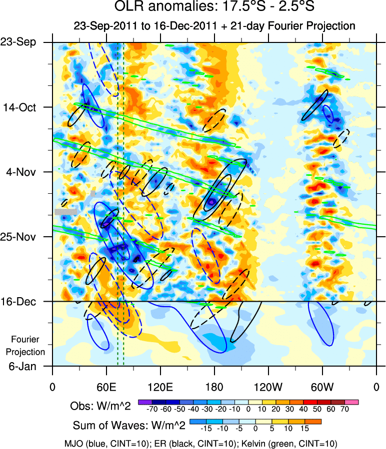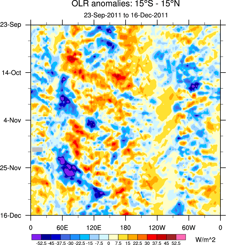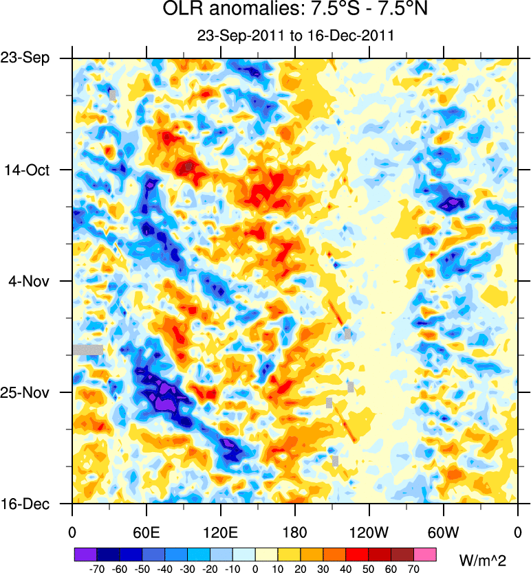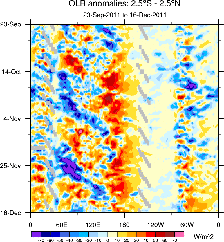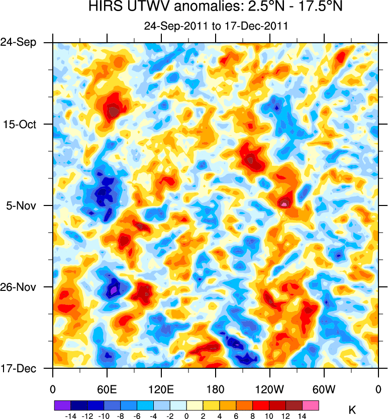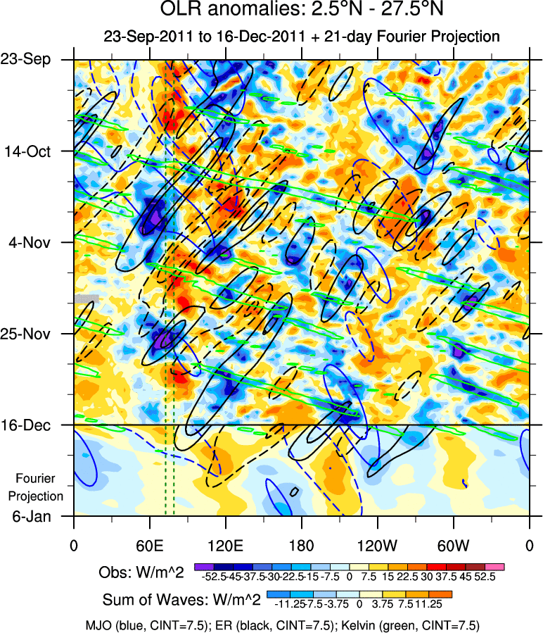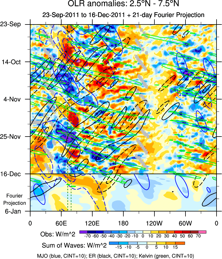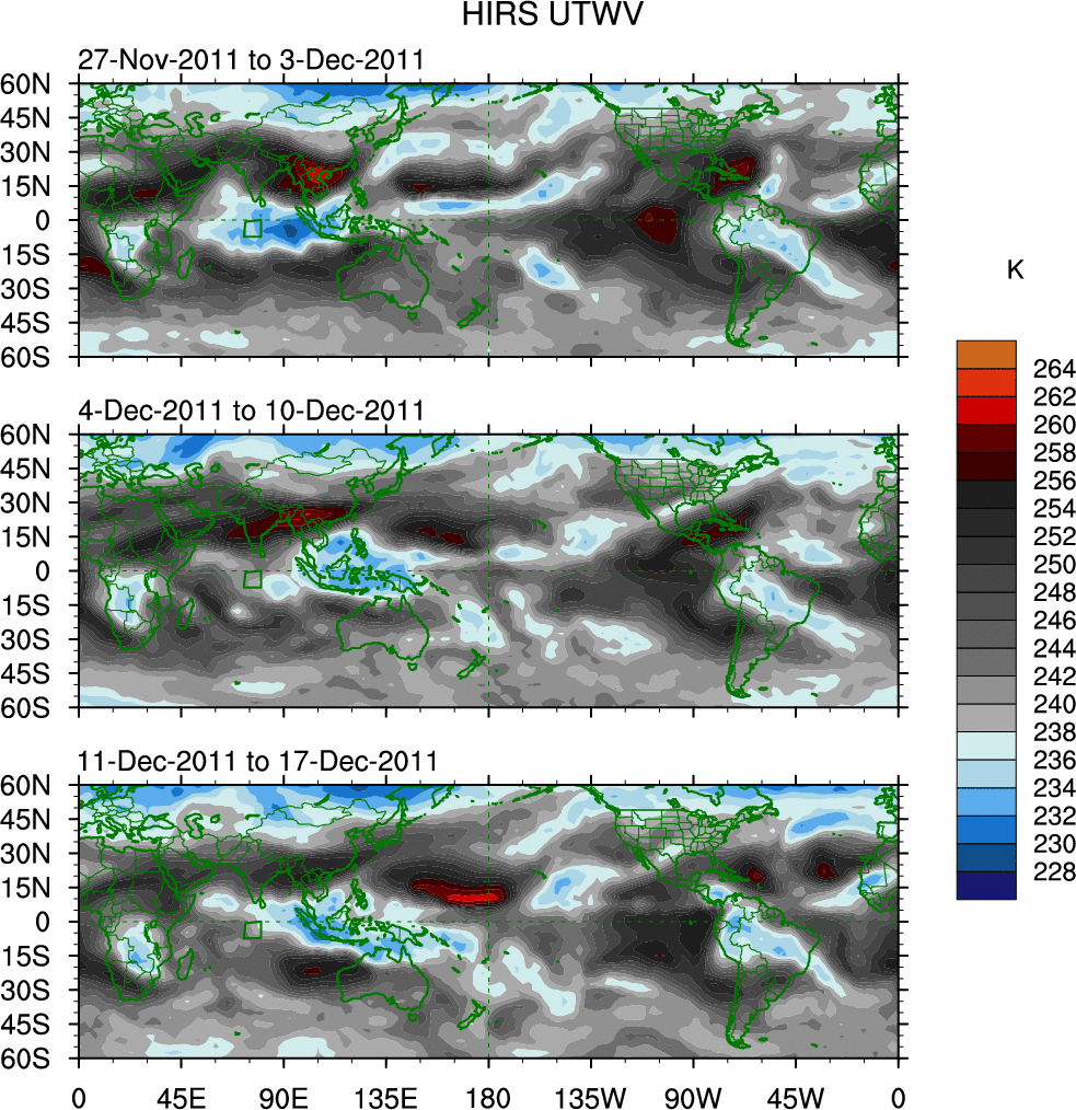 To identify tropical waves in near real-time, the OLR and UTWV data are filtered following Wheeler & Weickmann (2001 MWR). The daily anomalies are calculated using the first 3 harmonics of the seasonal cycle for 1979–2009. Missing values are then filled using linear interpolation in space and time. The most recent 365 days of anomalies are padded with 659 days of zeroes, and the result is filtered for each wave type.