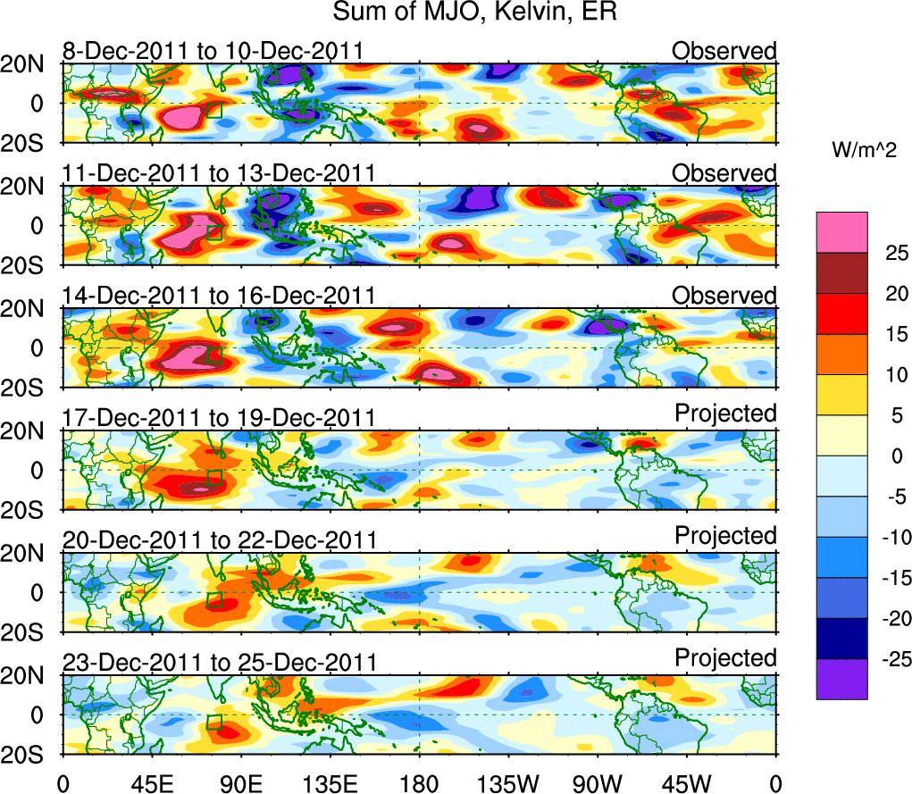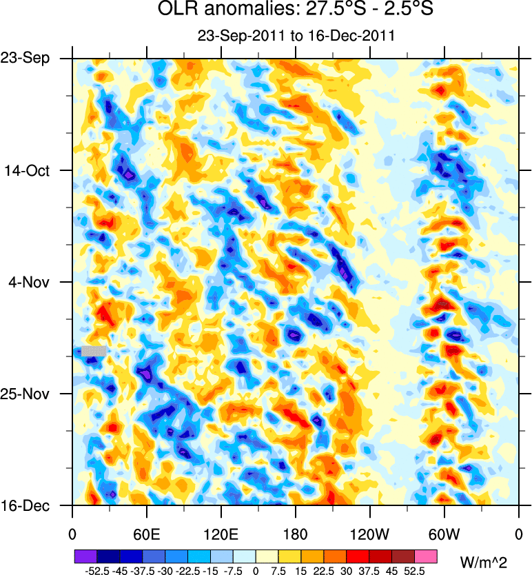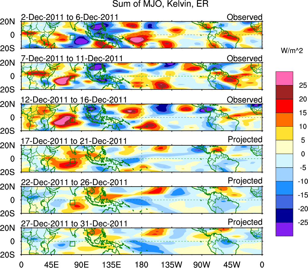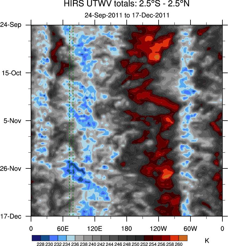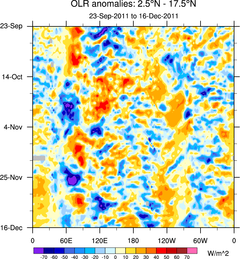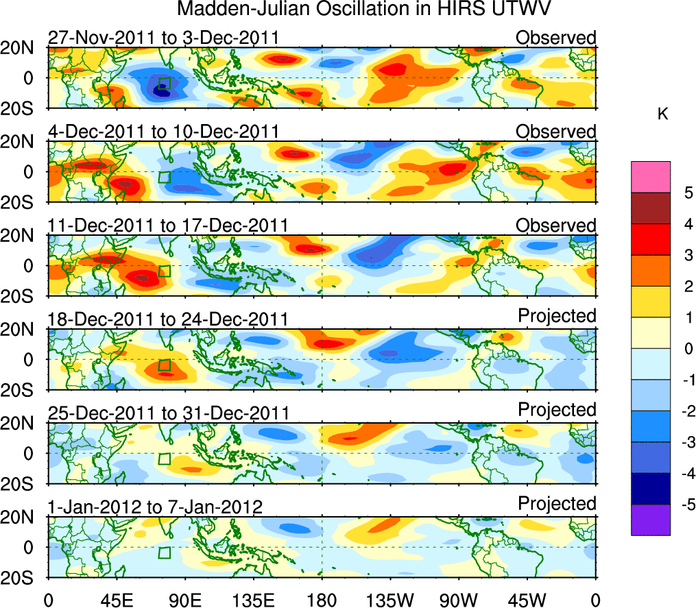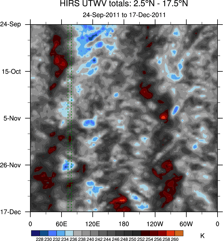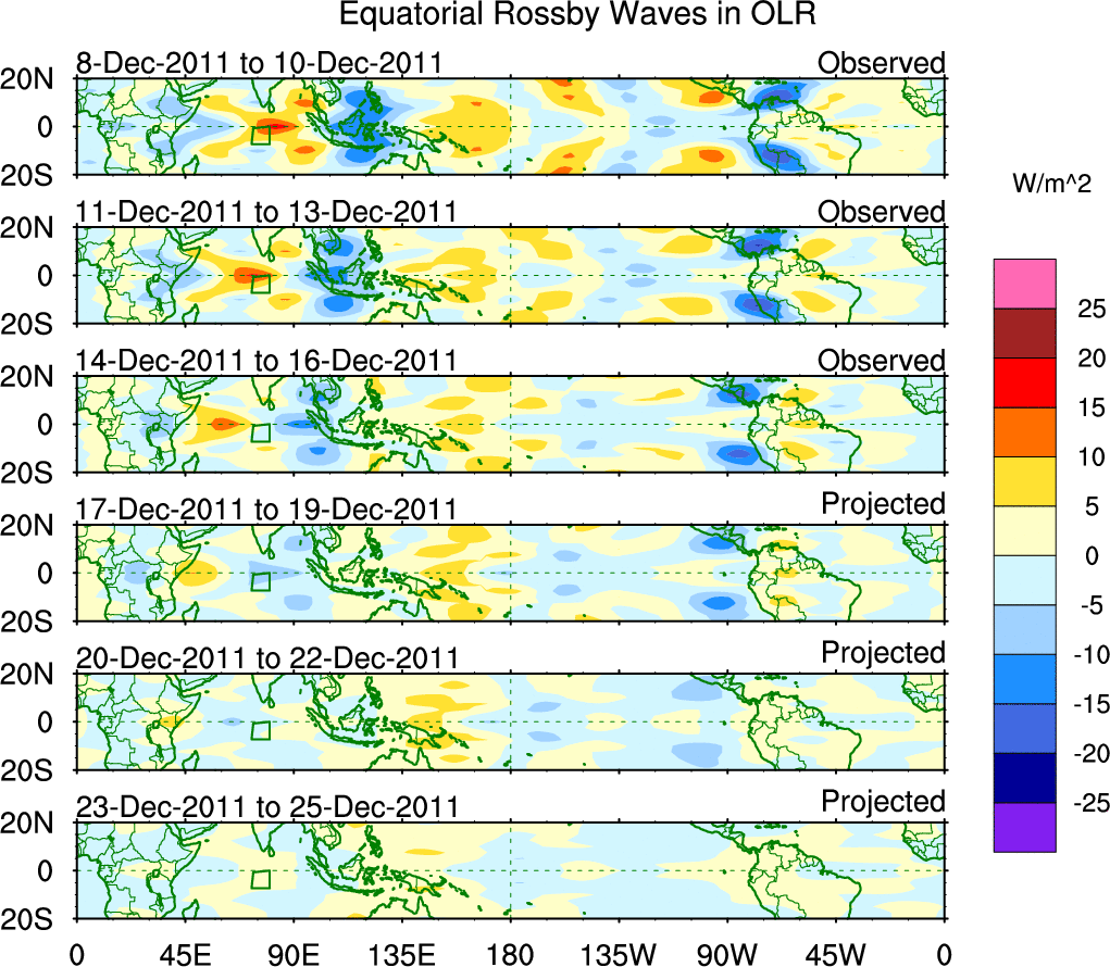 To identify tropical waves in near real-time, the OLR and UTWV data are filtered following Wheeler & Weickmann (2001 MWR). The daily anomalies are calculated using the first 3 harmonics of the seasonal cycle for 1979–2009. Missing values are then filled using linear interpolation in space and time. The most recent 365 days of anomalies are padded with 659 days of zeroes, and the result is filtered for each wave type.