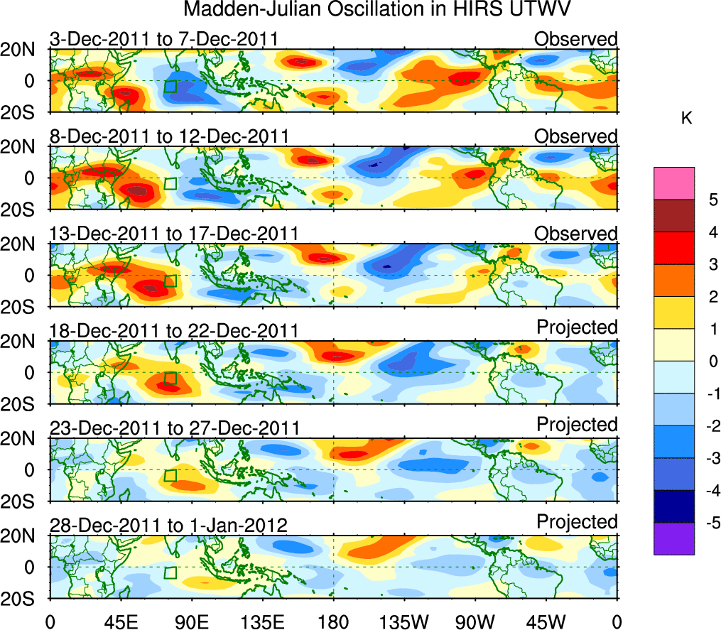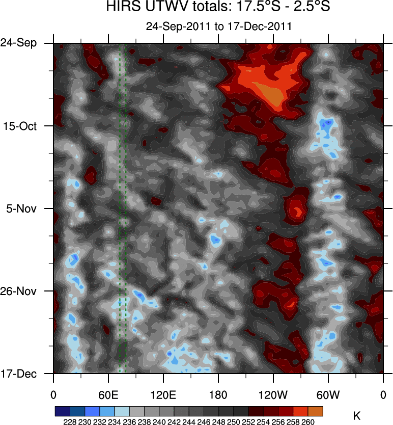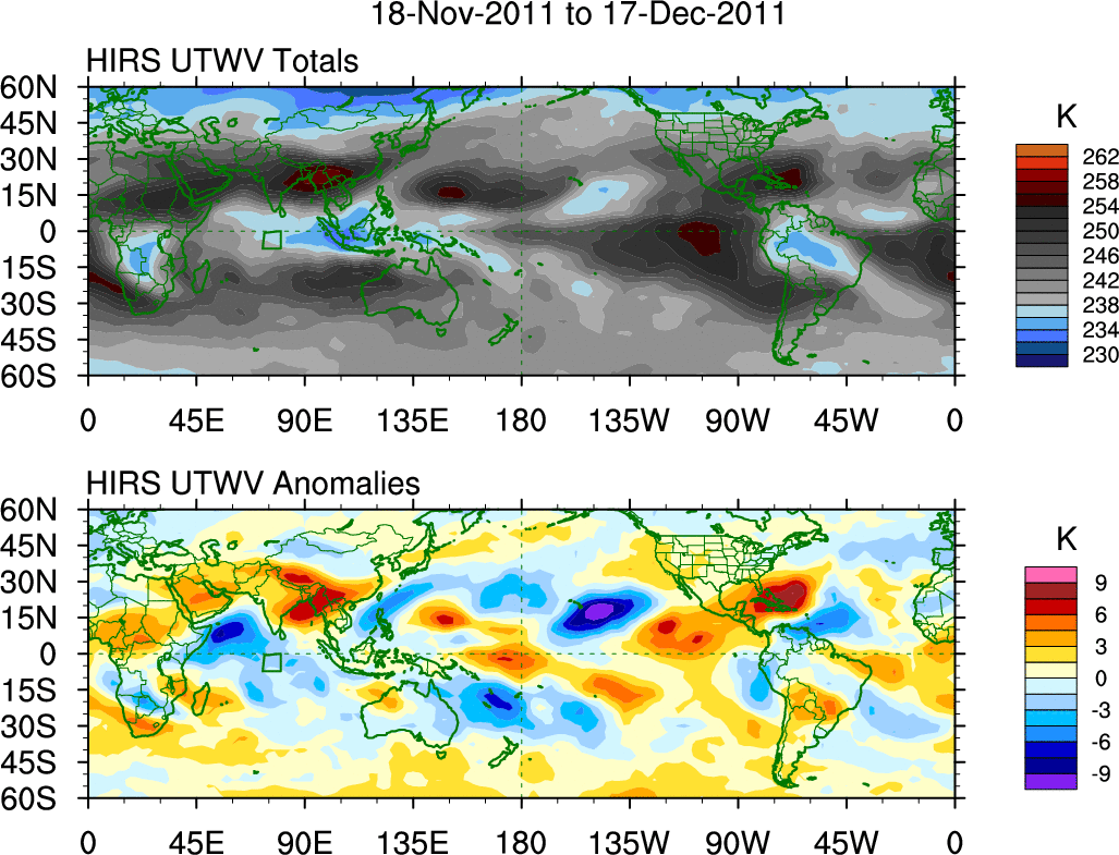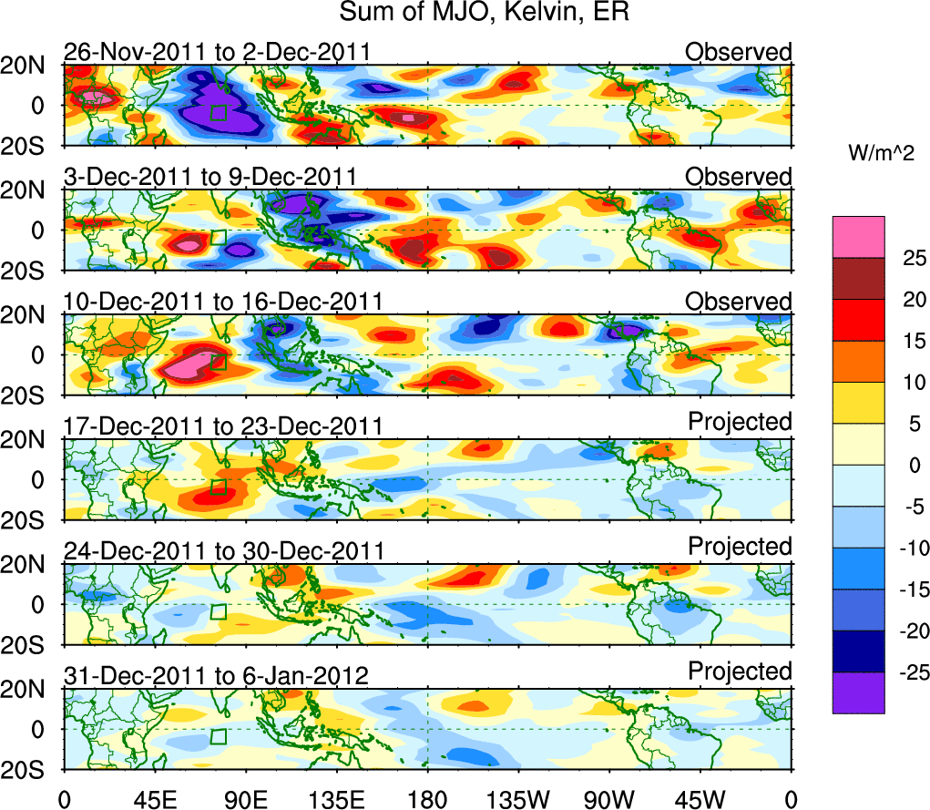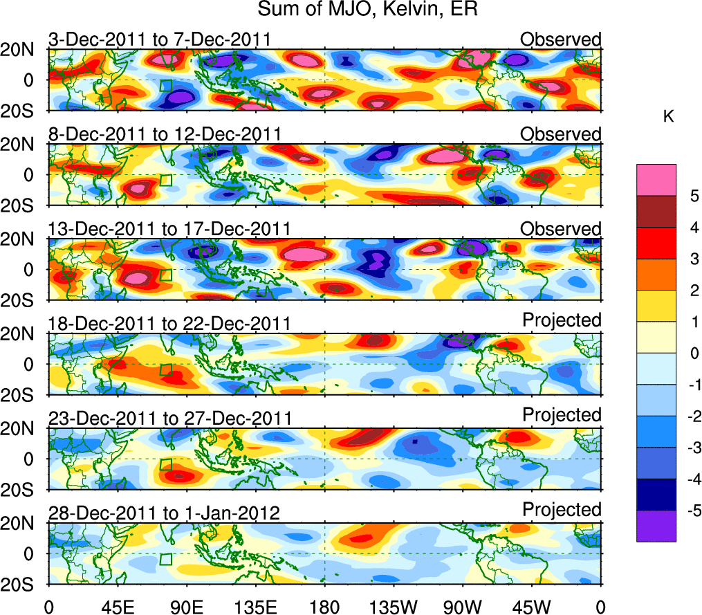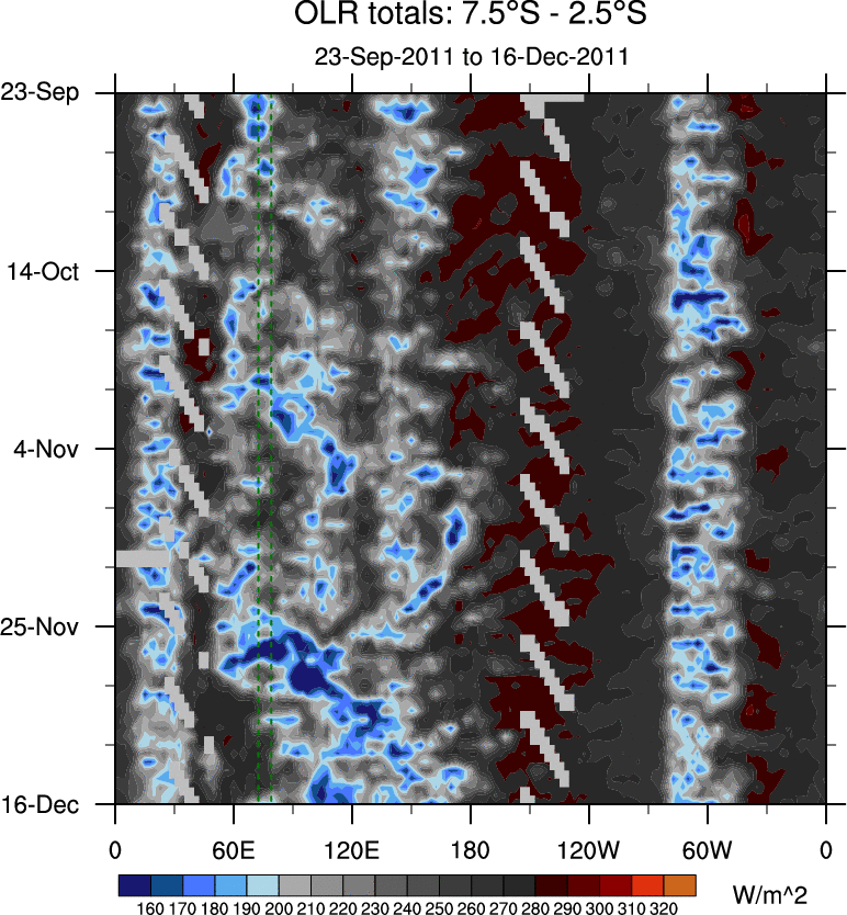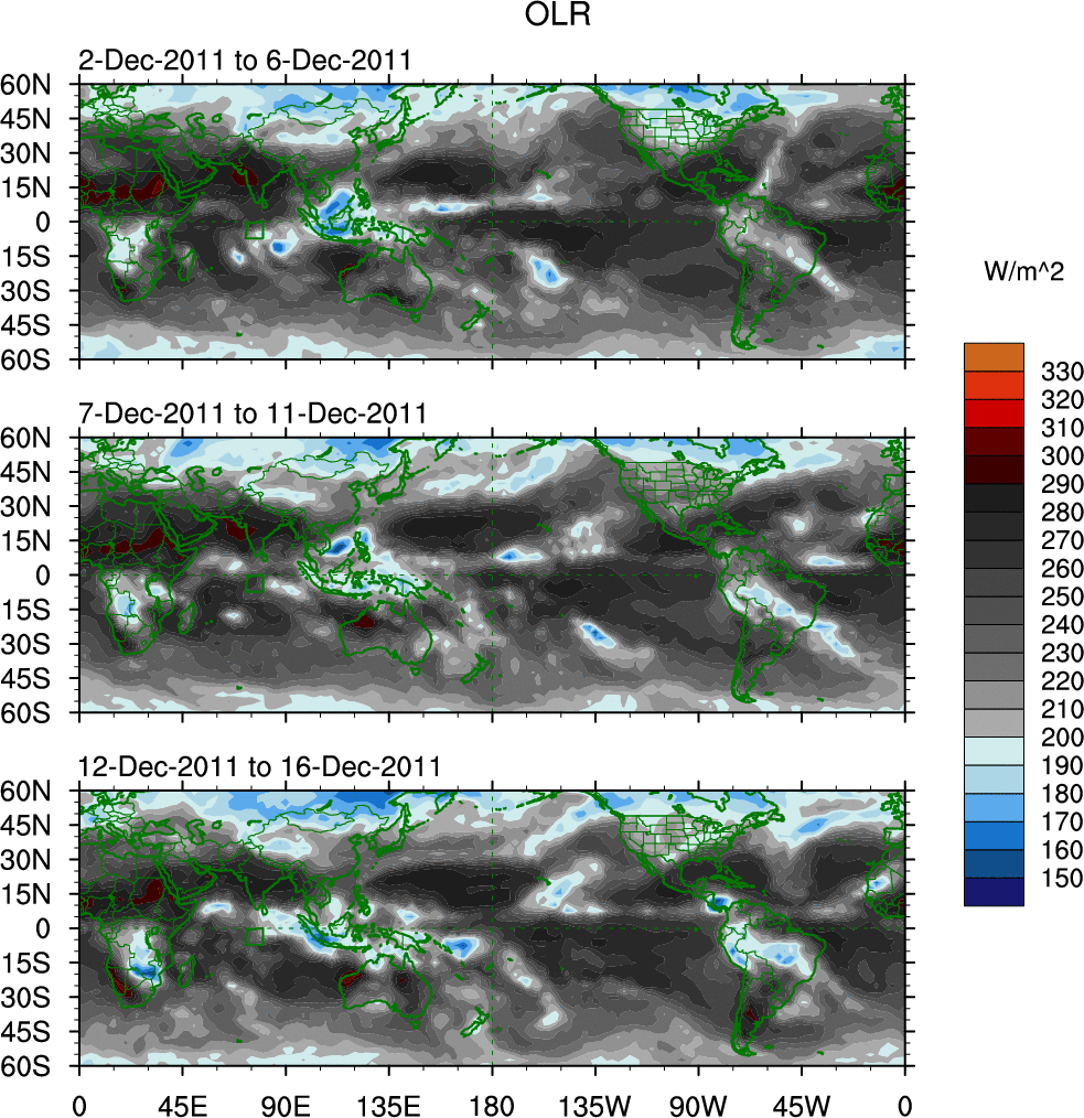 To identify tropical waves in near real-time, the OLR and UTWV data are filtered following Wheeler & Weickmann (2001 MWR). The daily anomalies are calculated using the first 3 harmonics of the seasonal cycle for 1979–2009. Missing values are then filled using linear interpolation in space and time. The most recent 365 days of anomalies are padded with 659 days of zeroes, and the result is filtered for each wave type.