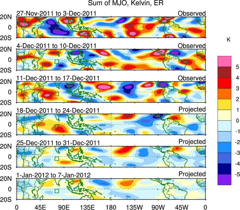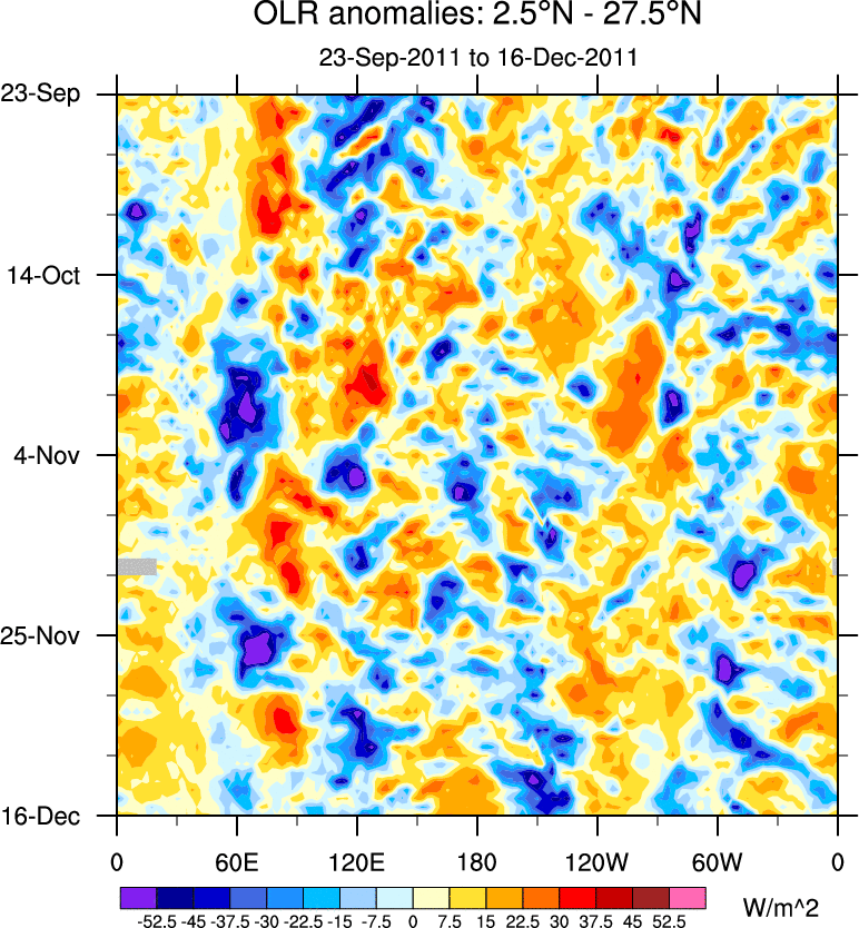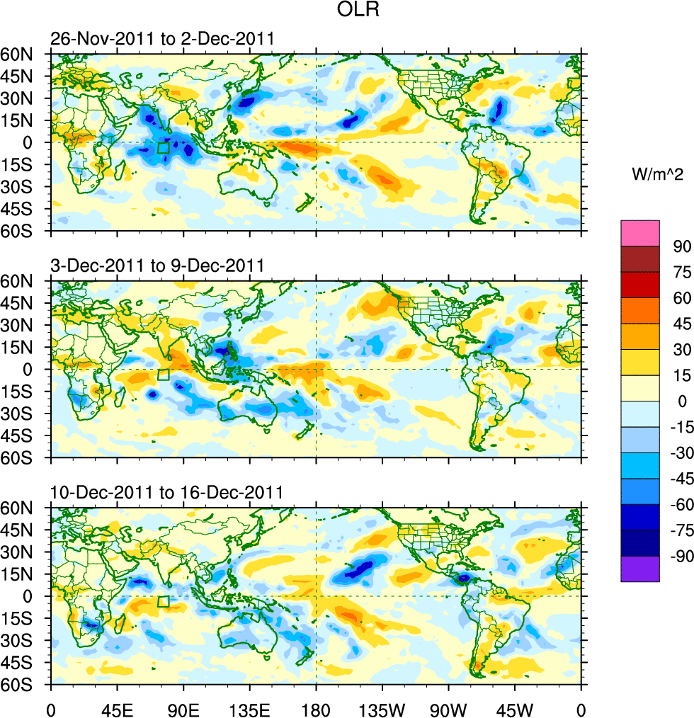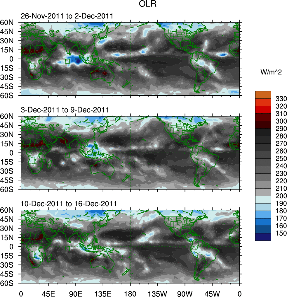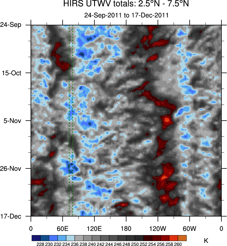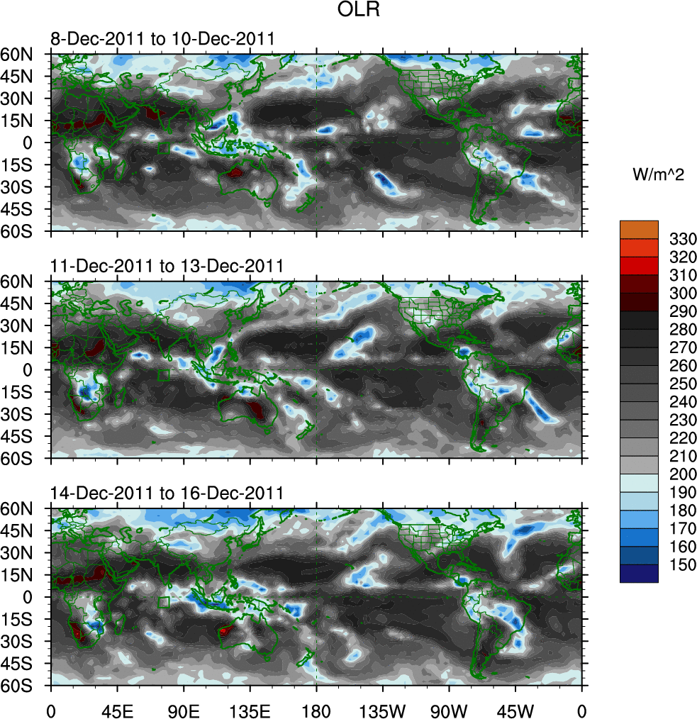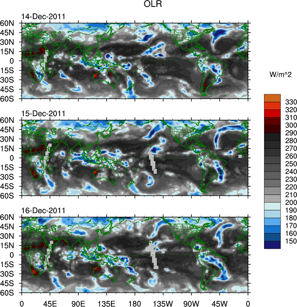 To identify tropical waves in near real-time, the OLR and UTWV data are filtered following Wheeler & Weickmann (2001 MWR). The daily anomalies are calculated using the first 3 harmonics of the seasonal cycle for 1979–2009. Missing values are then filled using linear interpolation in space and time. The most recent 365 days of anomalies are padded with 659 days of zeroes, and the result is filtered for each wave type.