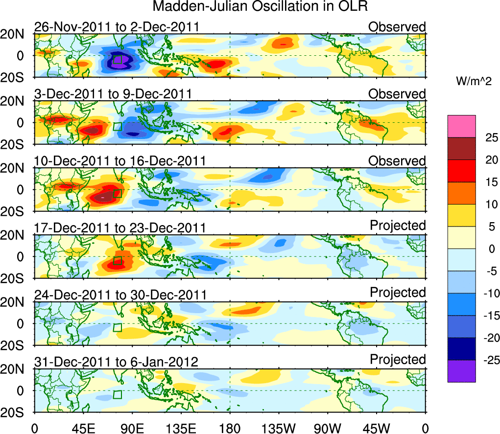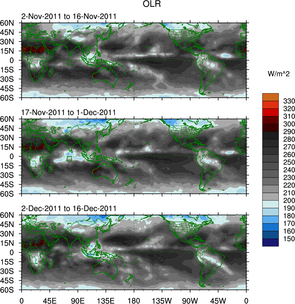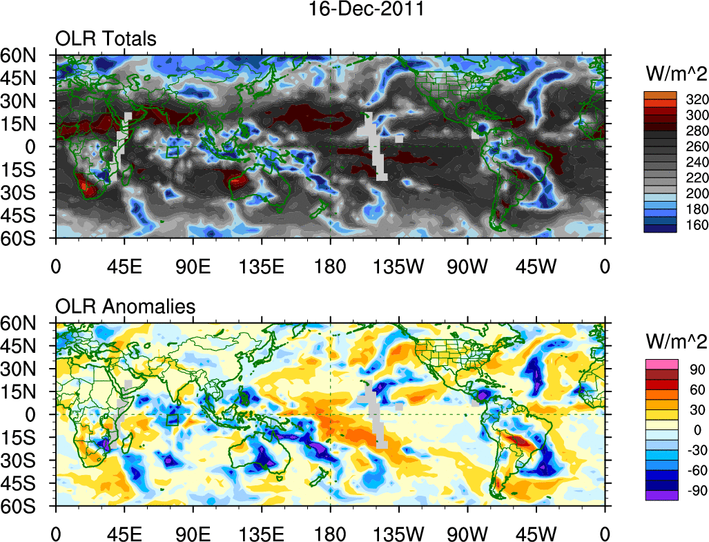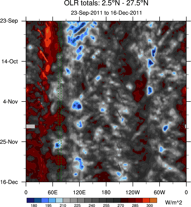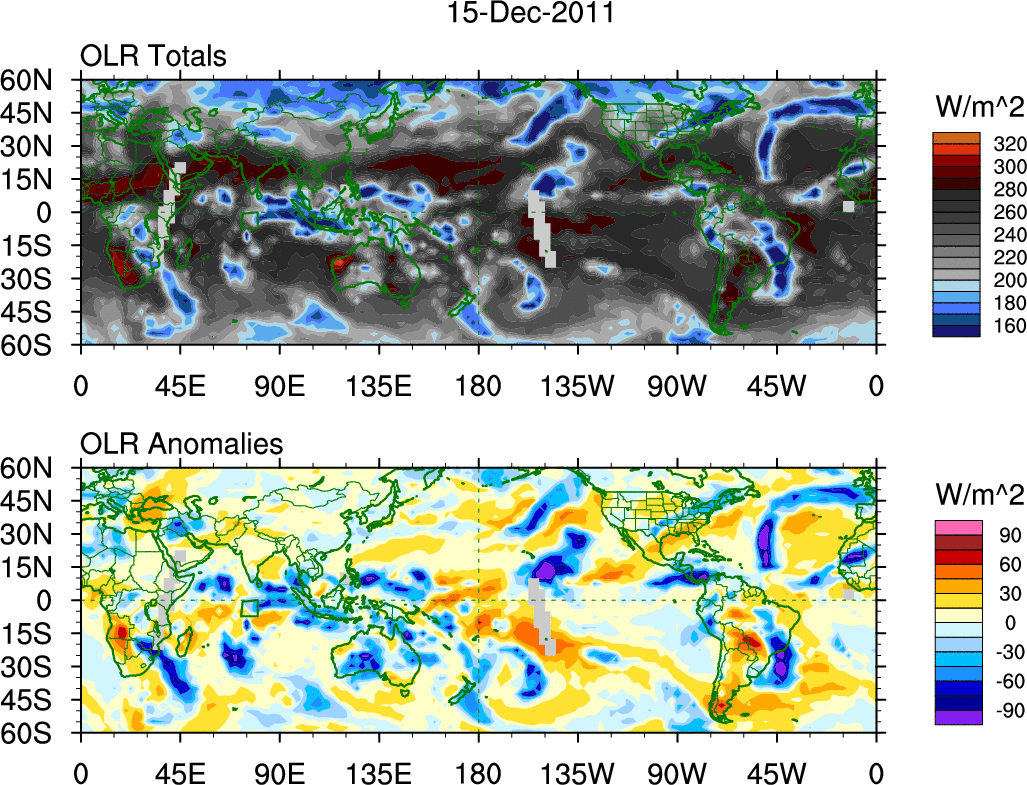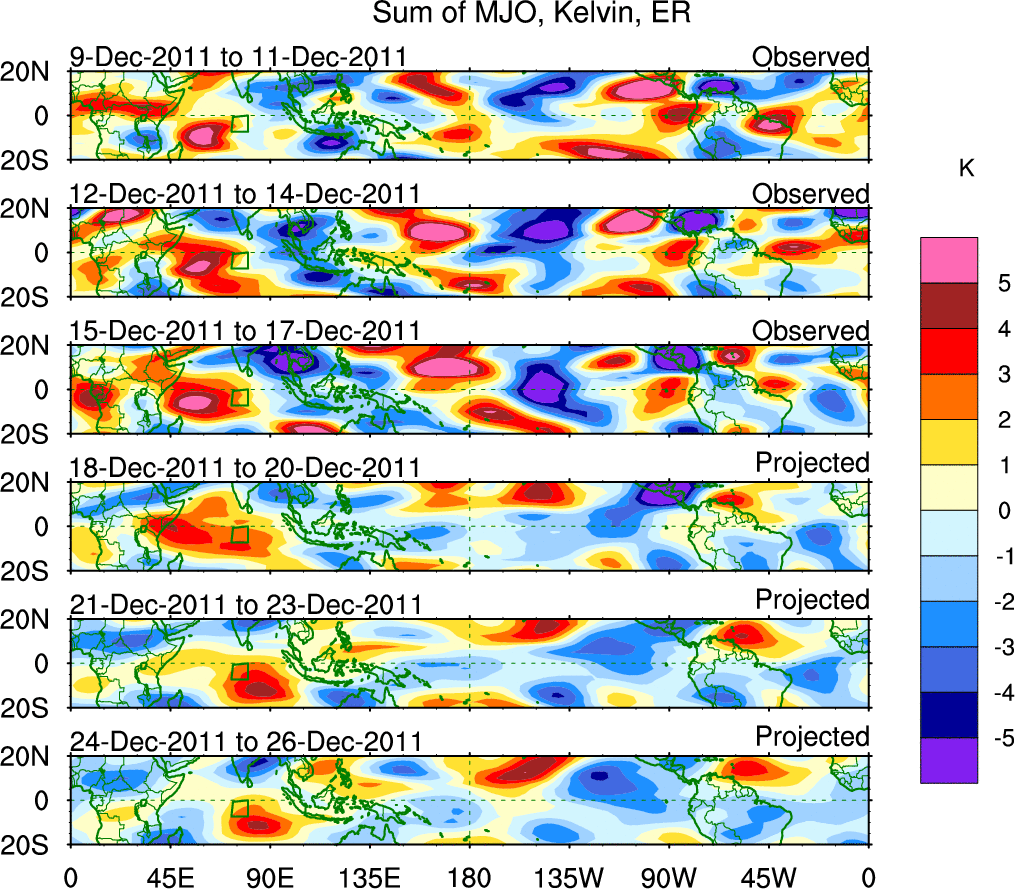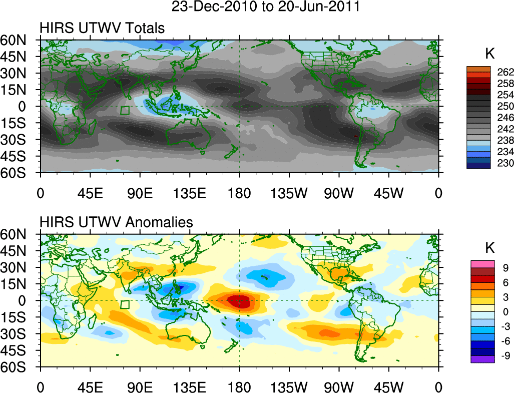 To identify tropical waves in near real-time, the OLR and UTWV data are filtered following Wheeler & Weickmann (2001 MWR). The daily anomalies are calculated using the first 3 harmonics of the seasonal cycle for 1979–2009. Missing values are then filled using linear interpolation in space and time. The most recent 365 days of anomalies are padded with 659 days of zeroes, and the result is filtered for each wave type.