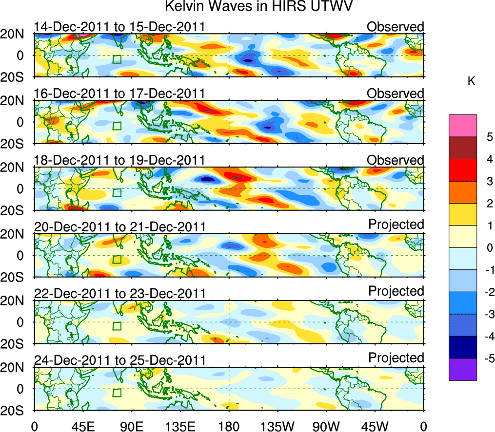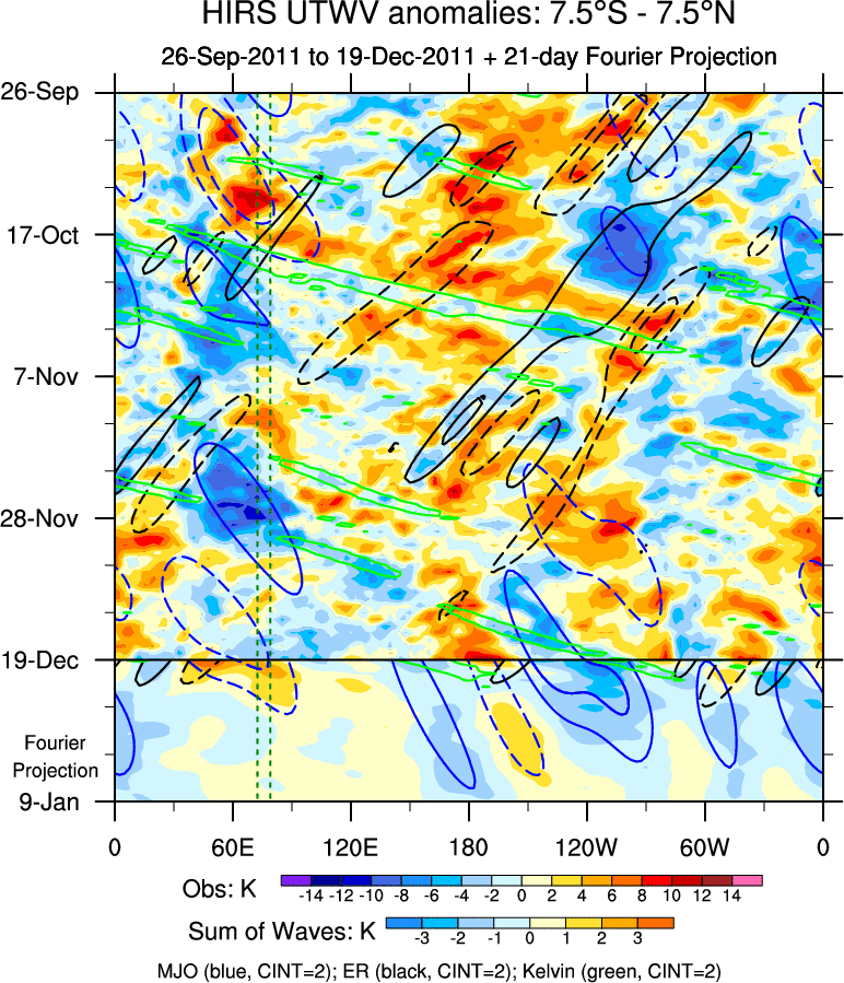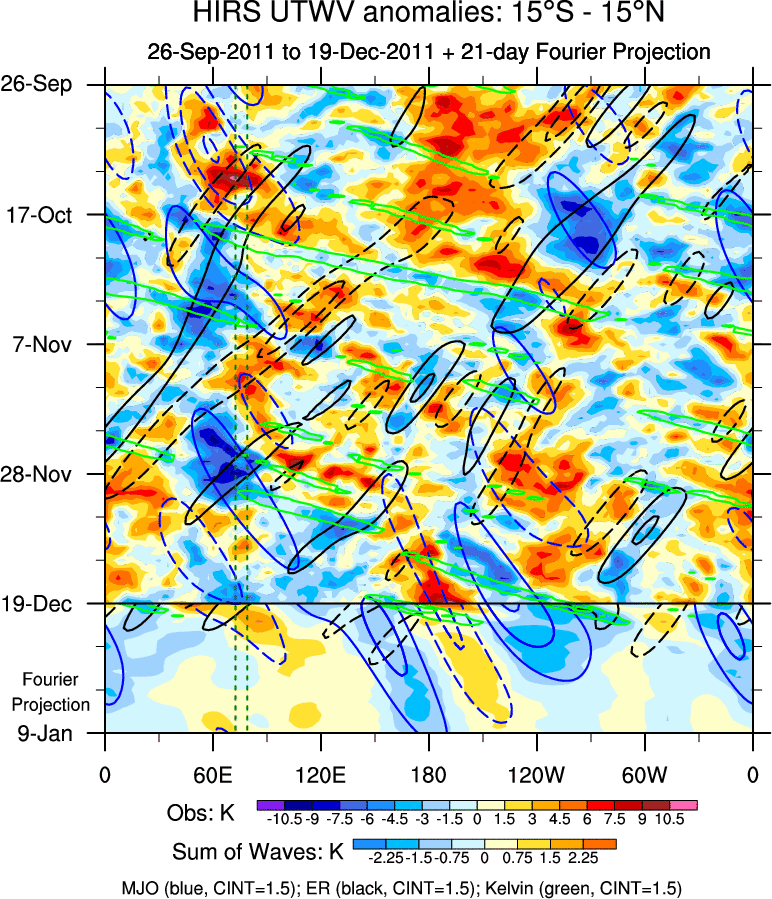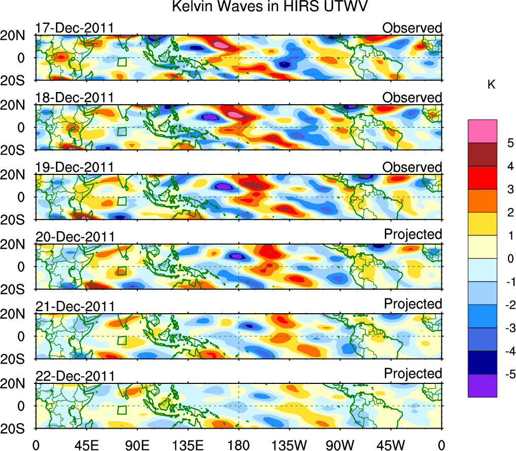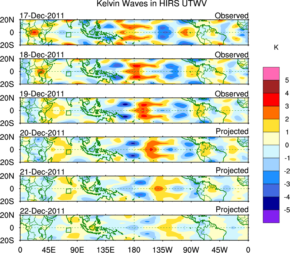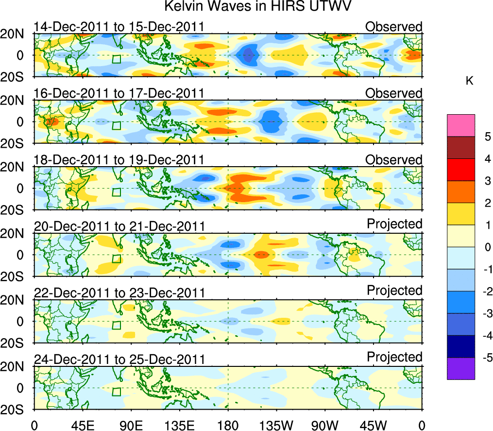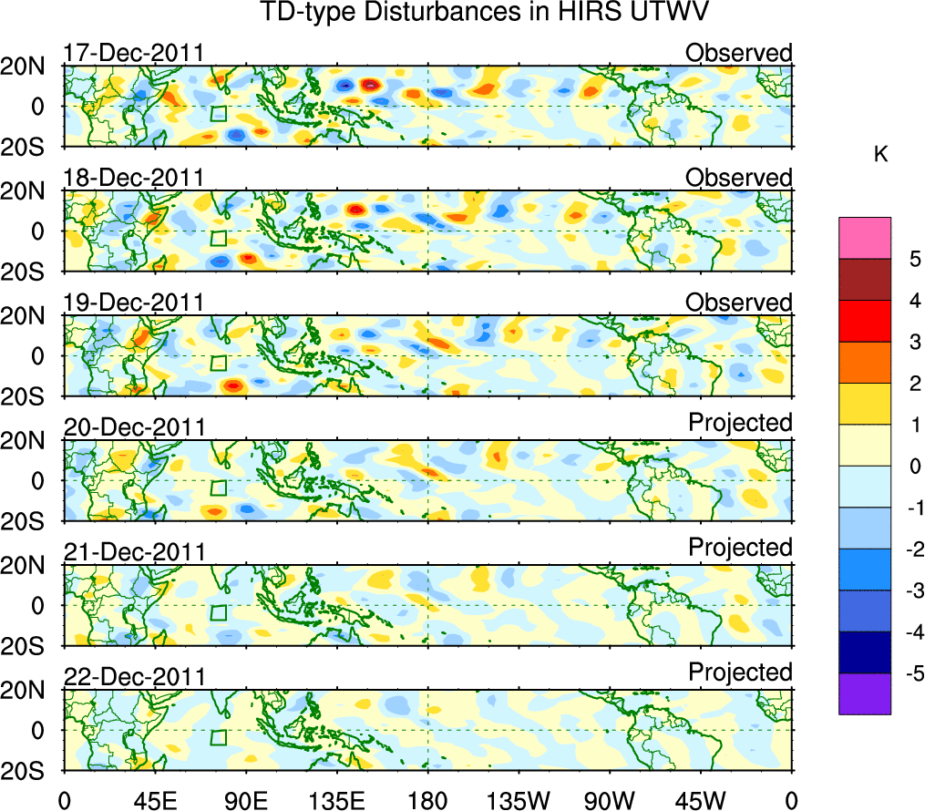 To identify tropical waves in near real-time, the OLR and UTWV data are filtered following Wheeler & Weickmann (2001 MWR). The daily anomalies are calculated using the first 3 harmonics of the seasonal cycle for 1979–2009. Missing values are then filled using linear interpolation in space and time. The most recent 365 days of anomalies are padded with 659 days of zeroes, and the result is filtered for each wave type.