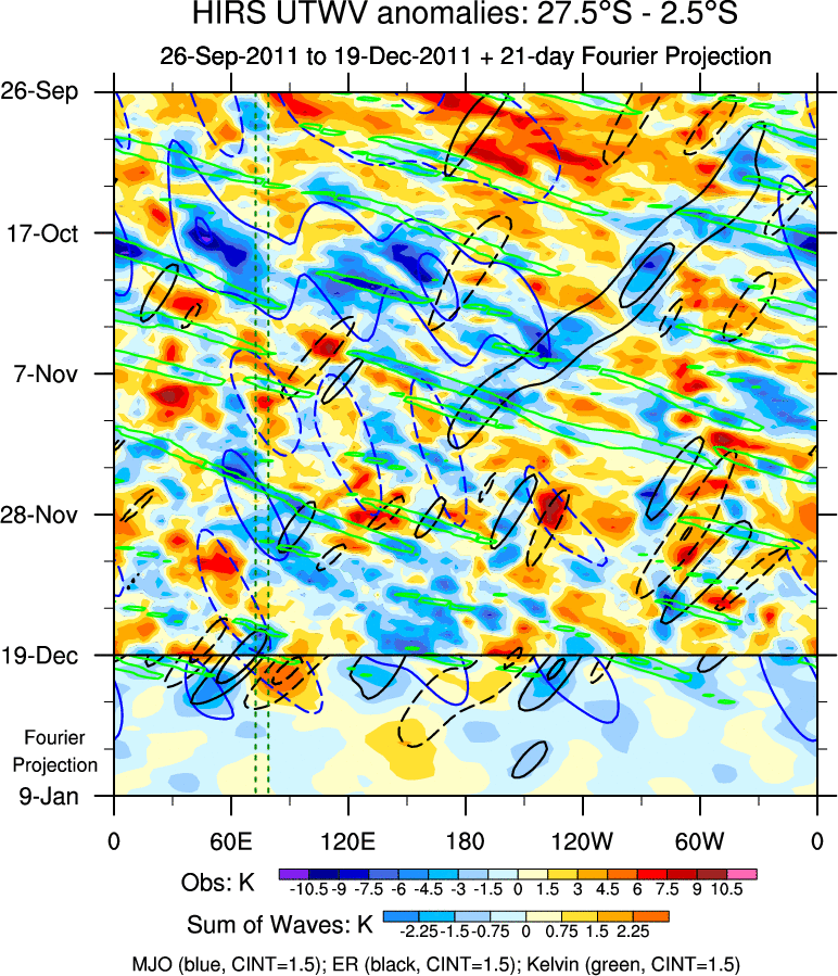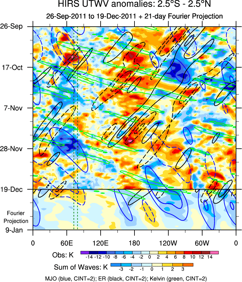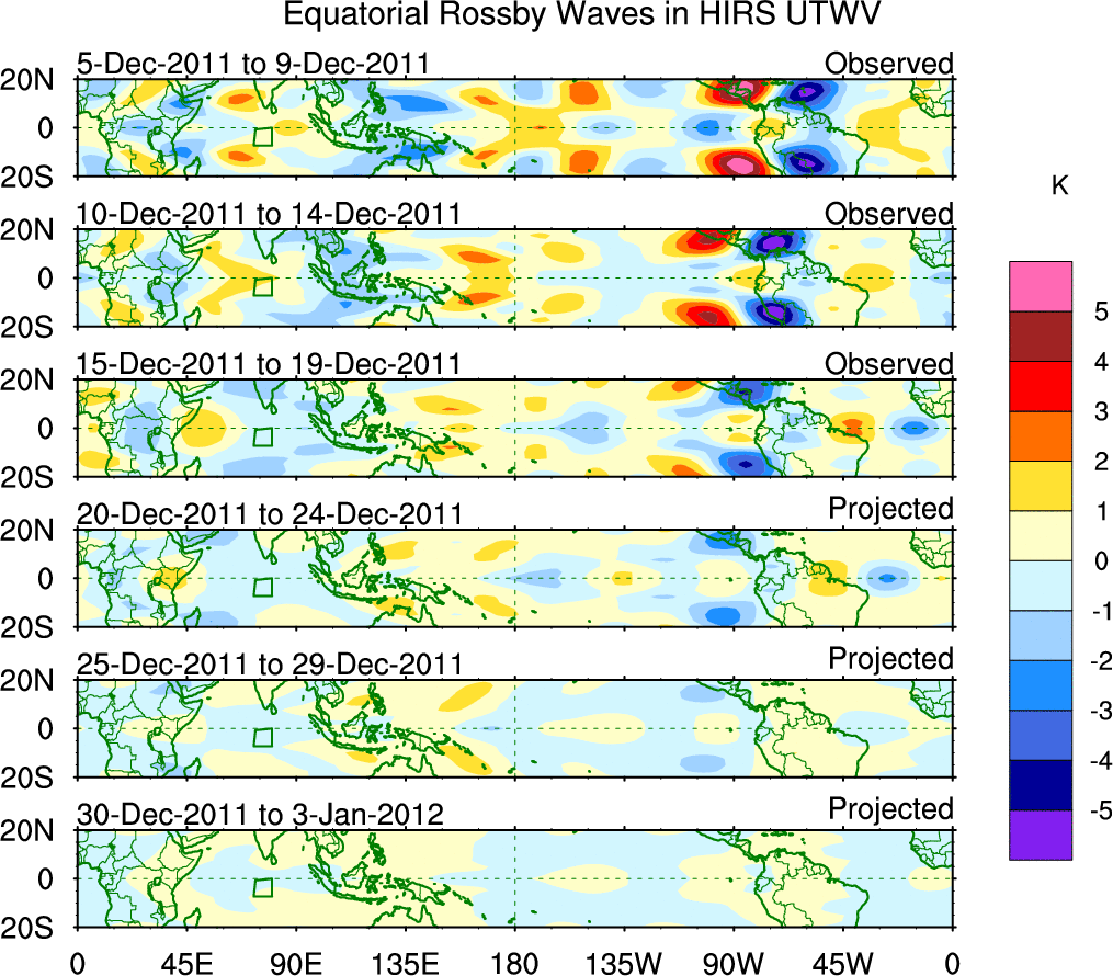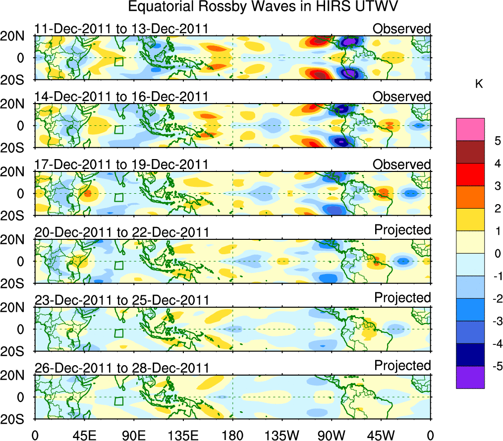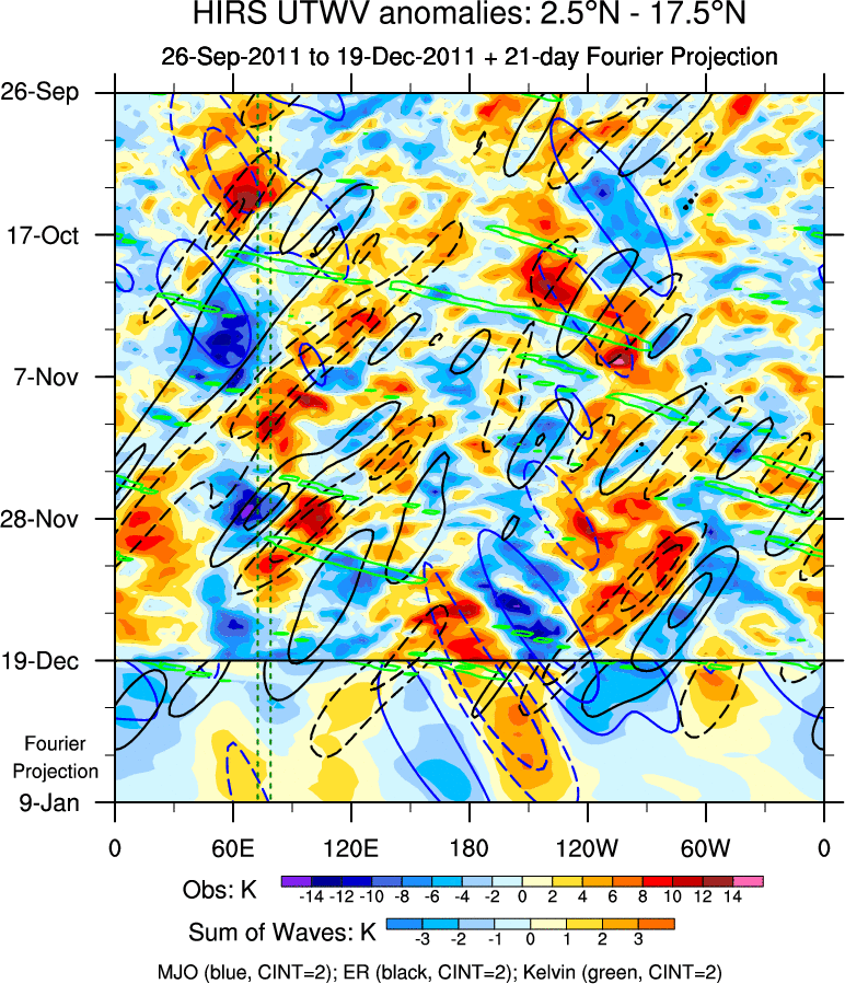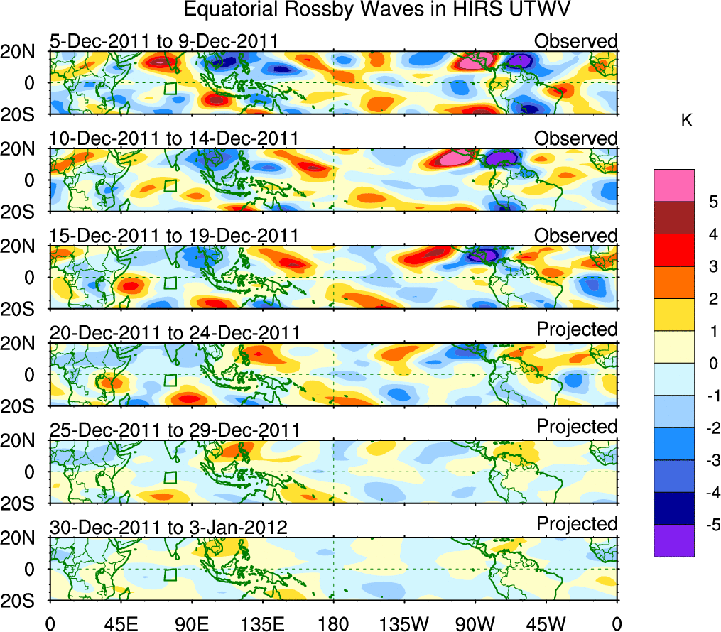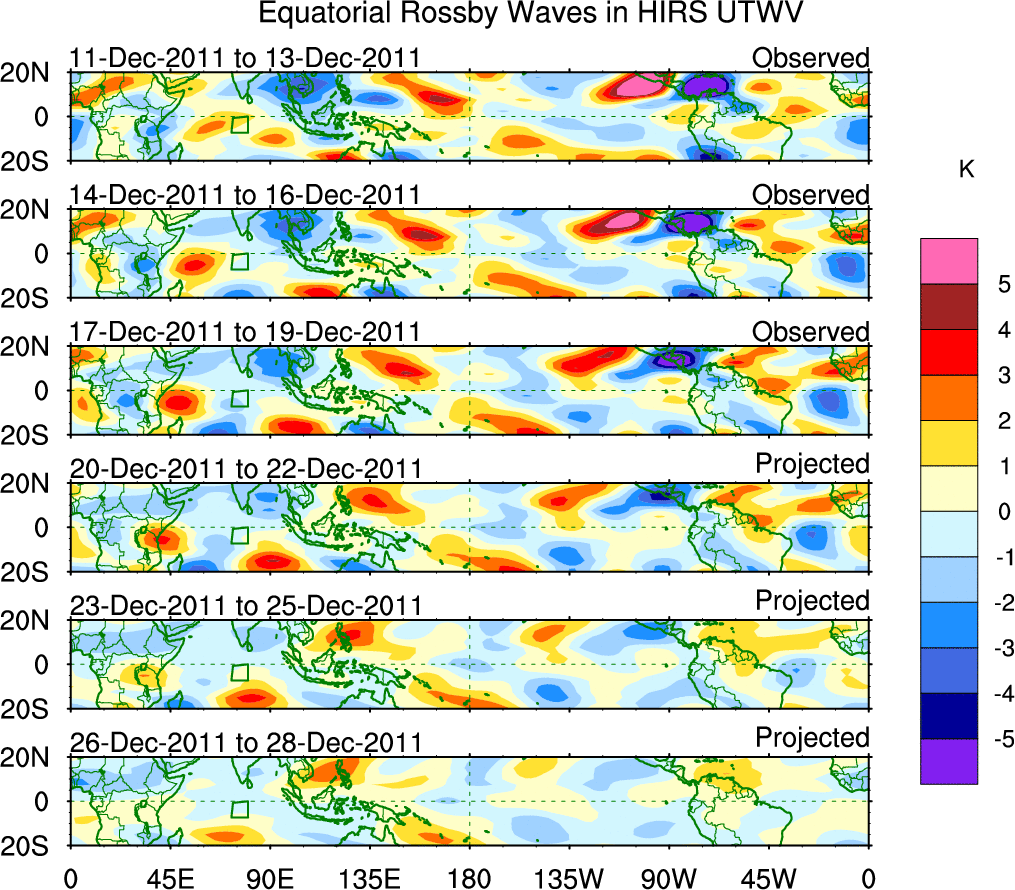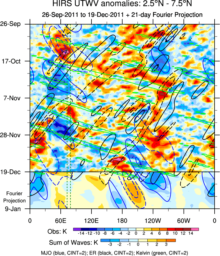 To identify tropical waves in near real-time, the OLR and UTWV data are filtered following Wheeler & Weickmann (2001 MWR). The daily anomalies are calculated using the first 3 harmonics of the seasonal cycle for 1979–2009. Missing values are then filled using linear interpolation in space and time. The most recent 365 days of anomalies are padded with 659 days of zeroes, and the result is filtered for each wave type.
