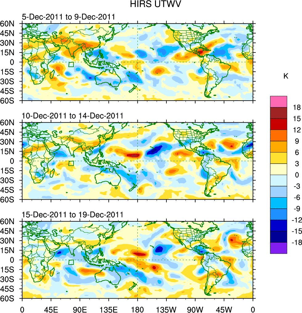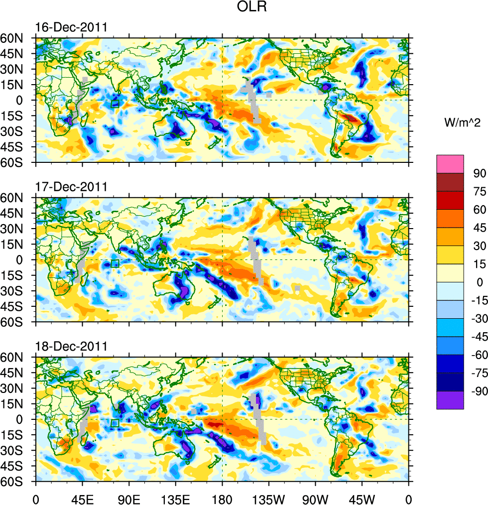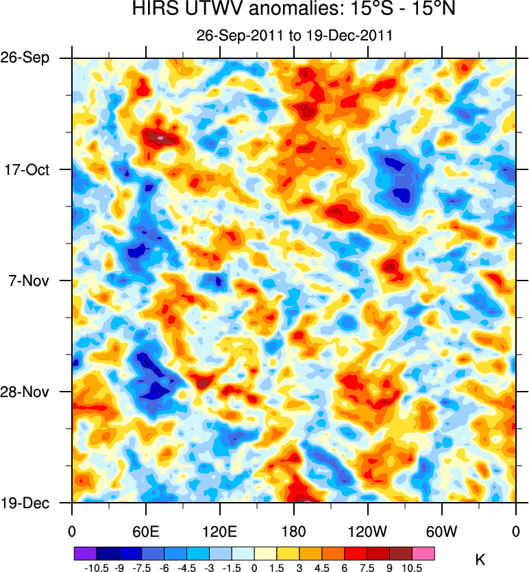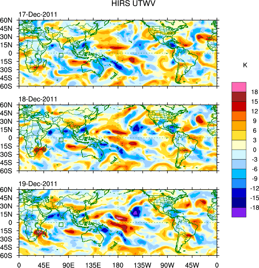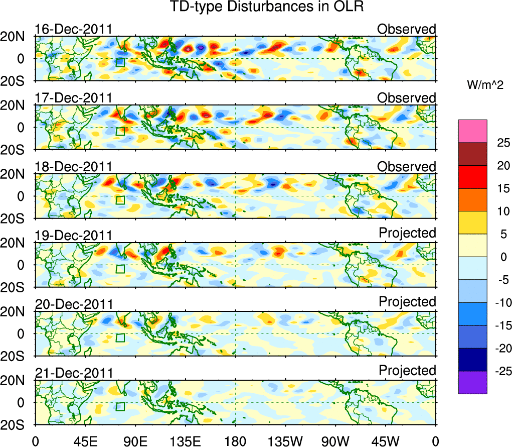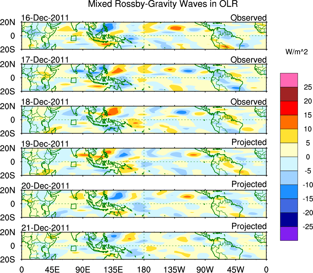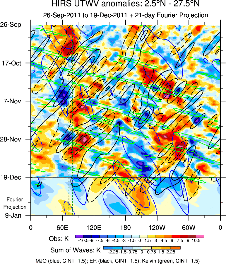 To identify tropical waves in near real-time, the OLR and UTWV data are filtered following Wheeler & Weickmann (2001 MWR). The daily anomalies are calculated using the first 3 harmonics of the seasonal cycle for 1979–2009. Missing values are then filled using linear interpolation in space and time. The most recent 365 days of anomalies are padded with 659 days of zeroes, and the result is filtered for each wave type.
