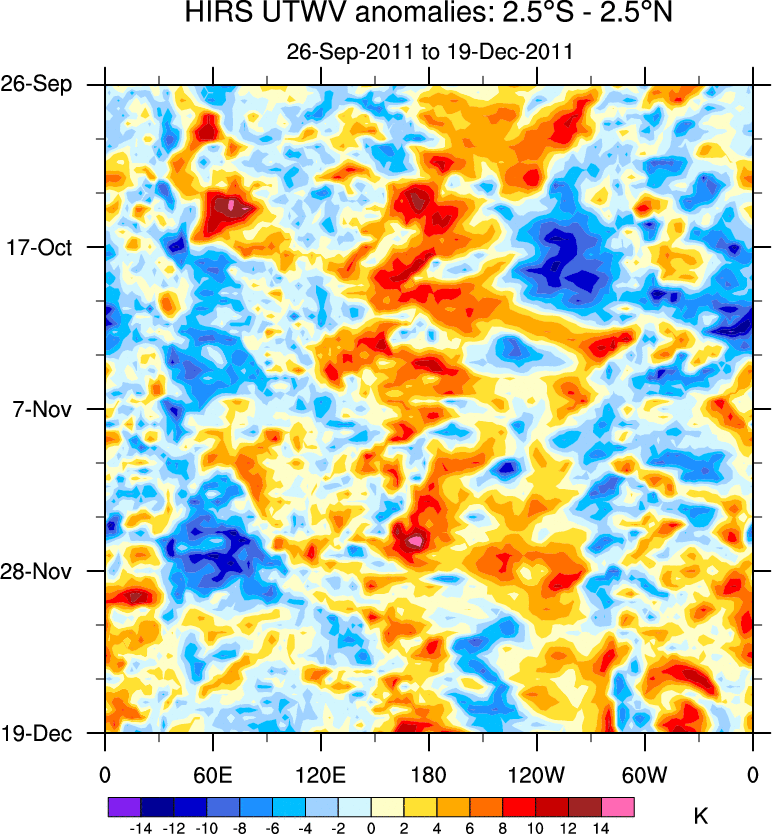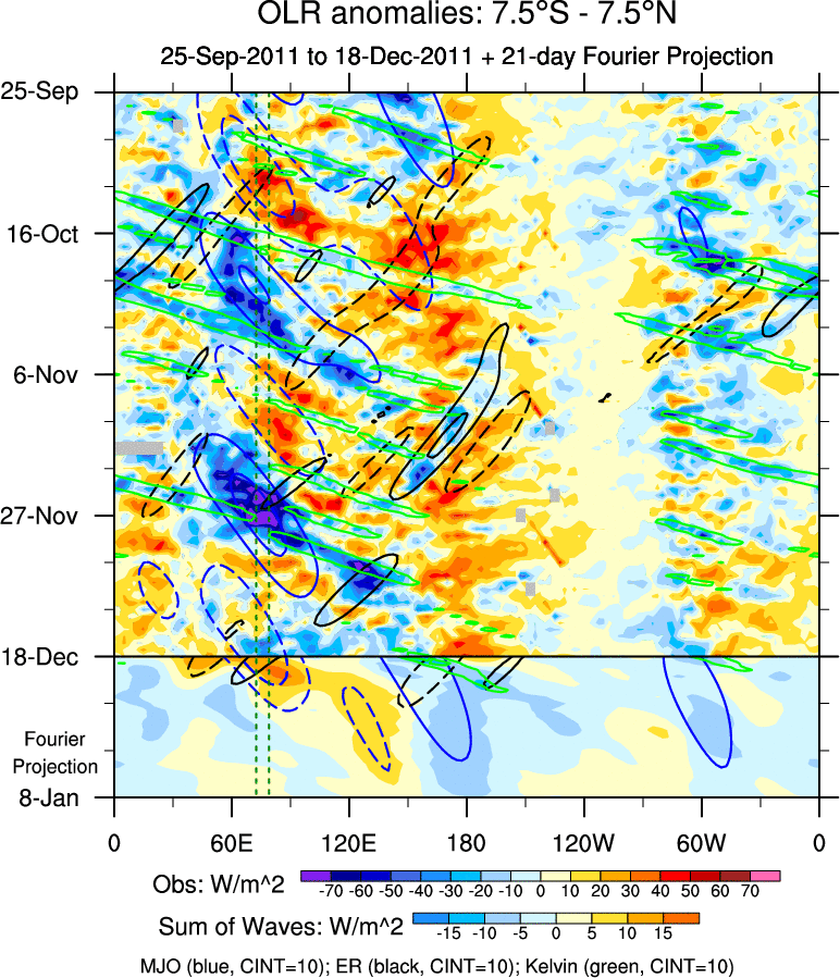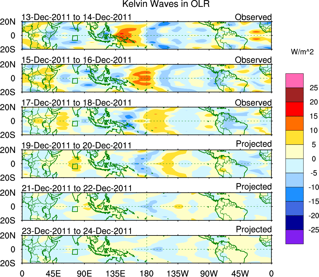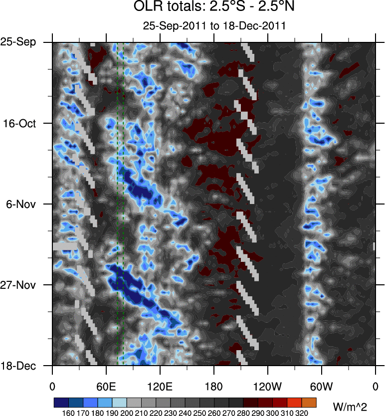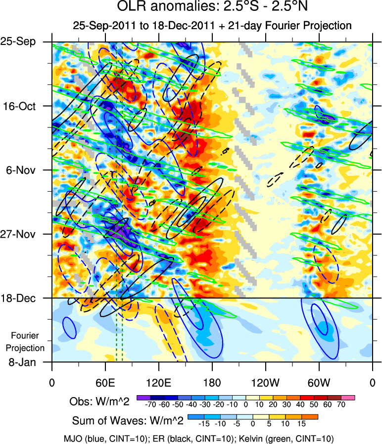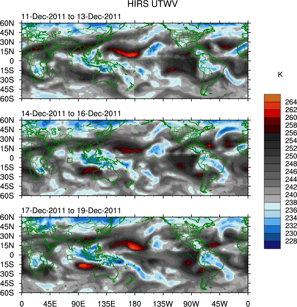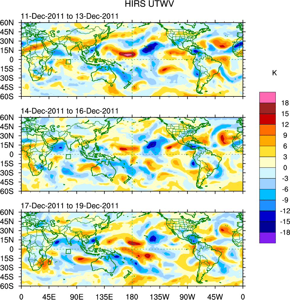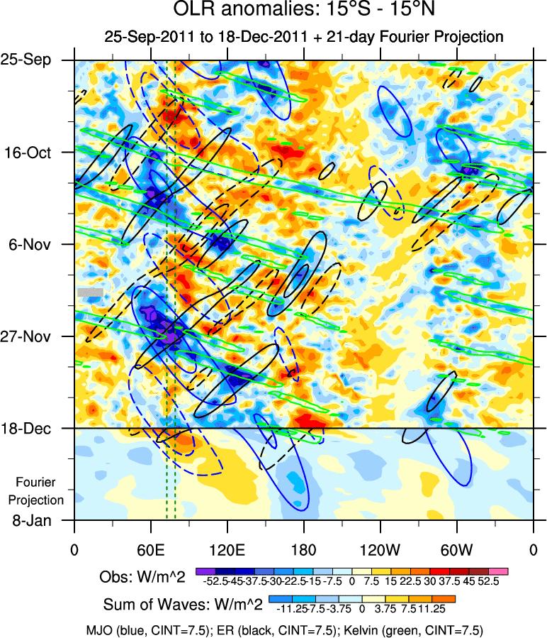 To identify tropical waves in near real-time, the OLR and UTWV data are filtered following Wheeler & Weickmann (2001 MWR). The daily anomalies are calculated using the first 3 harmonics of the seasonal cycle for 1979–2009. Missing values are then filled using linear interpolation in space and time. The most recent 365 days of anomalies are padded with 659 days of zeroes, and the result is filtered for each wave type.