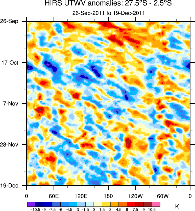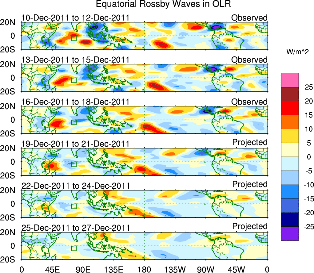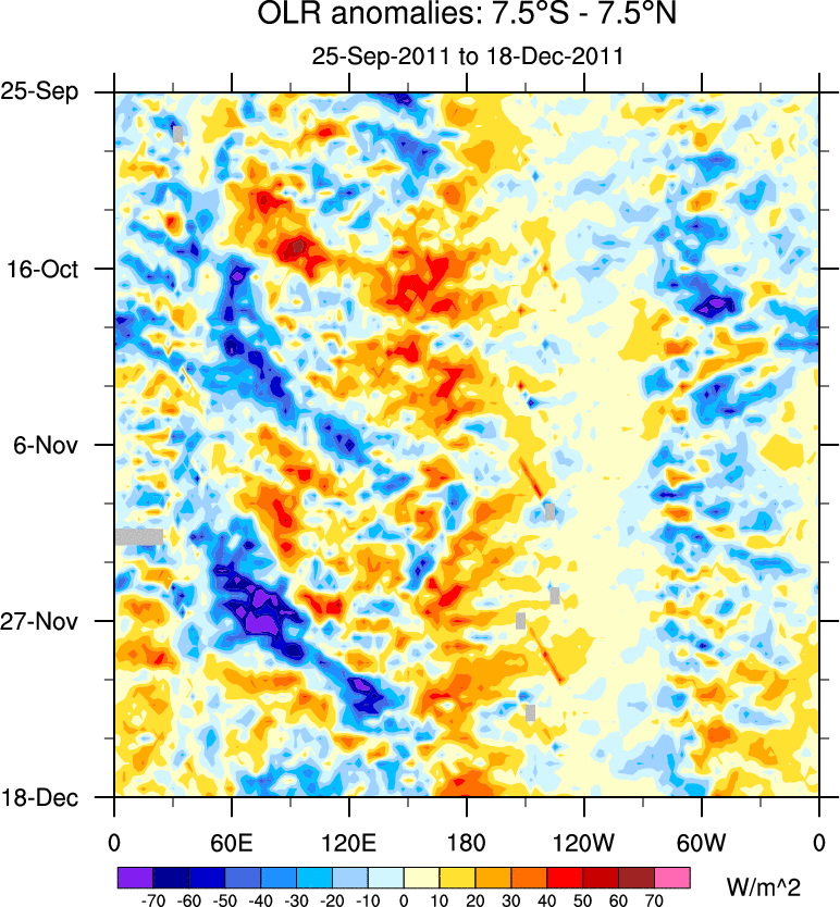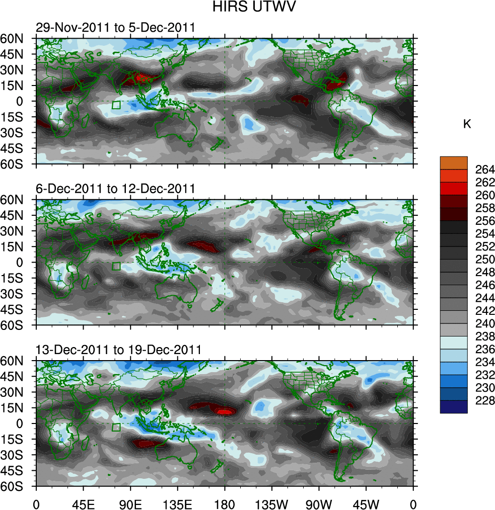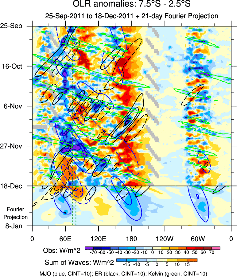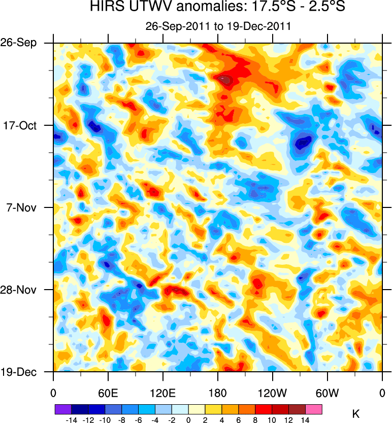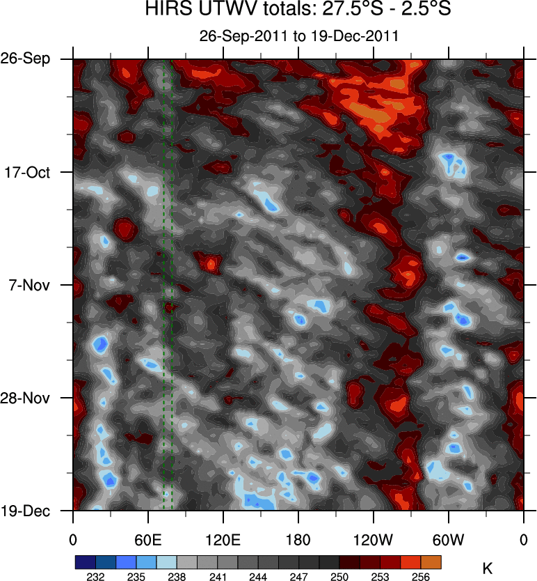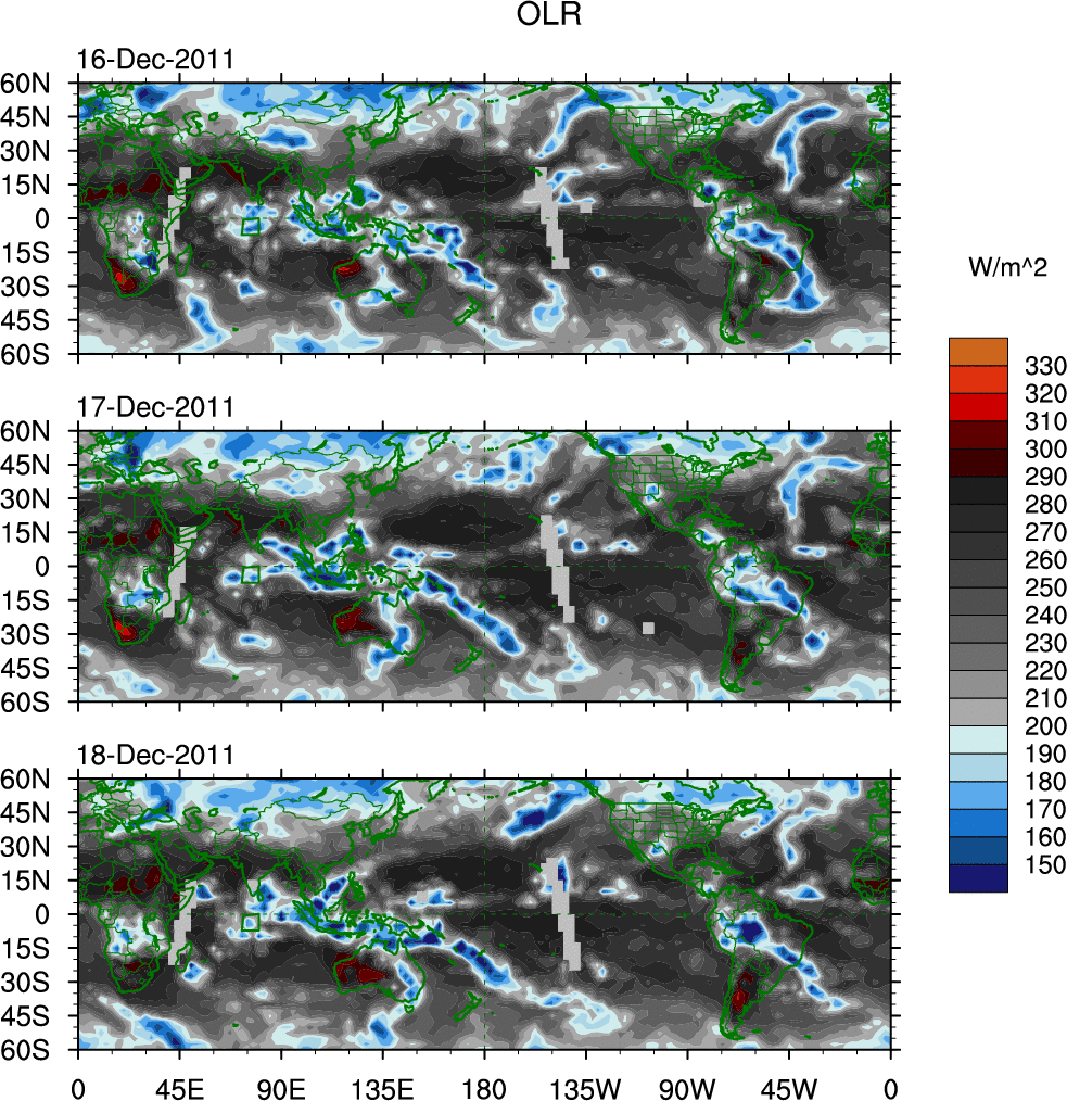 To identify tropical waves in near real-time, the OLR and UTWV data are filtered following Wheeler & Weickmann (2001 MWR). The daily anomalies are calculated using the first 3 harmonics of the seasonal cycle for 1979–2009. Missing values are then filled using linear interpolation in space and time. The most recent 365 days of anomalies are padded with 659 days of zeroes, and the result is filtered for each wave type.