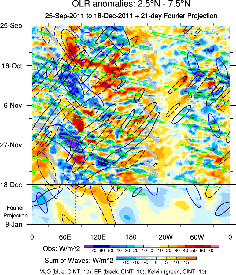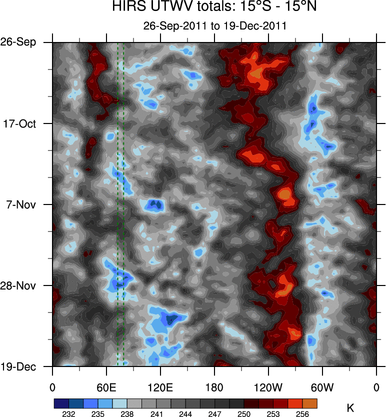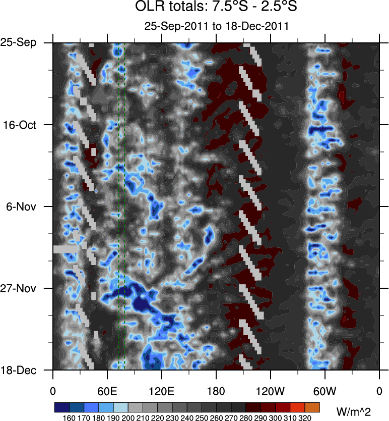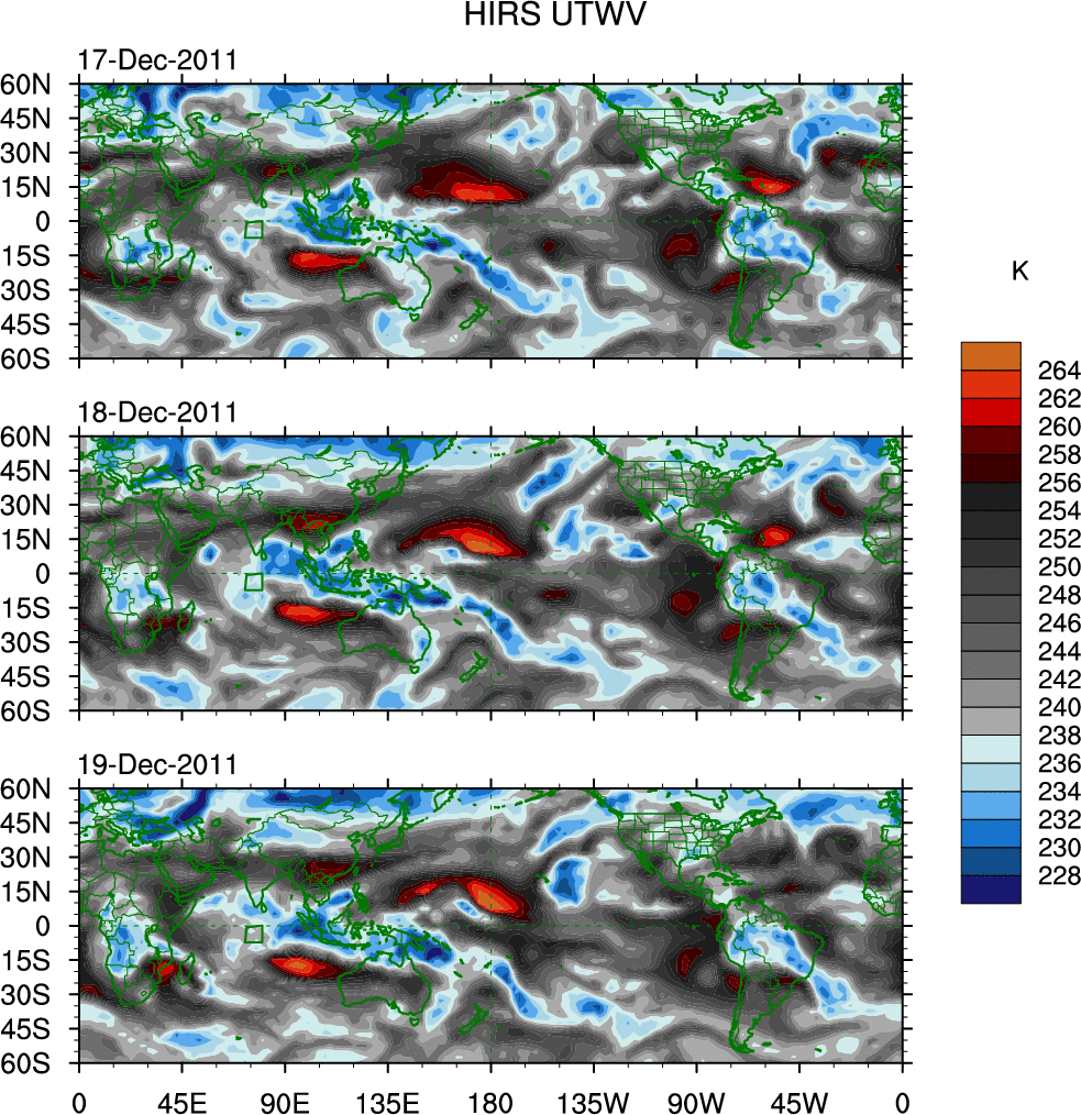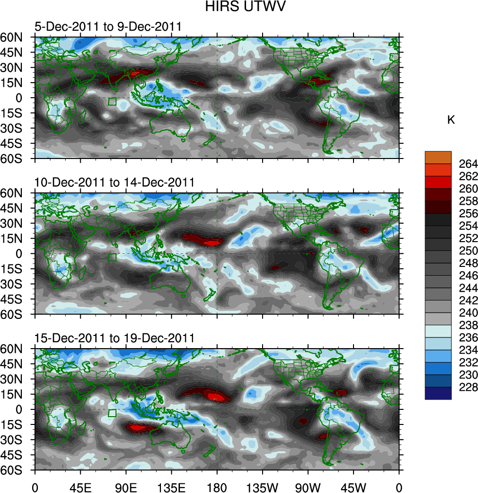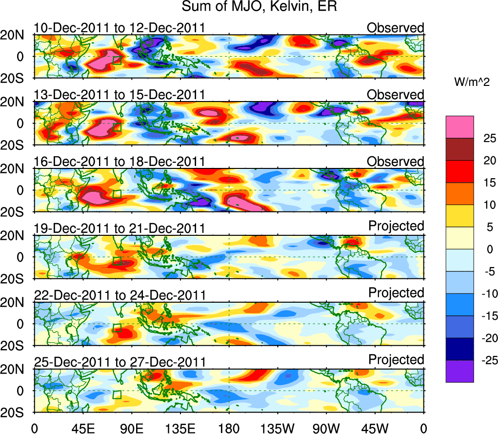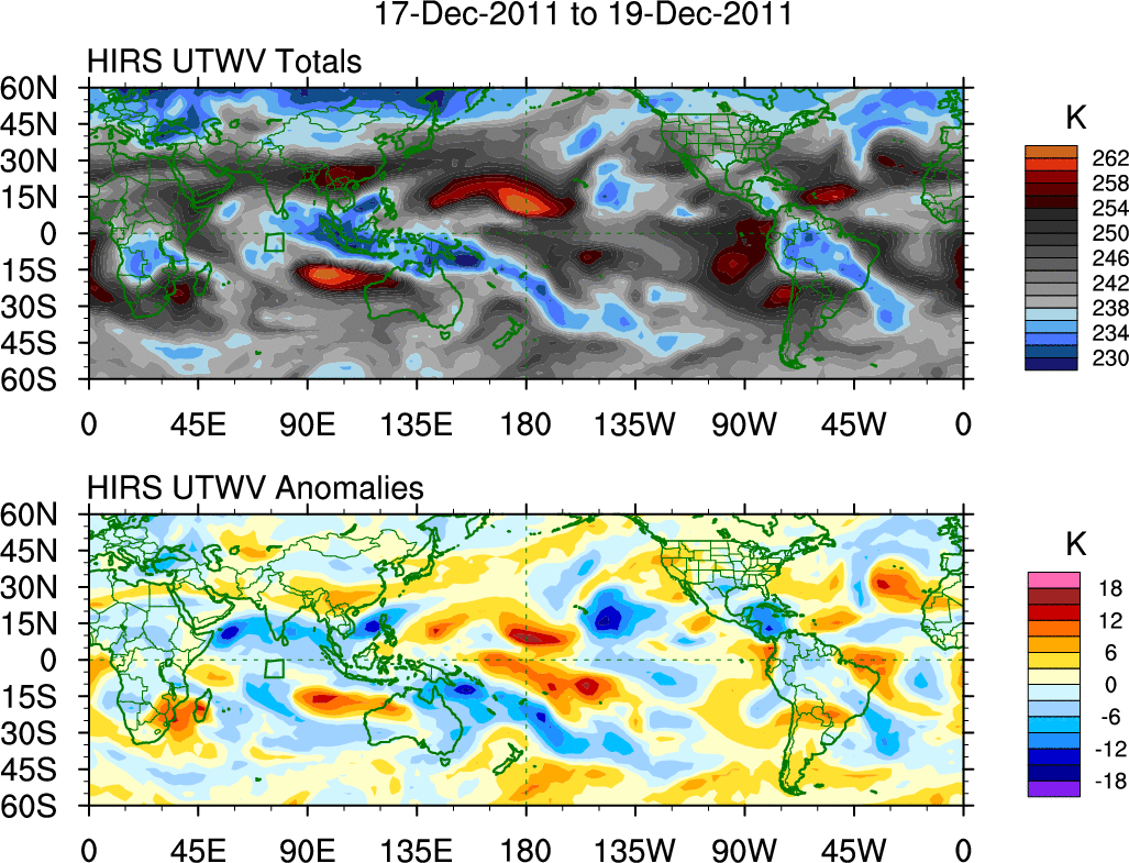 To identify tropical waves in near real-time, the OLR and UTWV data are filtered following Wheeler & Weickmann (2001 MWR). The daily anomalies are calculated using the first 3 harmonics of the seasonal cycle for 1979–2009. Missing values are then filled using linear interpolation in space and time. The most recent 365 days of anomalies are padded with 659 days of zeroes, and the result is filtered for each wave type.