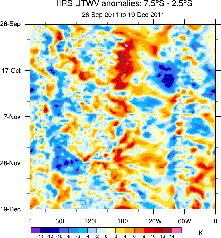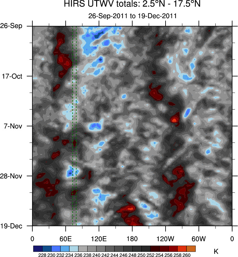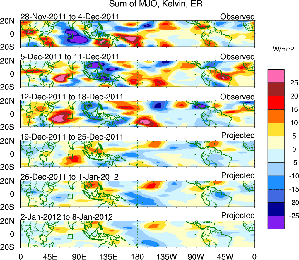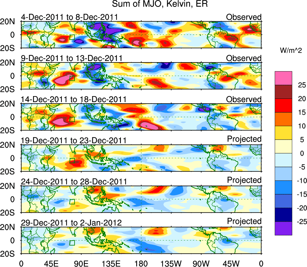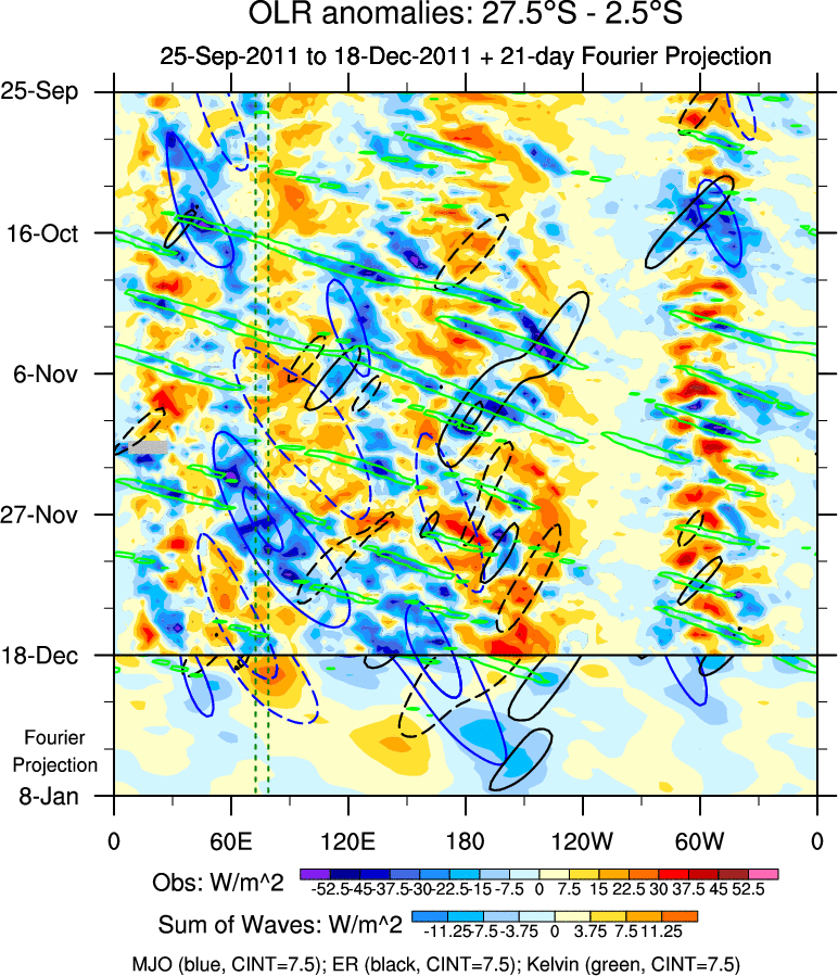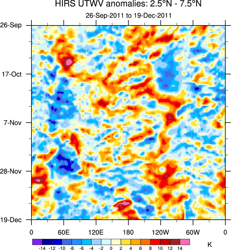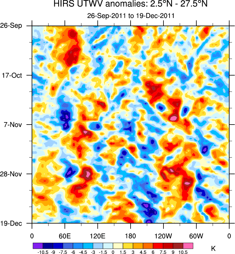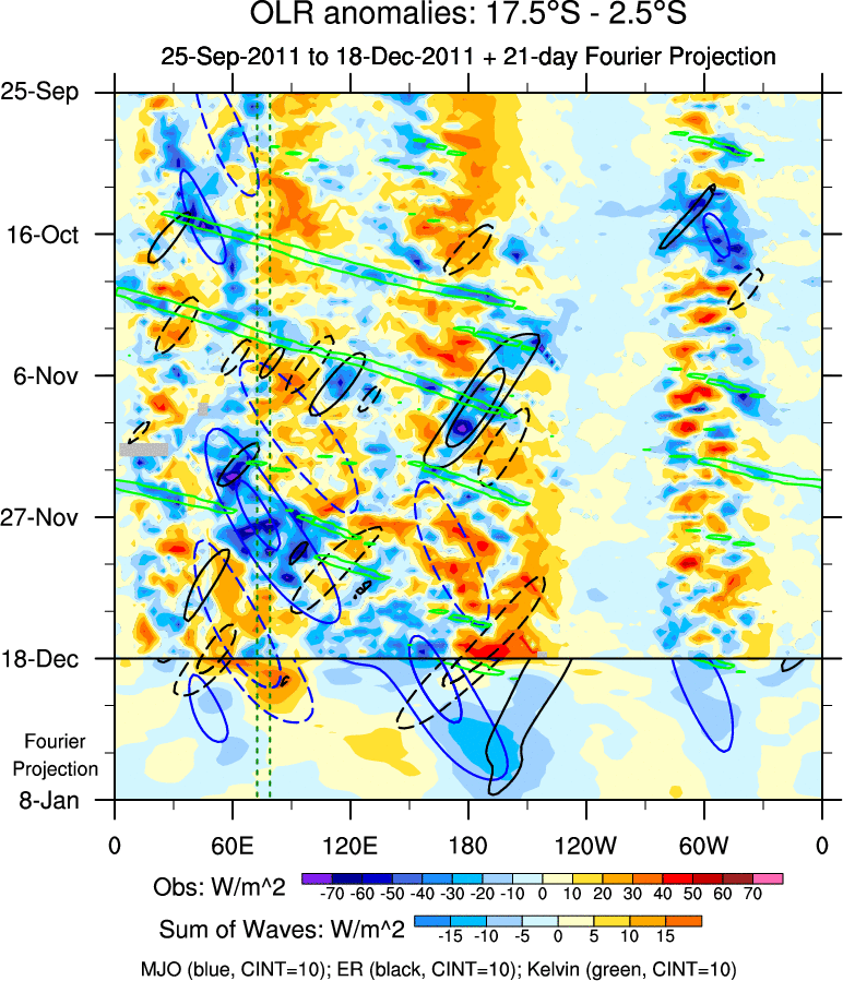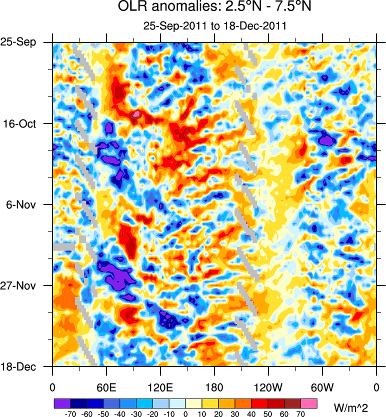 To identify tropical waves in near real-time, the OLR and UTWV data are filtered following Wheeler & Weickmann (2001 MWR). The daily anomalies are calculated using the first 3 harmonics of the seasonal cycle for 1979–2009. Missing values are then filled using linear interpolation in space and time. The most recent 365 days of anomalies are padded with 659 days of zeroes, and the result is filtered for each wave type.