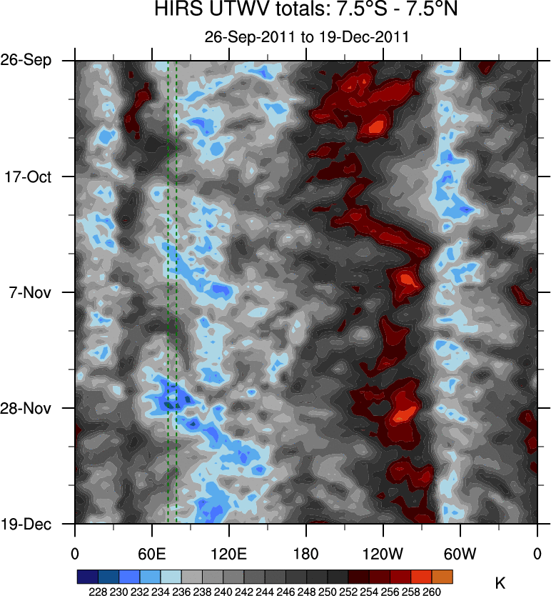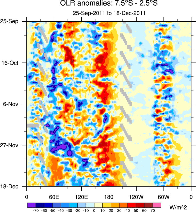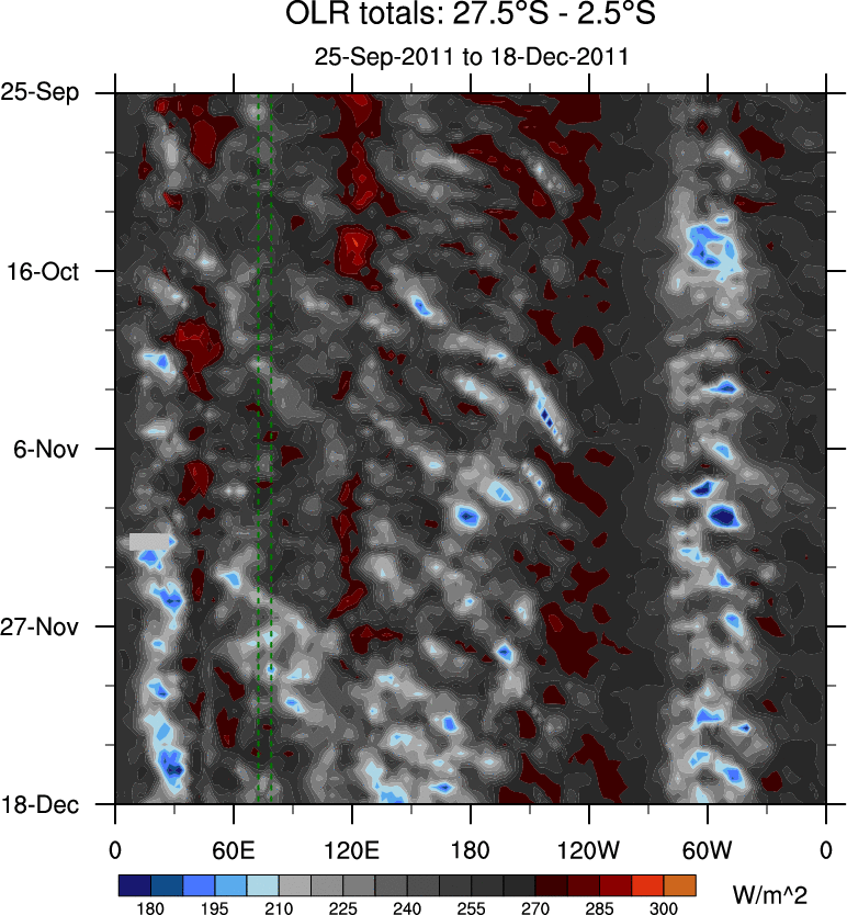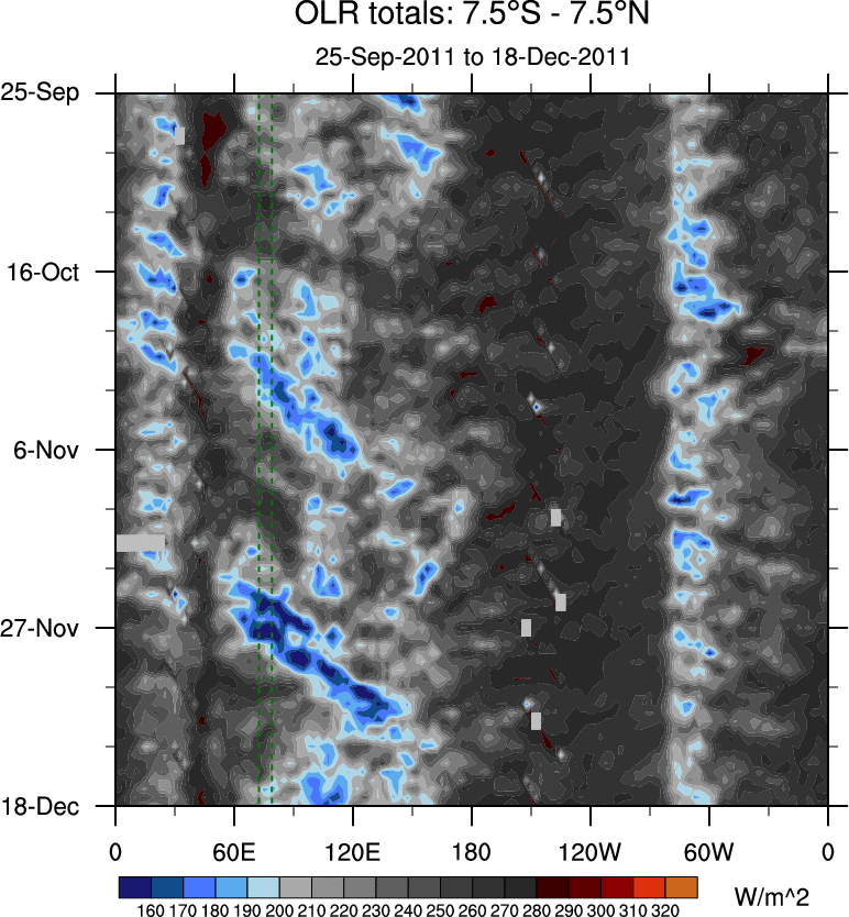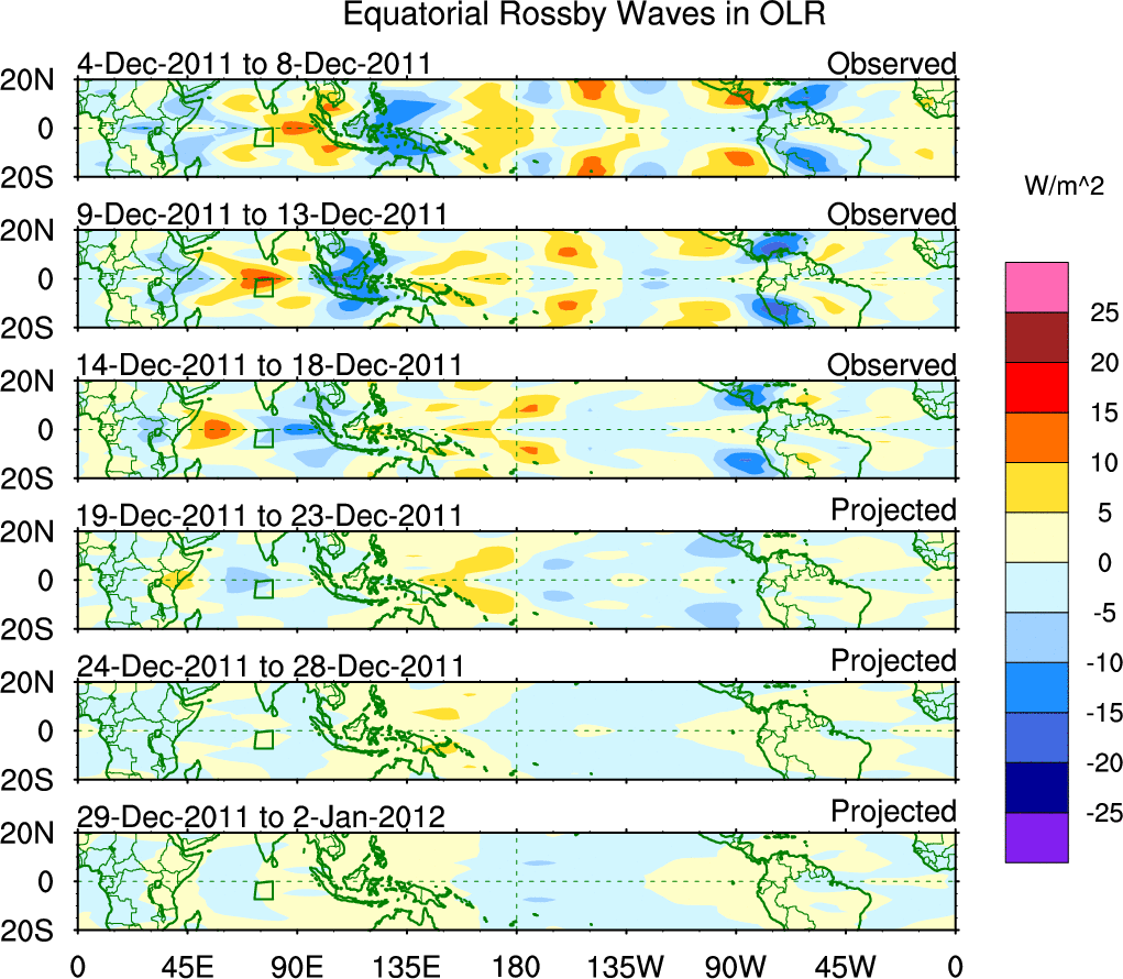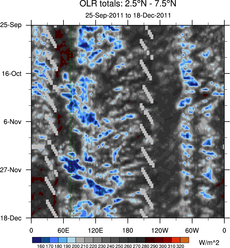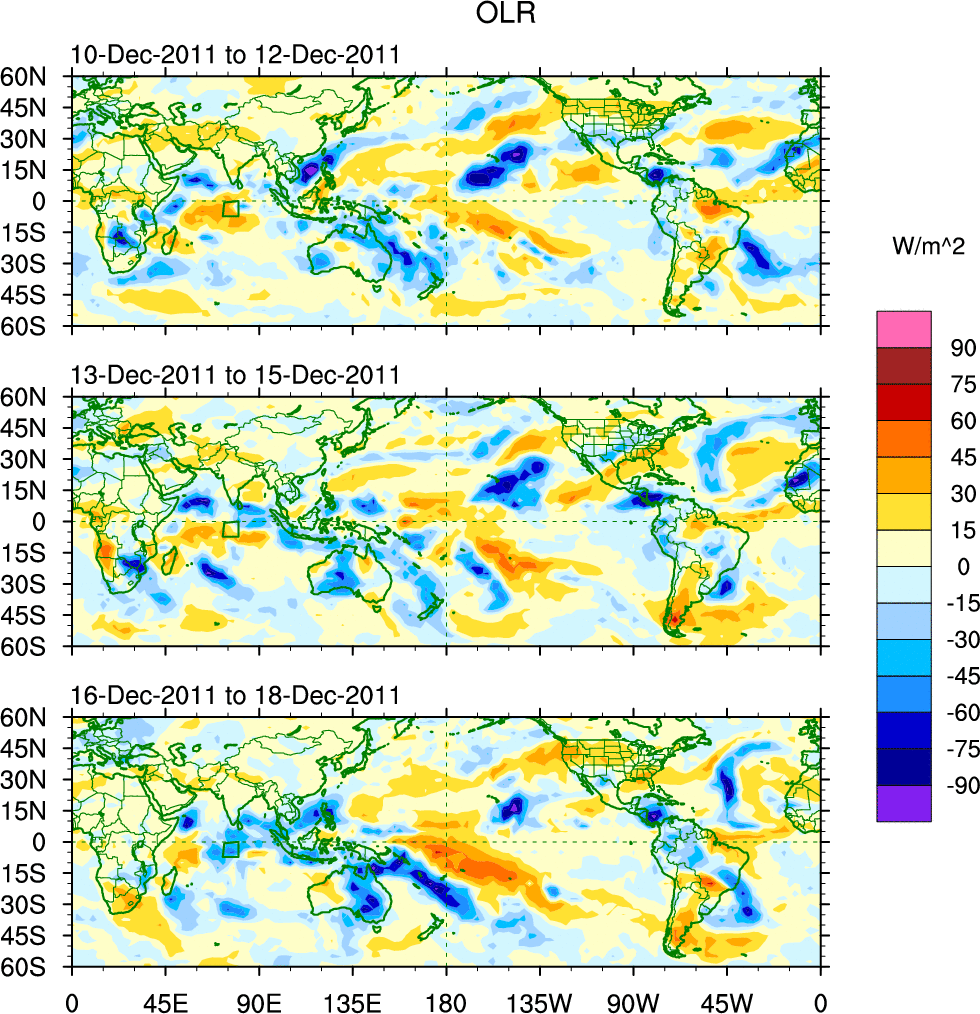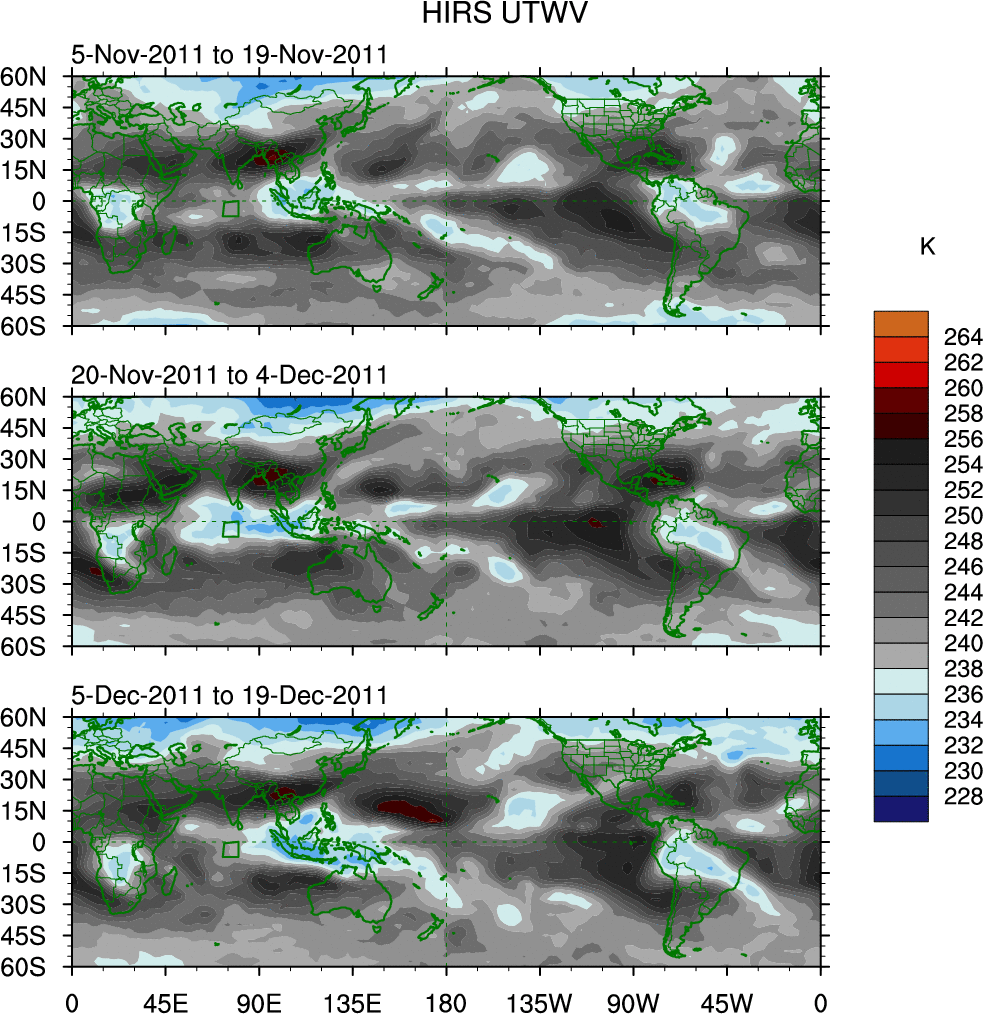 To identify tropical waves in near real-time, the OLR and UTWV data are filtered following Wheeler & Weickmann (2001 MWR). The daily anomalies are calculated using the first 3 harmonics of the seasonal cycle for 1979–2009. Missing values are then filled using linear interpolation in space and time. The most recent 365 days of anomalies are padded with 659 days of zeroes, and the result is filtered for each wave type.