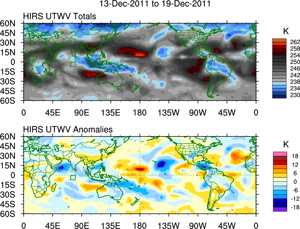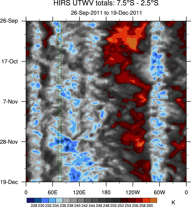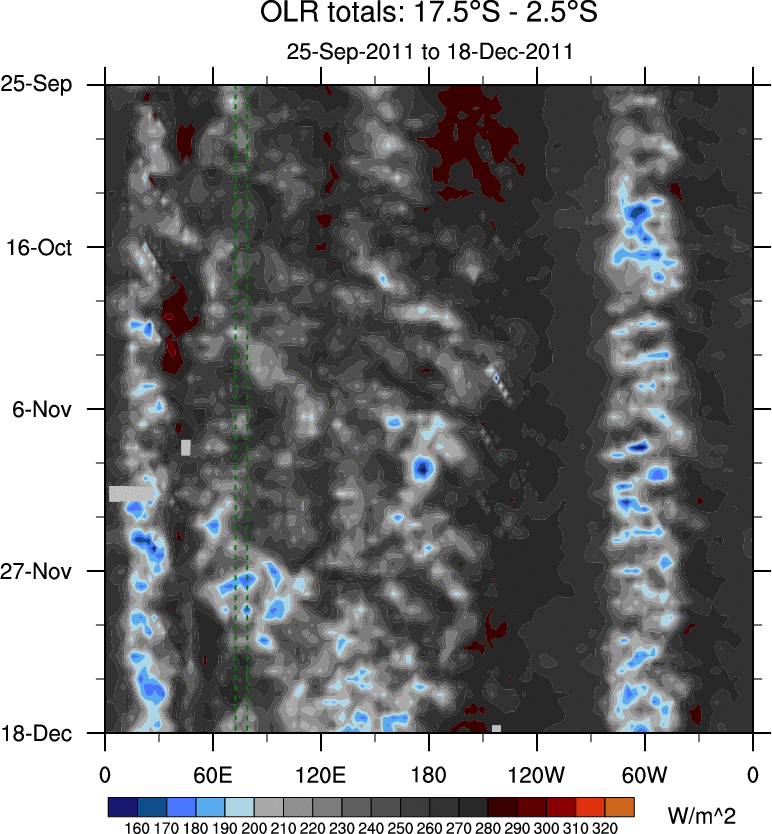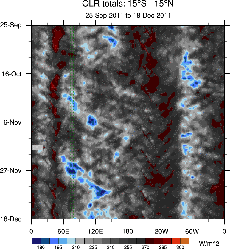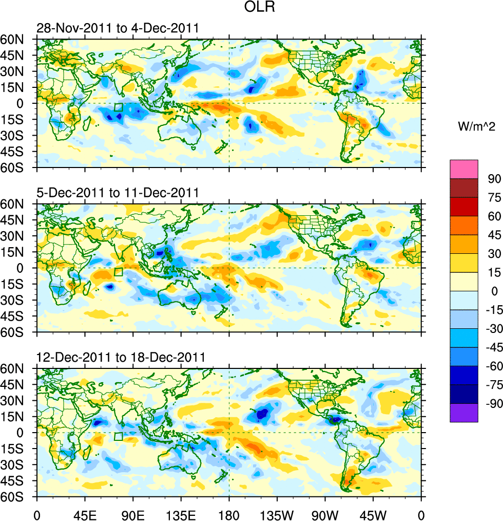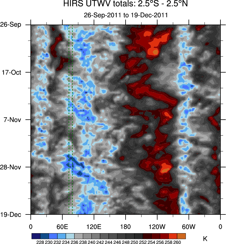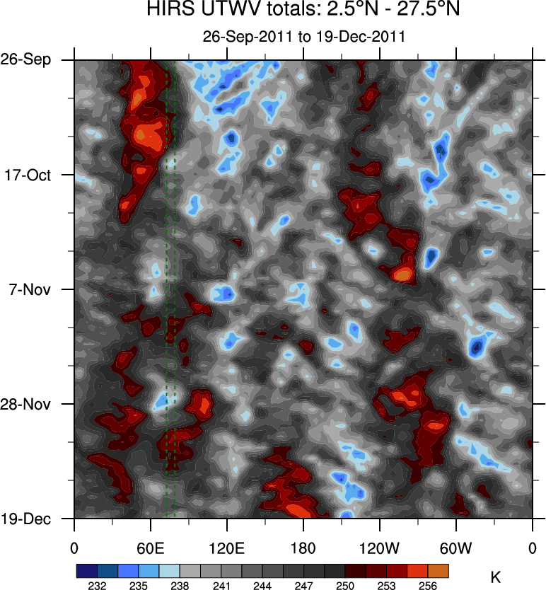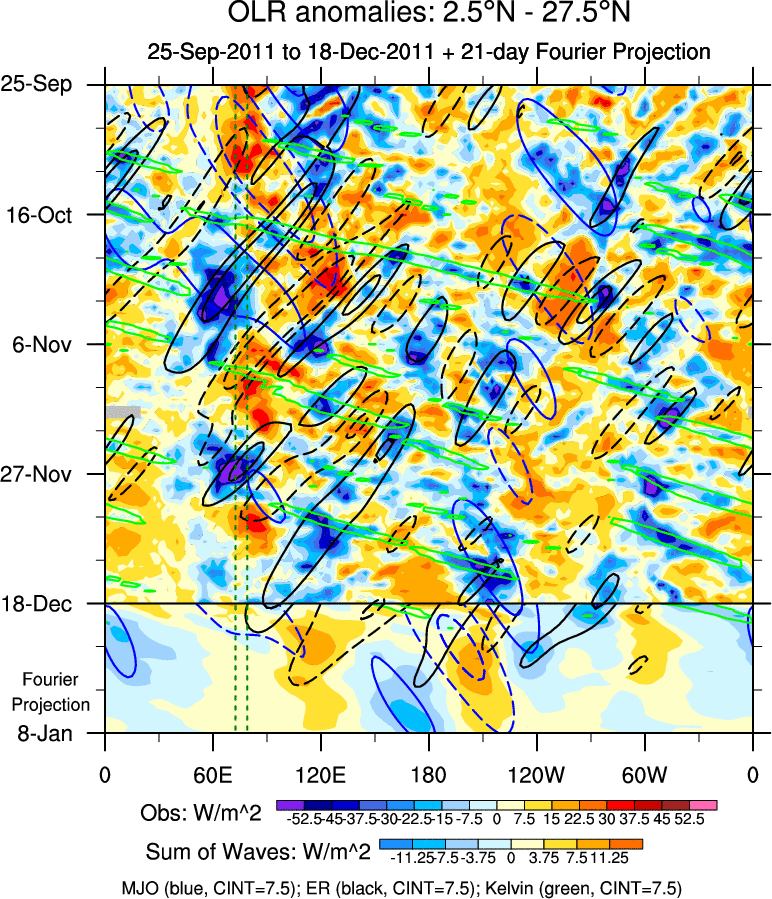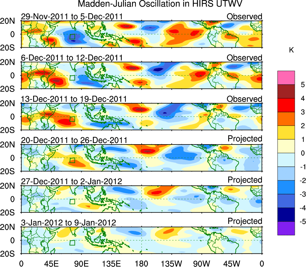 To identify tropical waves in near real-time, the OLR and UTWV data are filtered following Wheeler & Weickmann (2001 MWR). The daily anomalies are calculated using the first 3 harmonics of the seasonal cycle for 1979–2009. Missing values are then filled using linear interpolation in space and time. The most recent 365 days of anomalies are padded with 659 days of zeroes, and the result is filtered for each wave type.