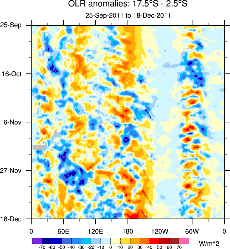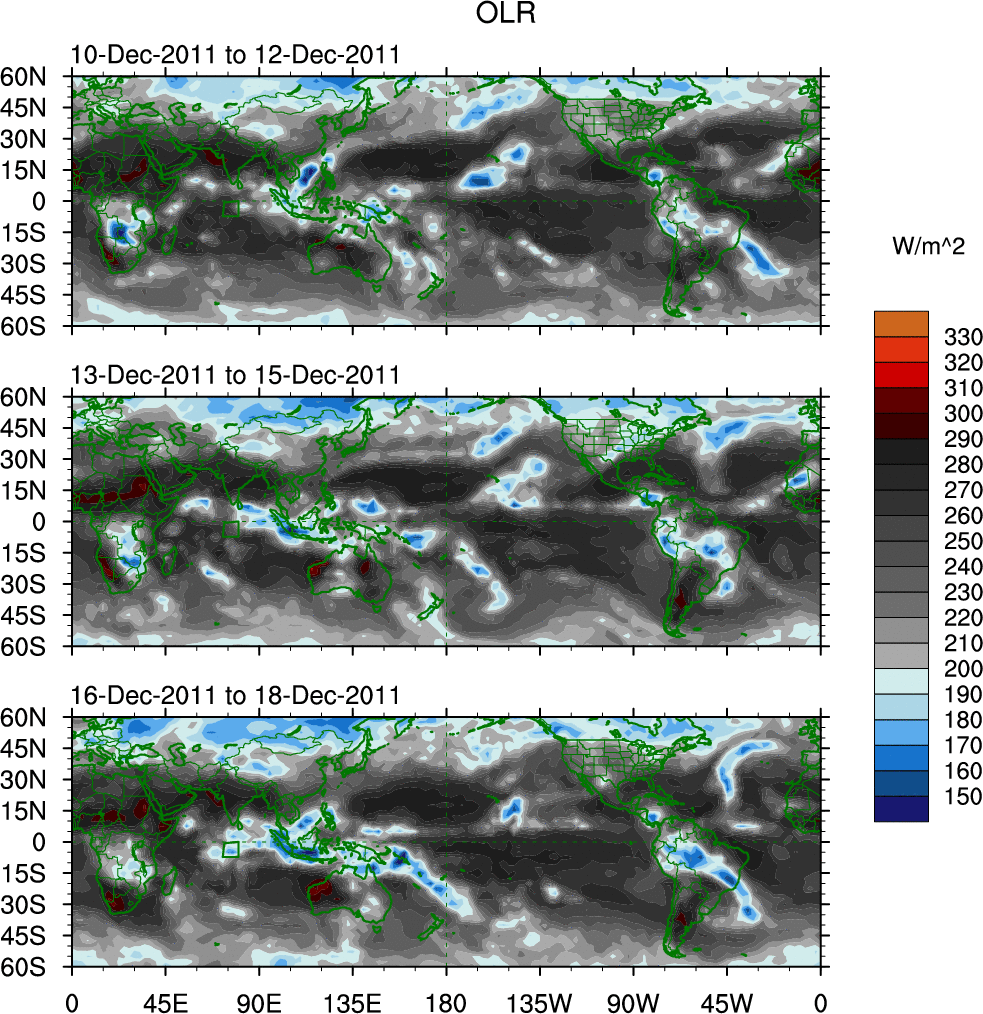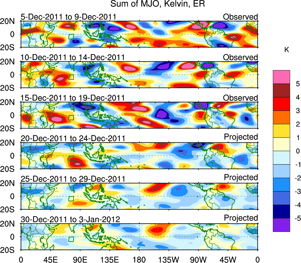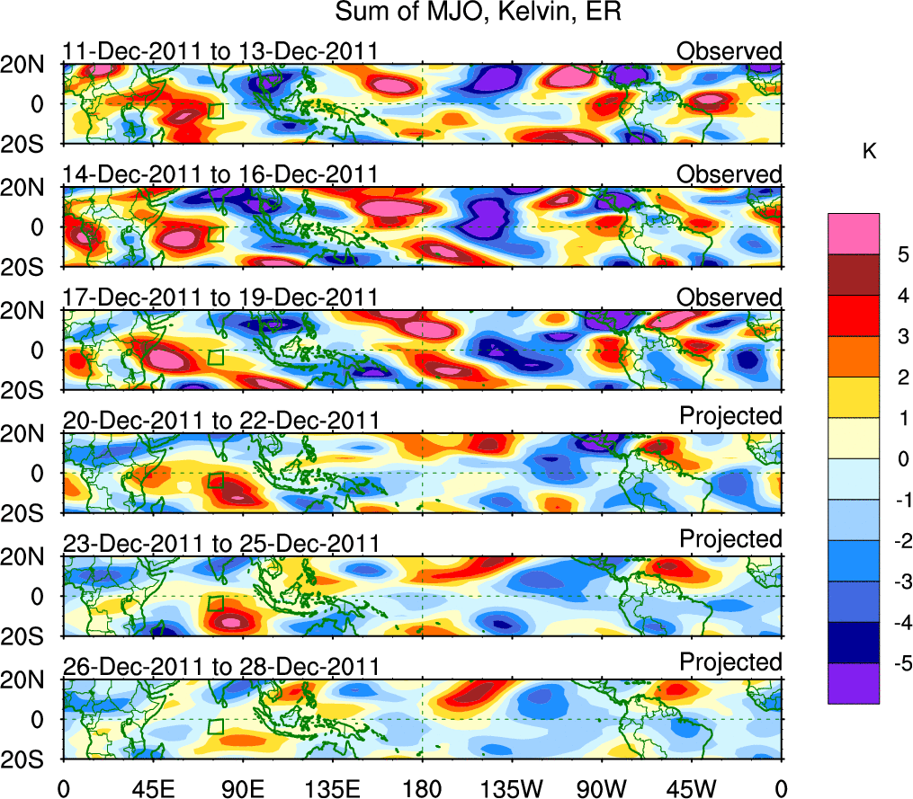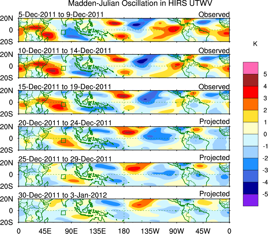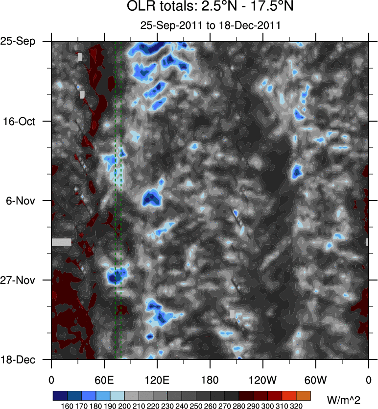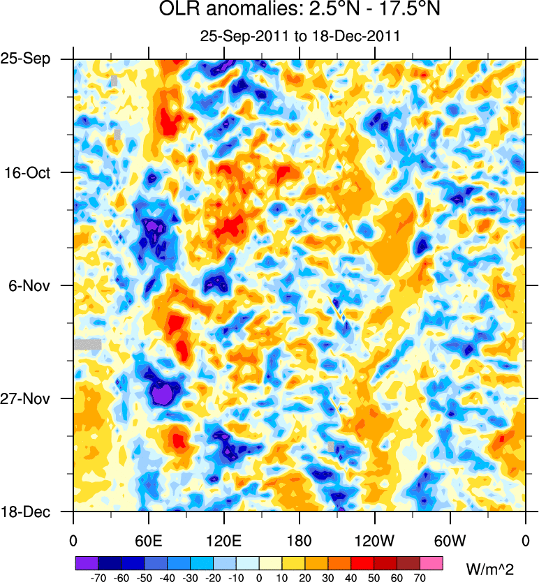 To identify tropical waves in near real-time, the OLR and UTWV data are filtered following Wheeler & Weickmann (2001 MWR). The daily anomalies are calculated using the first 3 harmonics of the seasonal cycle for 1979–2009. Missing values are then filled using linear interpolation in space and time. The most recent 365 days of anomalies are padded with 659 days of zeroes, and the result is filtered for each wave type.