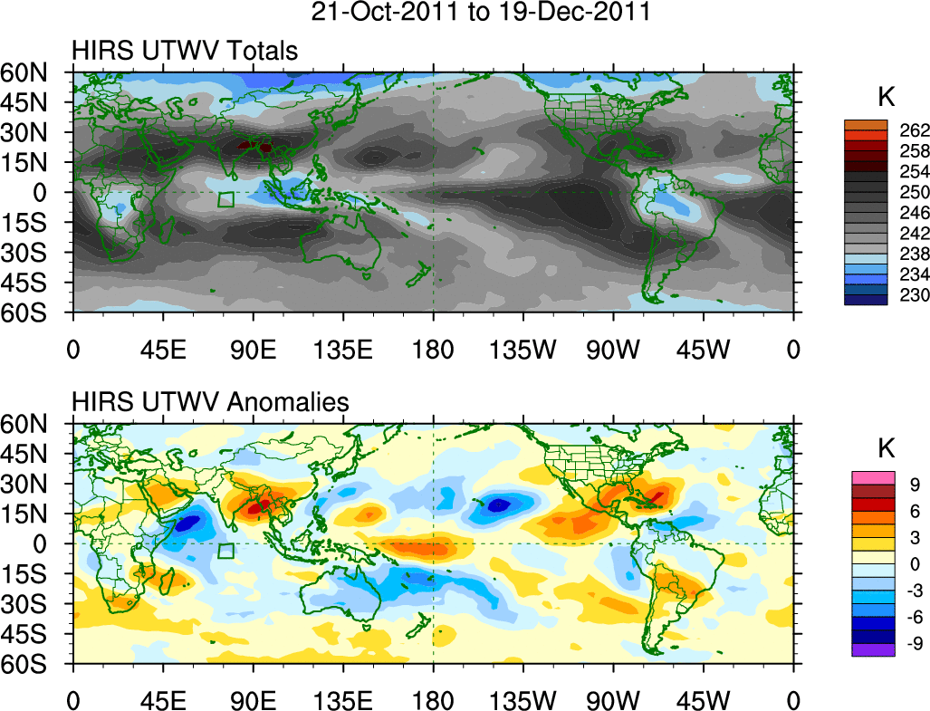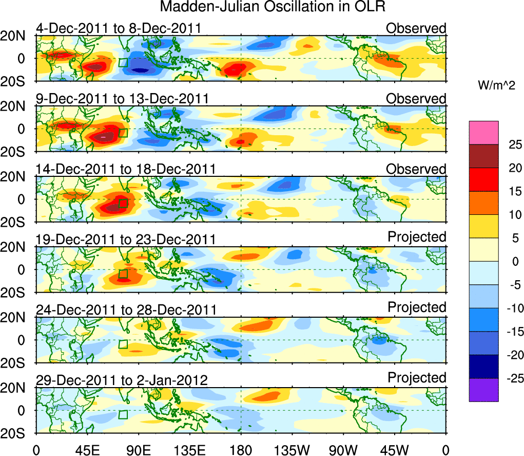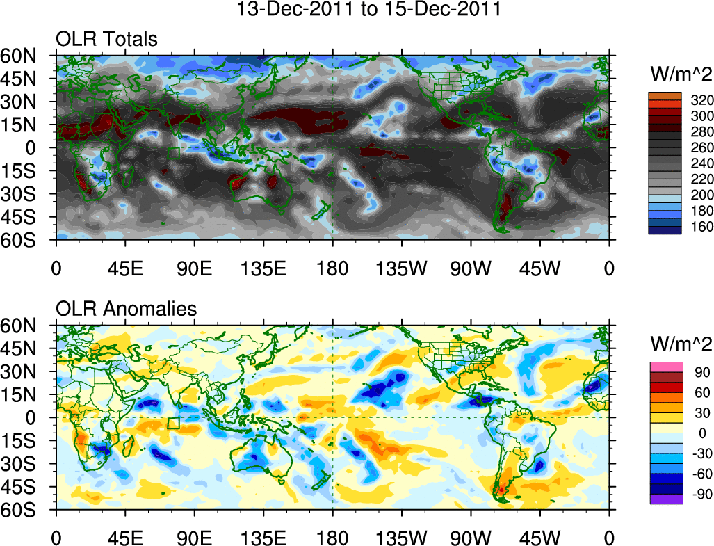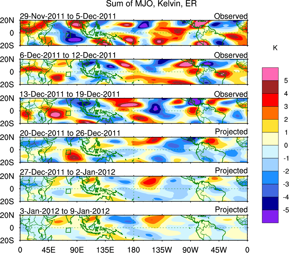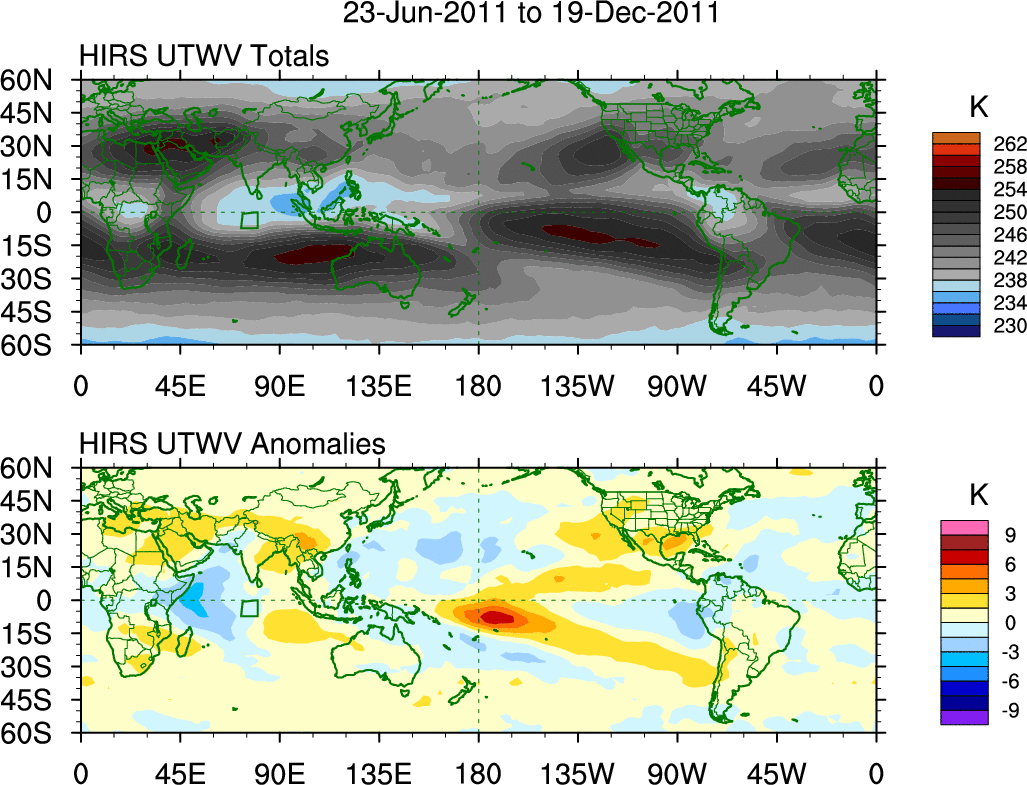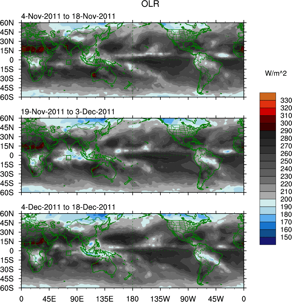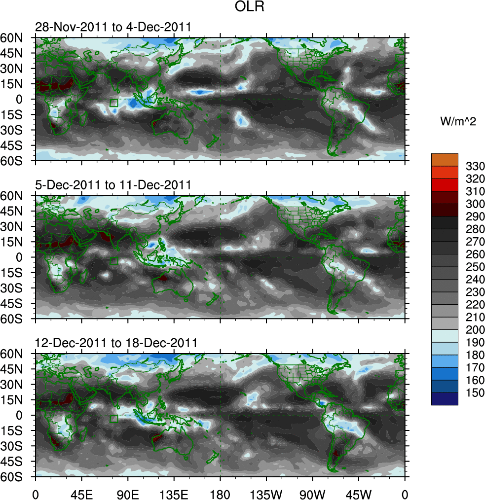 To identify tropical waves in near real-time, the OLR and UTWV data are filtered following Wheeler & Weickmann (2001 MWR). The daily anomalies are calculated using the first 3 harmonics of the seasonal cycle for 1979–2009. Missing values are then filled using linear interpolation in space and time. The most recent 365 days of anomalies are padded with 659 days of zeroes, and the result is filtered for each wave type.