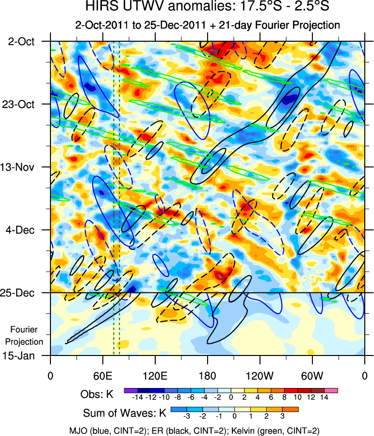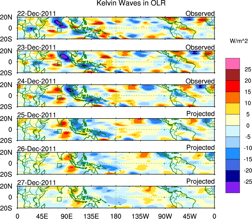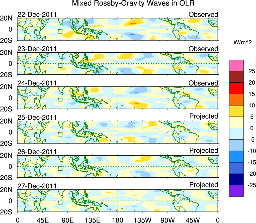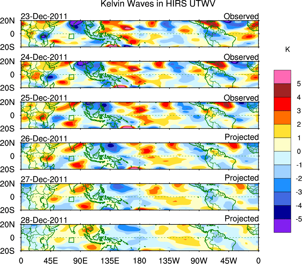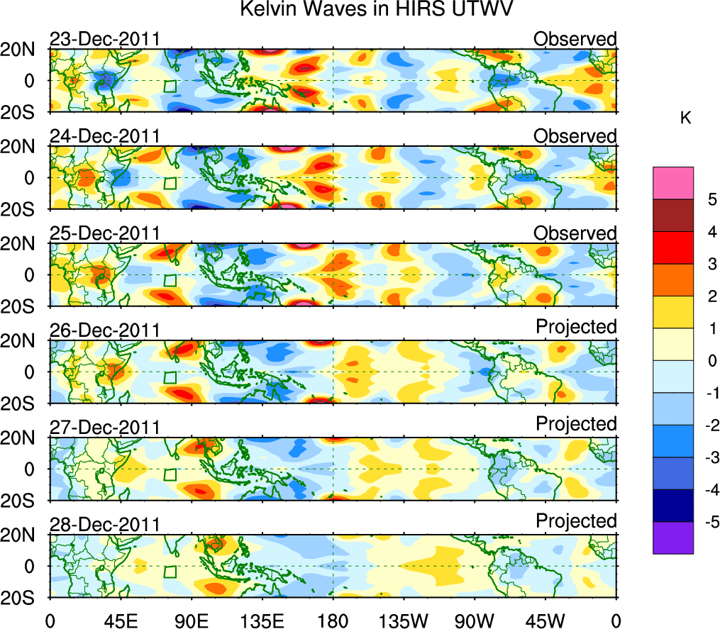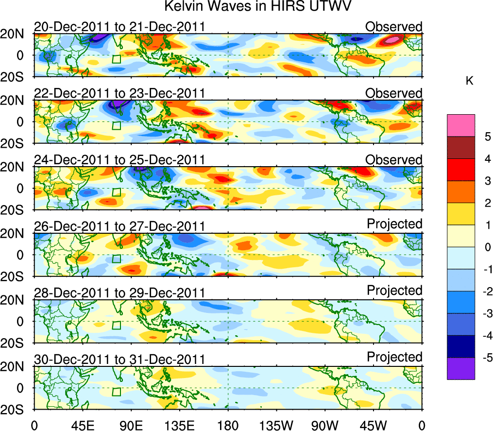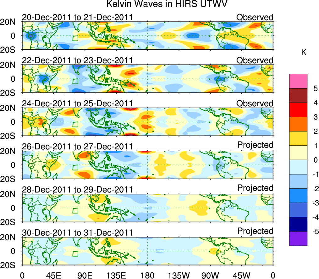 To identify tropical waves in near real-time, the OLR and UTWV data are filtered following Wheeler & Weickmann (2001 MWR). The daily anomalies are calculated using the first 3 harmonics of the seasonal cycle for 1979–2009. Missing values are then filled using linear interpolation in space and time. The most recent 365 days of anomalies are padded with 659 days of zeroes, and the result is filtered for each wave type.