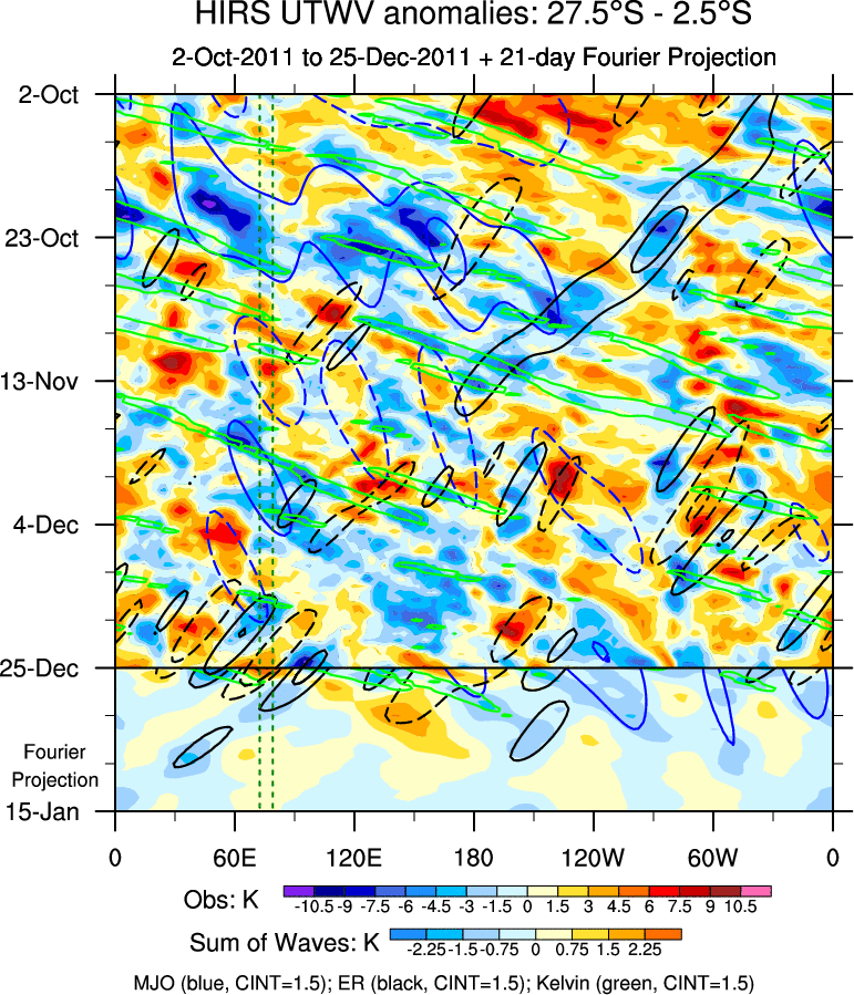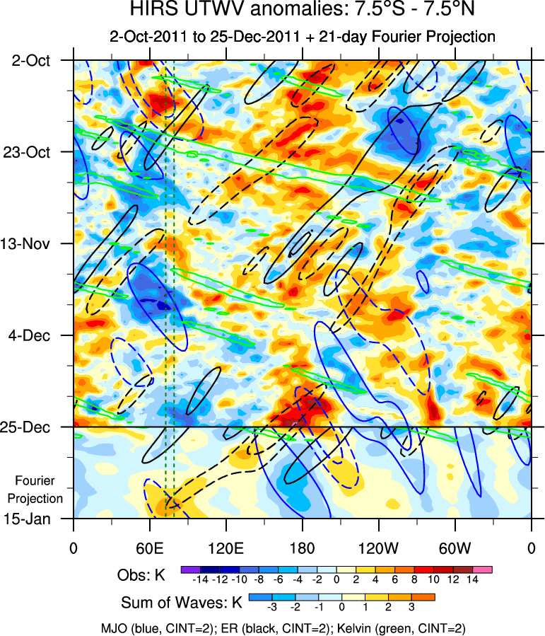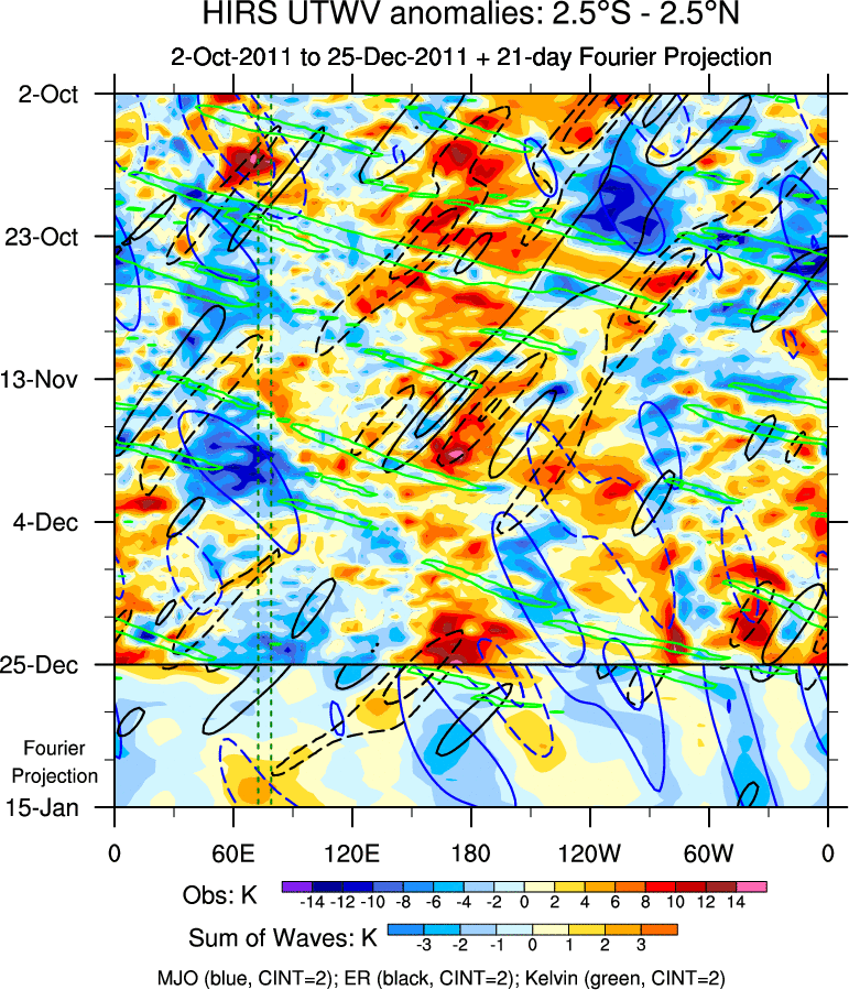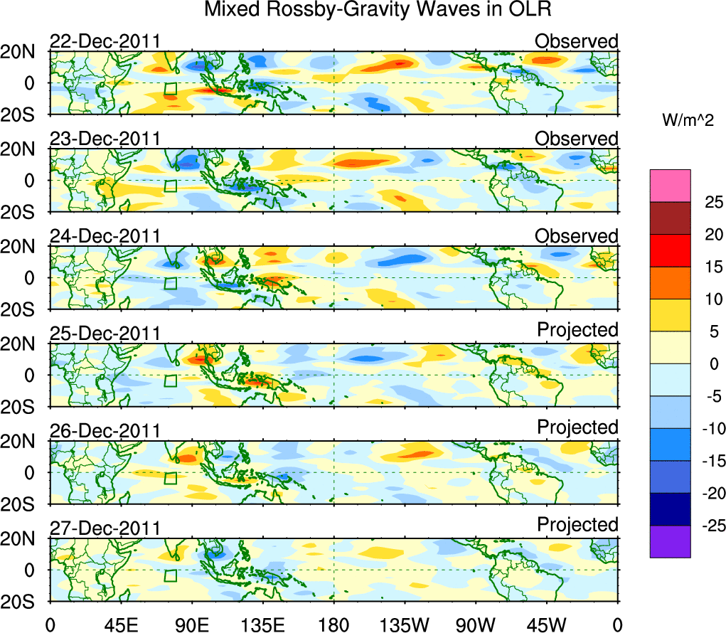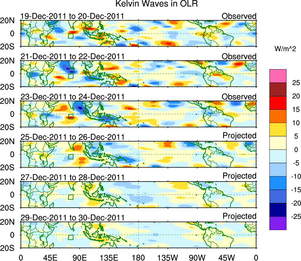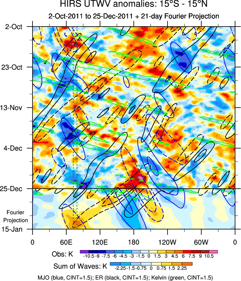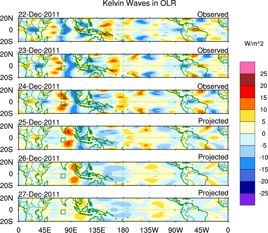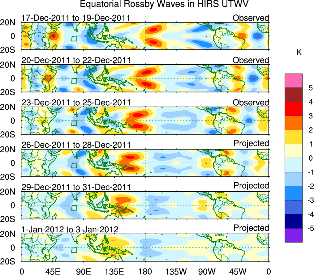 To identify tropical waves in near real-time, the OLR and UTWV data are filtered following Wheeler & Weickmann (2001 MWR). The daily anomalies are calculated using the first 3 harmonics of the seasonal cycle for 1979–2009. Missing values are then filled using linear interpolation in space and time. The most recent 365 days of anomalies are padded with 659 days of zeroes, and the result is filtered for each wave type.