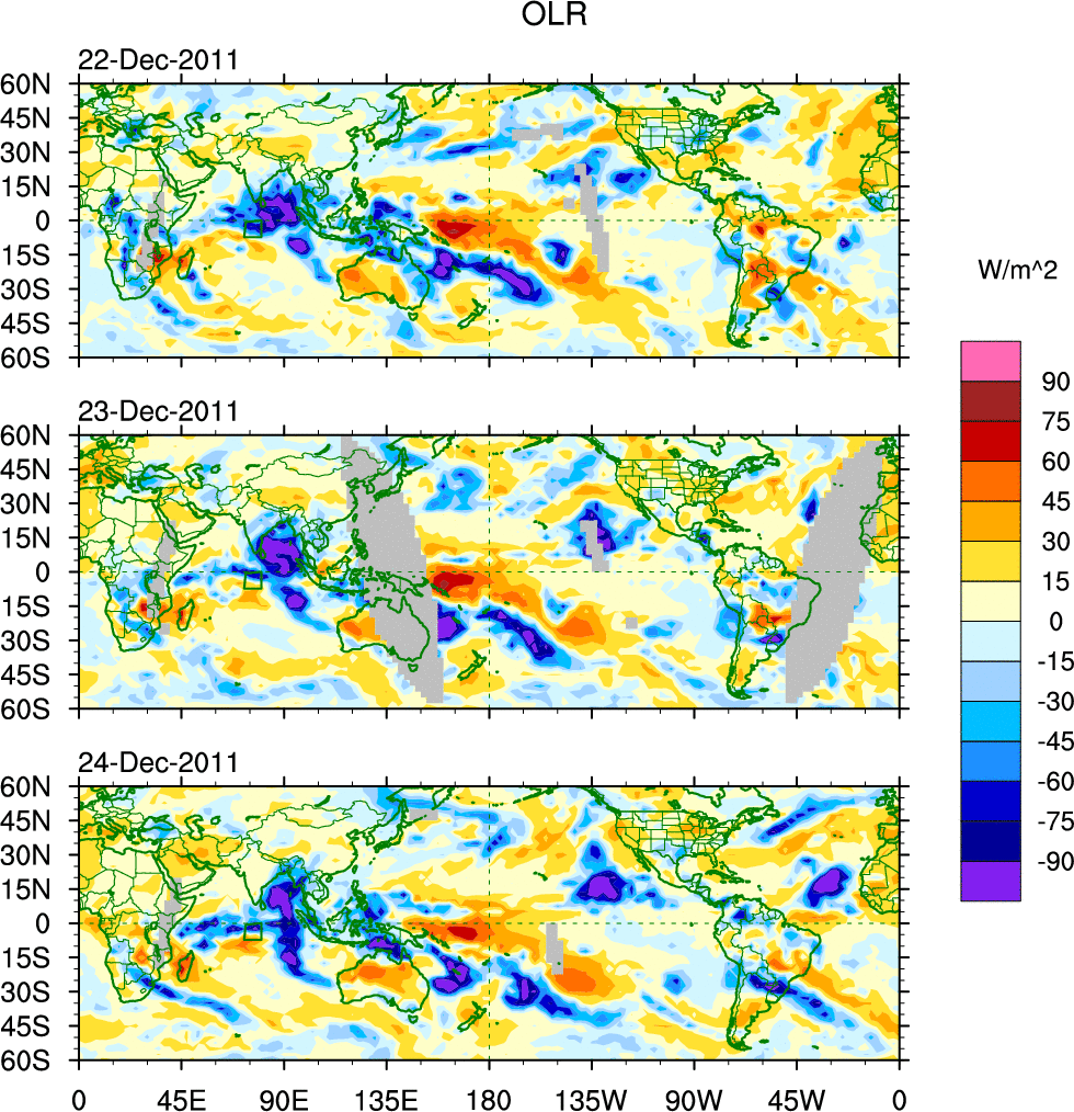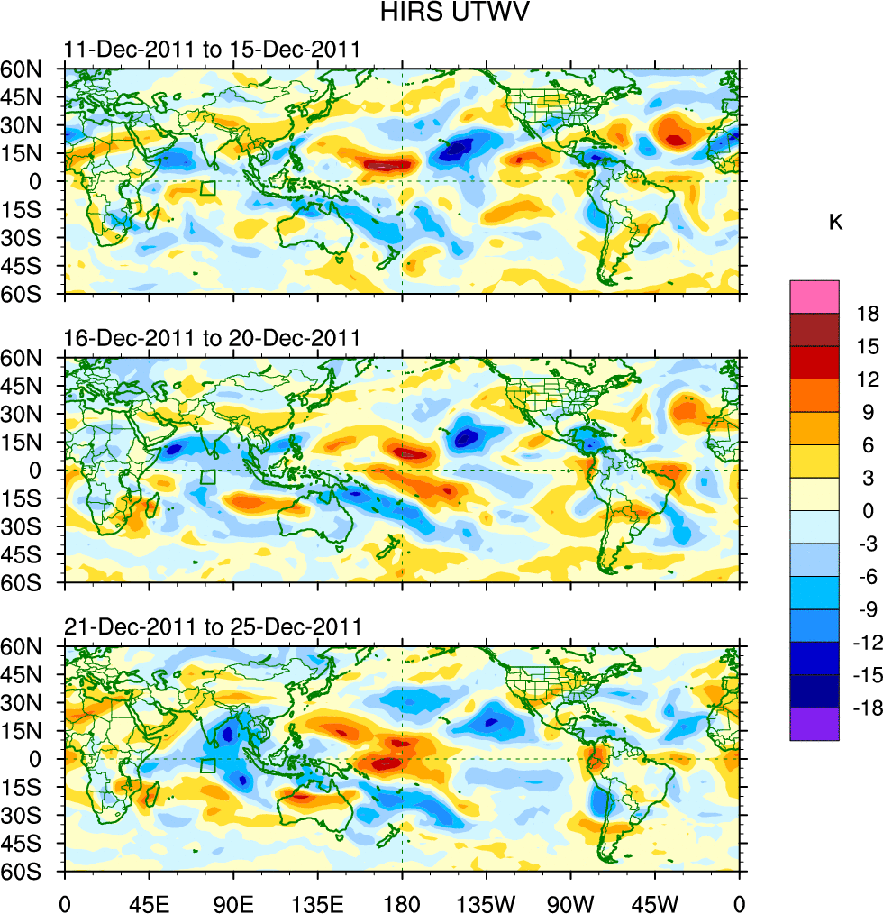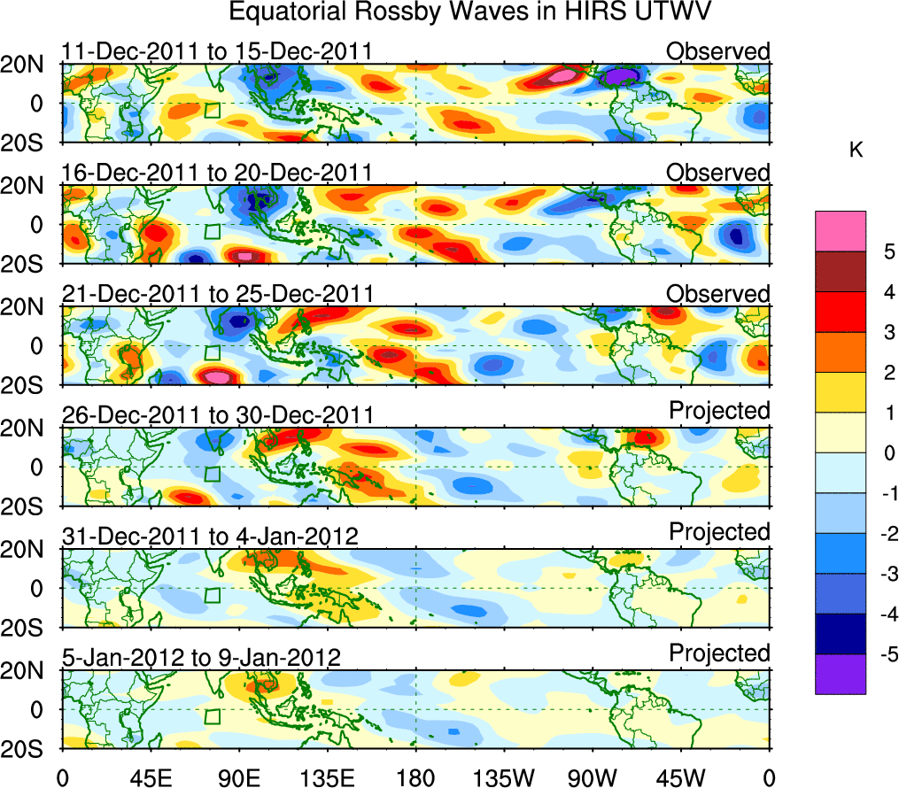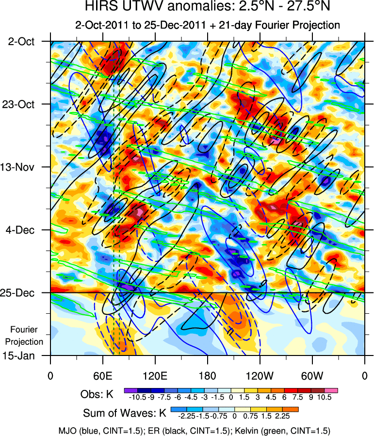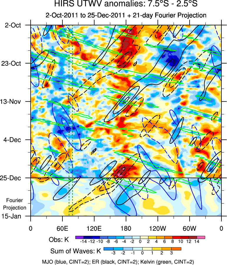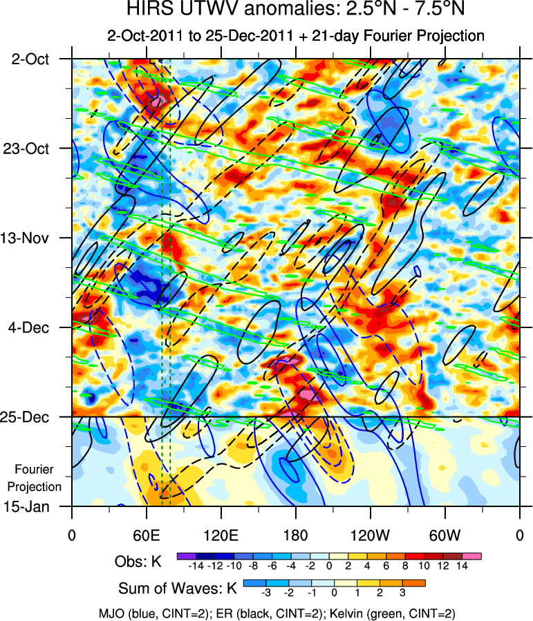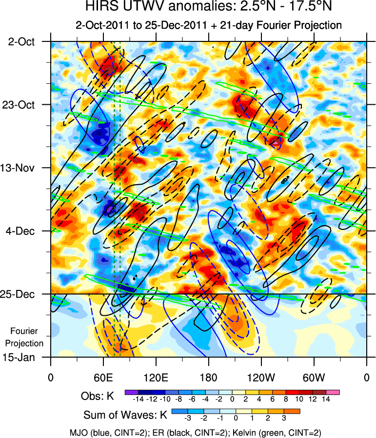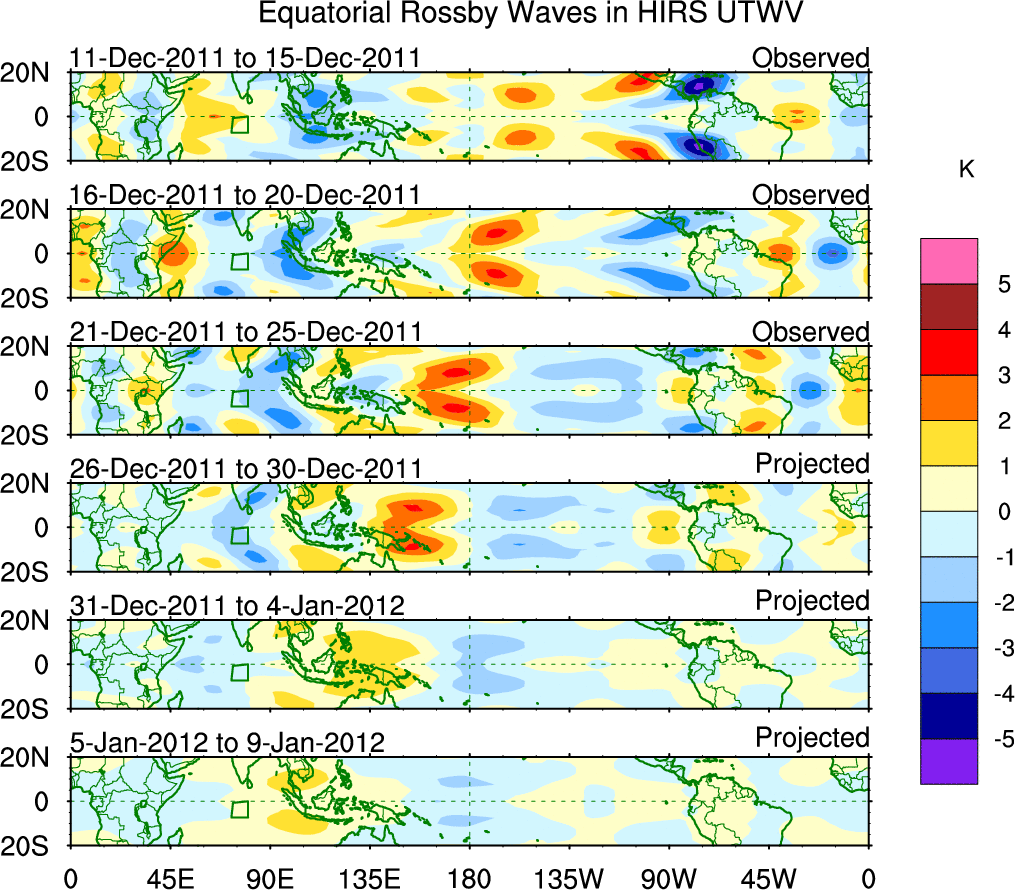 To identify tropical waves in near real-time, the OLR and UTWV data are filtered following Wheeler & Weickmann (2001 MWR). The daily anomalies are calculated using the first 3 harmonics of the seasonal cycle for 1979–2009. Missing values are then filled using linear interpolation in space and time. The most recent 365 days of anomalies are padded with 659 days of zeroes, and the result is filtered for each wave type.