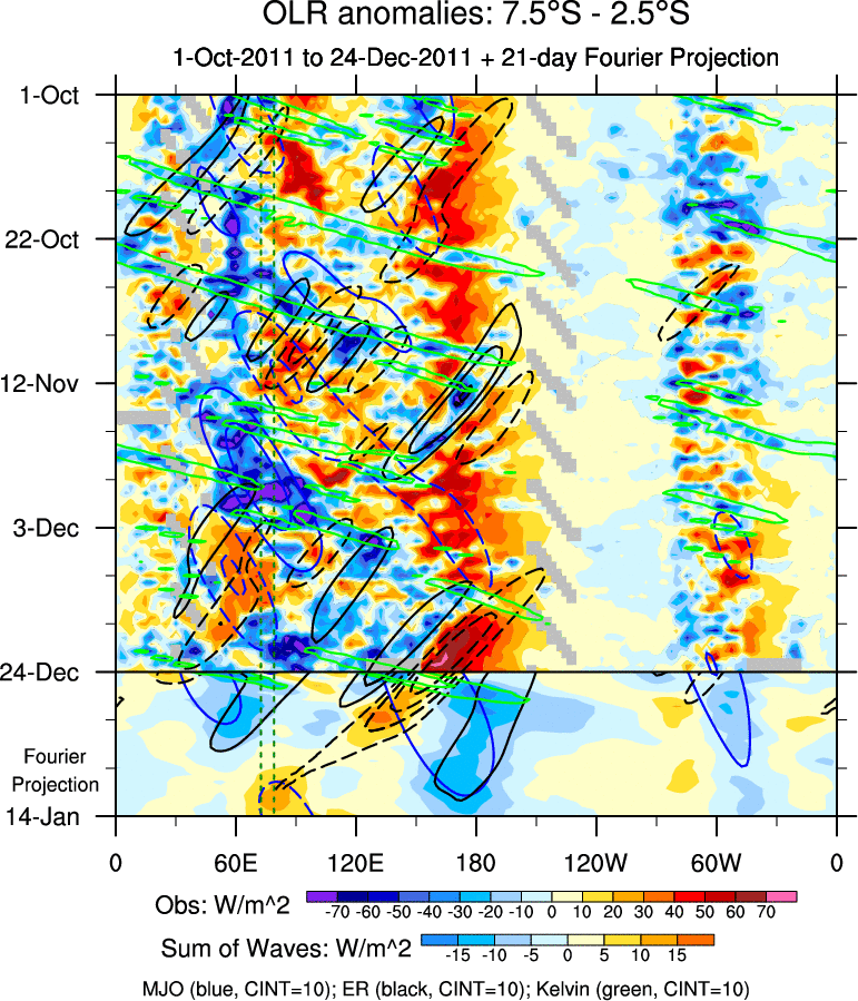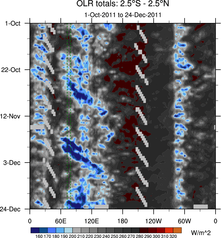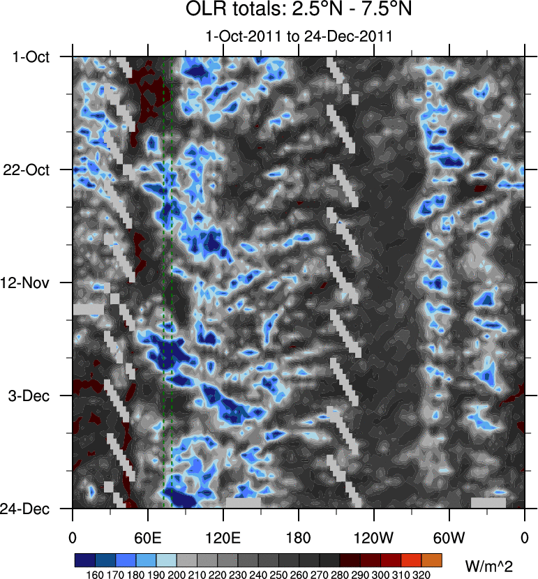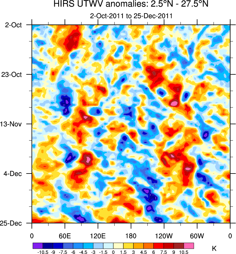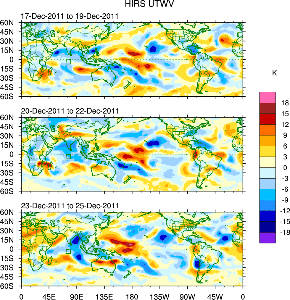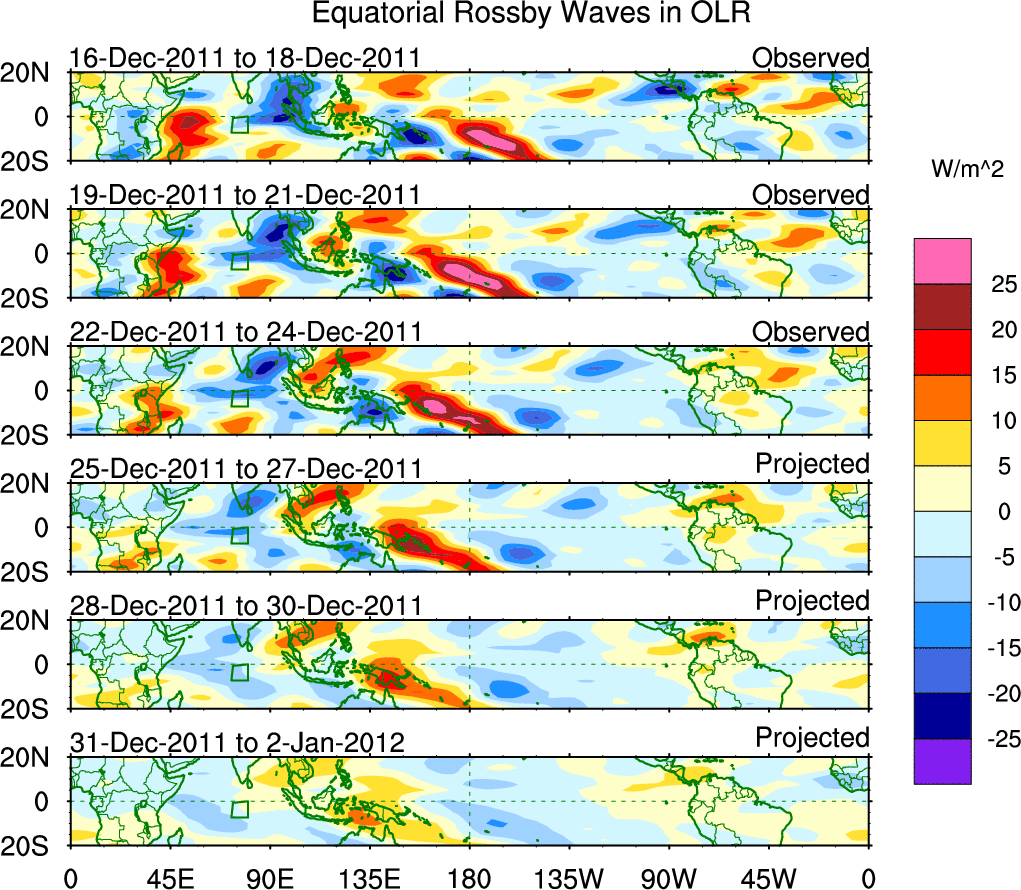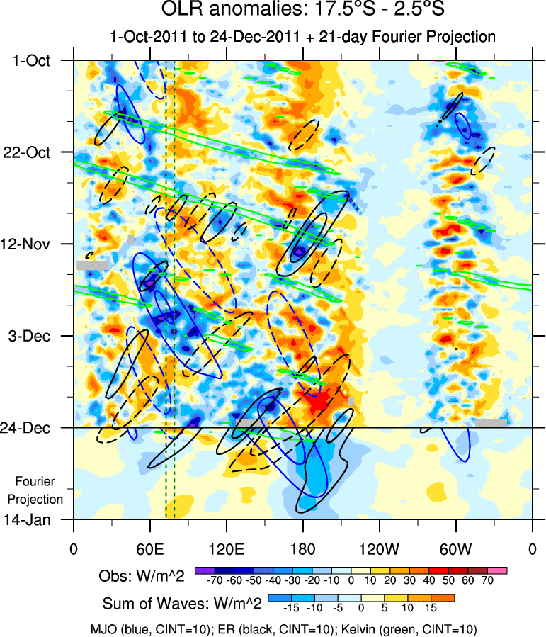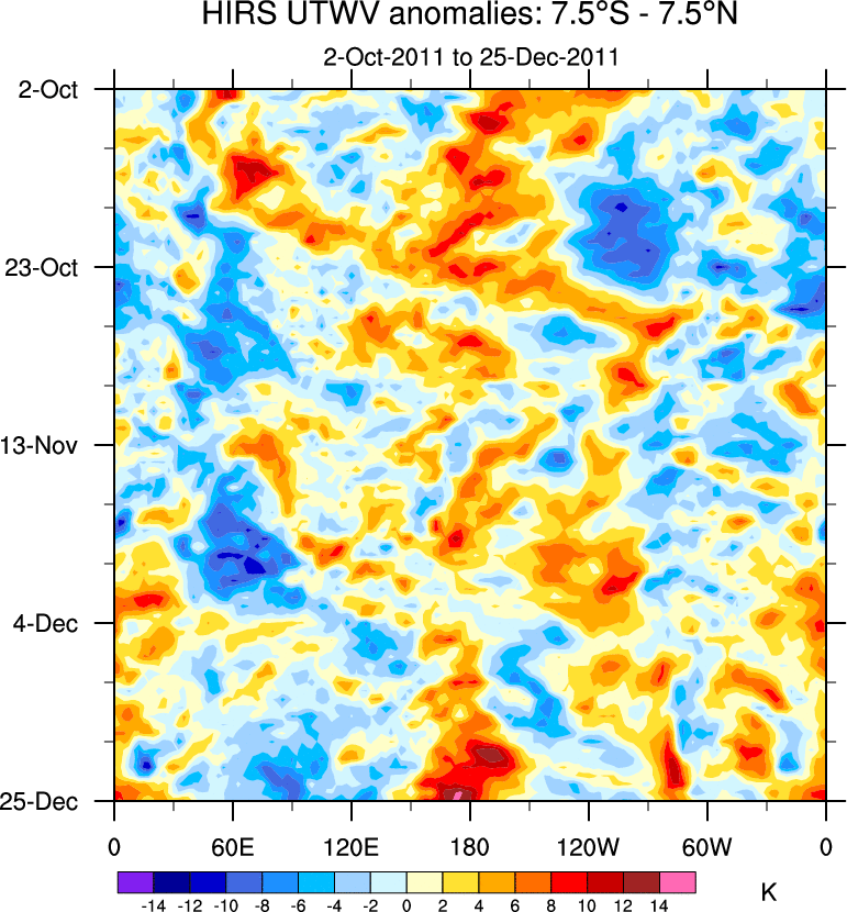 To identify tropical waves in near real-time, the OLR and UTWV data are filtered following Wheeler & Weickmann (2001 MWR). The daily anomalies are calculated using the first 3 harmonics of the seasonal cycle for 1979–2009. Missing values are then filled using linear interpolation in space and time. The most recent 365 days of anomalies are padded with 659 days of zeroes, and the result is filtered for each wave type.