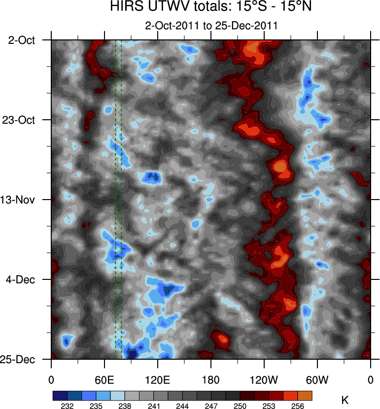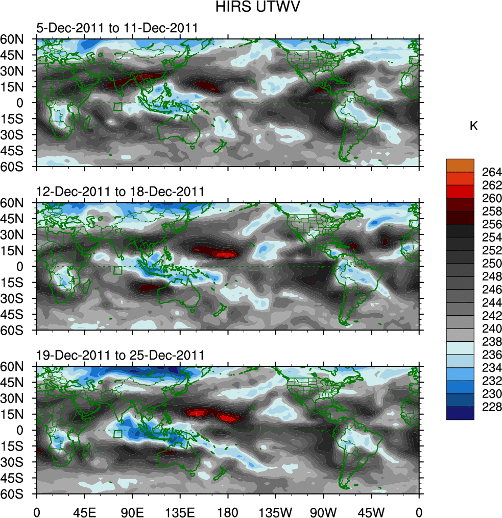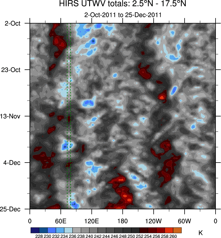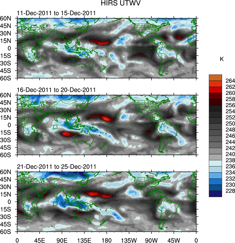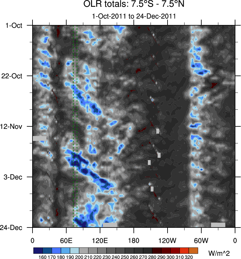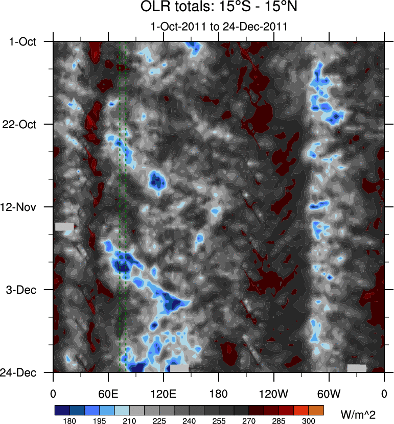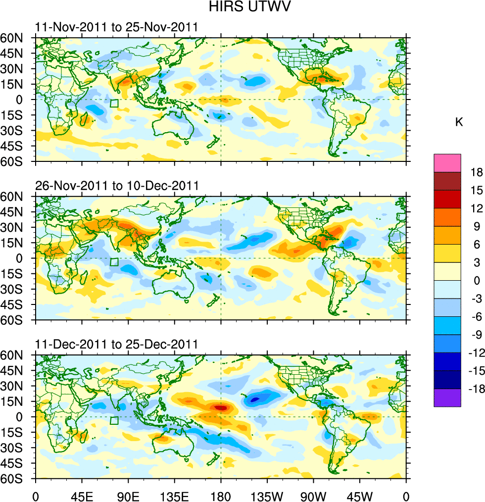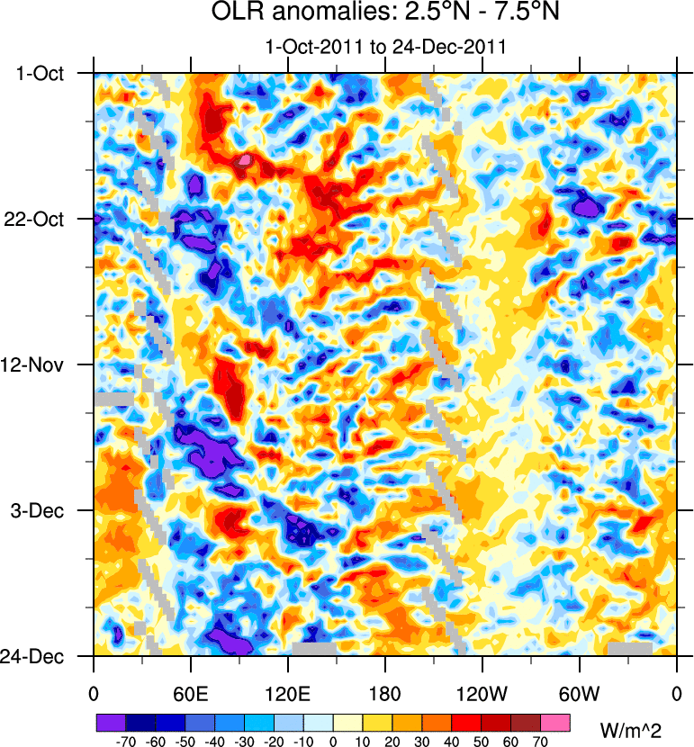 To identify tropical waves in near real-time, the OLR and UTWV data are filtered following Wheeler & Weickmann (2001 MWR). The daily anomalies are calculated using the first 3 harmonics of the seasonal cycle for 1979–2009. Missing values are then filled using linear interpolation in space and time. The most recent 365 days of anomalies are padded with 659 days of zeroes, and the result is filtered for each wave type.