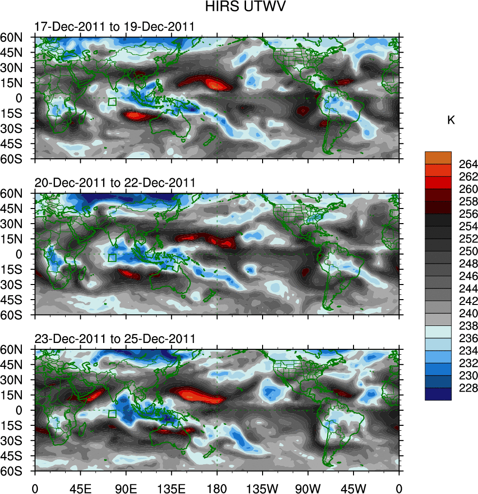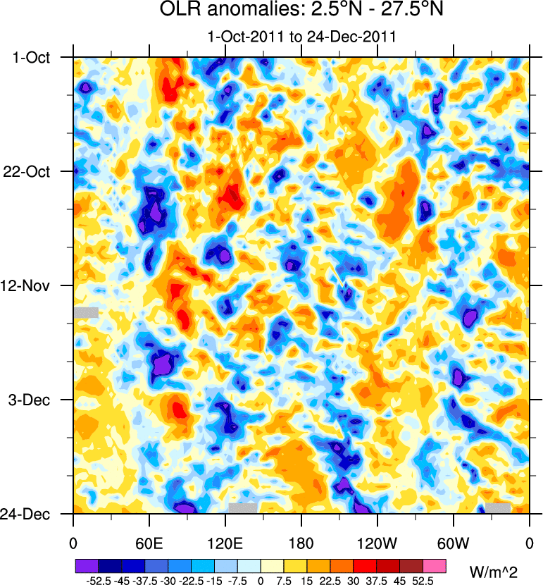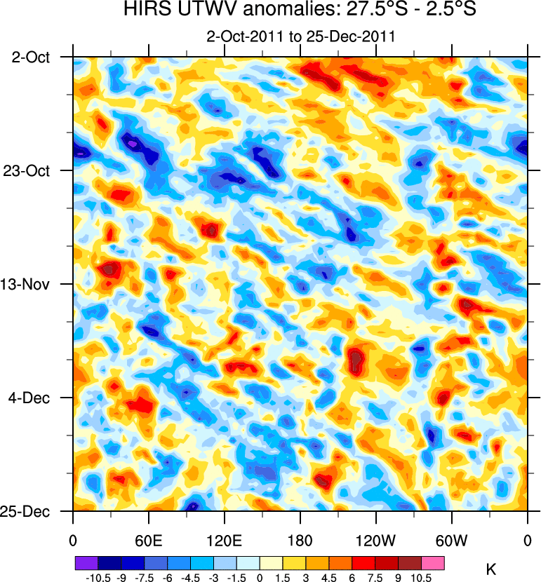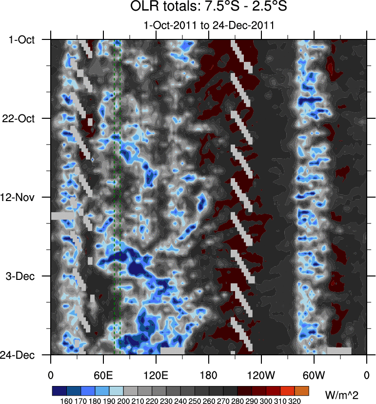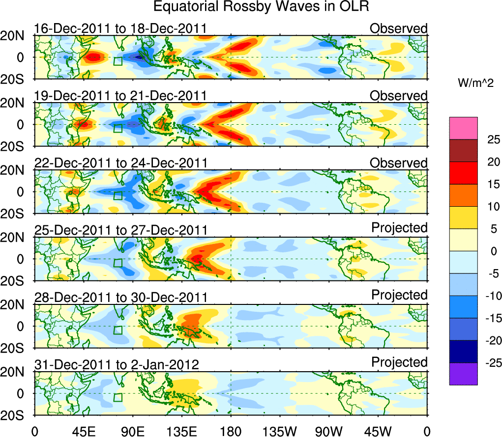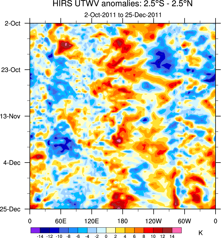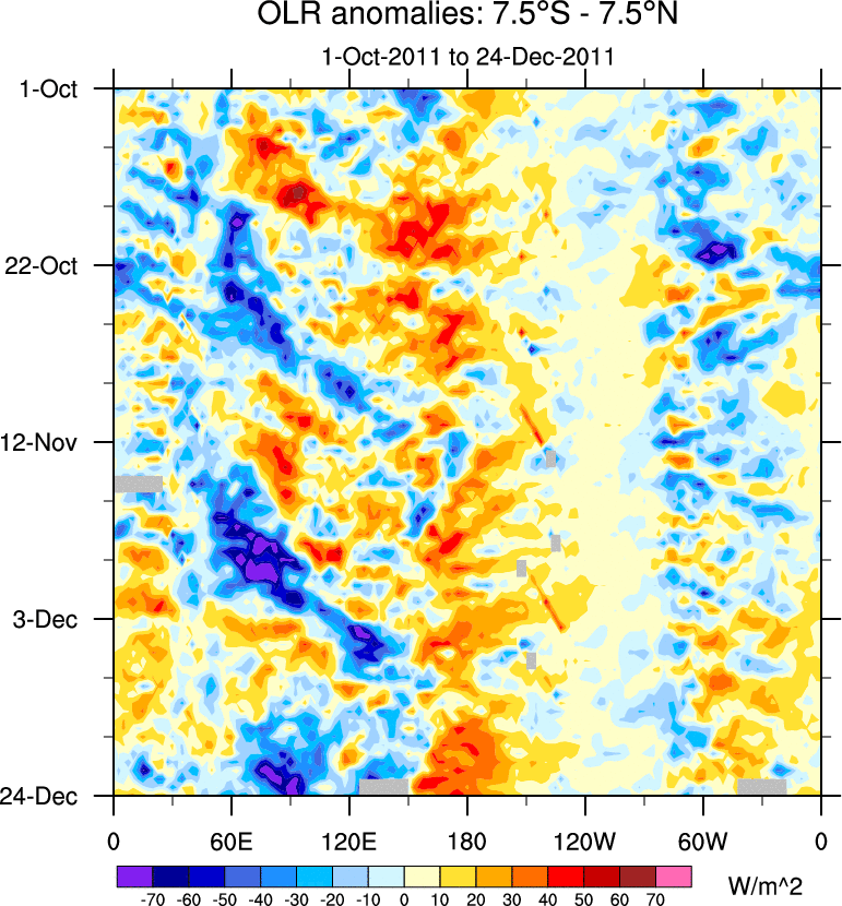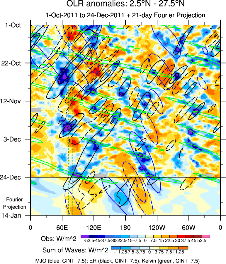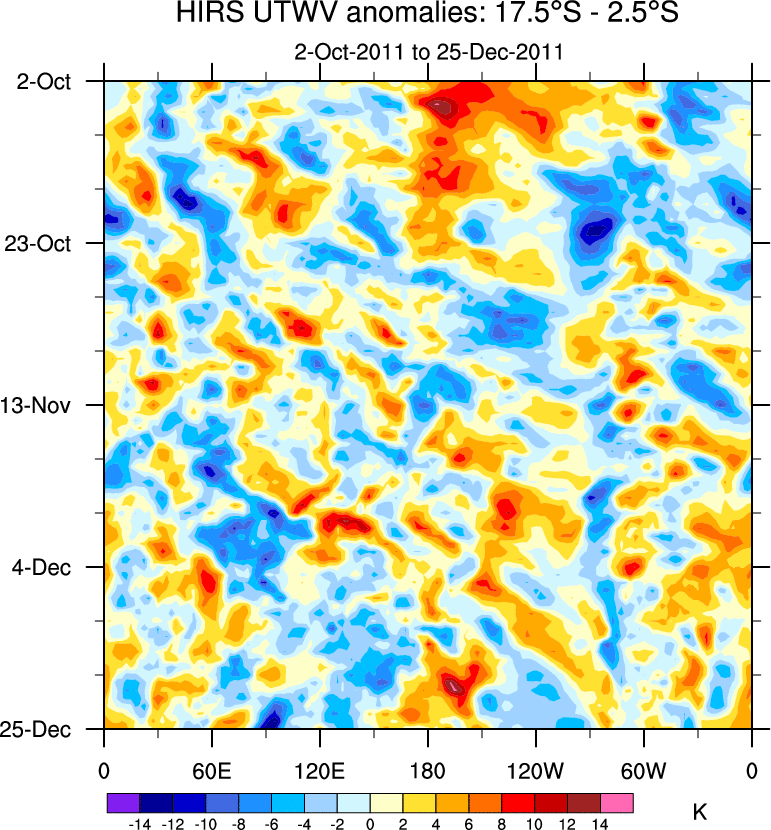 To identify tropical waves in near real-time, the OLR and UTWV data are filtered following Wheeler & Weickmann (2001 MWR). The daily anomalies are calculated using the first 3 harmonics of the seasonal cycle for 1979–2009. Missing values are then filled using linear interpolation in space and time. The most recent 365 days of anomalies are padded with 659 days of zeroes, and the result is filtered for each wave type.