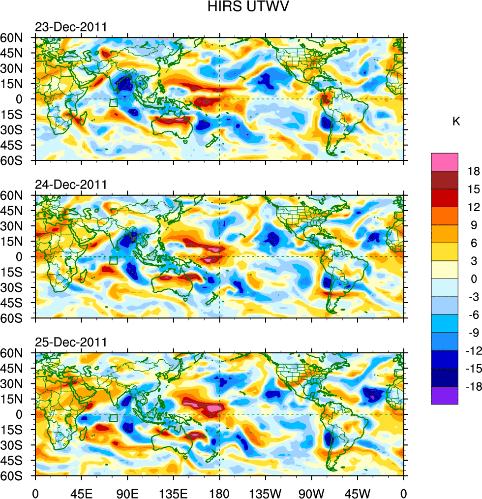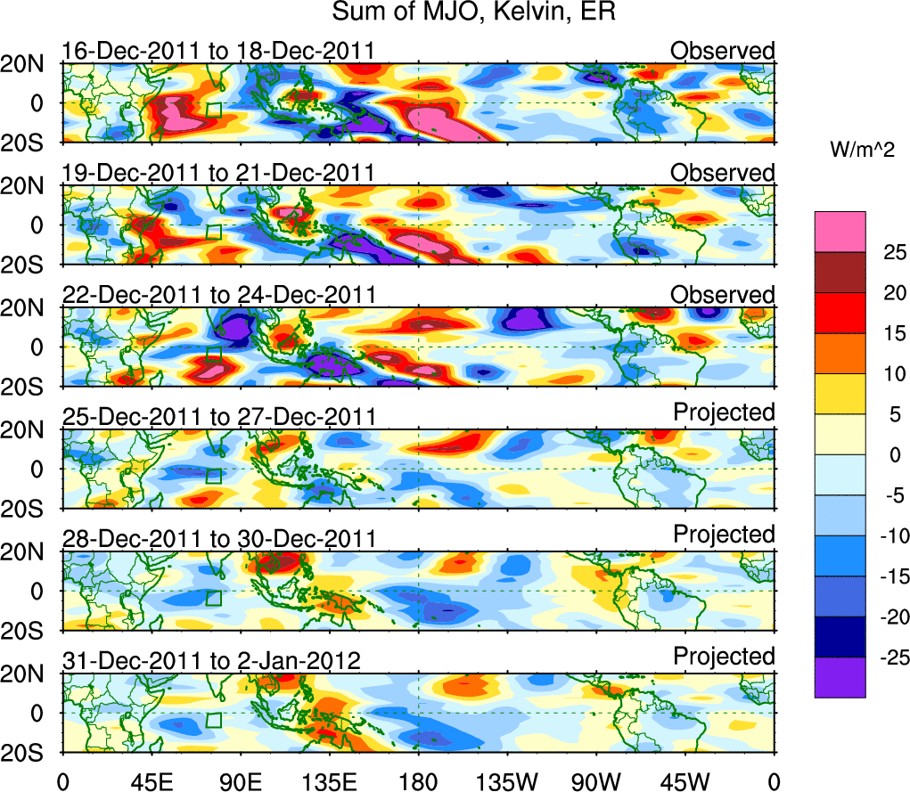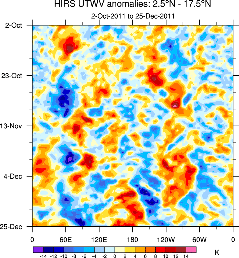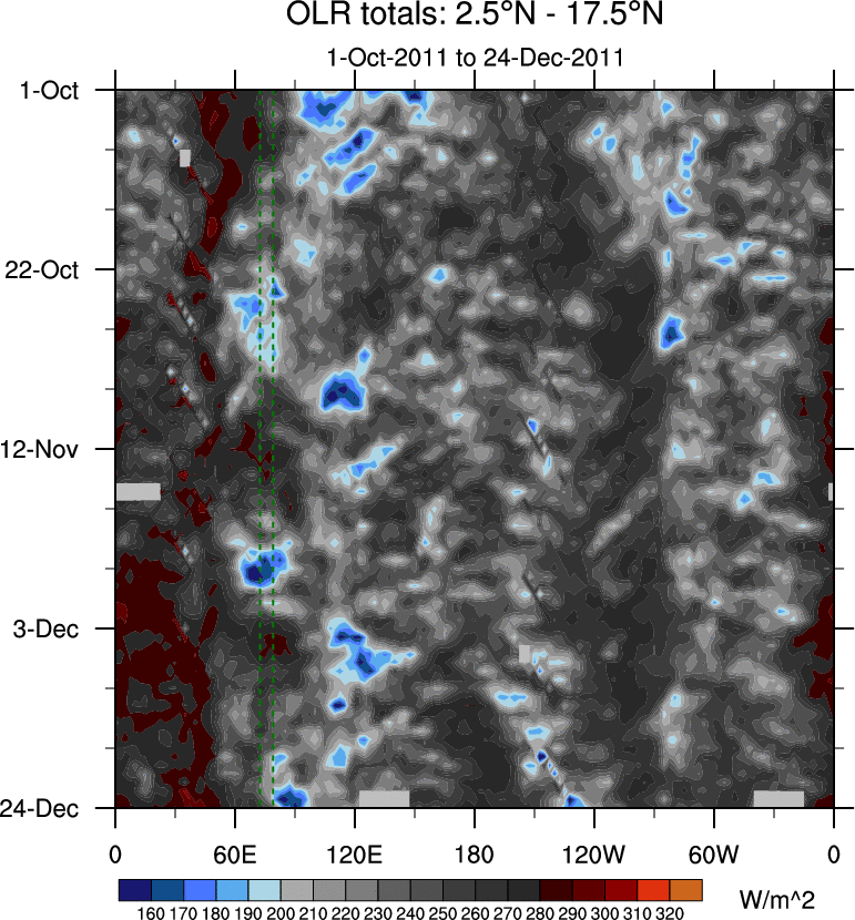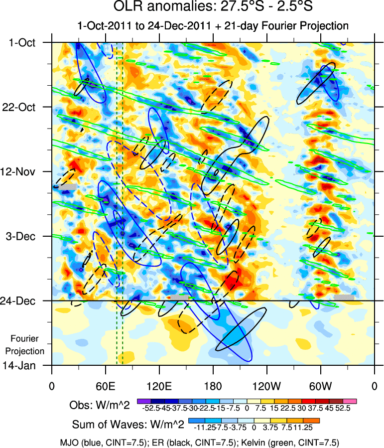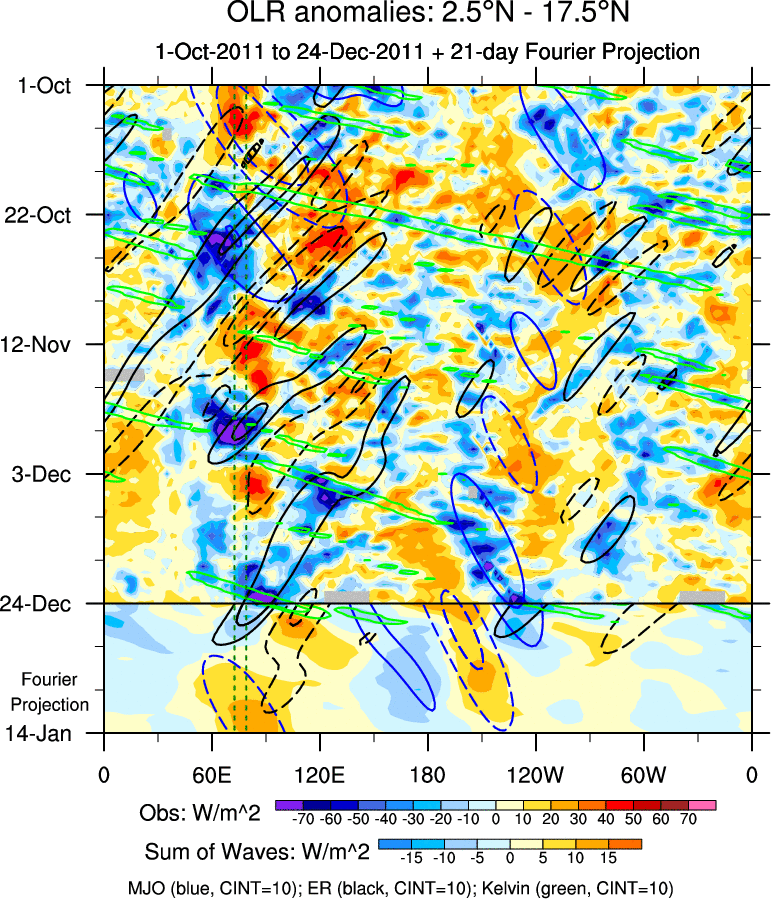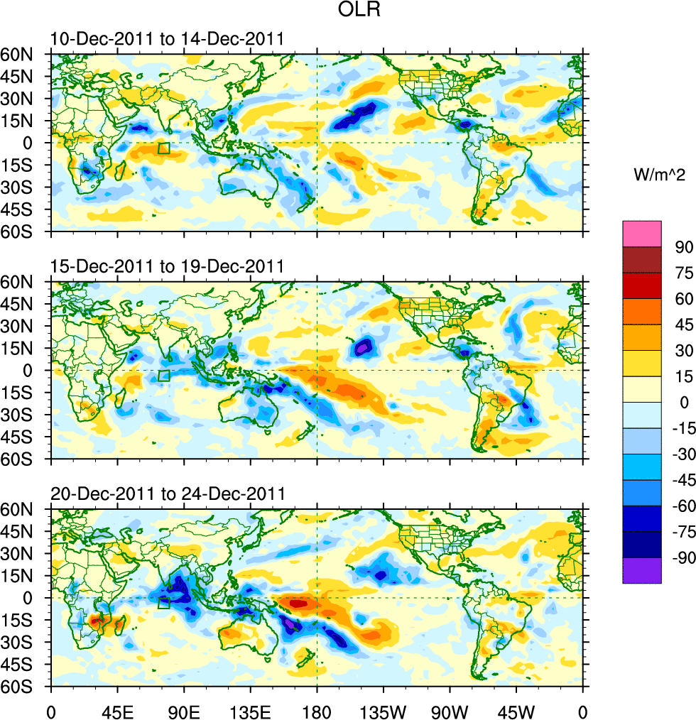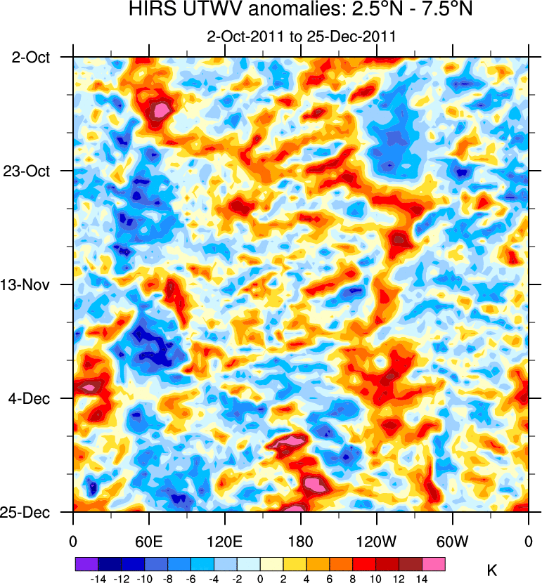 To identify tropical waves in near real-time, the OLR and UTWV data are filtered following Wheeler & Weickmann (2001 MWR). The daily anomalies are calculated using the first 3 harmonics of the seasonal cycle for 1979–2009. Missing values are then filled using linear interpolation in space and time. The most recent 365 days of anomalies are padded with 659 days of zeroes, and the result is filtered for each wave type.