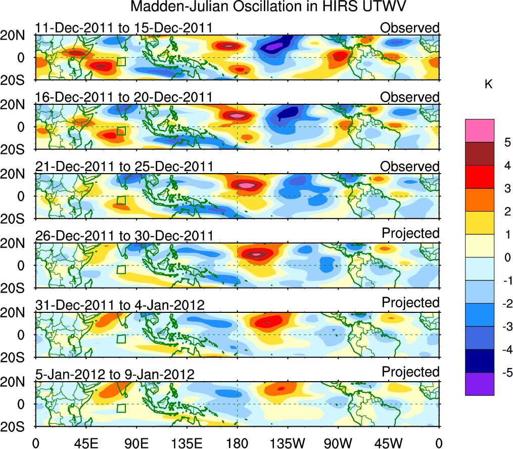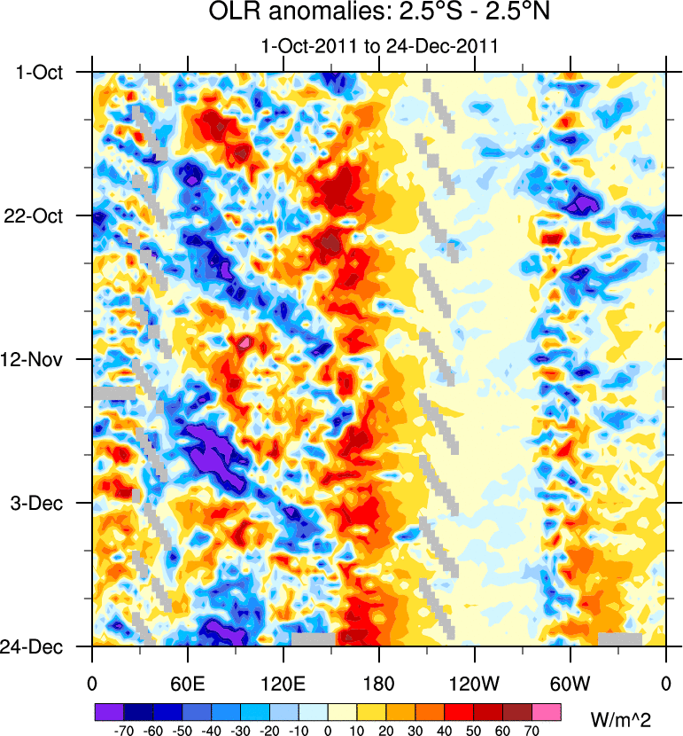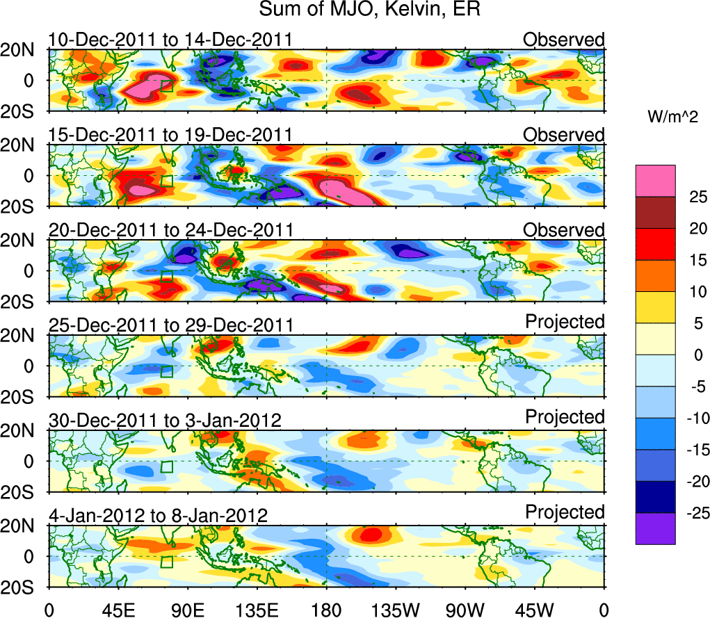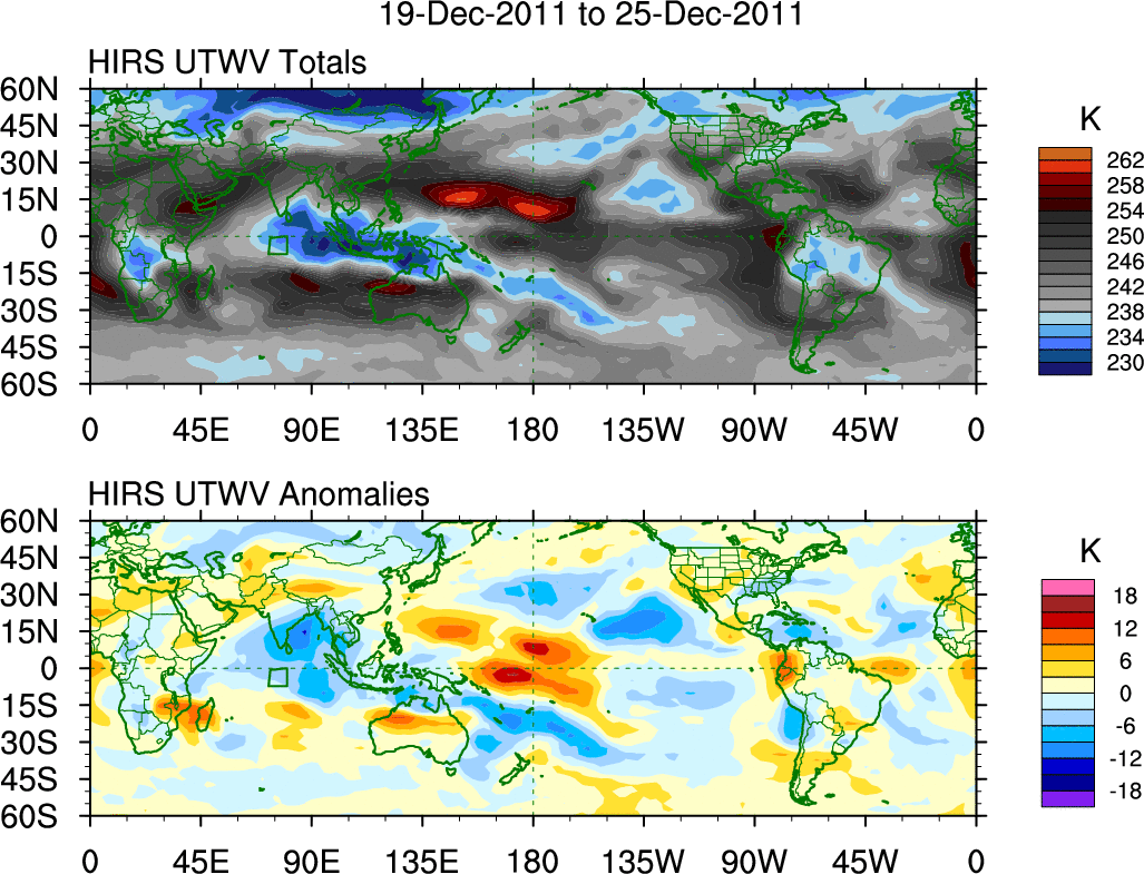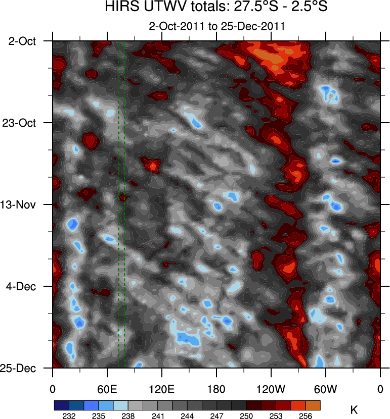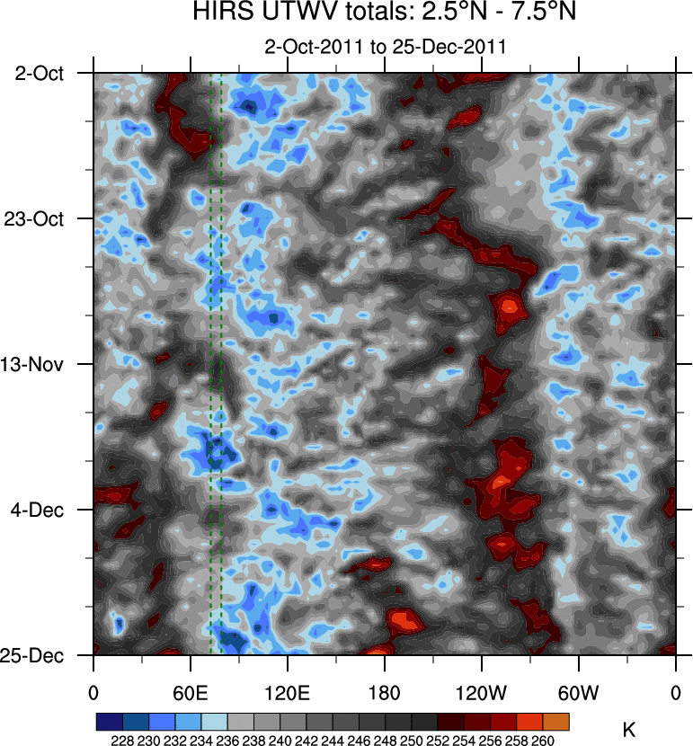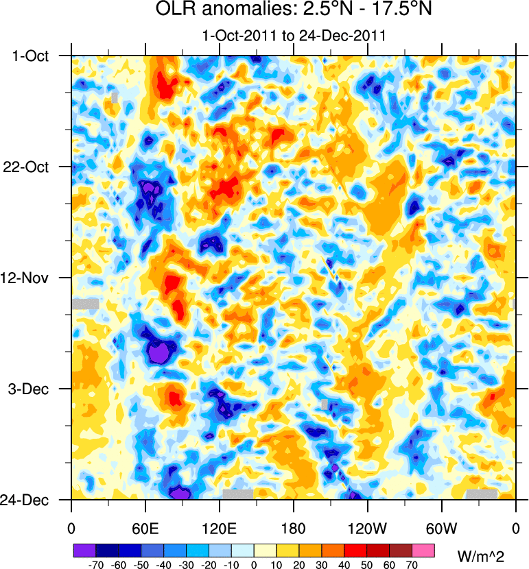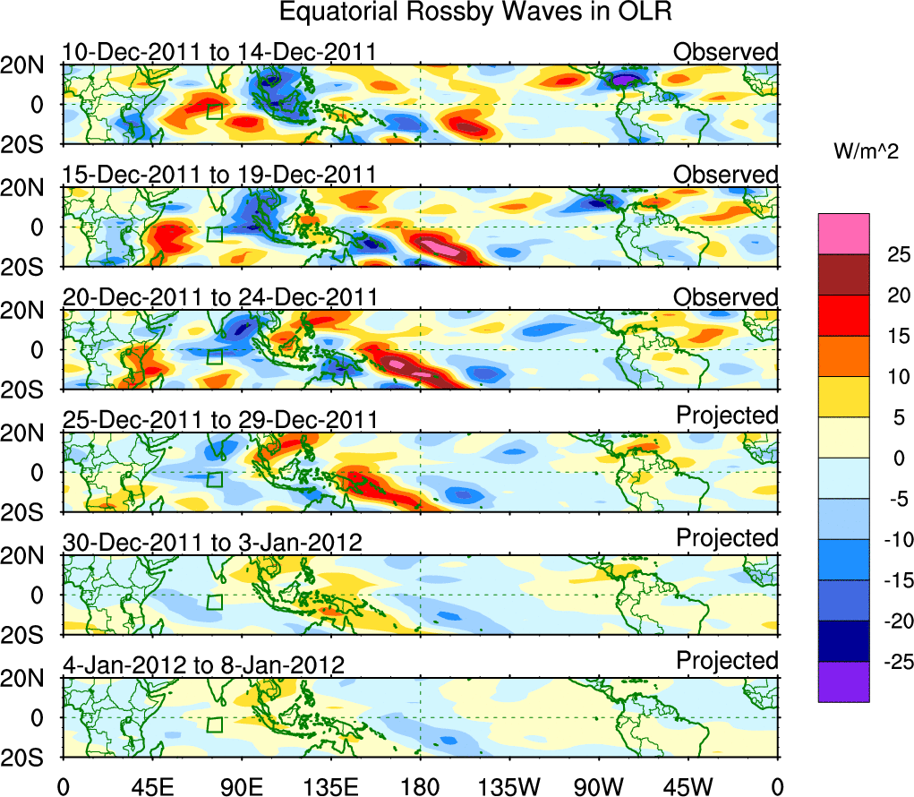 To identify tropical waves in near real-time, the OLR and UTWV data are filtered following Wheeler & Weickmann (2001 MWR). The daily anomalies are calculated using the first 3 harmonics of the seasonal cycle for 1979–2009. Missing values are then filled using linear interpolation in space and time. The most recent 365 days of anomalies are padded with 659 days of zeroes, and the result is filtered for each wave type.