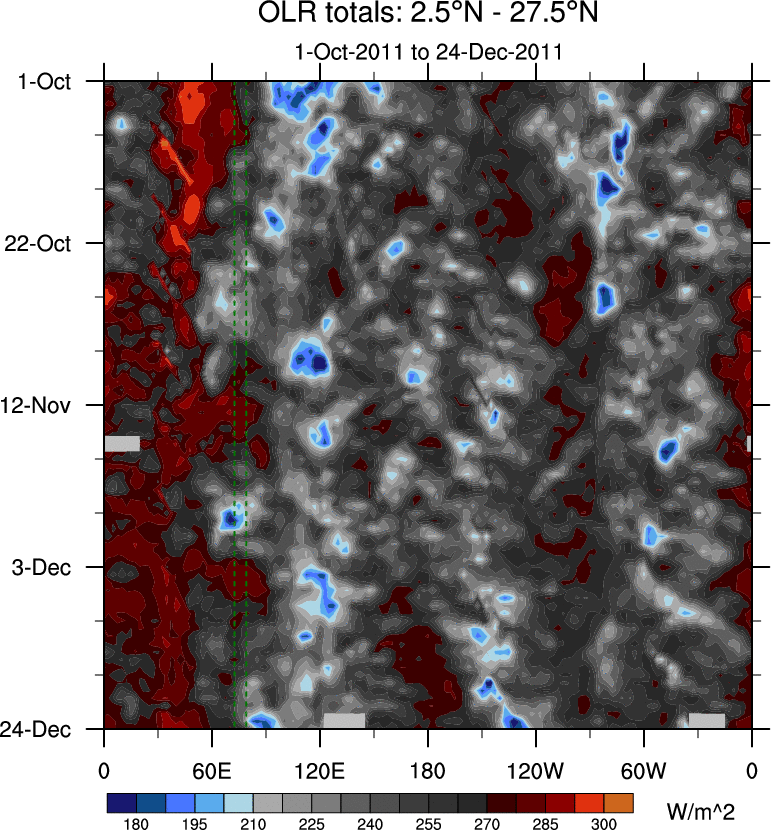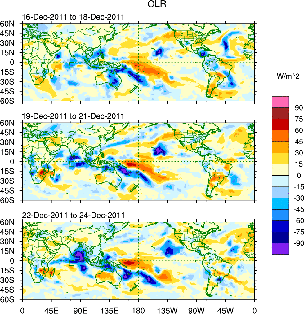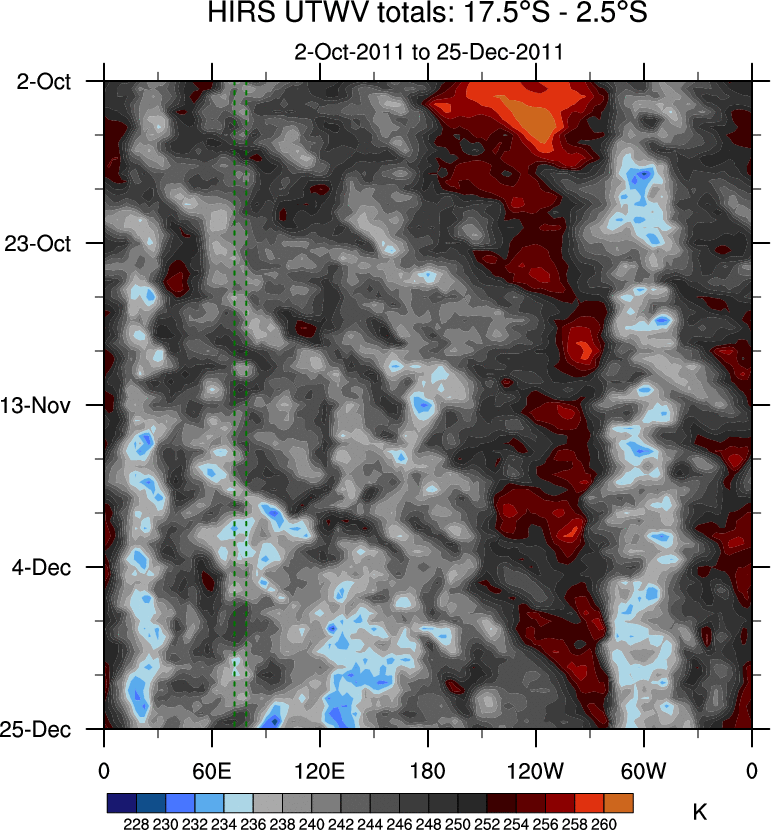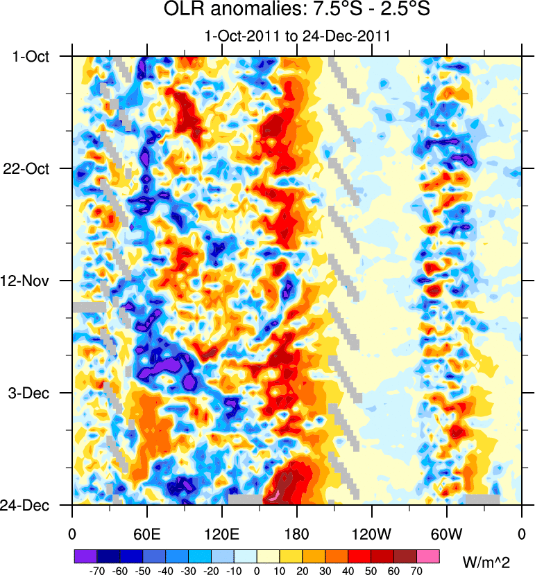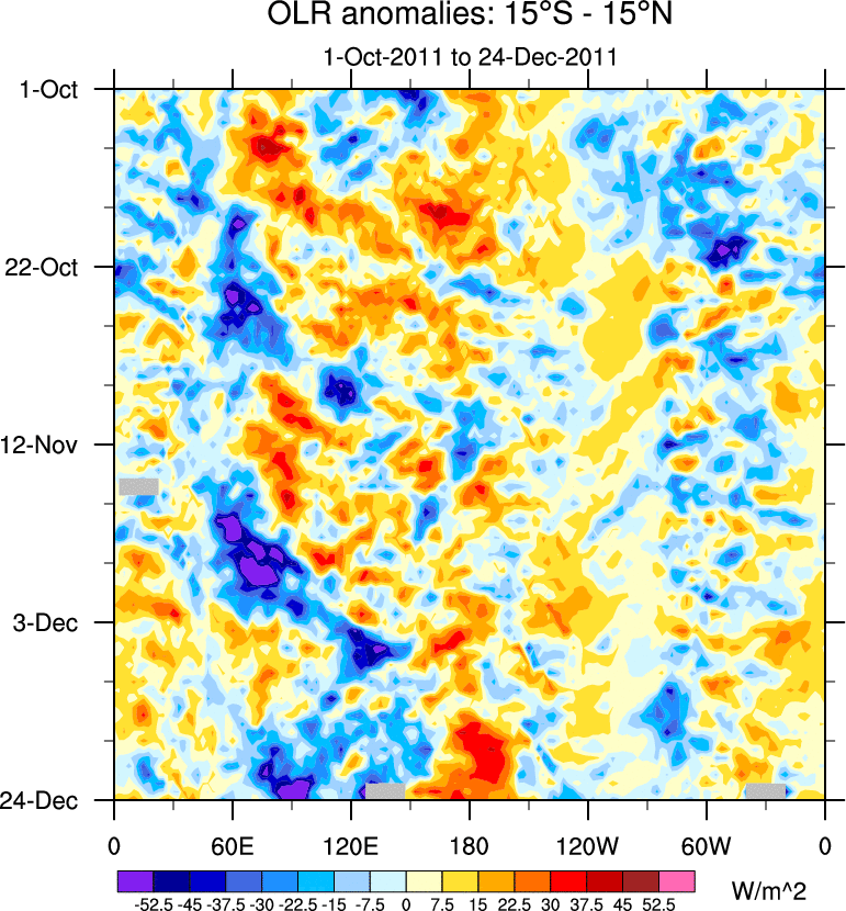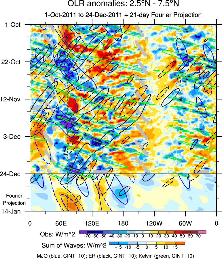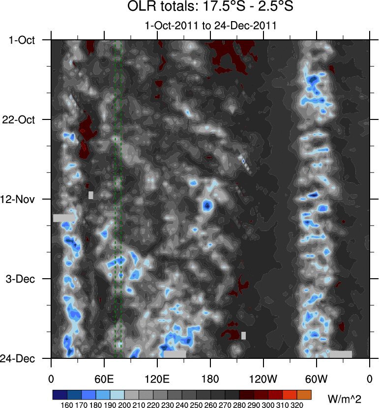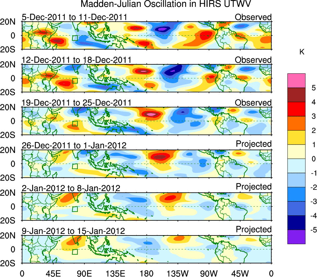 To identify tropical waves in near real-time, the OLR and UTWV data are filtered following Wheeler & Weickmann (2001 MWR). The daily anomalies are calculated using the first 3 harmonics of the seasonal cycle for 1979–2009. Missing values are then filled using linear interpolation in space and time. The most recent 365 days of anomalies are padded with 659 days of zeroes, and the result is filtered for each wave type.