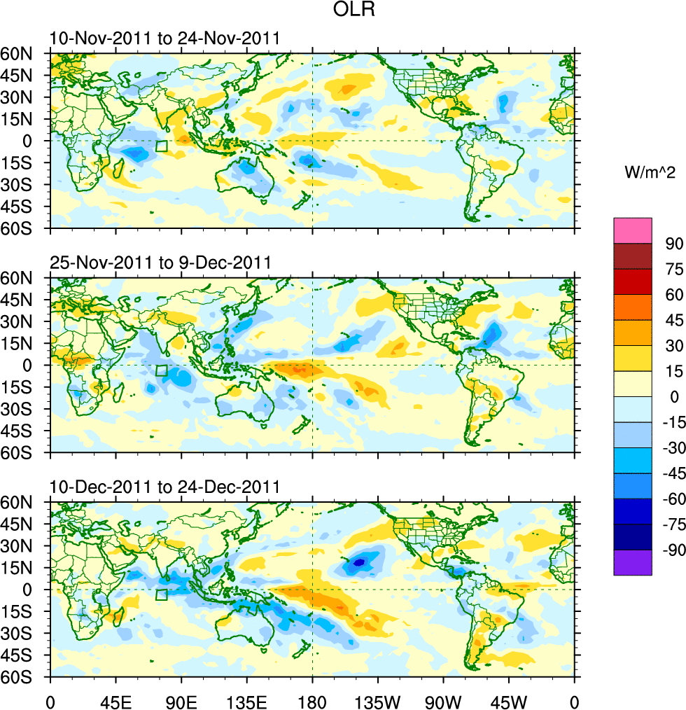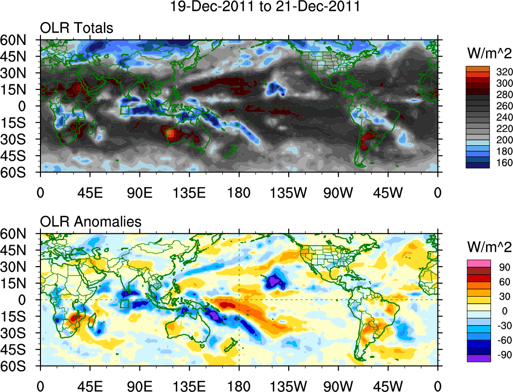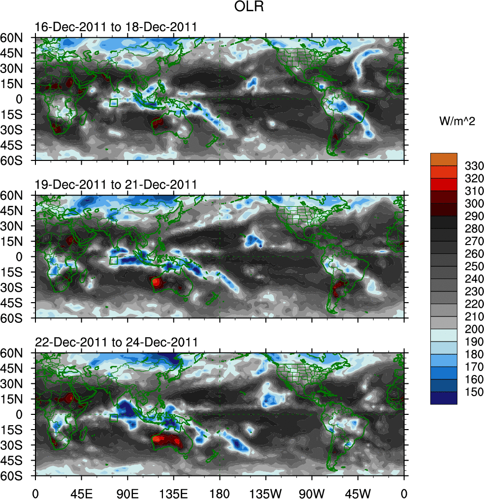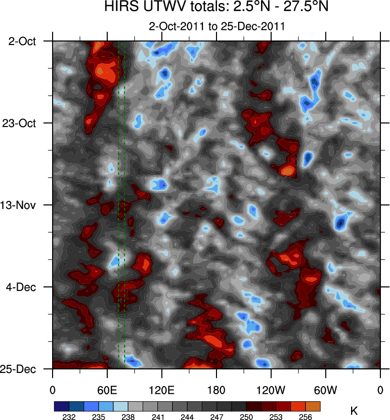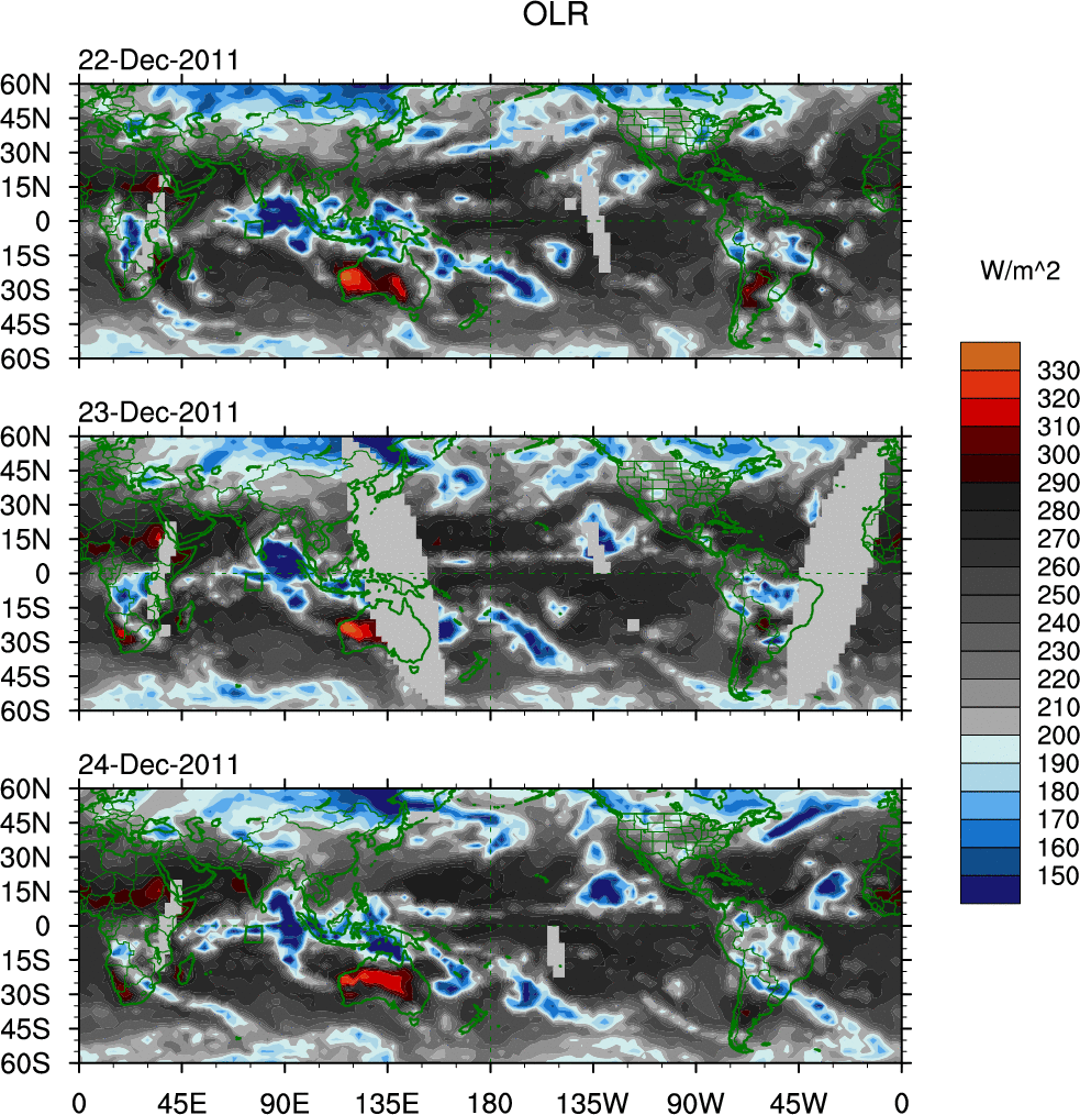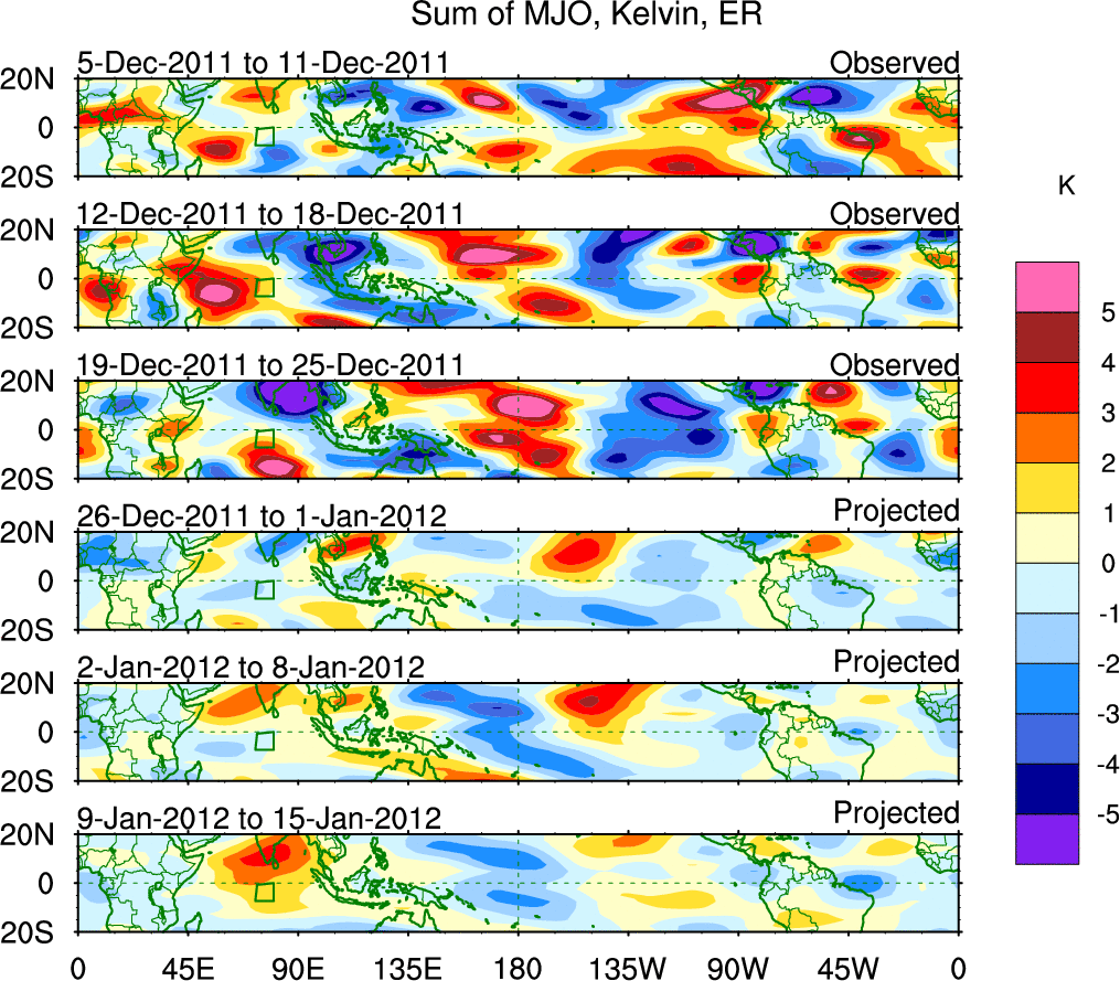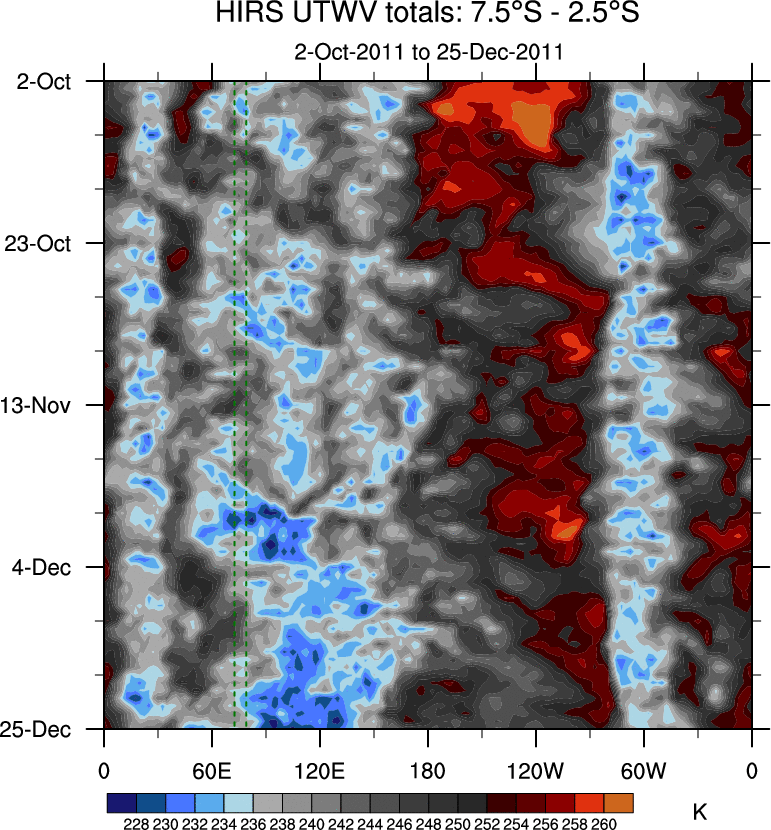 To identify tropical waves in near real-time, the OLR and UTWV data are filtered following Wheeler & Weickmann (2001 MWR). The daily anomalies are calculated using the first 3 harmonics of the seasonal cycle for 1979–2009. Missing values are then filled using linear interpolation in space and time. The most recent 365 days of anomalies are padded with 659 days of zeroes, and the result is filtered for each wave type.