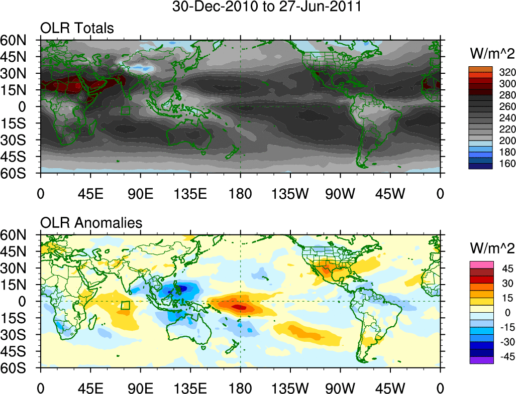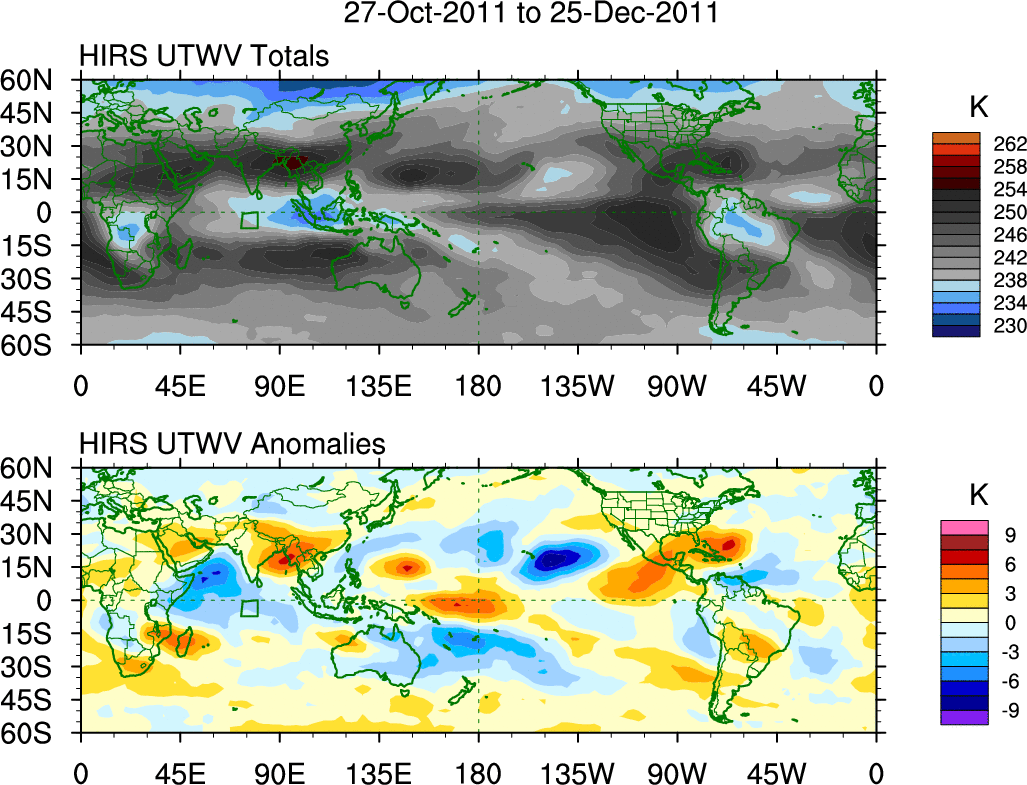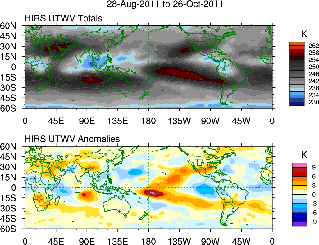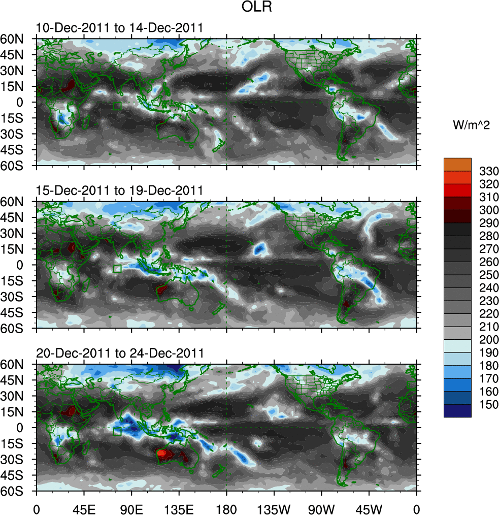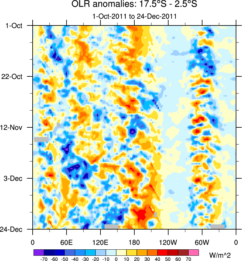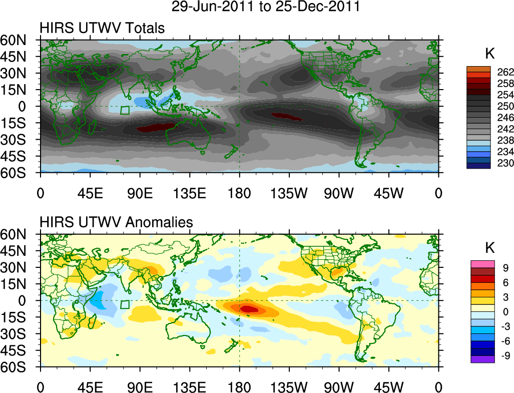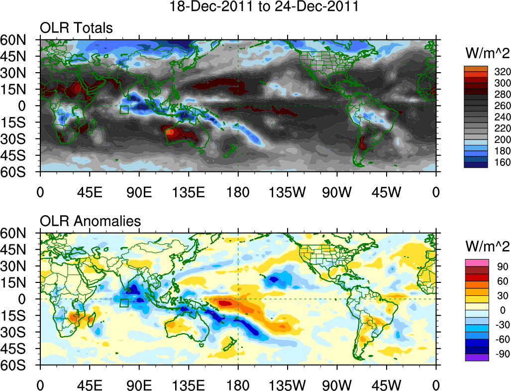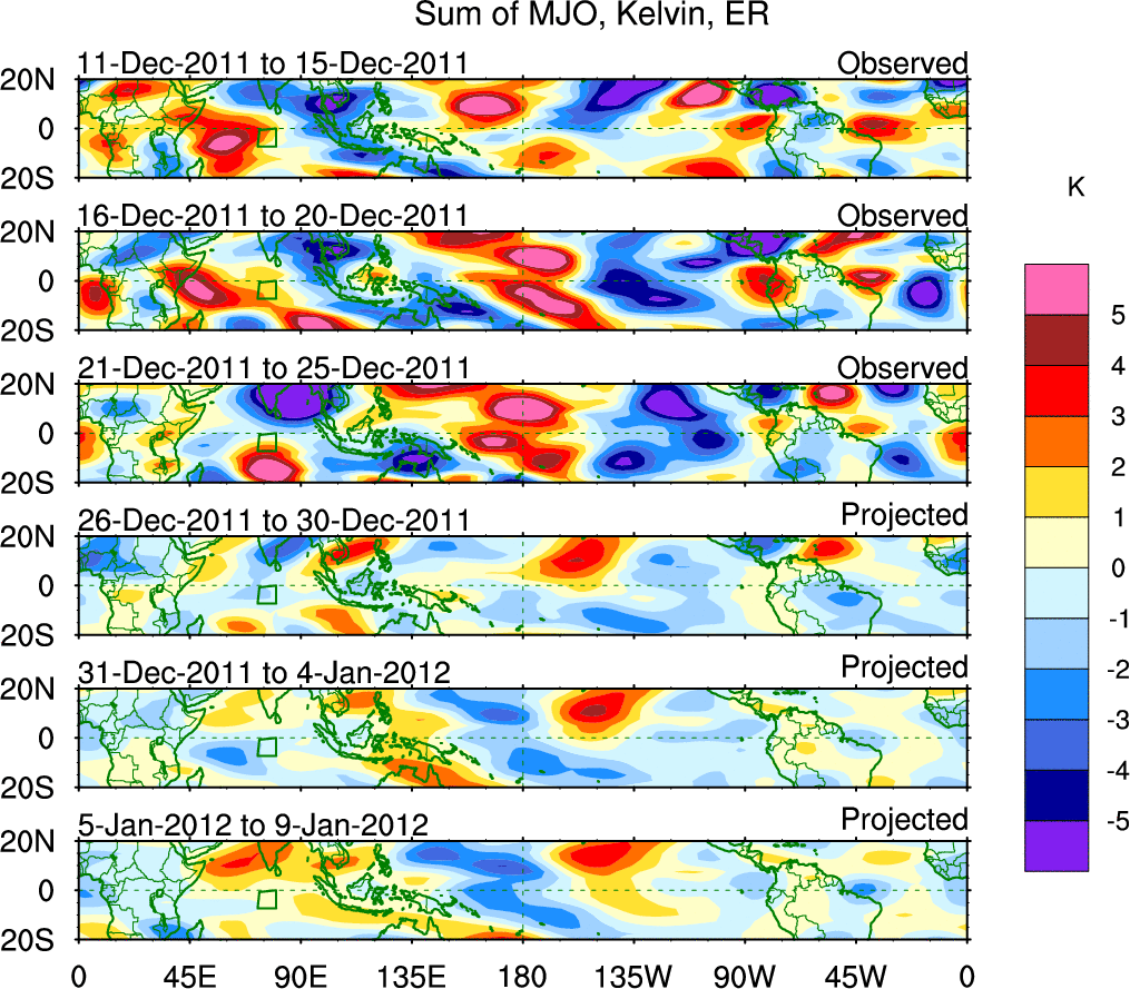 To identify tropical waves in near real-time, the OLR and UTWV data are filtered following Wheeler & Weickmann (2001 MWR). The daily anomalies are calculated using the first 3 harmonics of the seasonal cycle for 1979–2009. Missing values are then filled using linear interpolation in space and time. The most recent 365 days of anomalies are padded with 659 days of zeroes, and the result is filtered for each wave type.