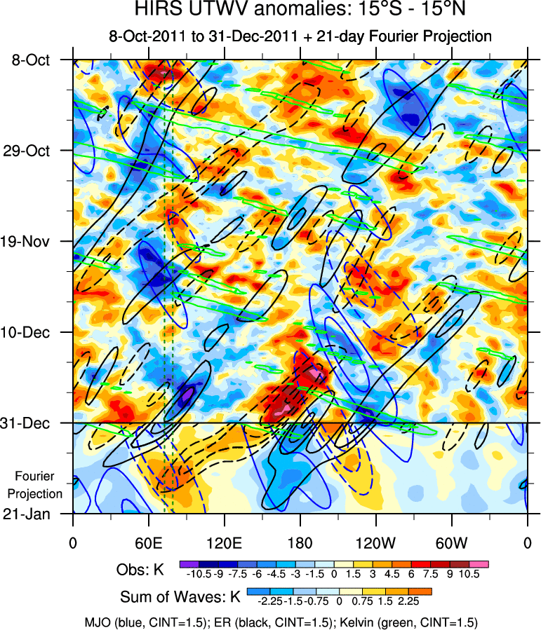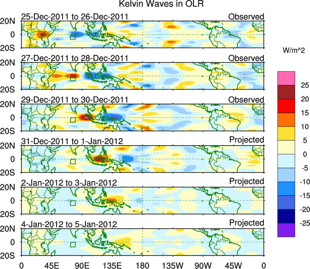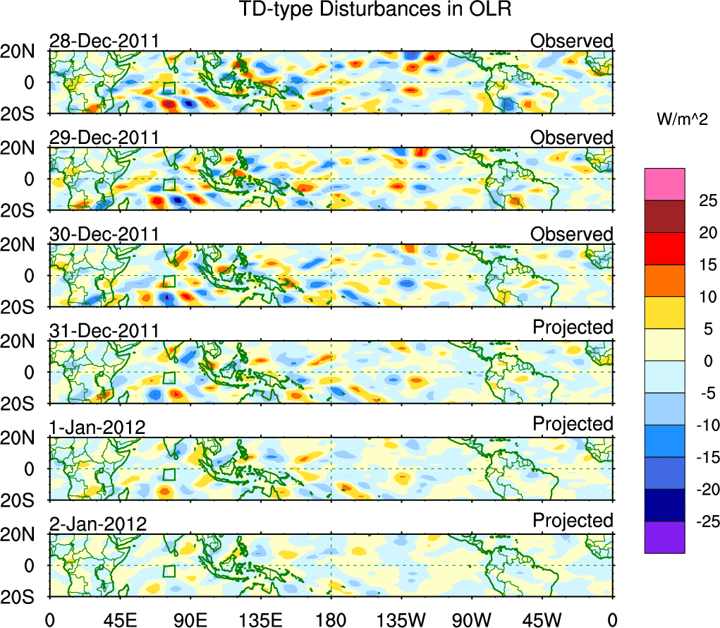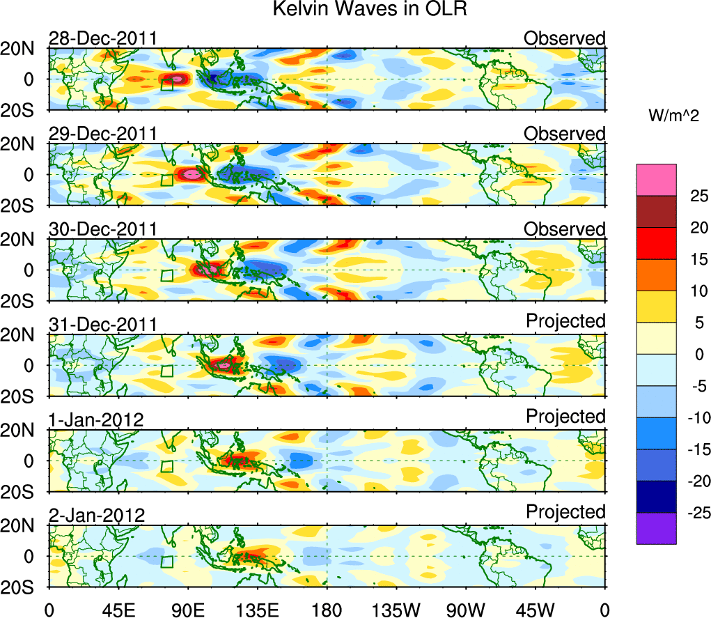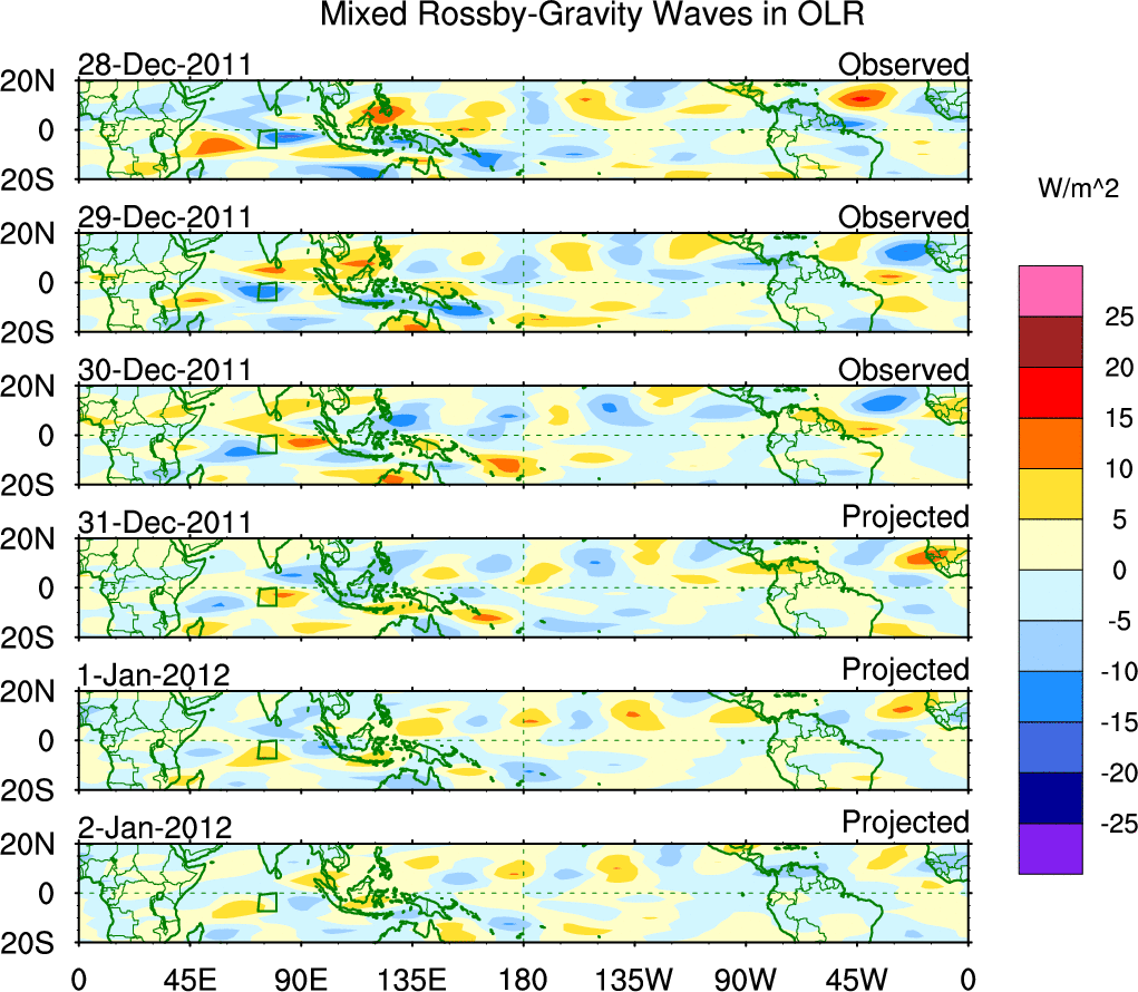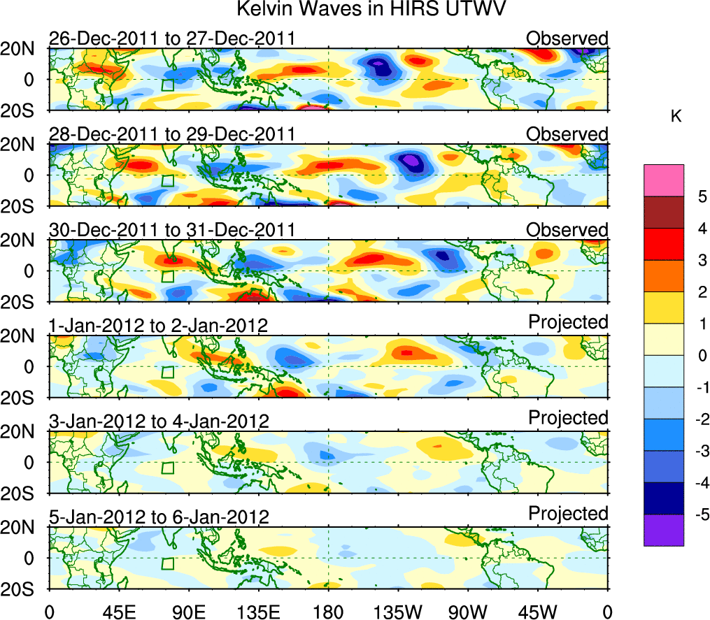 To identify tropical waves in near real-time, the OLR and UTWV data are filtered following Wheeler & Weickmann (2001 MWR). The daily anomalies are calculated using the first 3 harmonics of the seasonal cycle for 1979–2009. Missing values are then filled using linear interpolation in space and time. The most recent 365 days of anomalies are padded with 659 days of zeroes, and the result is filtered for each wave type.