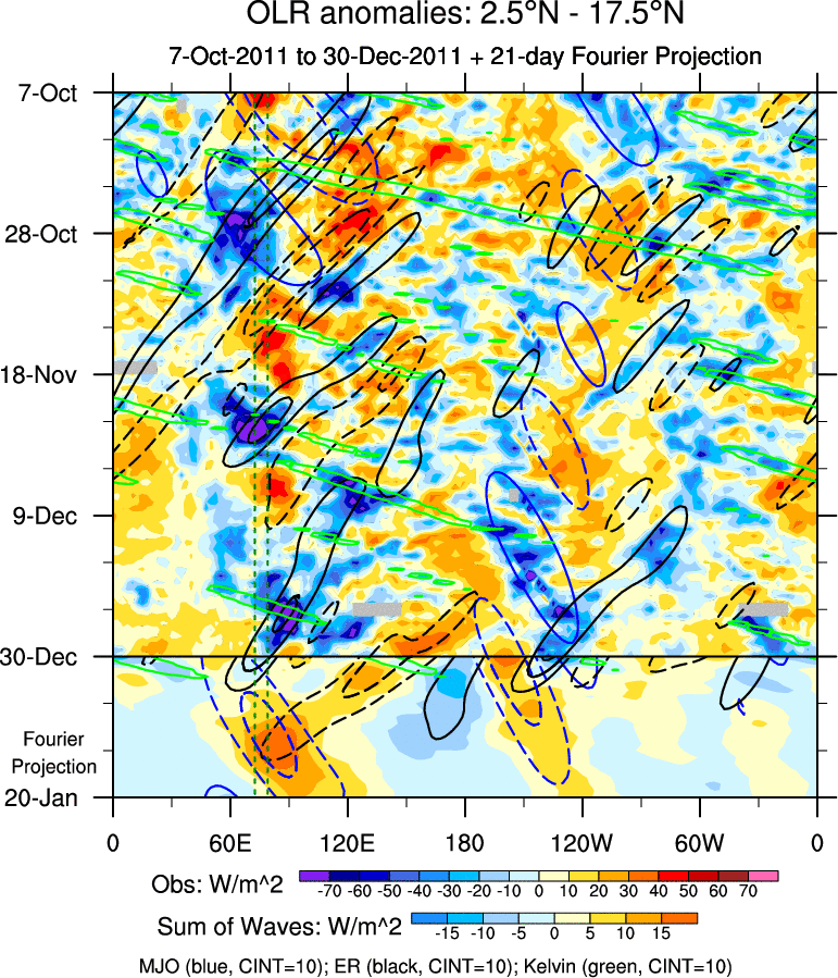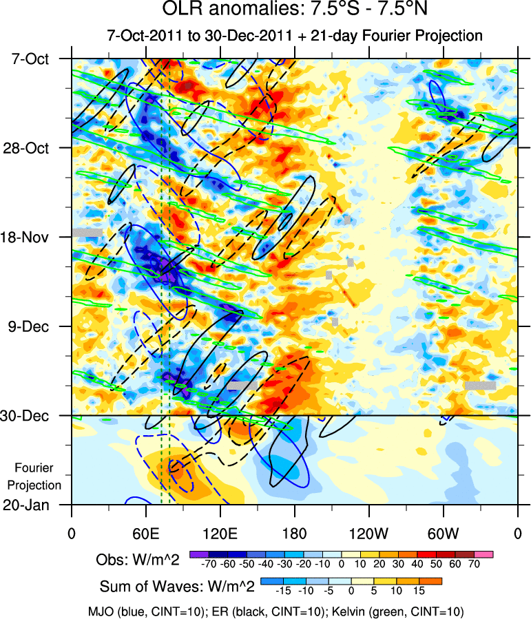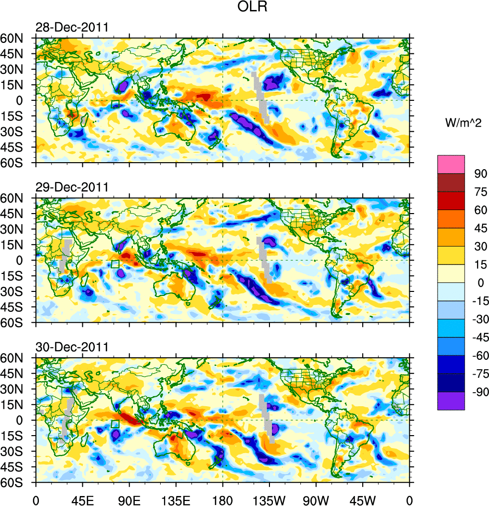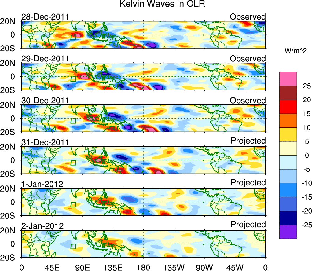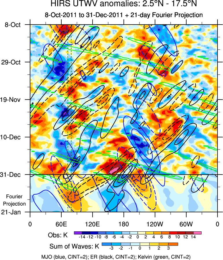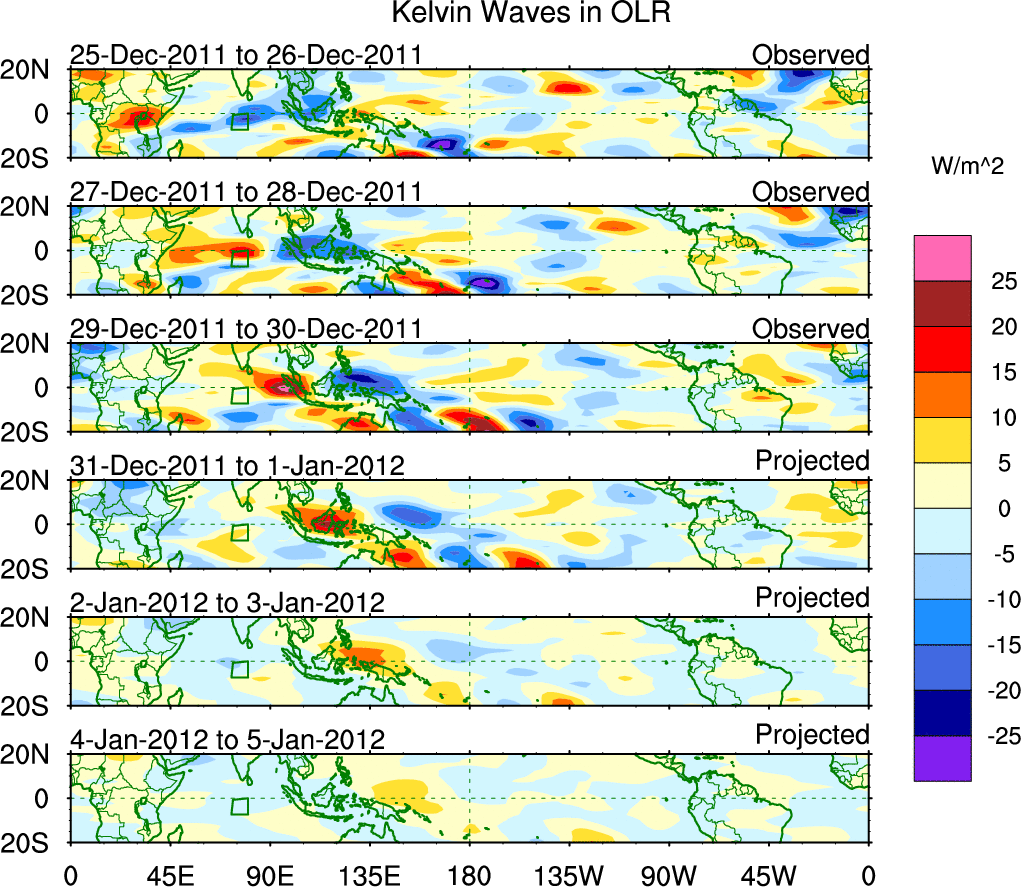 To identify tropical waves in near real-time, the OLR and UTWV data are filtered following Wheeler & Weickmann (2001 MWR). The daily anomalies are calculated using the first 3 harmonics of the seasonal cycle for 1979–2009. Missing values are then filled using linear interpolation in space and time. The most recent 365 days of anomalies are padded with 659 days of zeroes, and the result is filtered for each wave type.
