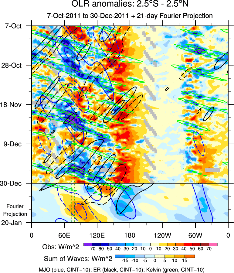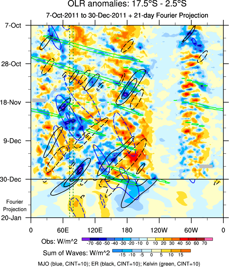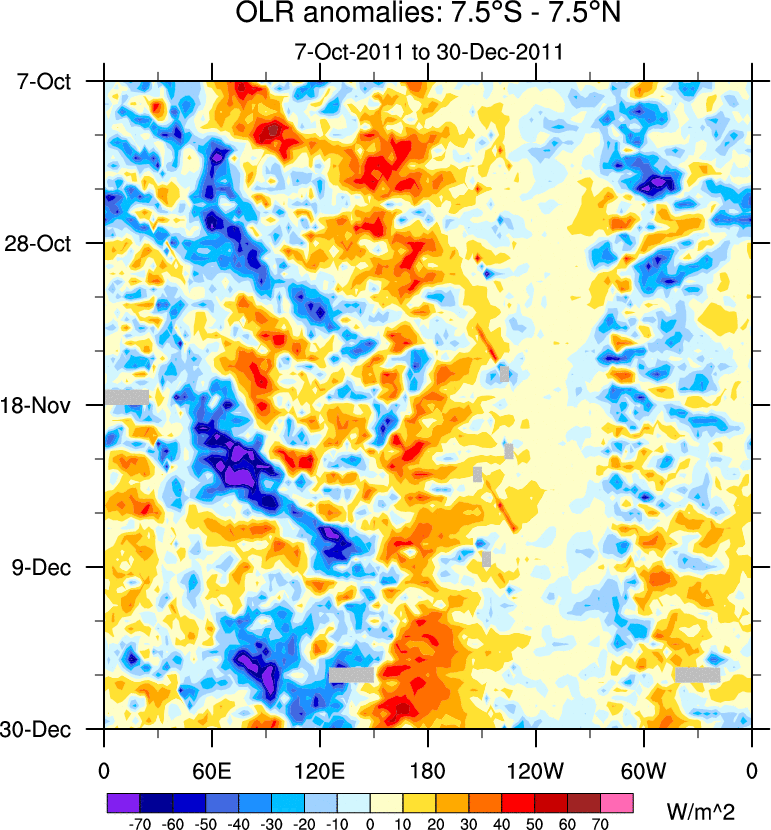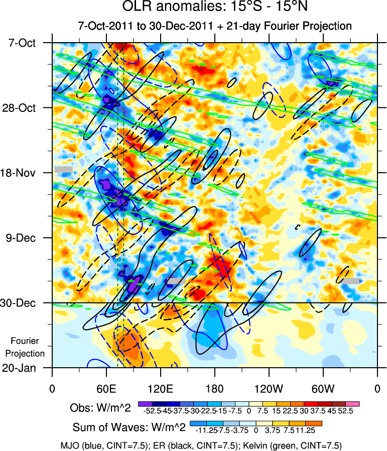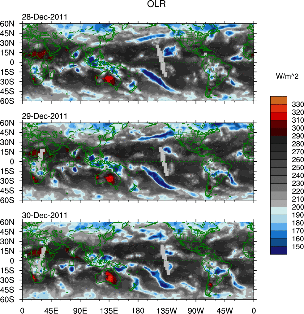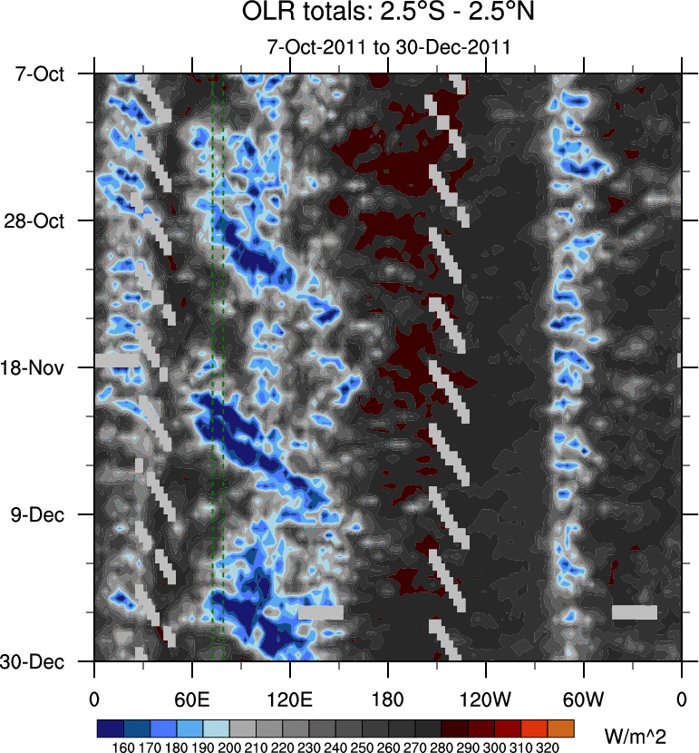 To identify tropical waves in near real-time, the OLR and UTWV data are filtered following Wheeler & Weickmann (2001 MWR). The daily anomalies are calculated using the first 3 harmonics of the seasonal cycle for 1979–2009. Missing values are then filled using linear interpolation in space and time. The most recent 365 days of anomalies are padded with 659 days of zeroes, and the result is filtered for each wave type.