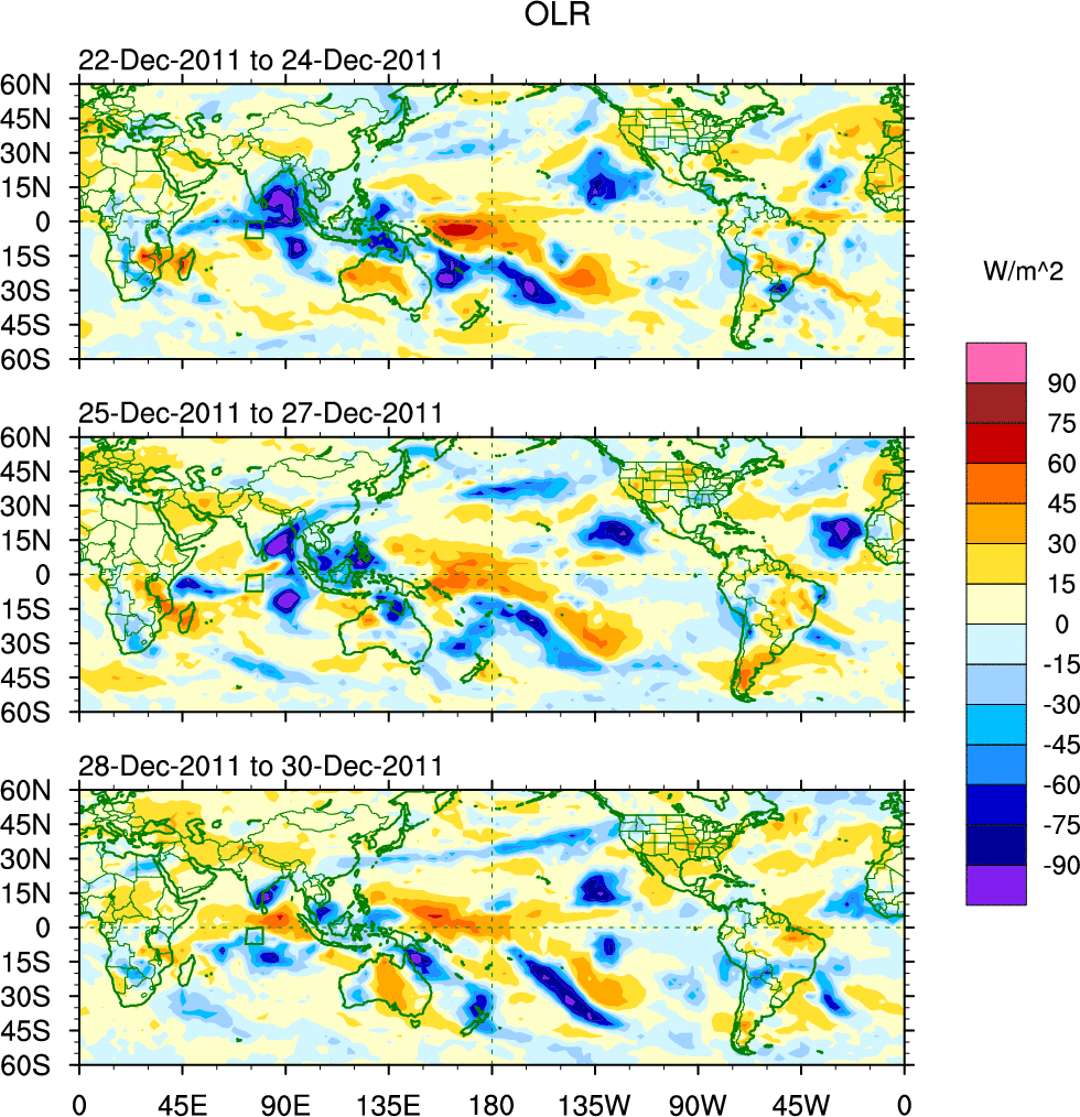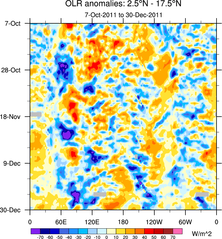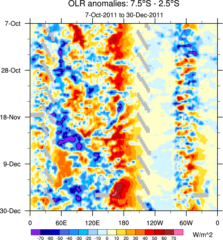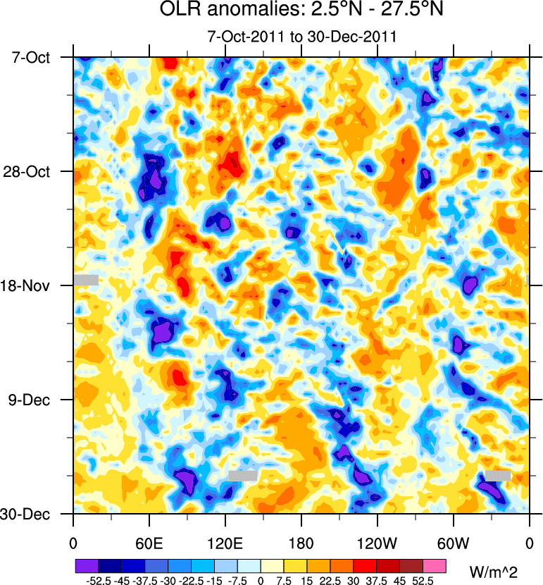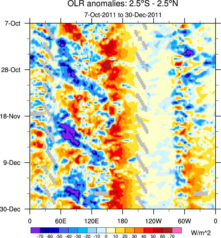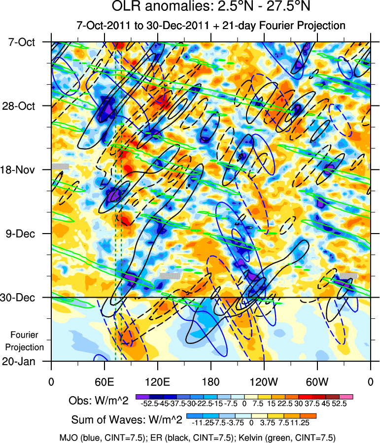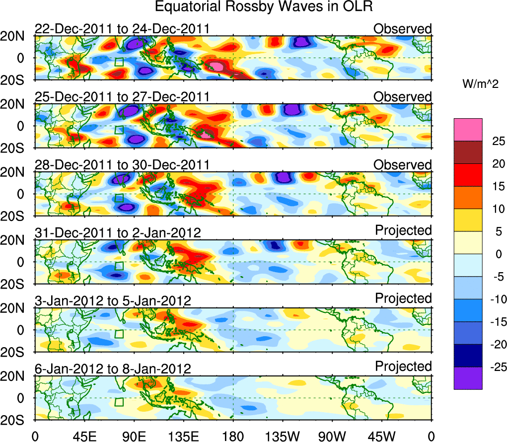 To identify tropical waves in near real-time, the OLR and UTWV data are filtered following Wheeler & Weickmann (2001 MWR). The daily anomalies are calculated using the first 3 harmonics of the seasonal cycle for 1979–2009. Missing values are then filled using linear interpolation in space and time. The most recent 365 days of anomalies are padded with 659 days of zeroes, and the result is filtered for each wave type.