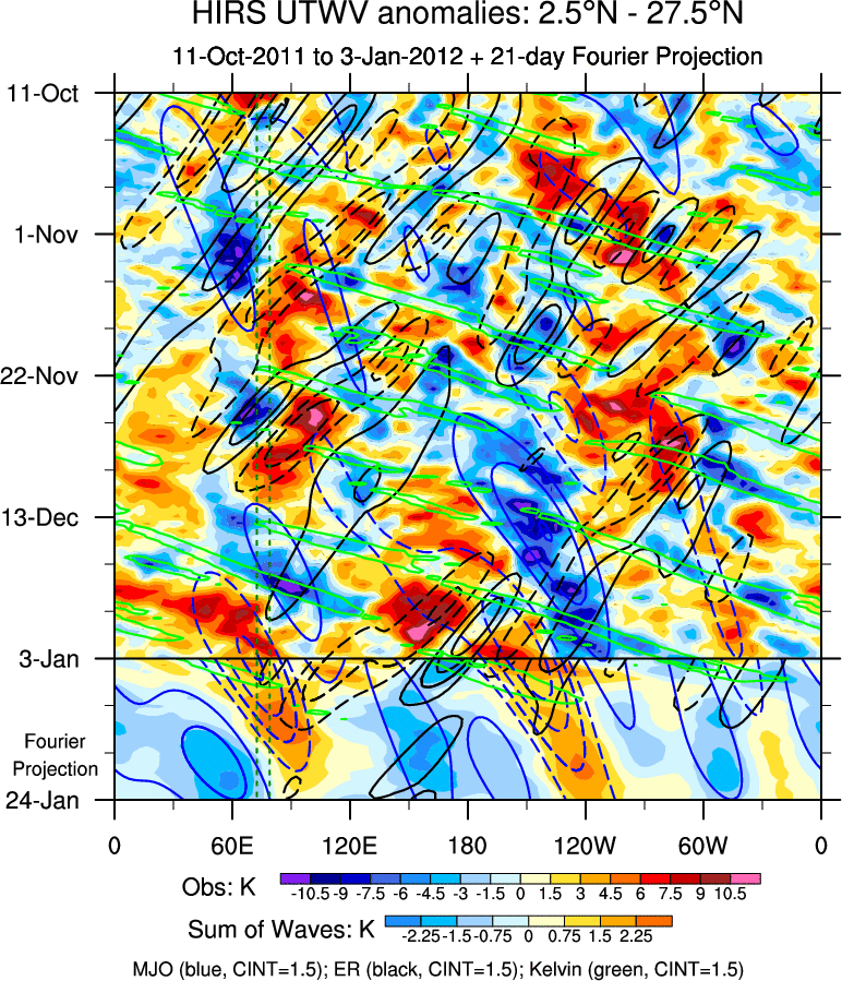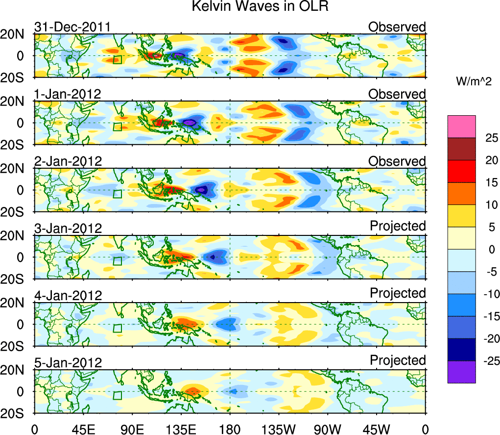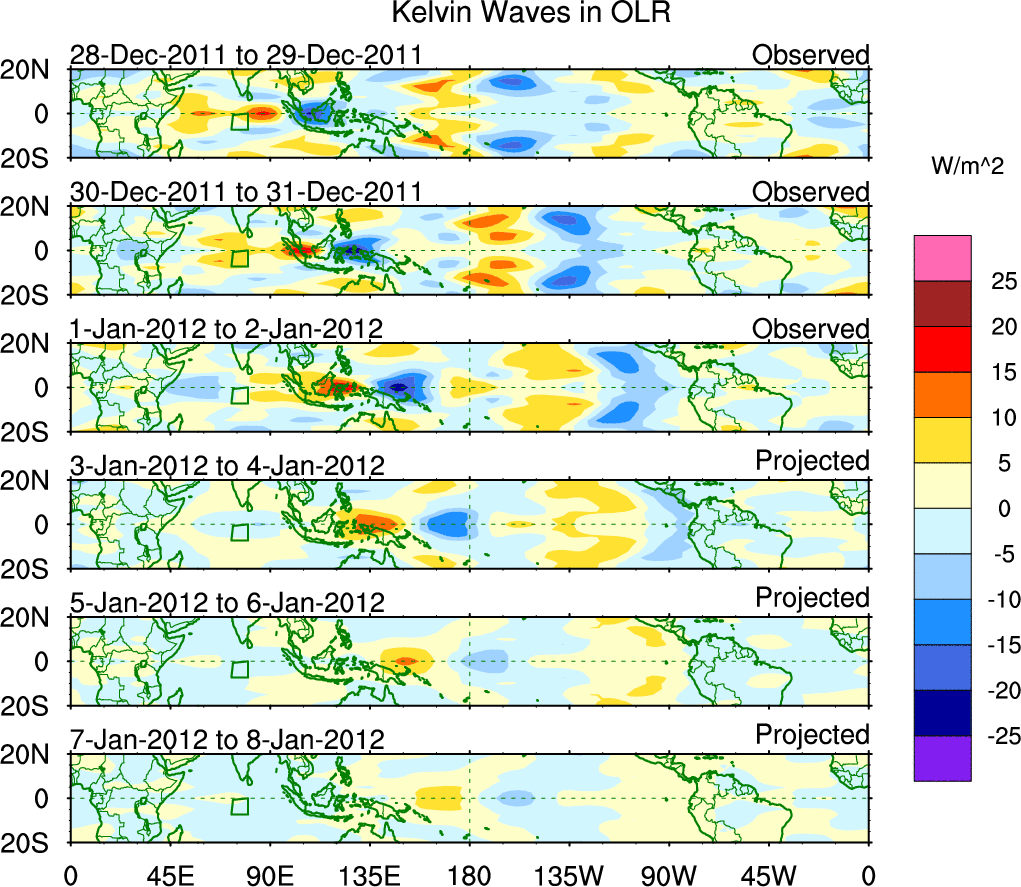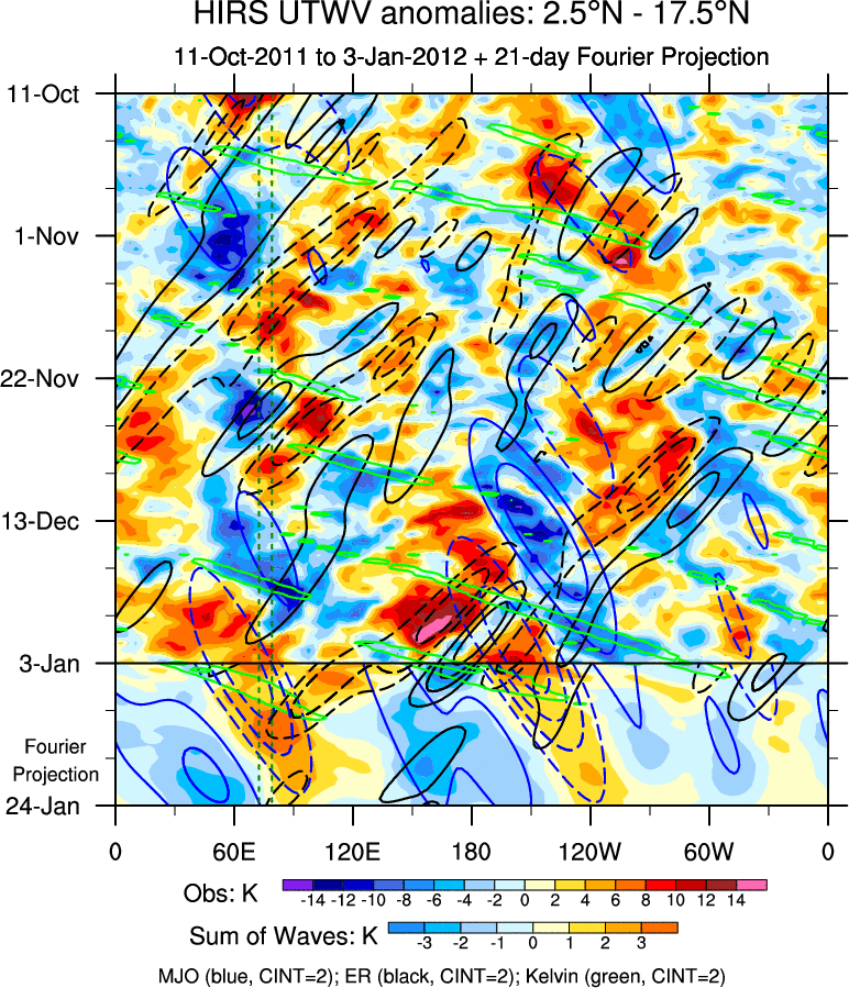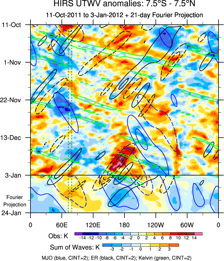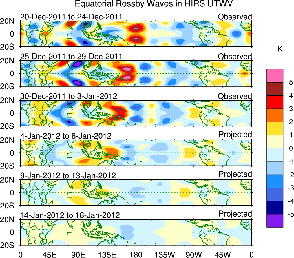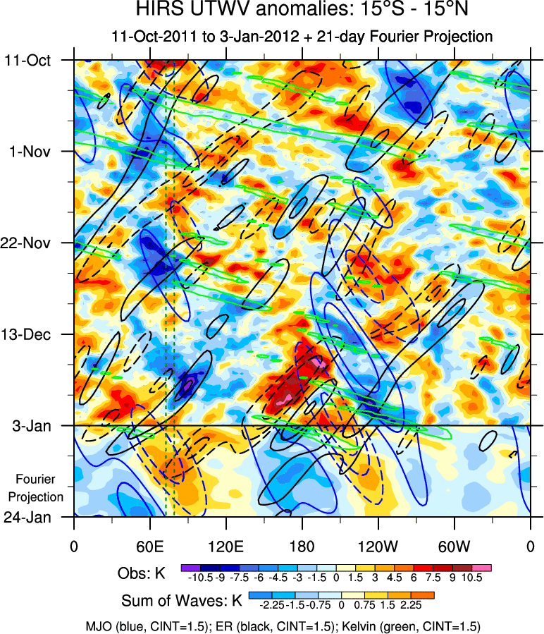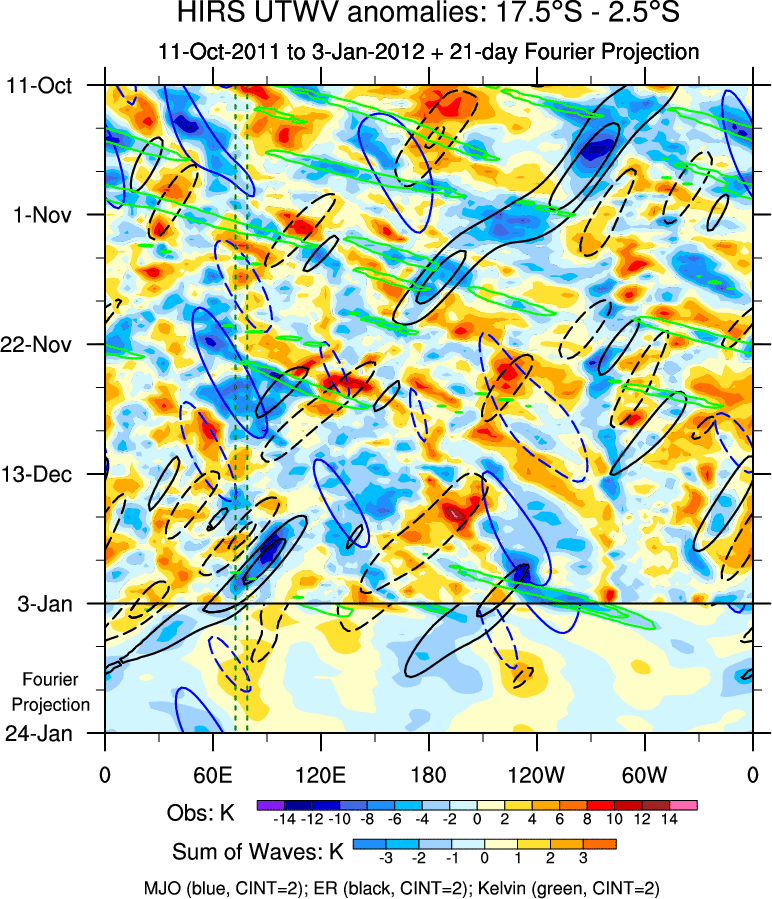 To identify tropical waves in near real-time, the OLR and UTWV data are filtered following Wheeler & Weickmann (2001 MWR). The daily anomalies are calculated using the first 3 harmonics of the seasonal cycle for 1979–2009. Missing values are then filled using linear interpolation in space and time. The most recent 365 days of anomalies are padded with 659 days of zeroes, and the result is filtered for each wave type.
