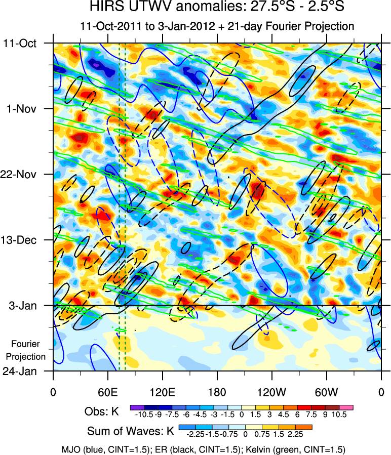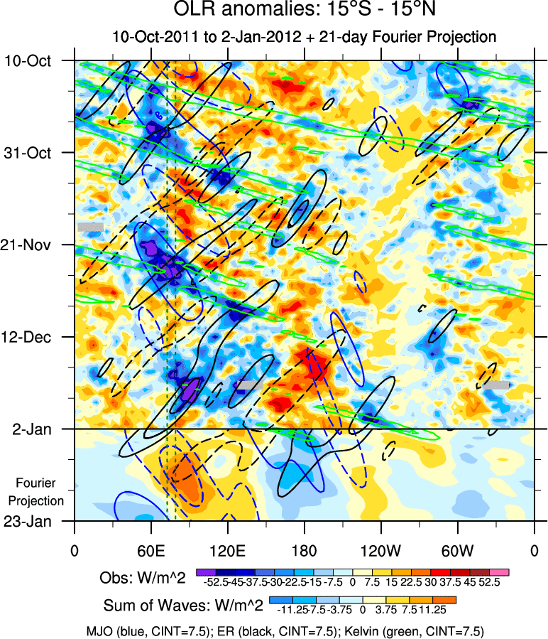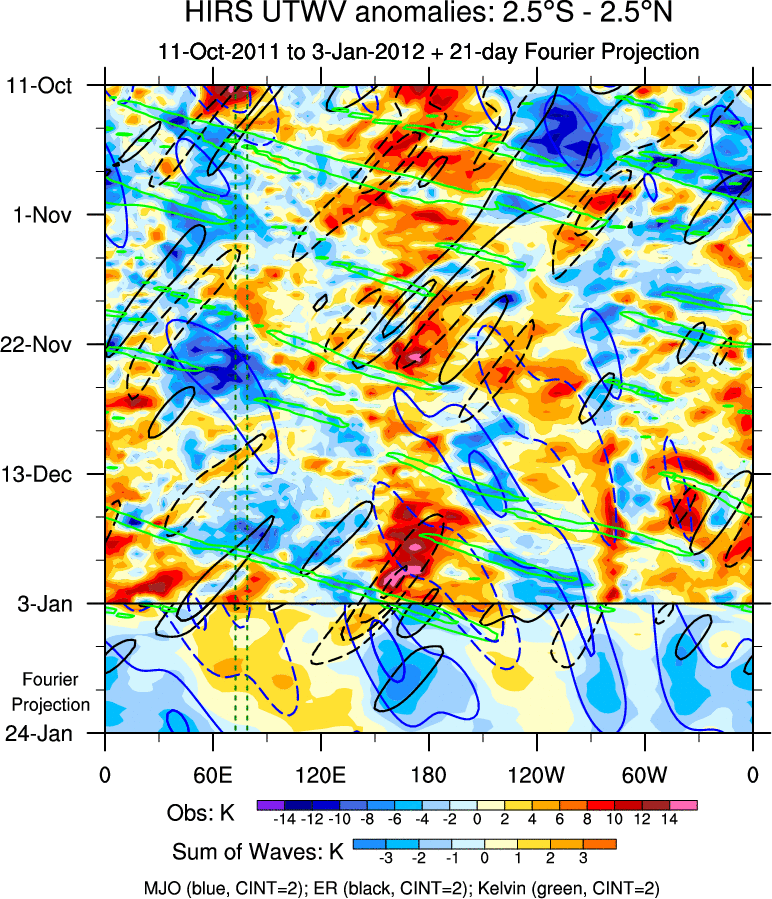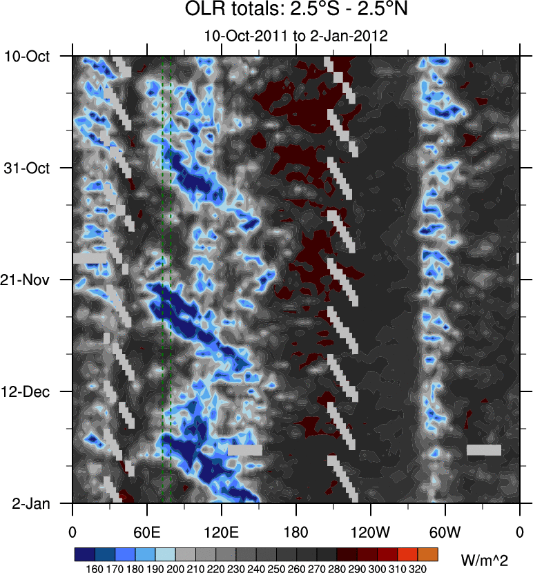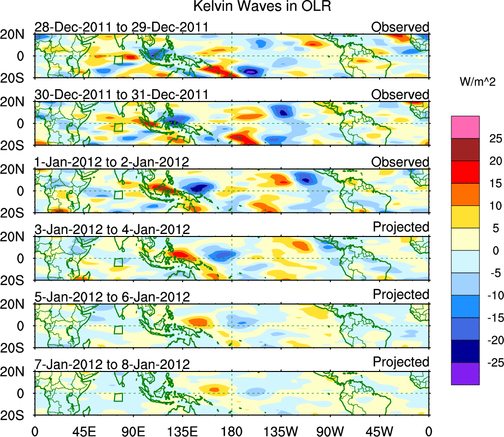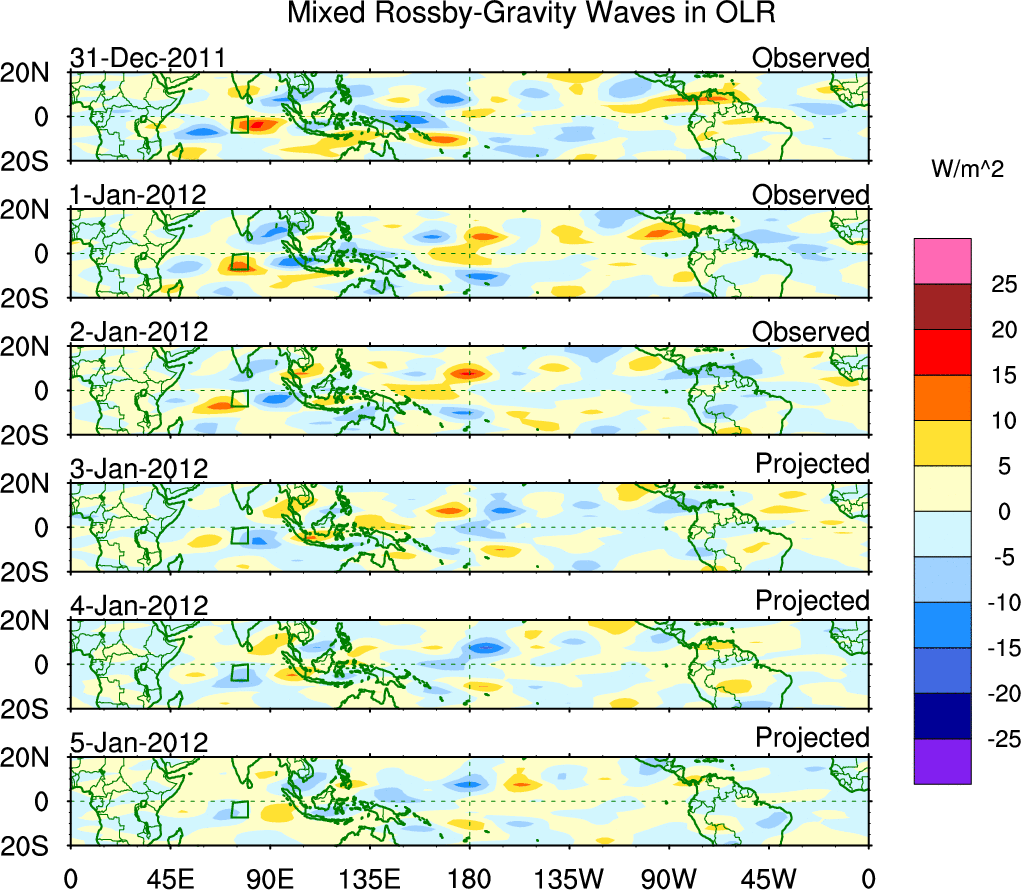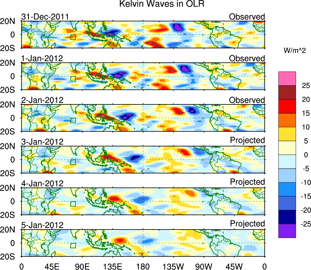 To identify tropical waves in near real-time, the OLR and UTWV data are filtered following Wheeler & Weickmann (2001 MWR). The daily anomalies are calculated using the first 3 harmonics of the seasonal cycle for 1979–2009. Missing values are then filled using linear interpolation in space and time. The most recent 365 days of anomalies are padded with 659 days of zeroes, and the result is filtered for each wave type.