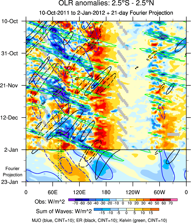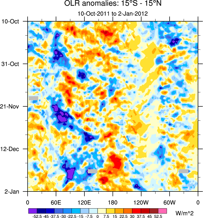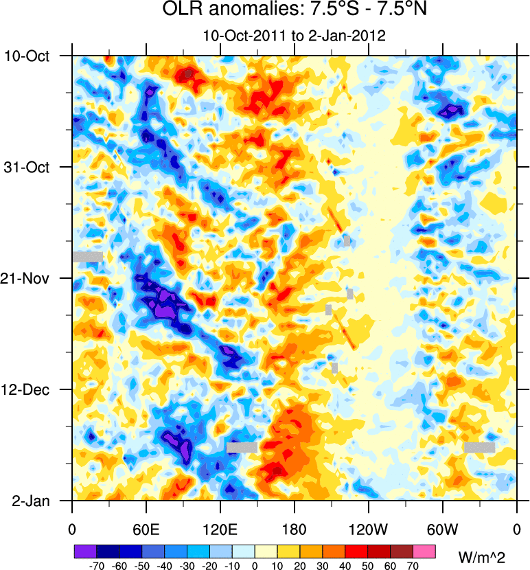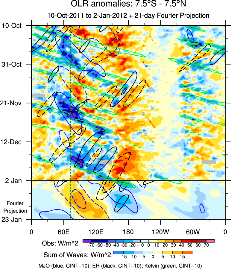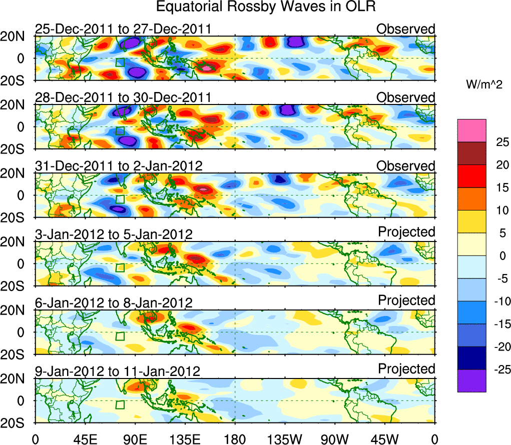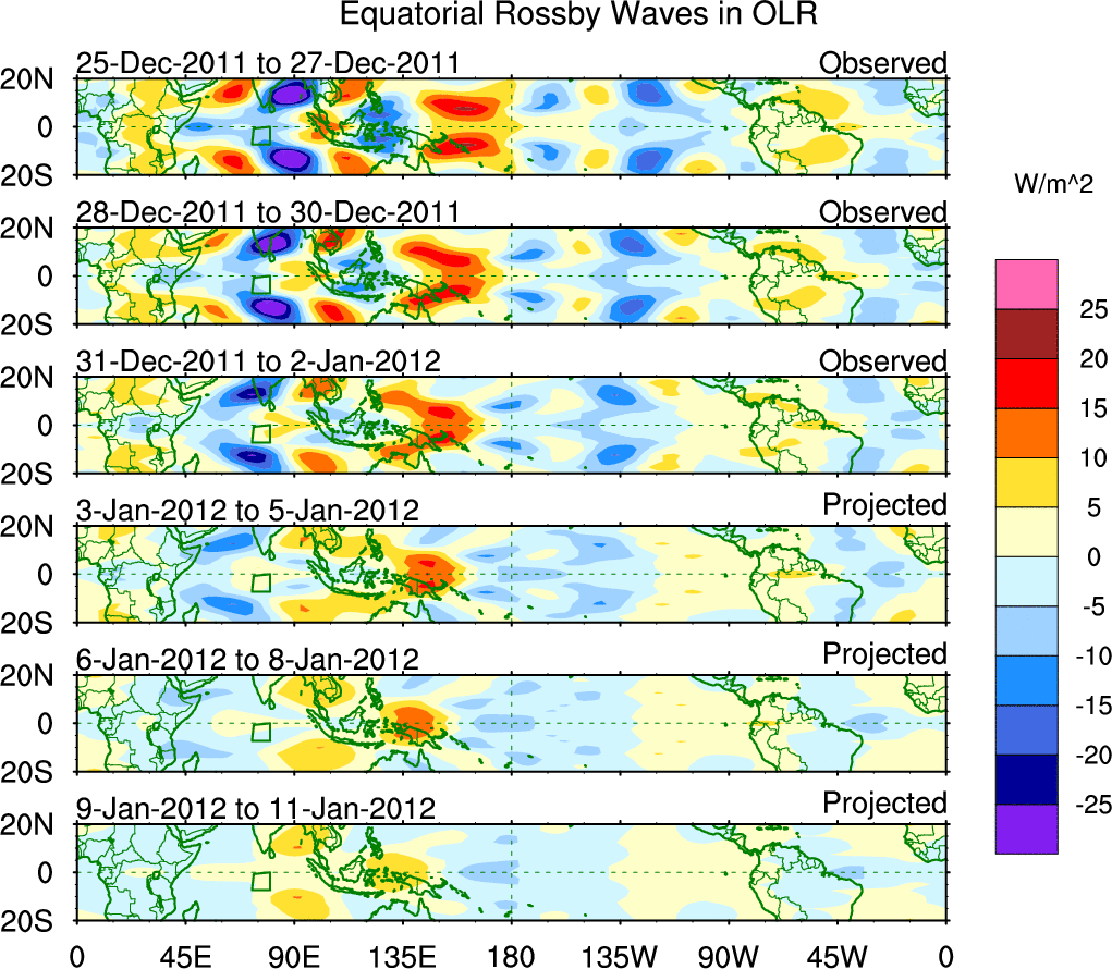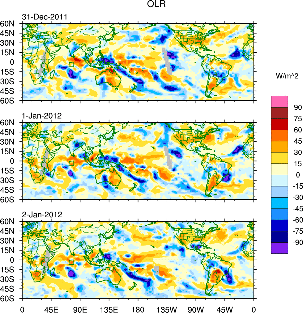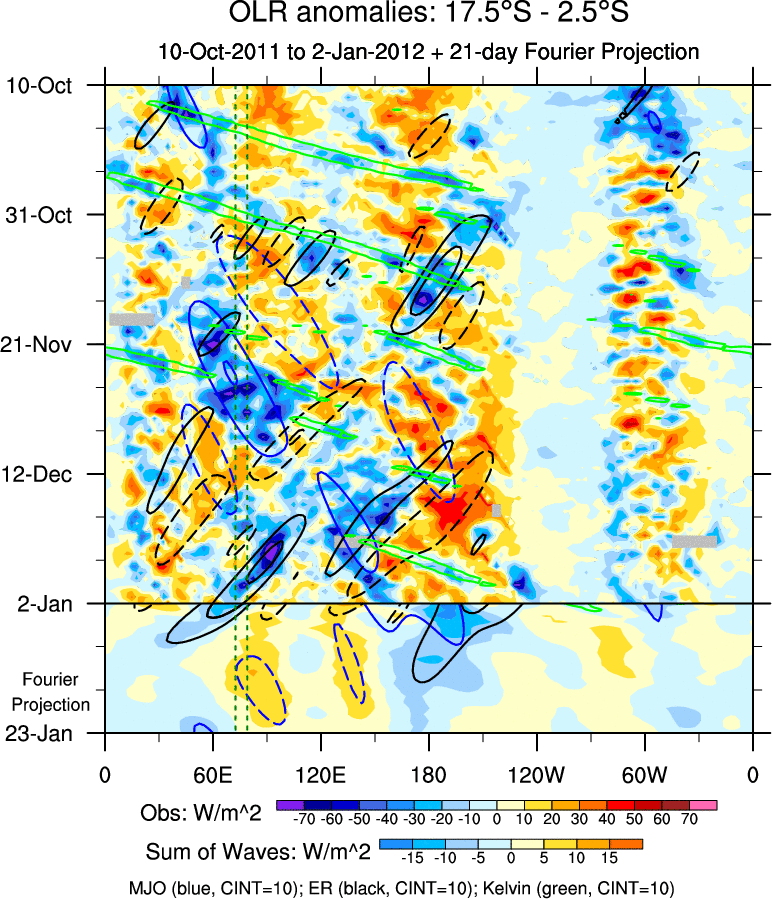 To identify tropical waves in near real-time, the OLR and UTWV data are filtered following Wheeler & Weickmann (2001 MWR). The daily anomalies are calculated using the first 3 harmonics of the seasonal cycle for 1979–2009. Missing values are then filled using linear interpolation in space and time. The most recent 365 days of anomalies are padded with 659 days of zeroes, and the result is filtered for each wave type.