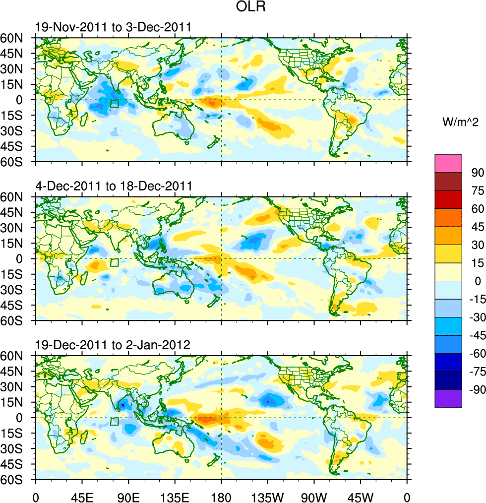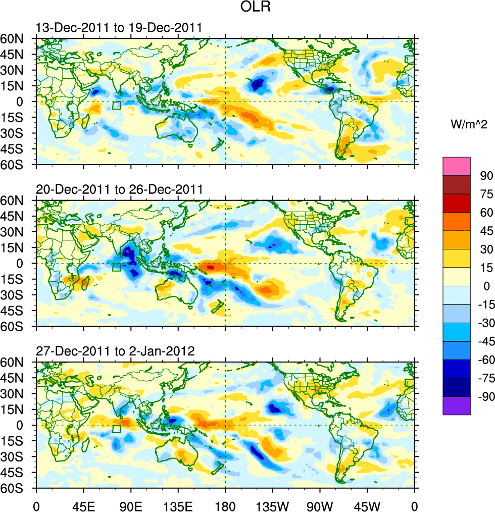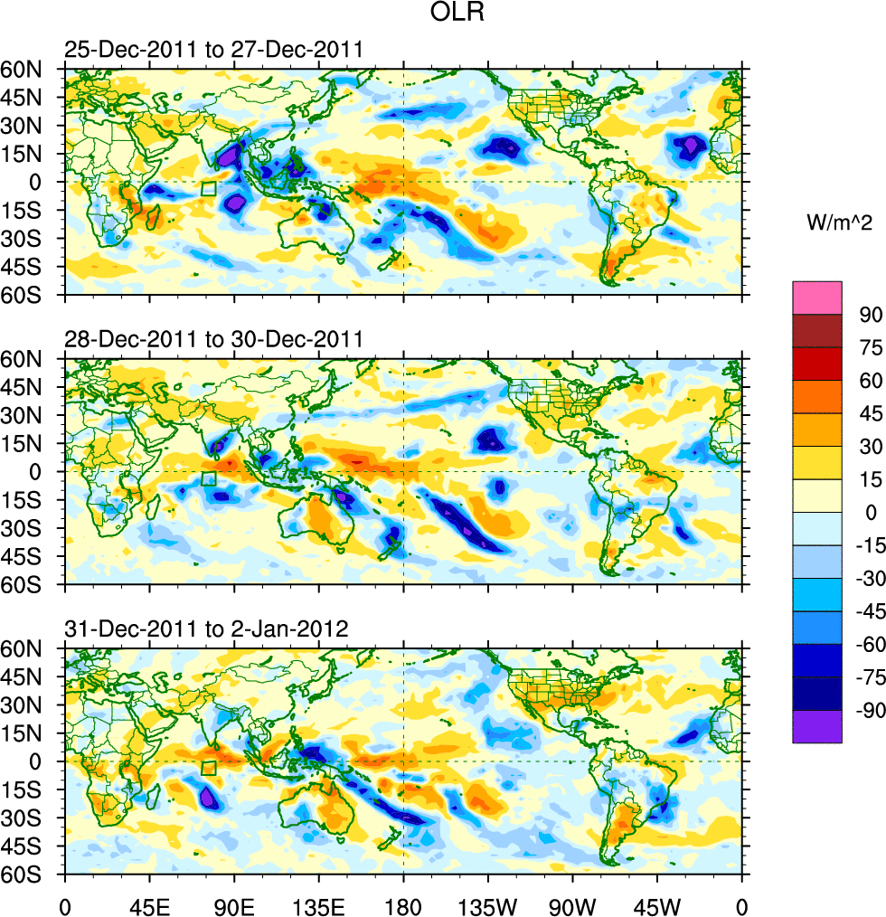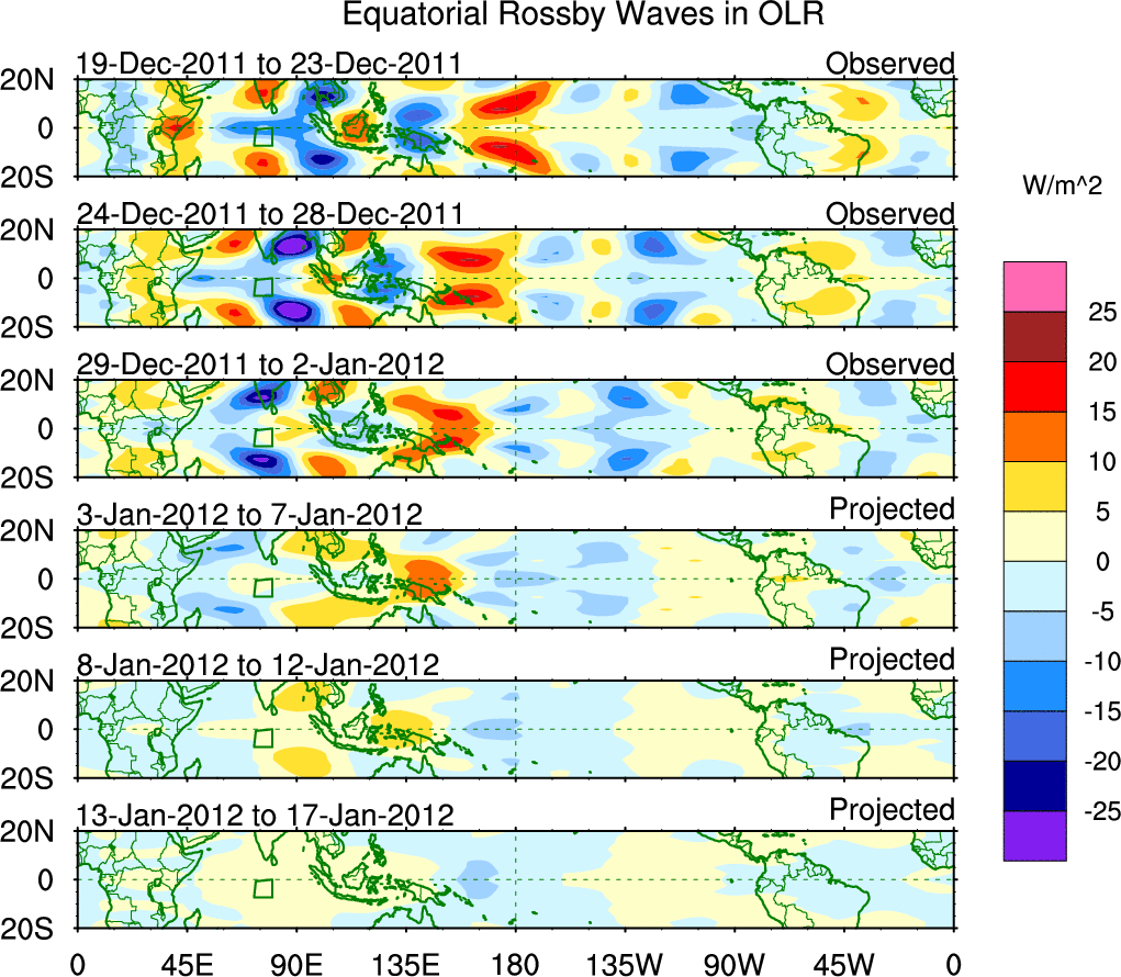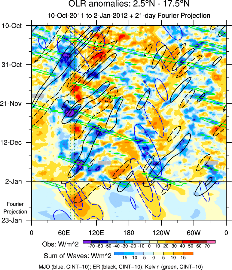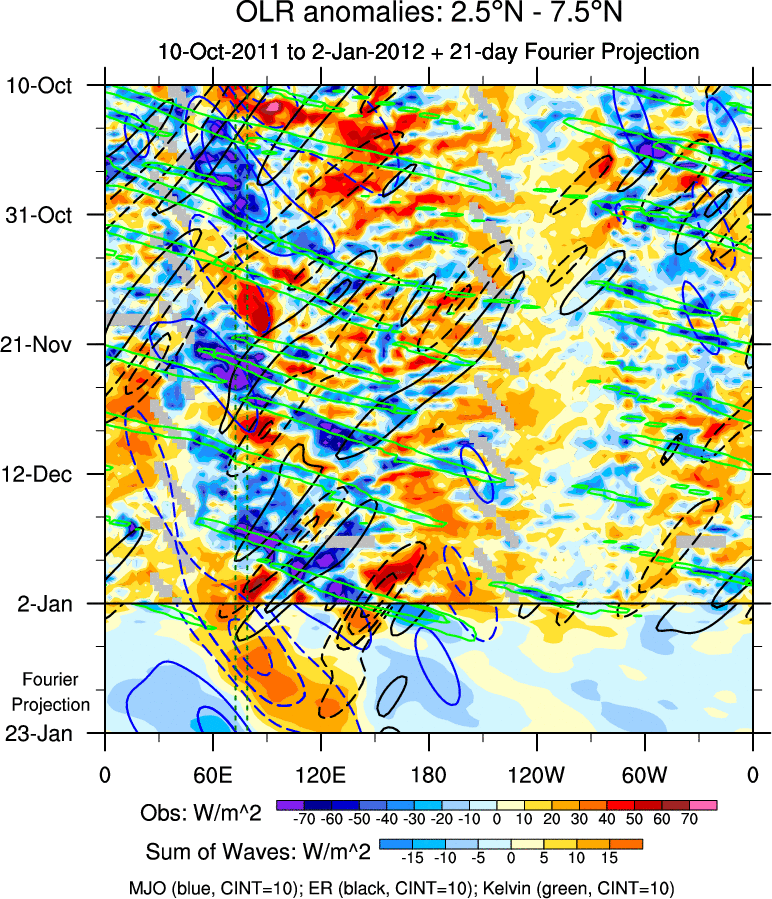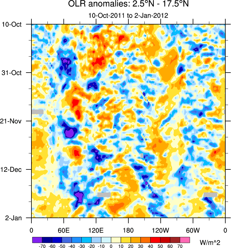To identify tropical waves in near real-time, the OLR and UTWV data are filtered following Wheeler & Weickmann (2001 MWR). The daily anomalies are calculated using the first 3 harmonics of the seasonal cycle for 1979–2009. Missing values are then filled using linear interpolation in space and time. The most recent 365 days of anomalies are padded with 659 days of zeroes, and the result is filtered for each wave type.