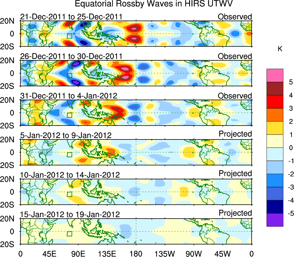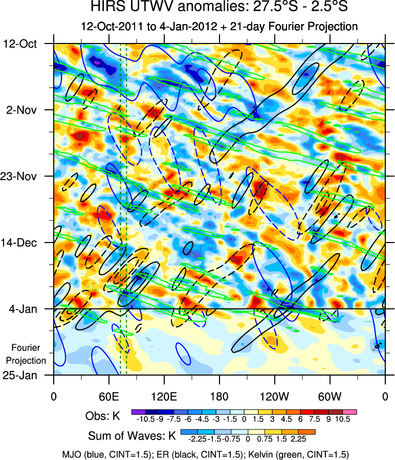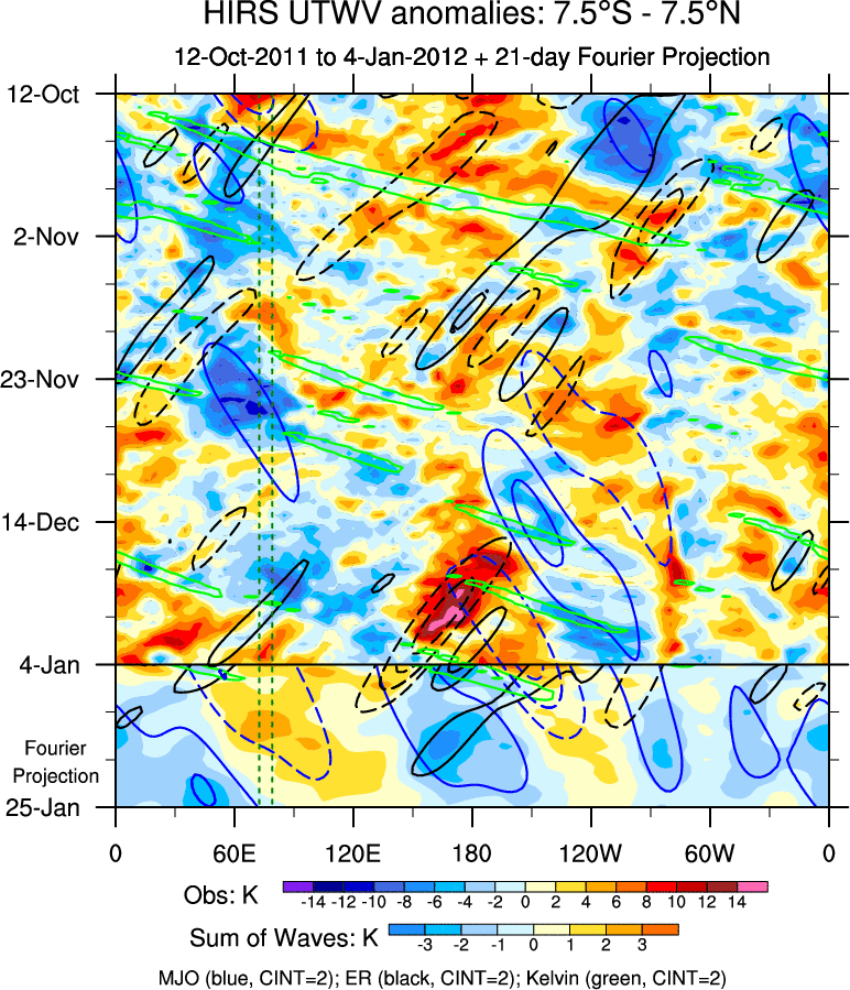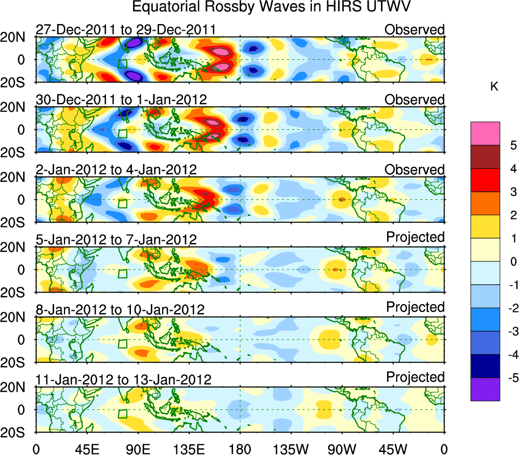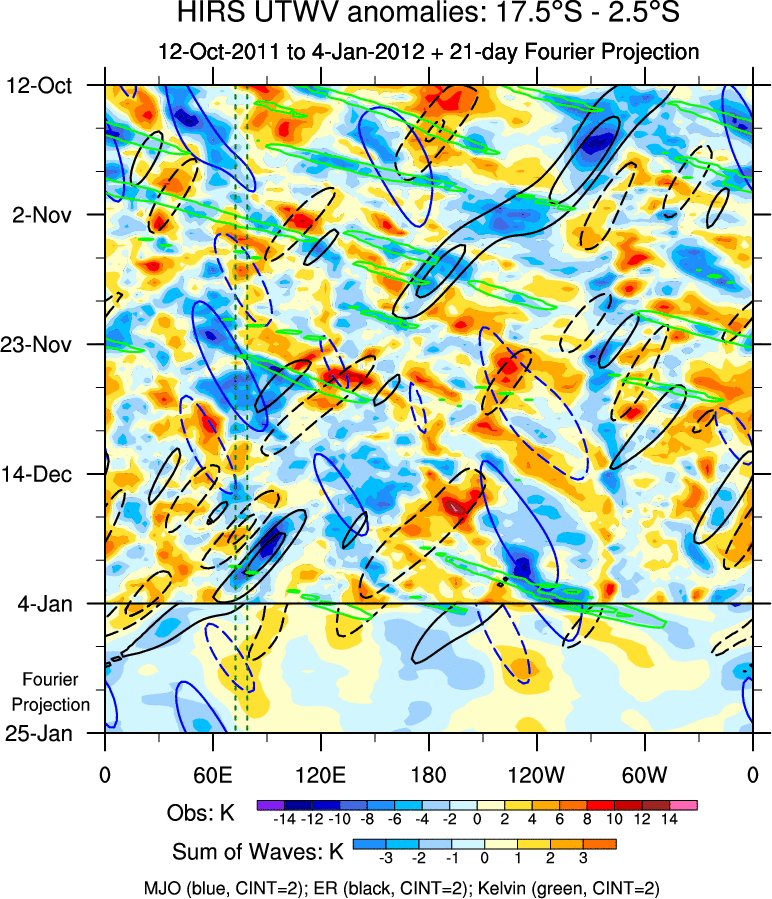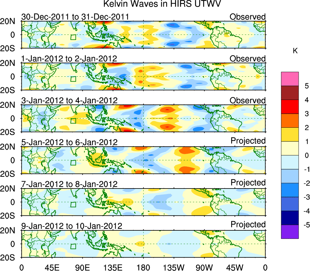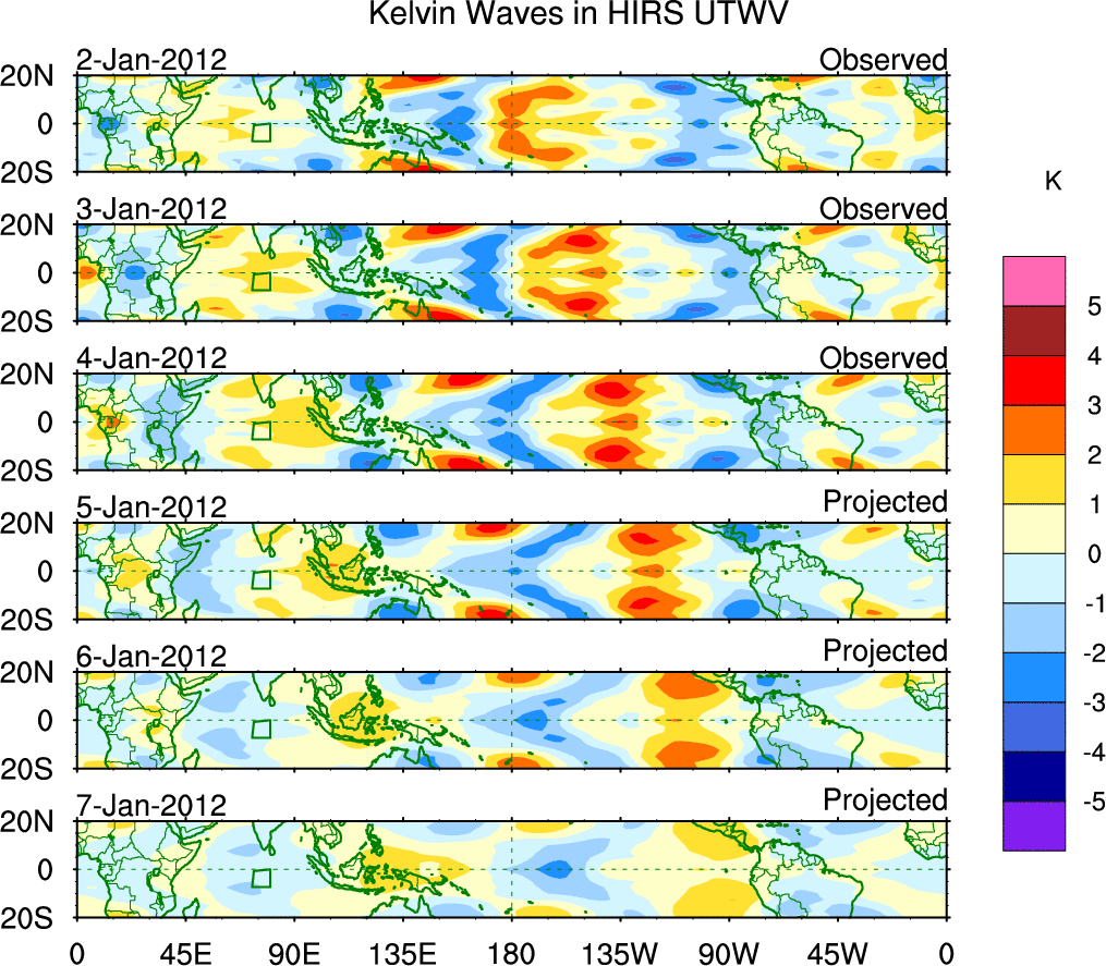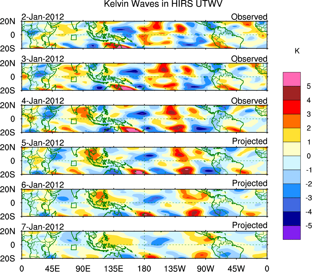 To identify tropical waves in near real-time, the OLR and UTWV data are filtered following Wheeler & Weickmann (2001 MWR). The daily anomalies are calculated using the first 3 harmonics of the seasonal cycle for 1979–2009. Missing values are then filled using linear interpolation in space and time. The most recent 365 days of anomalies are padded with 659 days of zeroes, and the result is filtered for each wave type.